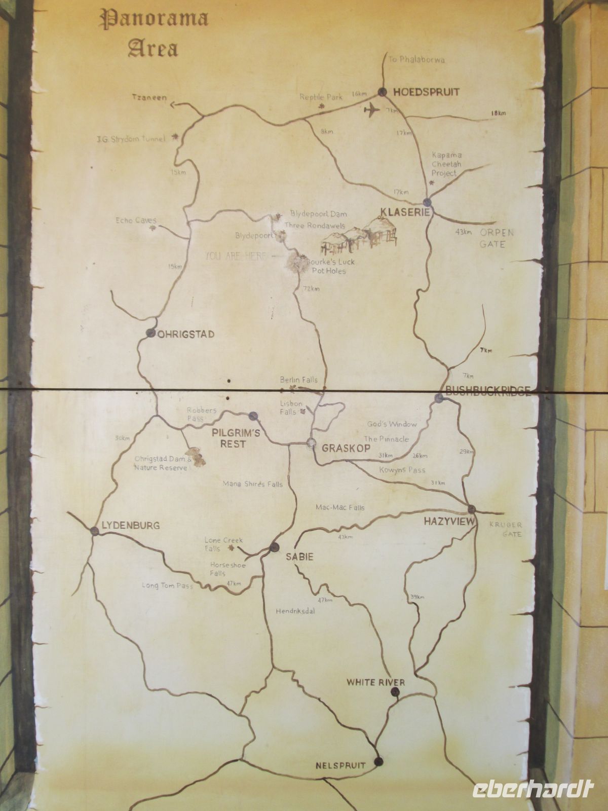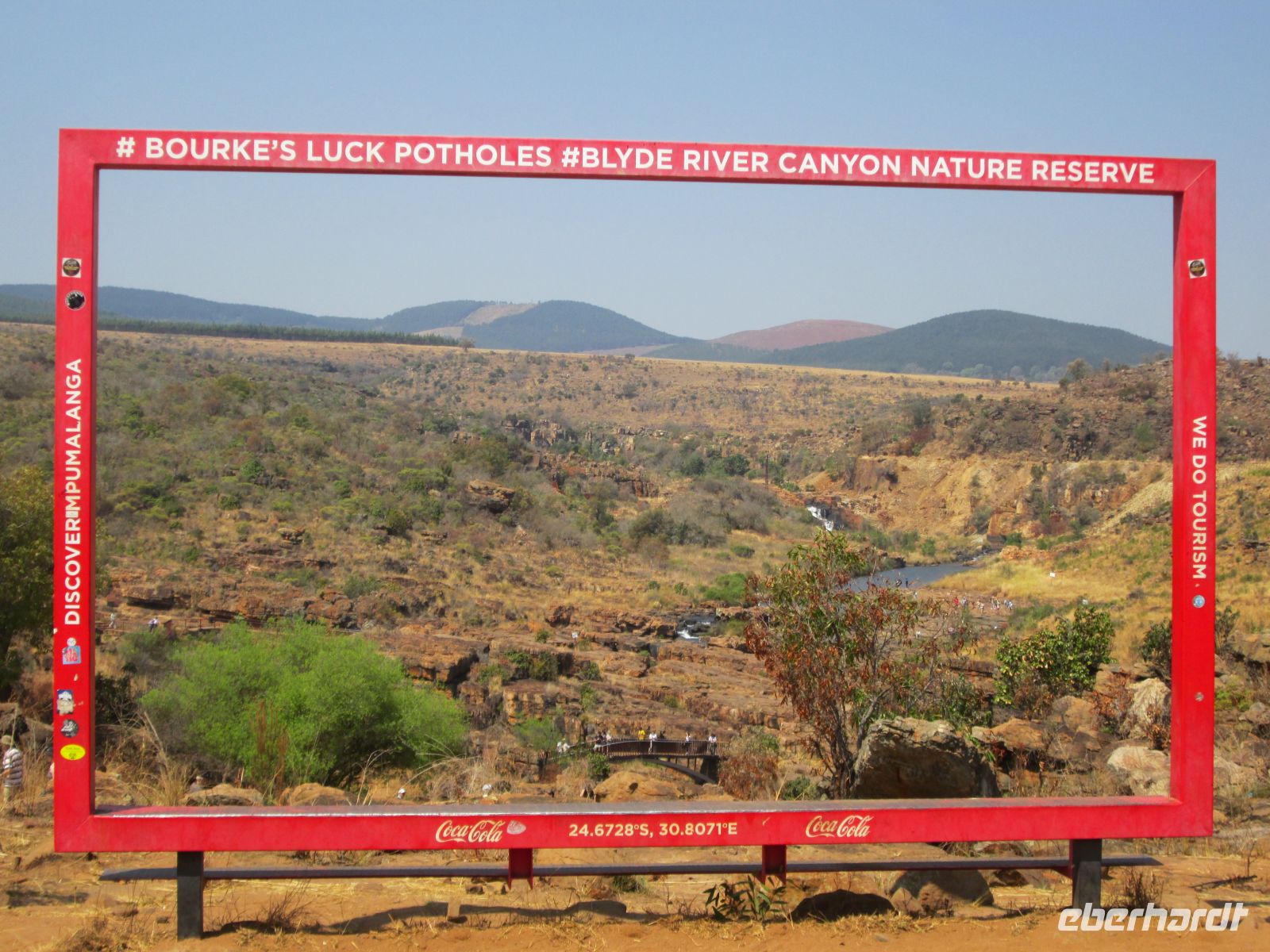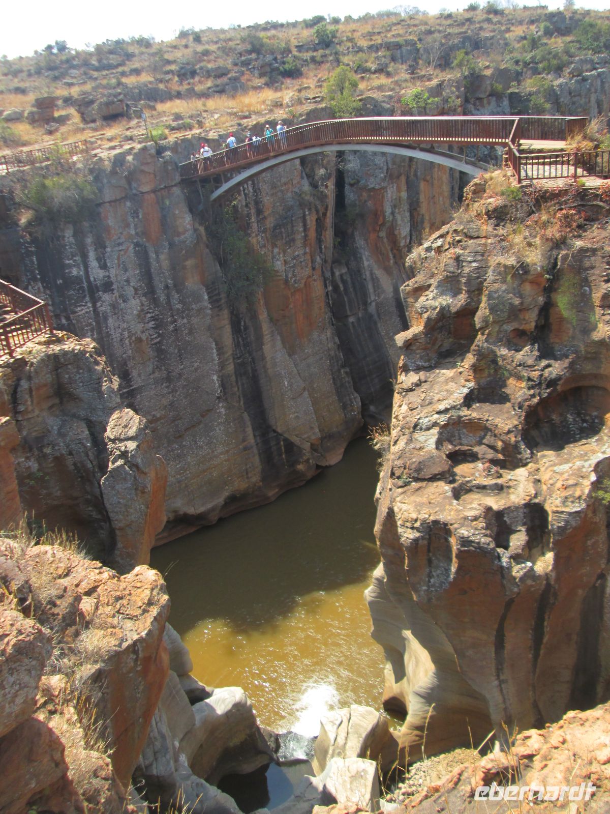 Dort wo sich die Flüsse Blyde und Treur kreuzen, kam es zu Auswaschungen und Strudellöchern, die den Namen des Goldsuchers Thomas Bourke tragen, Bourke's Luck Potholes. Auf einem Rundweg, der über 2 Holzbrücken führt, hatte man viele Möglichkeiten, die kleinen Naturwunder zu bestaunen.