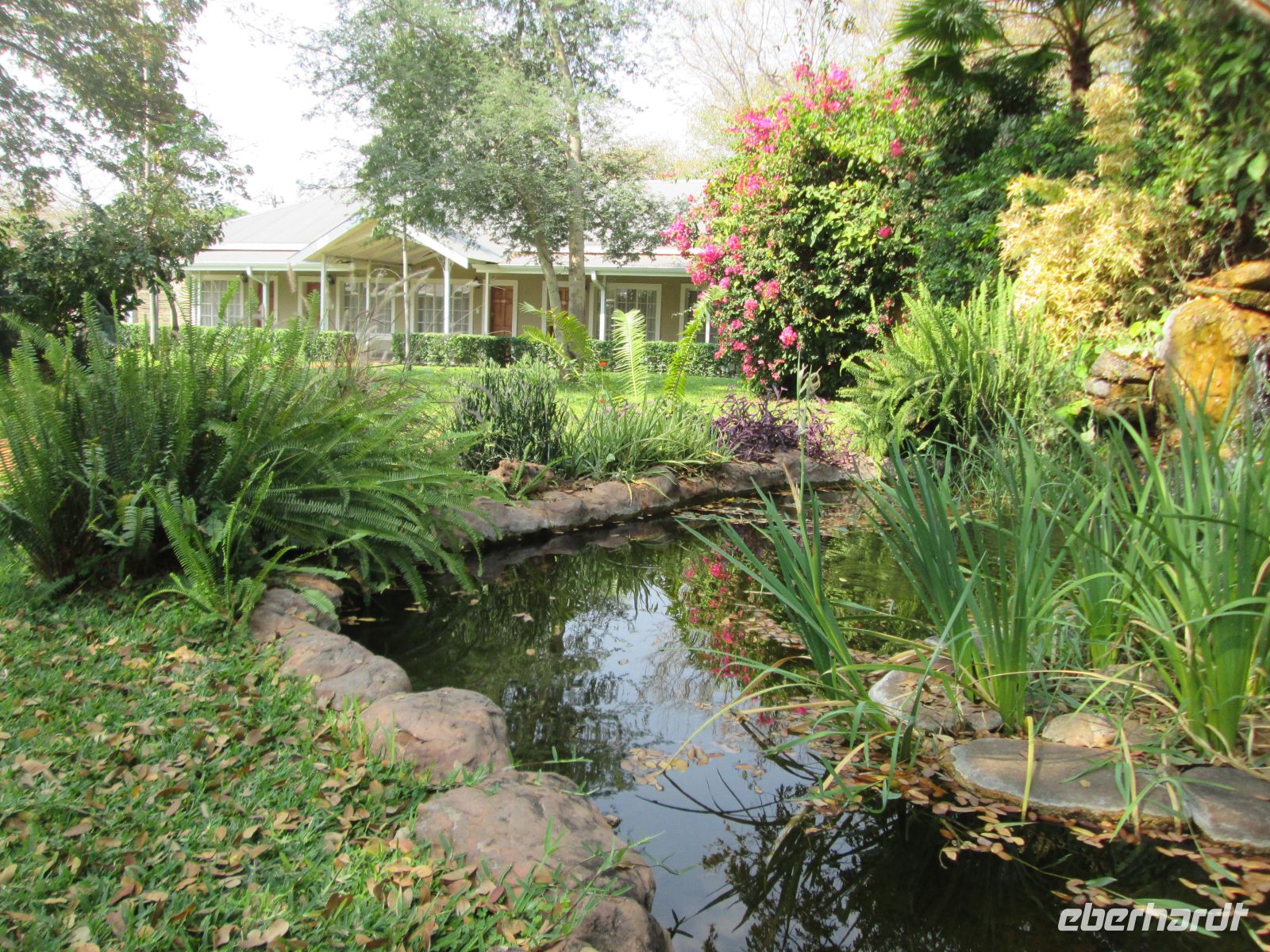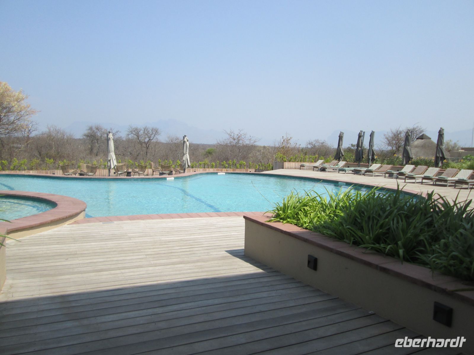 In dem wunderschön angelegten Außenbereich begrüßten uns die Mittagsblumen in den kräftigsten Farben. Ein großer Pool lädt zum Abkühlen ein. Auch Massagen wurden zur Entspannung wieder gereicht. Vielleicht würde man auf eine Rücken-und Nackenmassage am kommenden Tag zurückgreifen, da für uns eine mehrstündige Safari in einem Jeep vorgesehen war, und man mit diesem natürlich nicht immer auf den besten Wegen nach Tieren Ausschau hält.