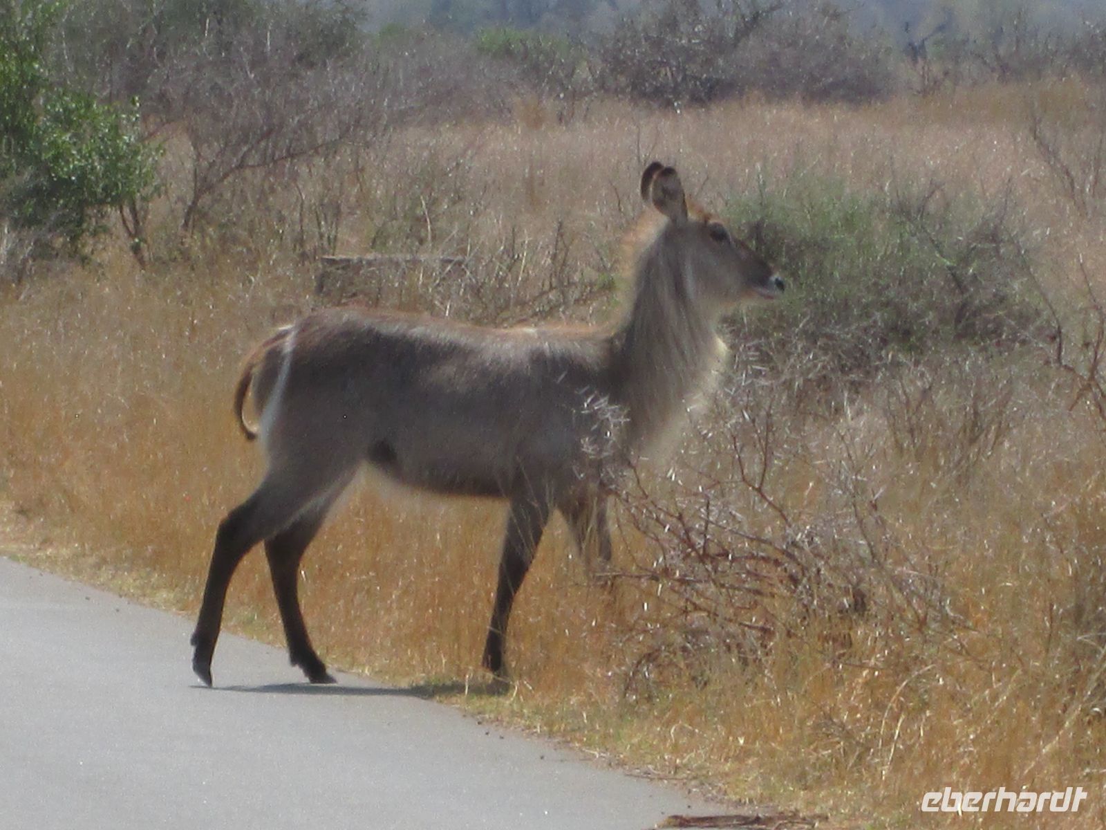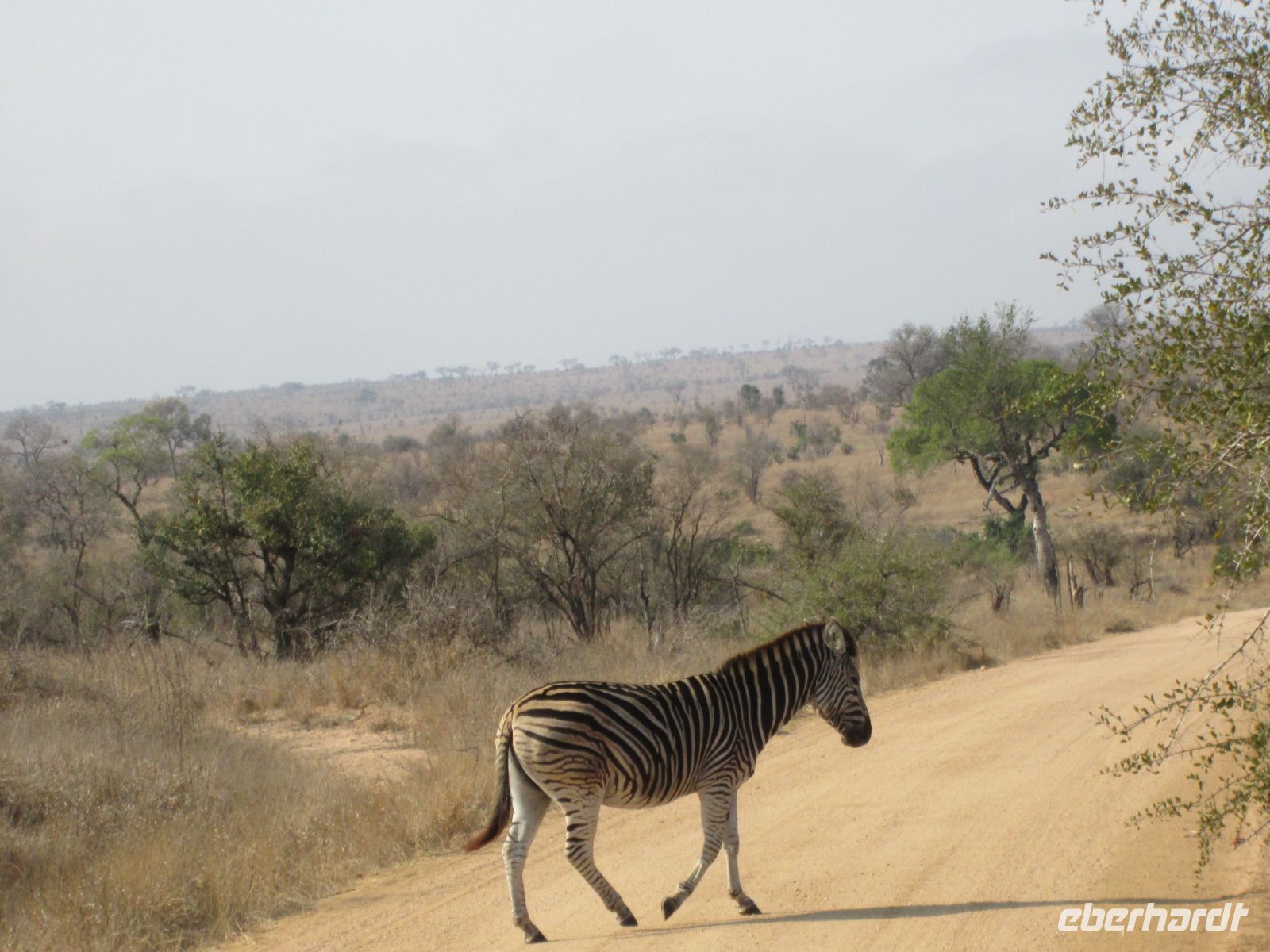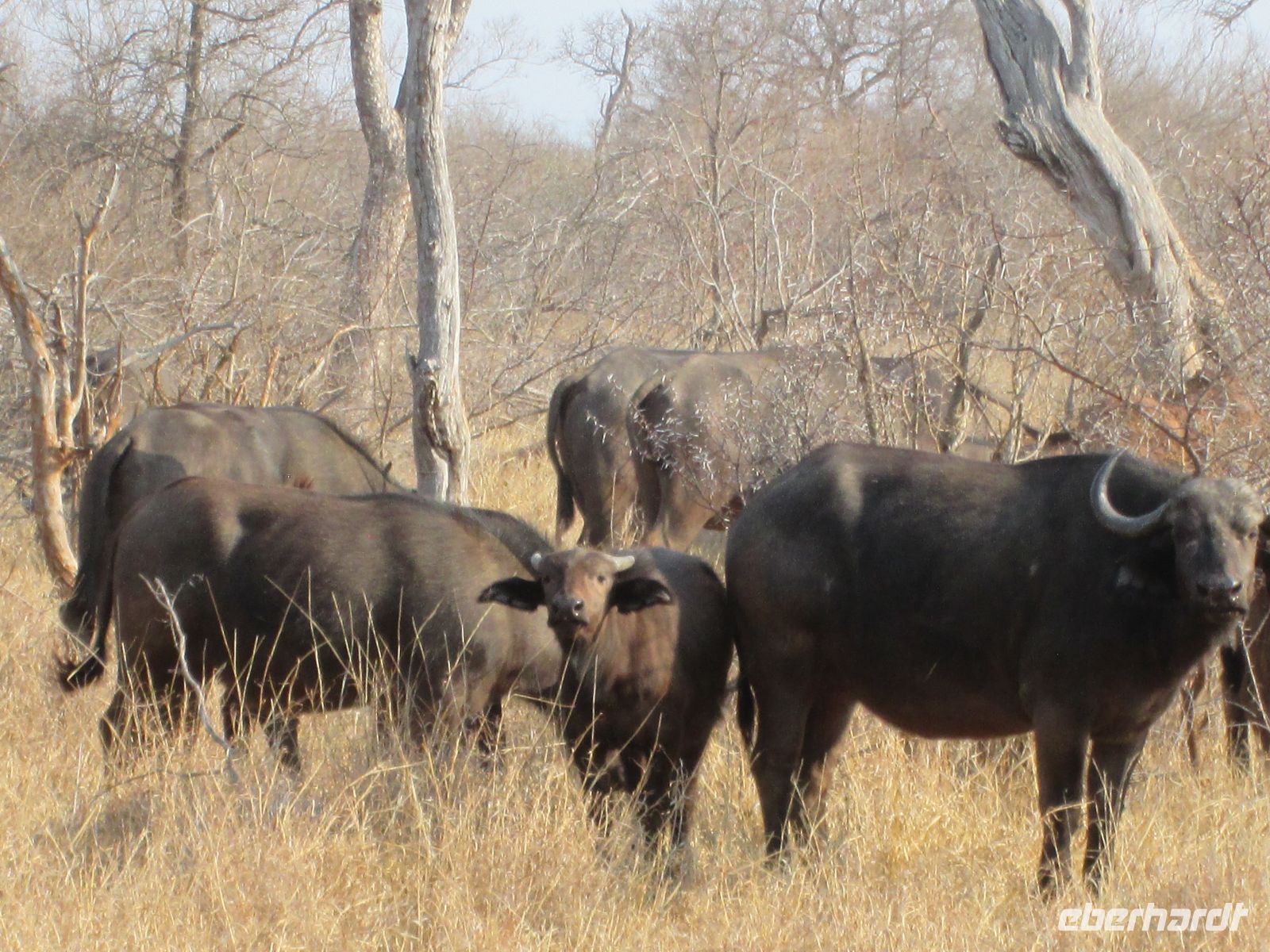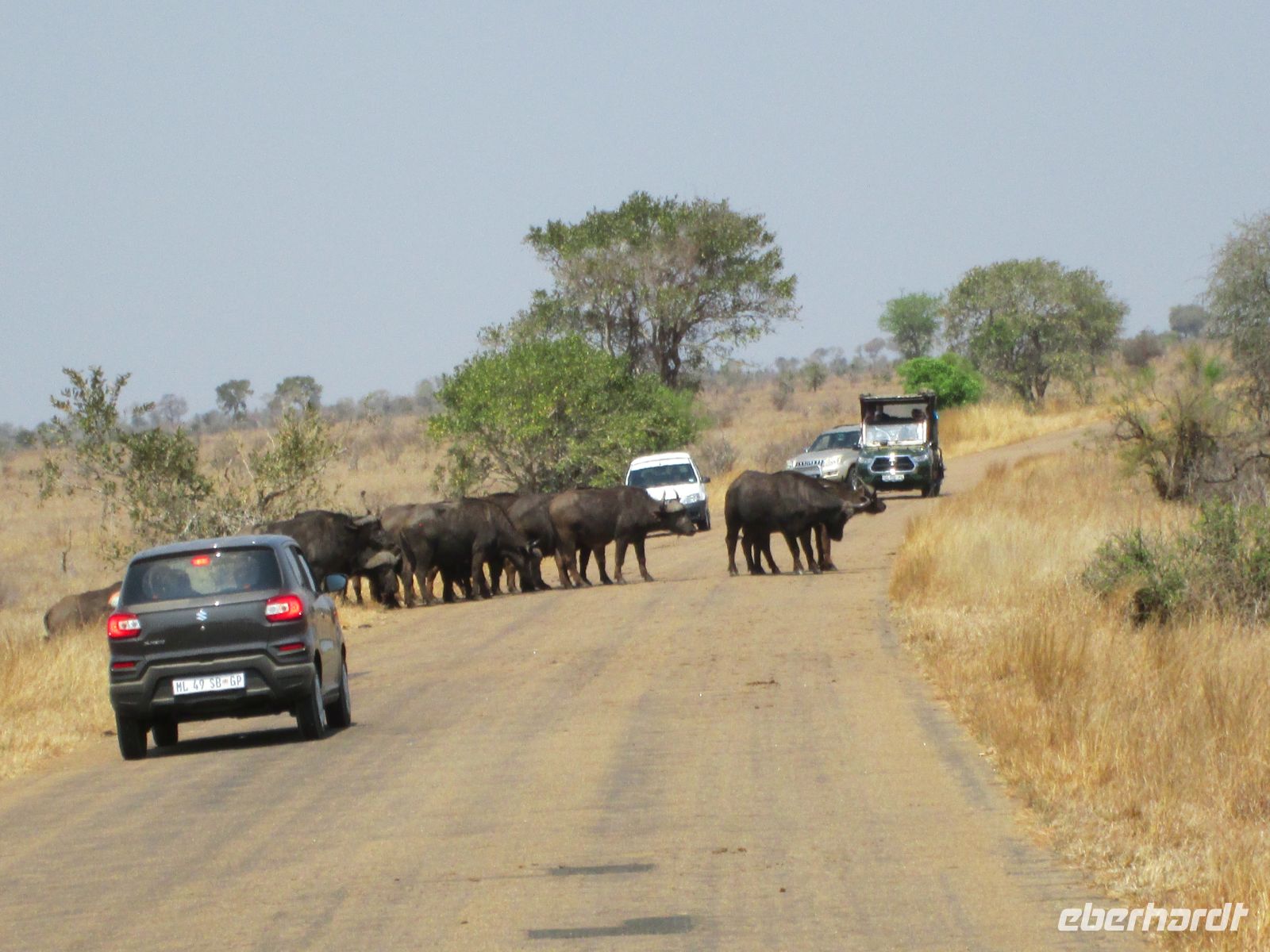 Ein ganzes Stück auf der asphaltierten Hauptstraße fahrend, sorgte der noch kühle Fahrtwind für den ein oder anderen Schauer. Gut das alle zusätzliche Jacken mitgenommen hatten. Natürlich stieg die Temperatur recht schnell, zur Mittagszeit, im Satara Resort, hatten wir wohlige 31 Grad. Die Tiersichtungen waren bis dahin sehr gut, Elefanten, Zebras, Gnus, Antilopen und Wasserböcke kreuzten unsere Wege und Straßen. Selbst eine beeindruckende Büffelwanderung konnten wir verfolgen.
