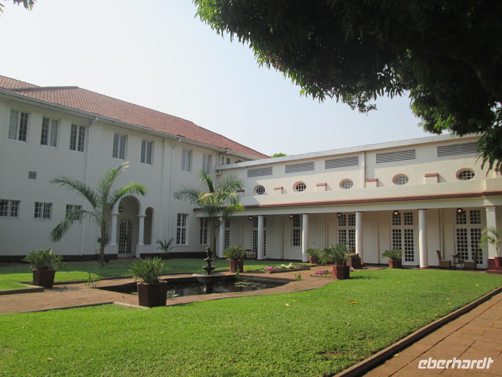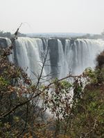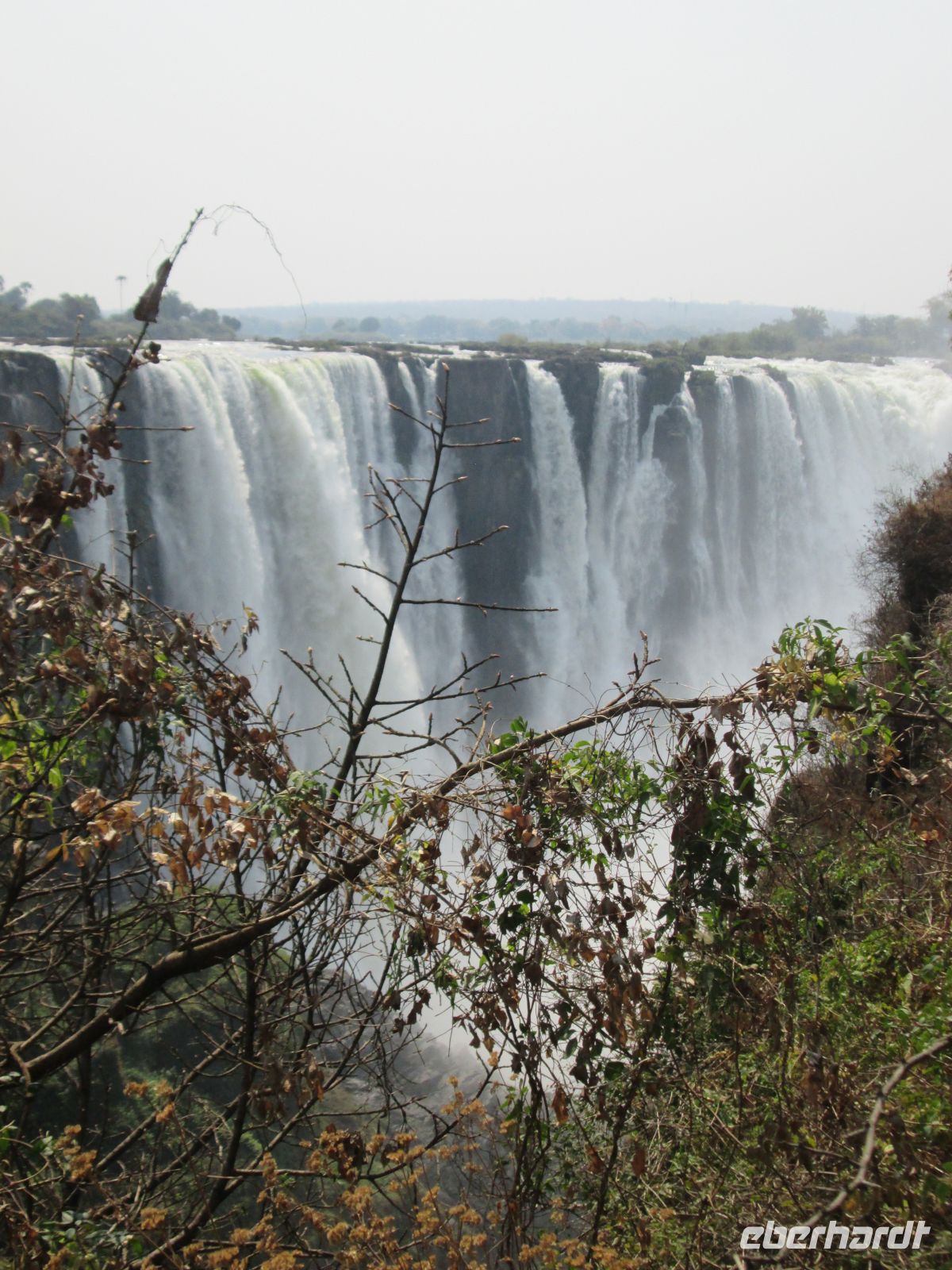 Ich bat ihn, auf dem Weg zu den Wasserfällen einen kurzen Stopp am berühmten Victoria Falls Hotel einzulegen. Mit etwas Überredungskunst beim Sicherheitsdienst des Hotels gelang es uns schließlich, einmal kurz durch die Räume des altehrwürdigen, 1904 erbauten First Class Hotels zu gehen, um aus dessen Gartenanlagen einen Blick auf die Eisenbahnbrücke zu genießen. Es war zu diesig, um diese zu fotografieren, aber wir hatten ja noch eine weitere Möglichkeit während unseres sich anschließenden Spazierganges entlang der Wasserfälle.
