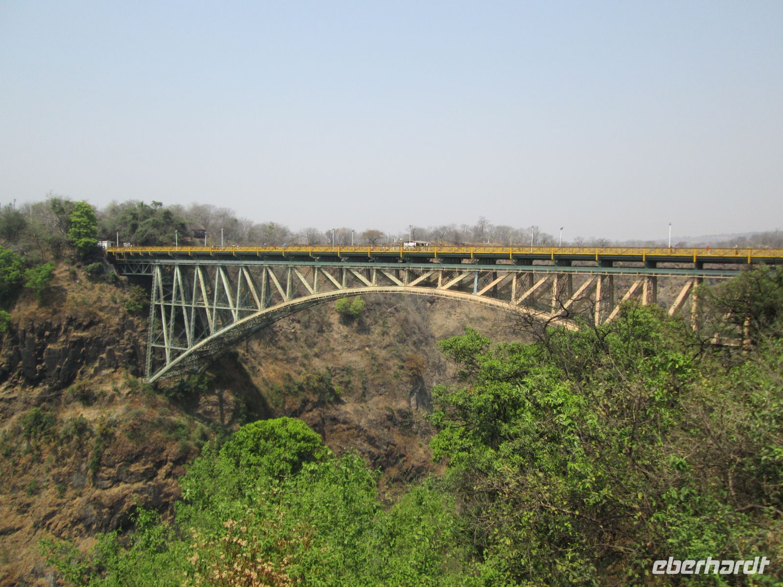 Den Abschluss des 3,2 km langen Rundwanderwegs bildet ein Blick auf die geschichtsträchtige Victoria Falls Bridge. Fertiggestellt wurde sie 1905 nach 14monatiger Bauzeit in England. Richtig, die Brückenteile kamen per Schiff und Landtransport zu ihrem Bestimmungsort. Cecil Rhodes, wir erinnern uns, wollte eine Verbindung von Kapstadt nach Kairo schaffen und die Eisenbahn sollte ein Teil dessen werden.
