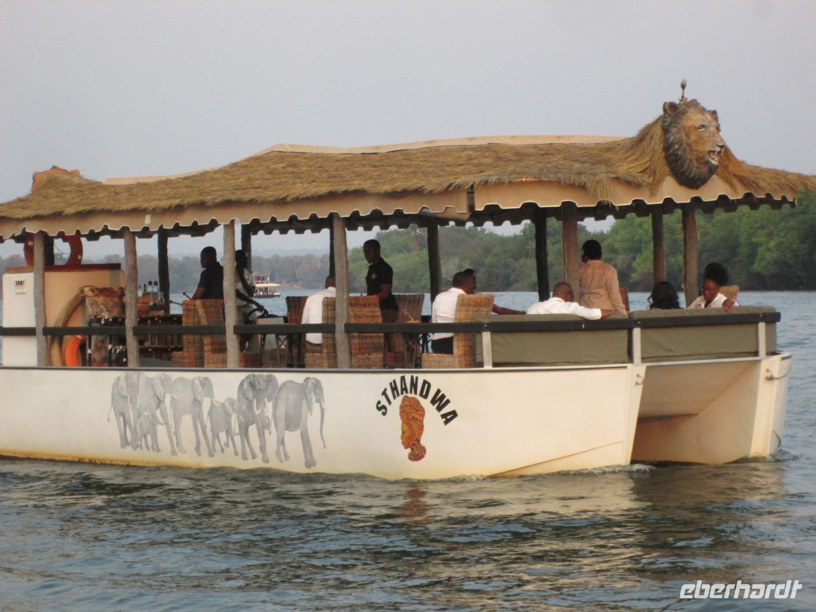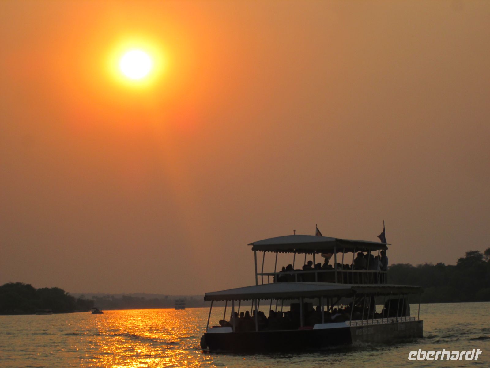 16.00 Uhr trafen sich alle wieder zum letzten Programmpunkt unserer Reise. Es wurde uns deutlich bewusst, das diese eindrucksvolle Reise tatsächlich zu Ende ging. Seitens der Eberhardt-Produktmanagerin A. Müller, die hiermit ein großes "Dankeschön" von allen erhält, wurde eine Bootstour auf dem Sambesi zum Sonnenuntergang arrangiert. Entschleunigt und jeder ein wenig in seinen eigenen Gedanken versunken, konnten wir Getränke und einen liebevoll zubereiteten Imbiss genießen. Hippos, Elefanten, 1 Giraffe und 1 Krokodil schienen sich von uns verabschieden zu wollen. Dazu die untergehende Sonne in den schönsten Farbtönen. Besser hätte man Afrika nicht "Good bye" sagen können.
