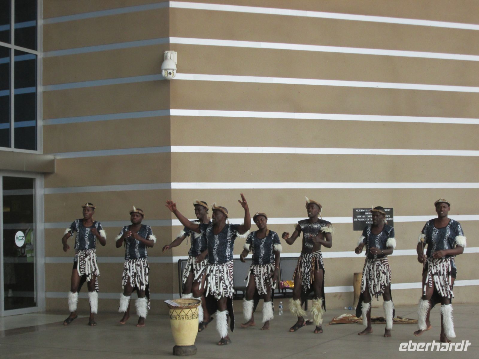 Einheimische vor dem Flughafen gaben Musik und Tanz zum Besten.