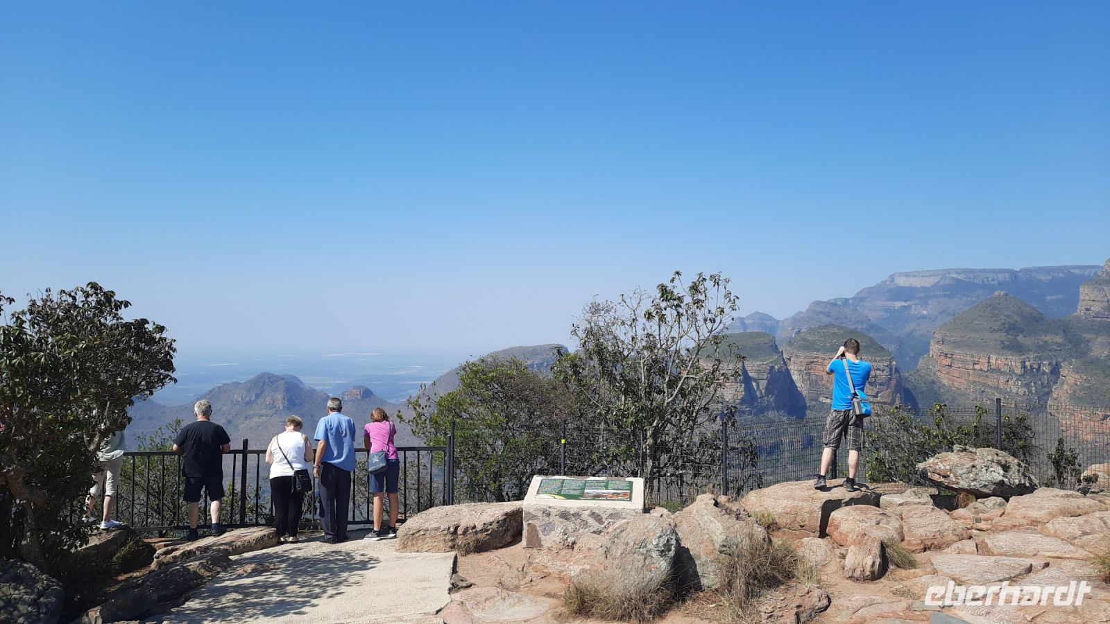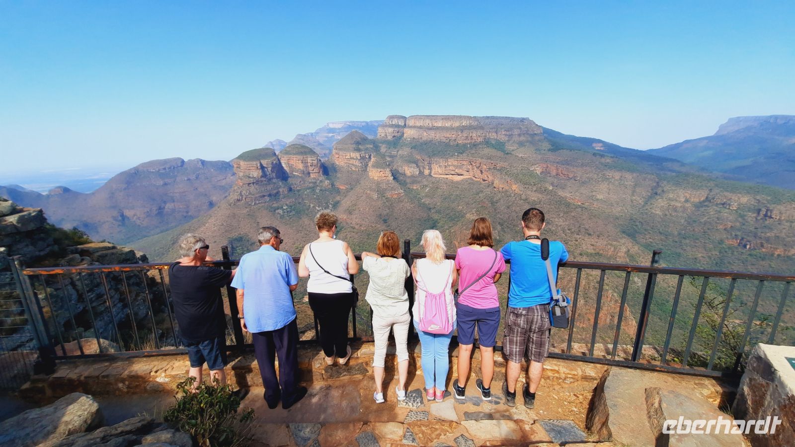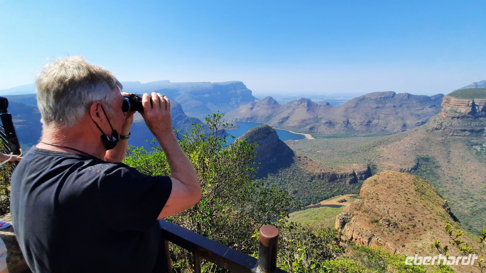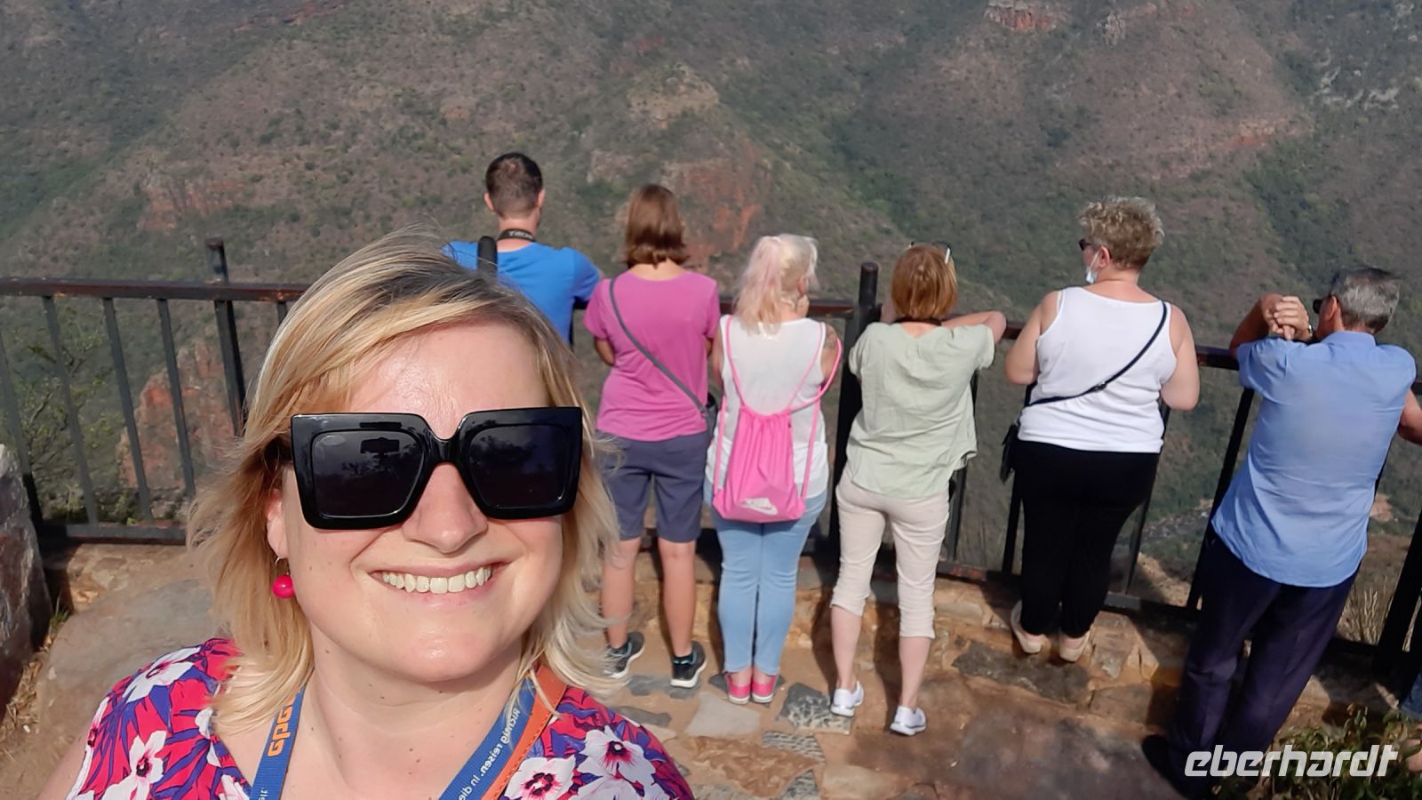 Wir verließen nun Pretoria Richtung Nord-Osten. Unterwegs durchfuhren wir riesige landwirtschaftliche Gebiete, sahen zahlreiche Silos und stoppten schließlich an einer Raststätte, in der wir die ersten Tiere auf den Kameras festhalten konnten. Sogar Büffel und in der Ferne auch ein paar Nashörner waren zu sehen. Gut gestärkt fuhren wir weiter in die Region Mpumalanga. Wir erreichten den imposanten Blyde River Canyon. Er ist der neben dem Grand Canyon in den USA und dem Fish River Canyon in Namibia der drittgrößte Canyon weltweit. Beeindruckt von dieser fantastischen Aussicht schossen wir hunderte Fotos. Wir wollten jeden neuen Blickwinkel genau festhalten.