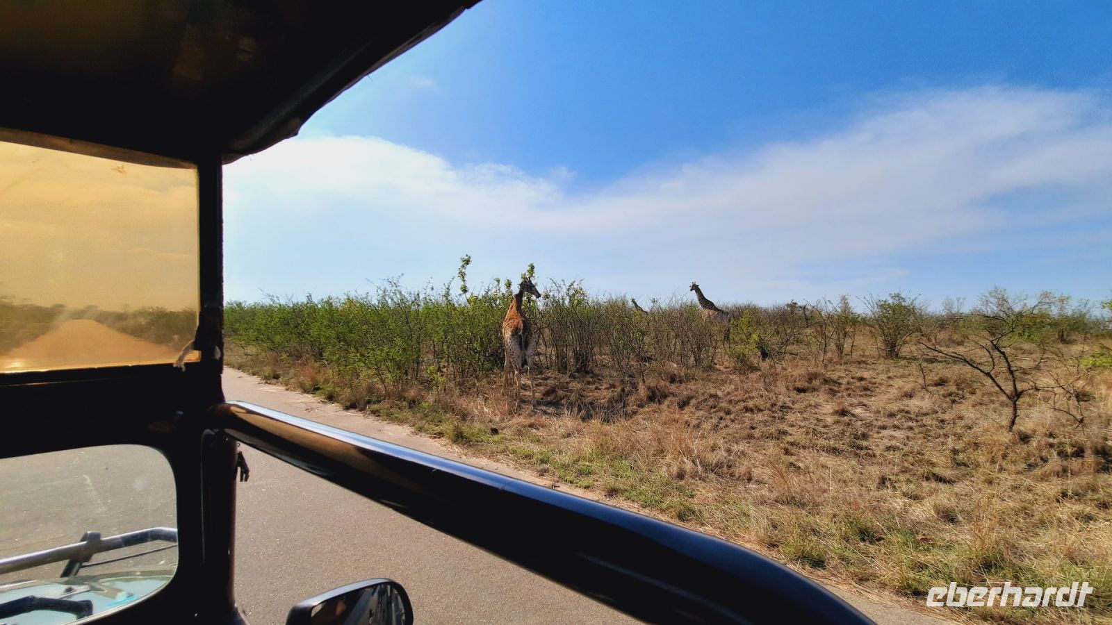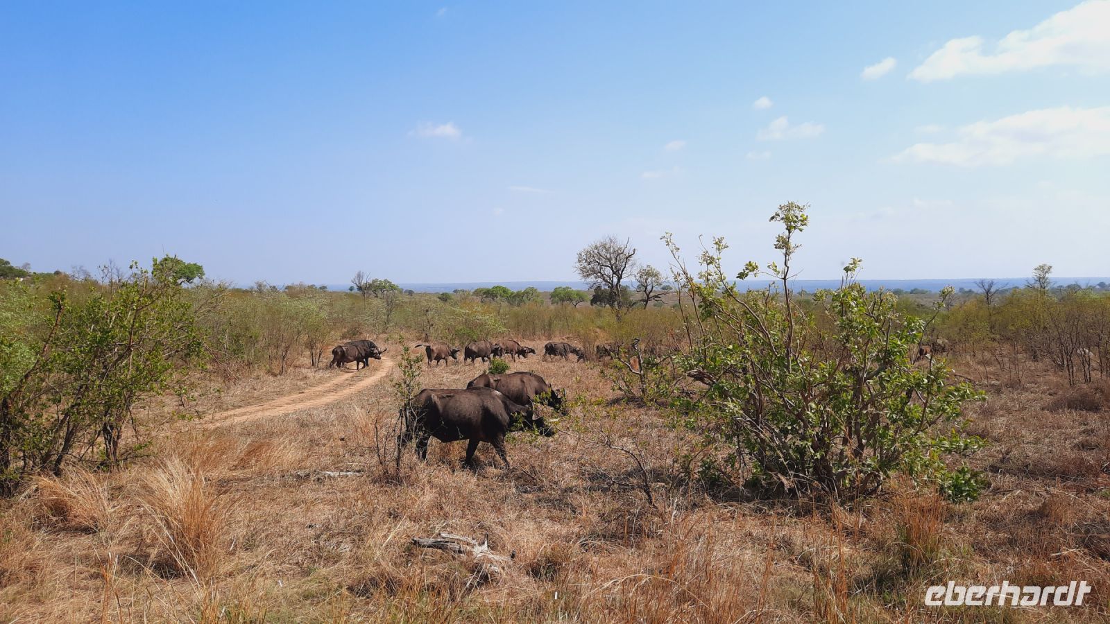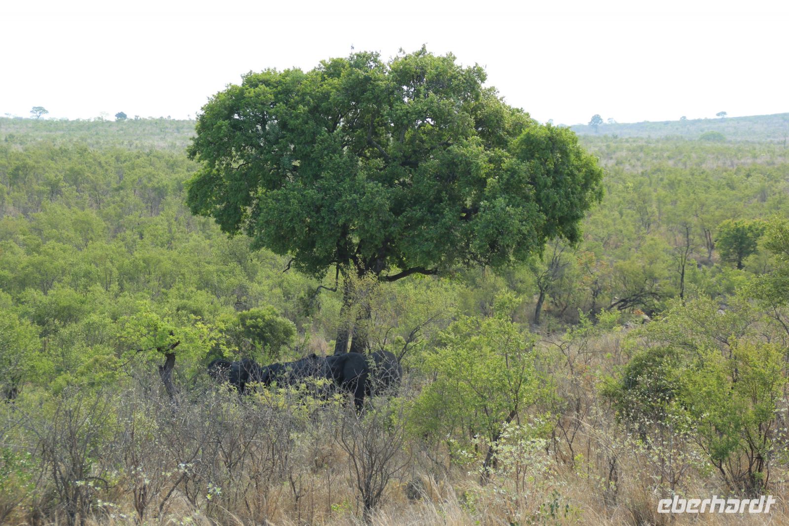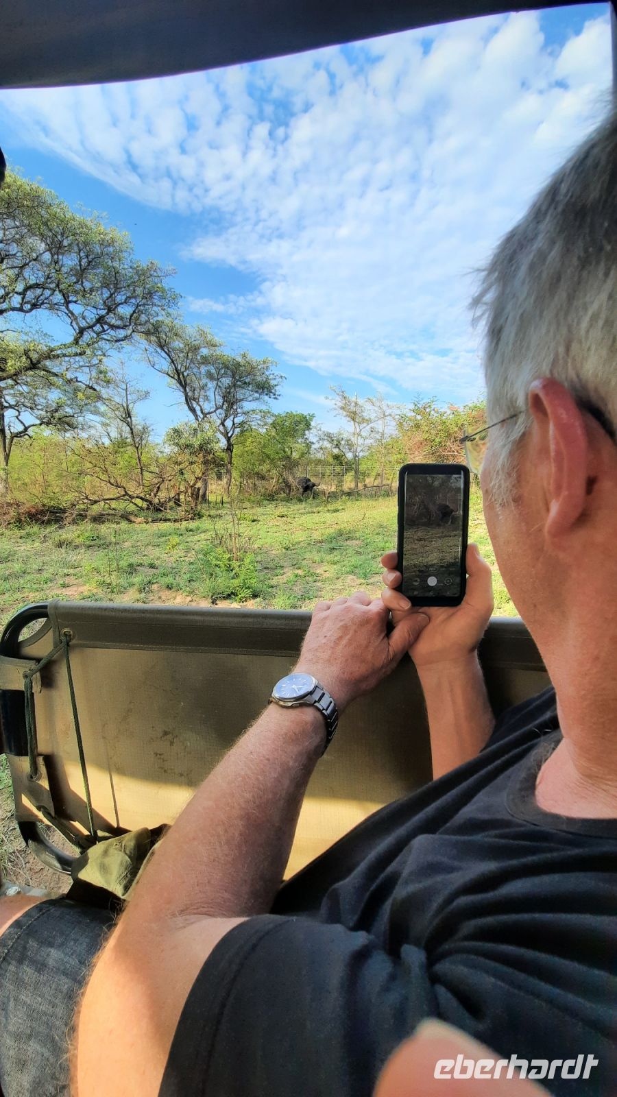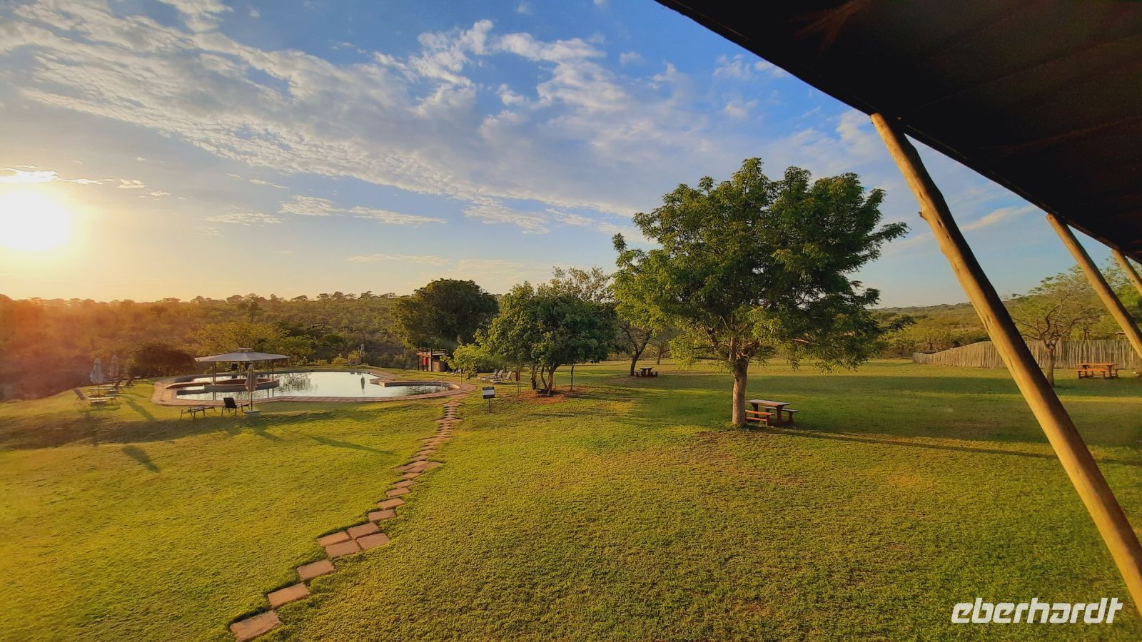 Guten Morgen Krüger-Nationalpark! Mit Sonnenaufgang trafen wir uns zu einem kurzen Frühstück und dann sollte unsere Safari auch schon losgehen. Kurz nachdem wir unsere Lodge verlassen hatten, begegneten wir auch schon zwei der Big Five. Wir sahen einen Büffel und einen frühstückenden Elefanten. Begeistert fuhren wir zum Tor Nnumbi Gate, meldeten unsere kleine illustre Gruppe an und schon machten wir uns auf, die wilden Tiere des Krüger zu entdecken. Schon bald sahen wir Zebras, Impalas, welche sich als Fast Food für die großen Raubtiere herausstellten, und auch ein paar Giraffen. Wir fuhren Wasserlöcher mit Flusspferden an, retteten kleine Schildkröten, kamen einer Büffelherde ganz nah, konnten uns von der Schönheit der Warzenschweine persönlich ein Bild von machen und befanden die majestätischen Kudus für zu schön, um gefressen zu werden. Plötzlich erspähte unser Fahrer etwas in der Ferne. Andere Autos standen bereits vor Ort. Da muss was sein! Und tatsächlich hatte es sich ein Rudel Wildhunde unter einem Baum gemütlich gemacht. Er erzählte uns, dass man sie nur sehr selten zu Gesicht bekommt. Nach einer Erfrischungspause in einem der nahe gelegenen Camps ging unsere Erkundungstour weiter. Nun endlich entdeckten wir auch eine Elefantenherde in der Ferne. Ein weiteres Highlight folgte direkt im Anschluss. Ganz in der Ferne konnte man an einem Wasserloch drei Löwen erkennen. Gut, dass ein Gast ein Fernglas dabei hatte. Während wir weiterfuhren, wären wir doch fast an einem kleinen Rudel junger Löwen vorbeigefahren. Auch diese entspannten sich in der Mittagssonne im Schatten. Die Mähne des Löwen bildet sich erst im frühen Erwachsenenalter vollständig aus, wenn die Löwen vier bis sechs Jahre alt sind. Bis zum Nachmittag sahen wir noch weitere Tiere, wie Dik Diks, Paviane, Gnus, Giraffen und nochmal Elefanten. Somit hatten wir über den Tag verteilt drei der Big Five entdecken können. Nur das Nashorn und den Leopard ließ sich nicht blicken. Da wir noch Zeit bis zum Abendessen hatten, genossen wir ein Bad im Pool. Das Wetter schwang gerade um von sehr heiß und sonnig über den Tag in Gewitter mit kräftigen Regenschauern für den Abend. Schade, hatten wir uns doch auf traditionelles Braai-Abendessen unter freiem Himmel gefreut. Trotzdem glücklich über das Gesehene, verschwanden wir nach dem Abendessen in unseren Bungalows.