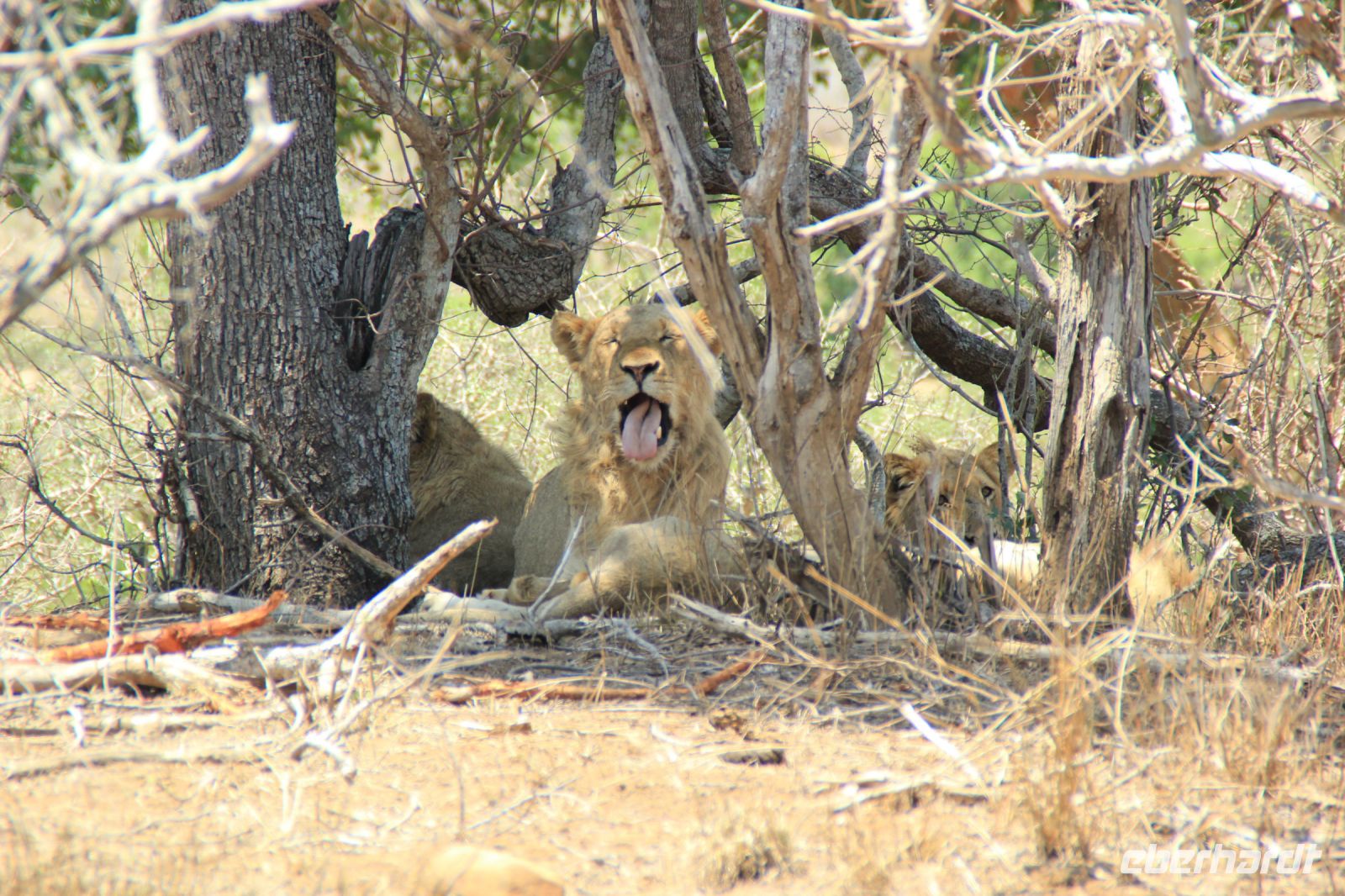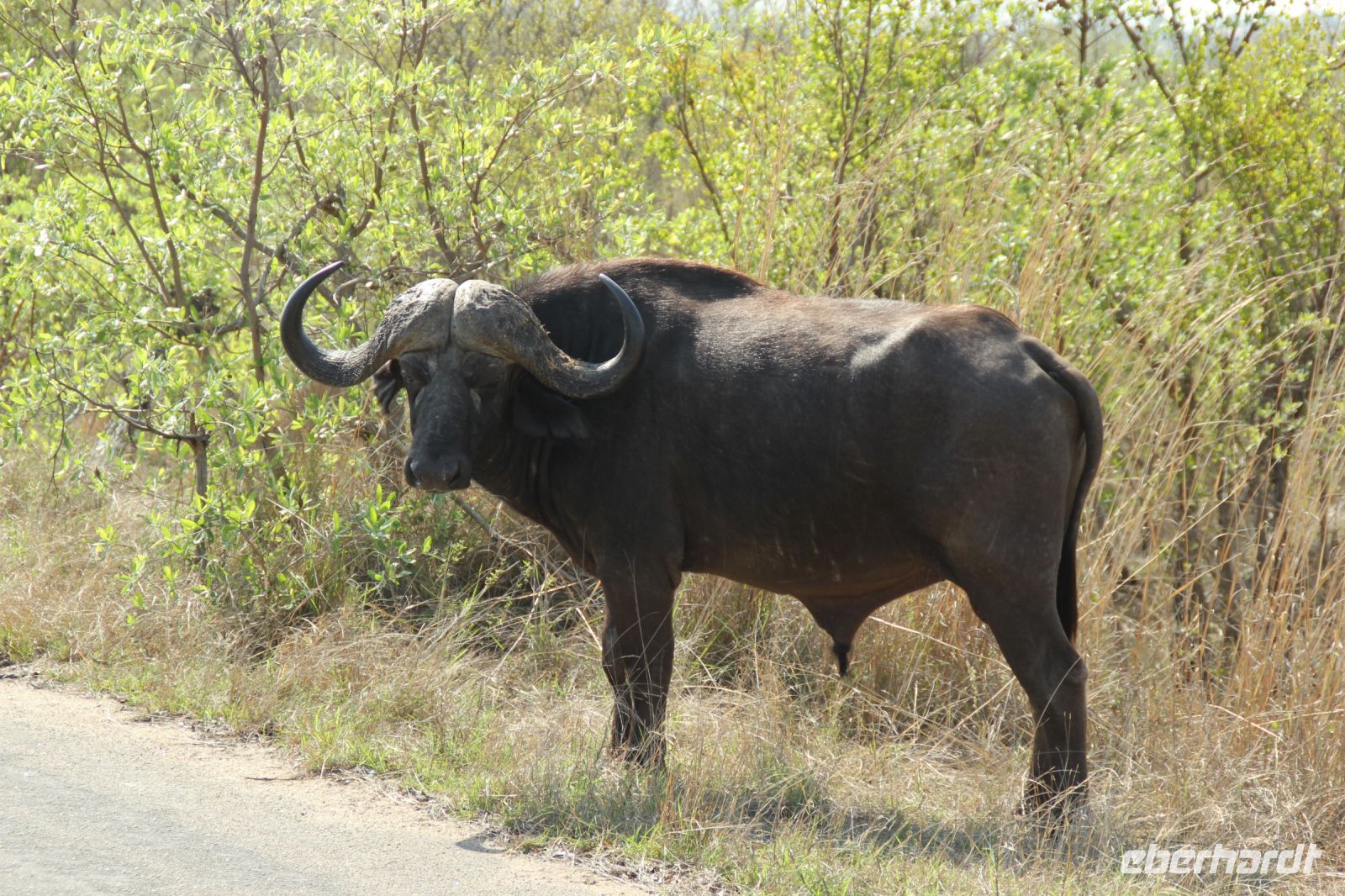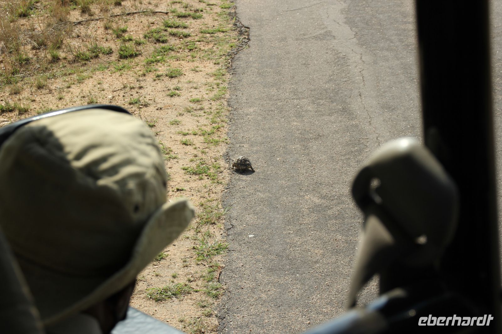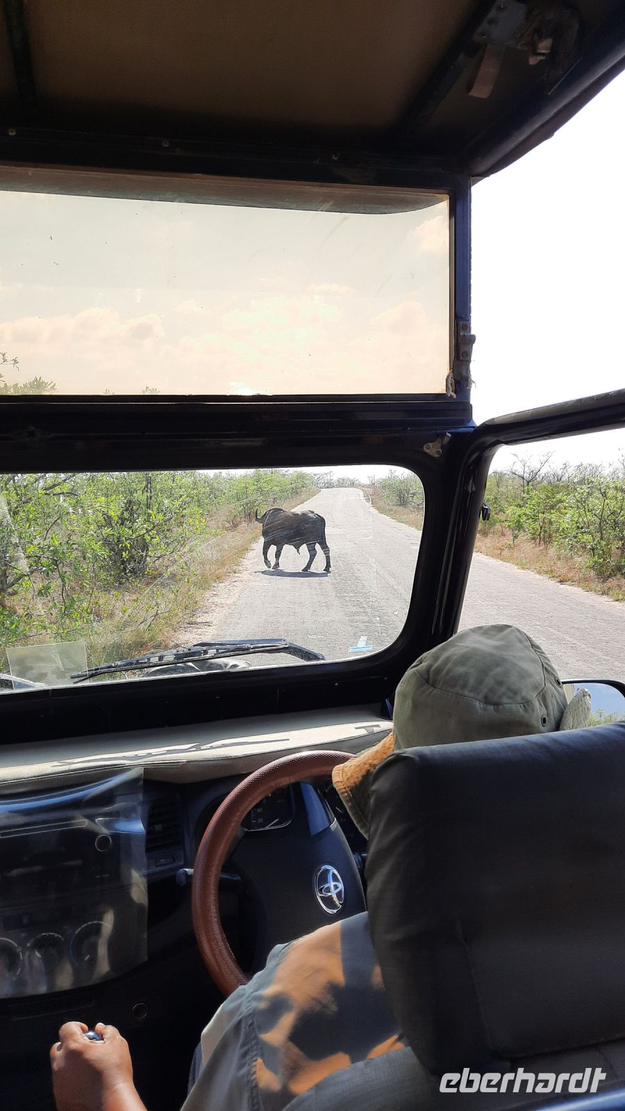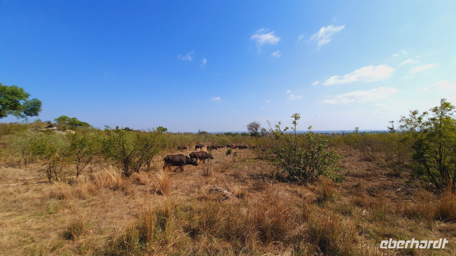 Guten Morgen Krüger-Nationalpark! Mit Sonnenaufgang trafen wir uns zu einem kurzen Frühstück und dann sollte unsere Safari auch schon losgehen. Kurz nachdem wir unsere Lodge verlassen hatten, begegneten wir auch schon zwei der Big Five. Wir sahen einen Büffel und einen frühstückenden Elefanten. Begeistert fuhren wir zum Tor Nnumbi Gate, meldeten unsere kleine illustre Gruppe an und schon machten wir uns auf, die wilden Tiere des Krüger zu entdecken. Schon bald sahen wir Zebras, Impalas, welche sich als Fast Food für die großen Raubtiere herausstellten, und auch ein paar Giraffen. Wir fuhren Wasserlöcher mit Flusspferden an, retteten kleine Schildkröten, kamen einer Büffelherde ganz nah, konnten uns von der Schönheit der Warzenschweine persönlich ein Bild von machen und befanden die majestätischen Kudus für zu schön, um gefressen zu werden. Plötzlich erspähte unser Fahrer etwas in der Ferne. Andere Autos standen bereits vor Ort. Da muss was sein! Und tatsächlich hatte es sich ein Rudel Wildhunde unter einem Baum gemütlich gemacht. Er erzählte uns, dass man sie nur sehr selten zu Gesicht bekommt. Nach einer Erfrischungspause in einem der nahe gelegenen Camps ging unsere Erkundungstour weiter. Nun endlich entdeckten wir auch eine Elefantenherde in der Ferne. Ein weiteres Highlight folgte direkt im Anschluss. Ganz in der Ferne konnte man an einem Wasserloch drei Löwen erkennen. Gut, dass ein Gast ein Fernglas dabei hatte. Während wir weiterfuhren, wären wir doch fast an einem kleinen Rudel junger Löwen vorbeigefahren. Auch diese entspannten sich in der Mittagssonne im Schatten. Die Mähne des Löwen bildet sich erst im frühen Erwachsenenalter vollständig aus, wenn die Löwen vier bis sechs Jahre alt sind. Bis zum Nachmittag sahen wir noch weitere Tiere, wie Dik Diks, Paviane, Gnus, Giraffen und nochmal Elefanten. Somit hatten wir über den Tag verteilt drei der Big Five entdecken können. Nur das Nashorn und den Leopard ließ sich nicht blicken. Da wir noch Zeit bis zum Abendessen hatten, genossen wir ein Bad im Pool. Das Wetter schwang gerade um von sehr heiß und sonnig über den Tag in Gewitter mit kräftigen Regenschauern für den Abend. Schade, hatten wir uns doch auf traditionelles Braai-Abendessen unter freiem Himmel gefreut. Trotzdem glücklich über das Gesehene, verschwanden wir nach dem Abendessen in unseren Bungalows.