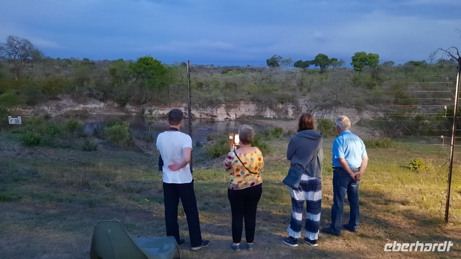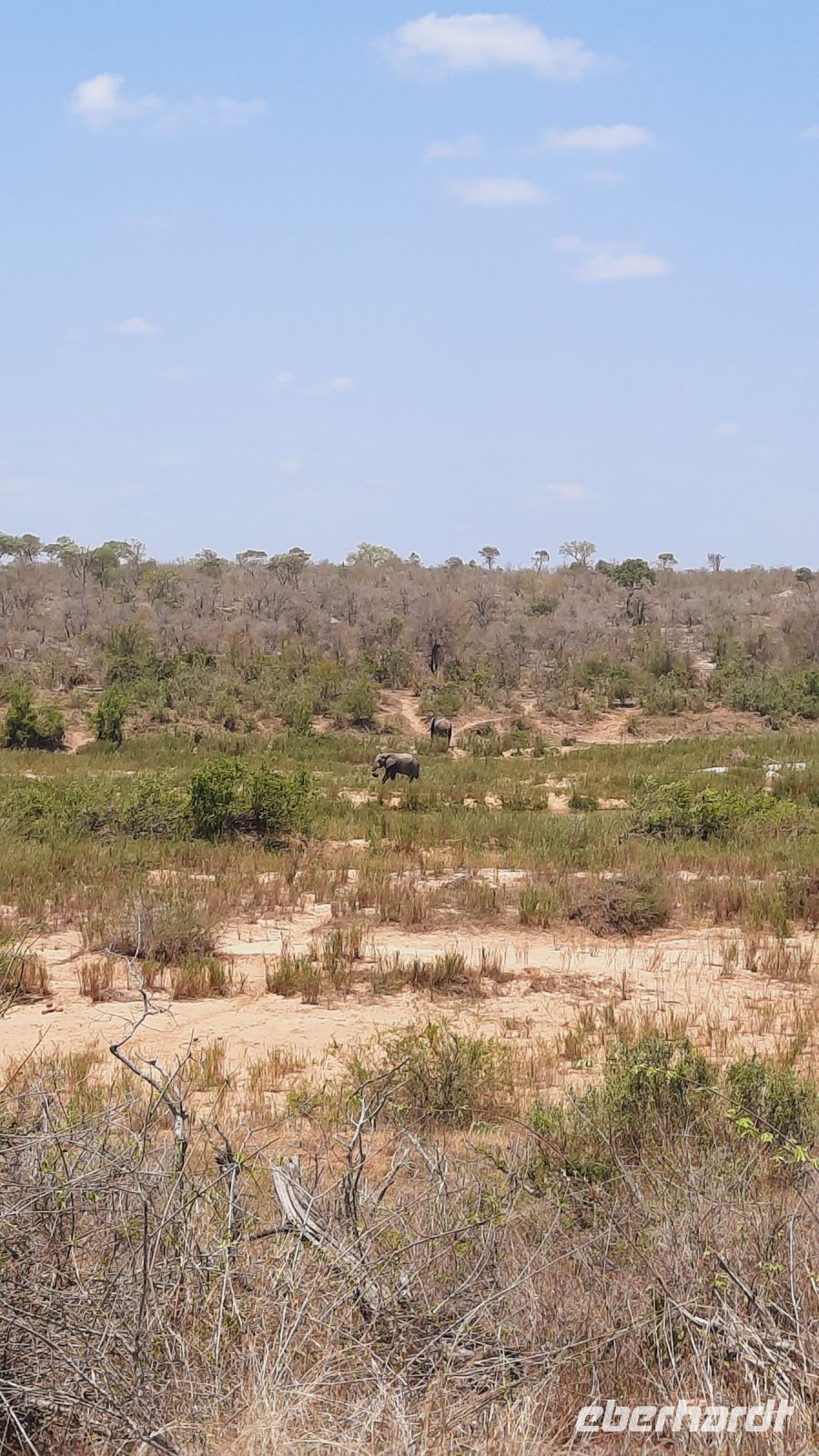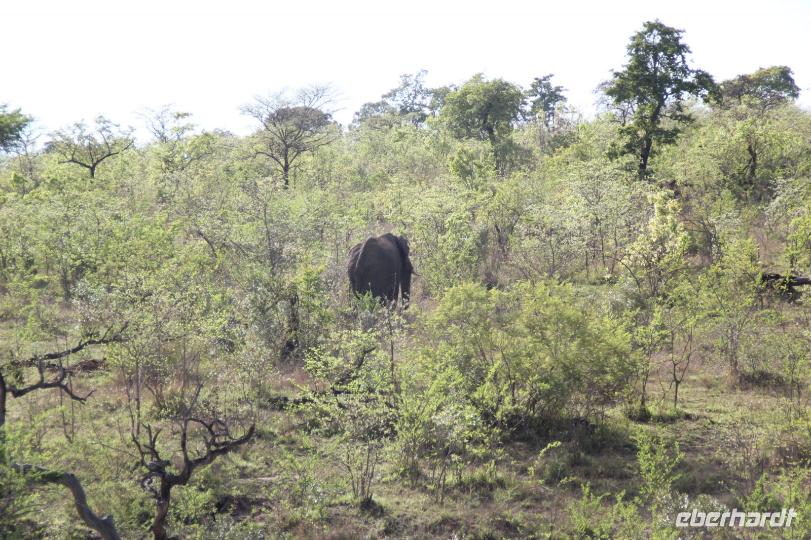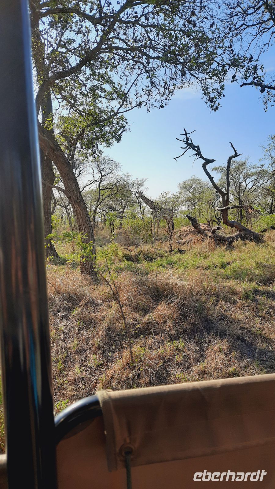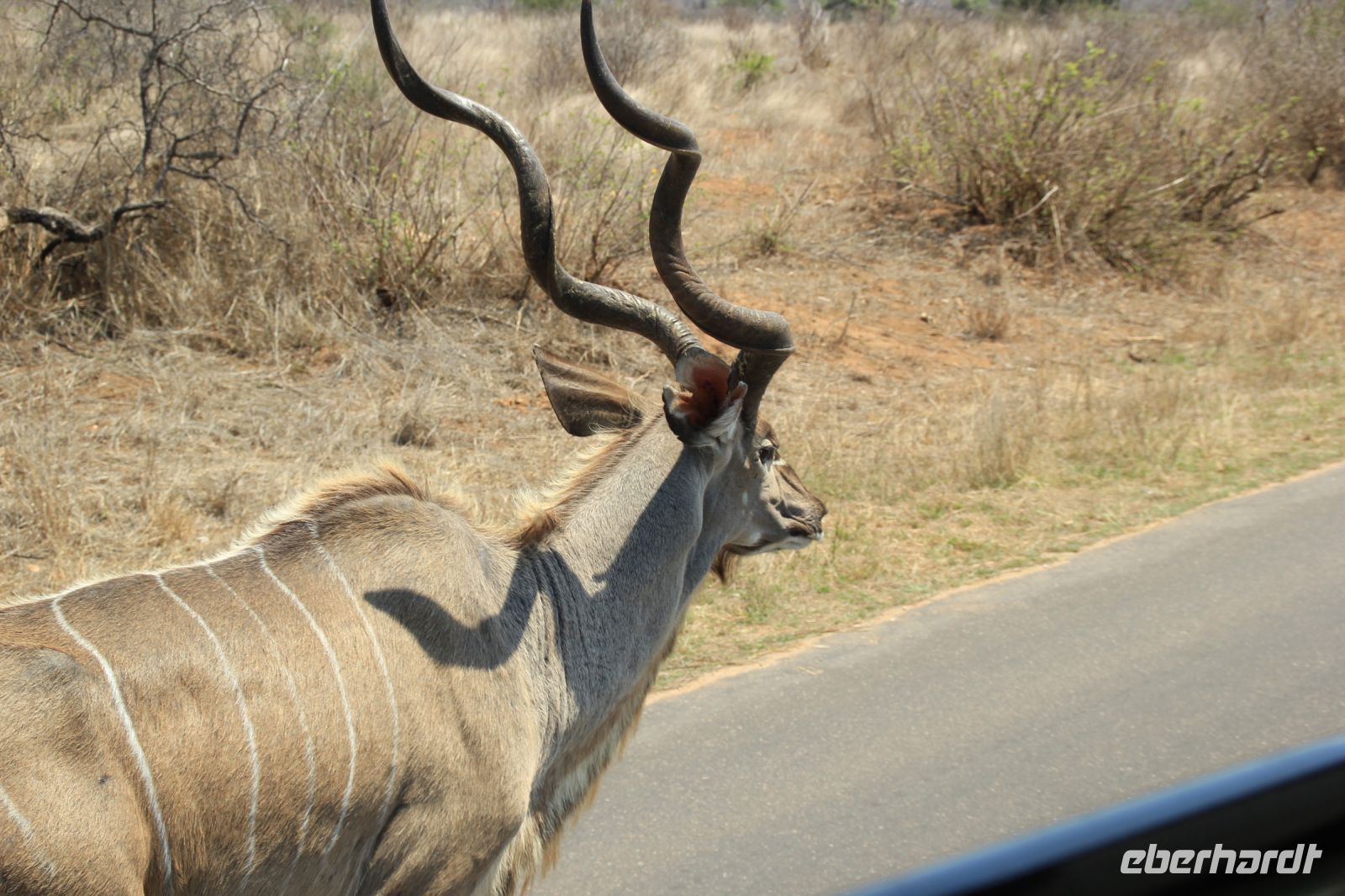 Guten Morgen Krüger-Nationalpark! Mit Sonnenaufgang trafen wir uns zu einem kurzen Frühstück und dann sollte unsere Safari auch schon losgehen. Kurz nachdem wir unsere Lodge verlassen hatten, begegneten wir auch schon zwei der Big Five. Wir sahen einen Büffel und einen frühstückenden Elefanten. Begeistert fuhren wir zum Tor Nnumbi Gate, meldeten unsere kleine illustre Gruppe an und schon machten wir uns auf, die wilden Tiere des Krüger zu entdecken. Schon bald sahen wir Zebras, Impalas, welche sich als Fast Food für die großen Raubtiere herausstellten, und auch ein paar Giraffen. Wir fuhren Wasserlöcher mit Flusspferden an, retteten kleine Schildkröten, kamen einer Büffelherde ganz nah, konnten uns von der Schönheit der Warzenschweine persönlich ein Bild von machen und befanden die majestätischen Kudus für zu schön, um gefressen zu werden. Plötzlich erspähte unser Fahrer etwas in der Ferne. Andere Autos standen bereits vor Ort. Da muss was sein! Und tatsächlich hatte es sich ein Rudel Wildhunde unter einem Baum gemütlich gemacht. Er erzählte uns, dass man sie nur sehr selten zu Gesicht bekommt. Nach einer Erfrischungspause in einem der nahe gelegenen Camps ging unsere Erkundungstour weiter. Nun endlich entdeckten wir auch eine Elefantenherde in der Ferne. Ein weiteres Highlight folgte direkt im Anschluss. Ganz in der Ferne konnte man an einem Wasserloch drei Löwen erkennen. Gut, dass ein Gast ein Fernglas dabei hatte. Während wir weiterfuhren, wären wir doch fast an einem kleinen Rudel junger Löwen vorbeigefahren. Auch diese entspannten sich in der Mittagssonne im Schatten. Die Mähne des Löwen bildet sich erst im frühen Erwachsenenalter vollständig aus, wenn die Löwen vier bis sechs Jahre alt sind. Bis zum Nachmittag sahen wir noch weitere Tiere, wie Dik Diks, Paviane, Gnus, Giraffen und nochmal Elefanten. Somit hatten wir über den Tag verteilt drei der Big Five entdecken können. Nur das Nashorn und den Leopard ließ sich nicht blicken. Da wir noch Zeit bis zum Abendessen hatten, genossen wir ein Bad im Pool. Das Wetter schwang gerade um von sehr heiß und sonnig über den Tag in Gewitter mit kräftigen Regenschauern für den Abend. Schade, hatten wir uns doch auf traditionelles Braai-Abendessen unter freiem Himmel gefreut. Trotzdem glücklich über das Gesehene, verschwanden wir nach dem Abendessen in unseren Bungalows.