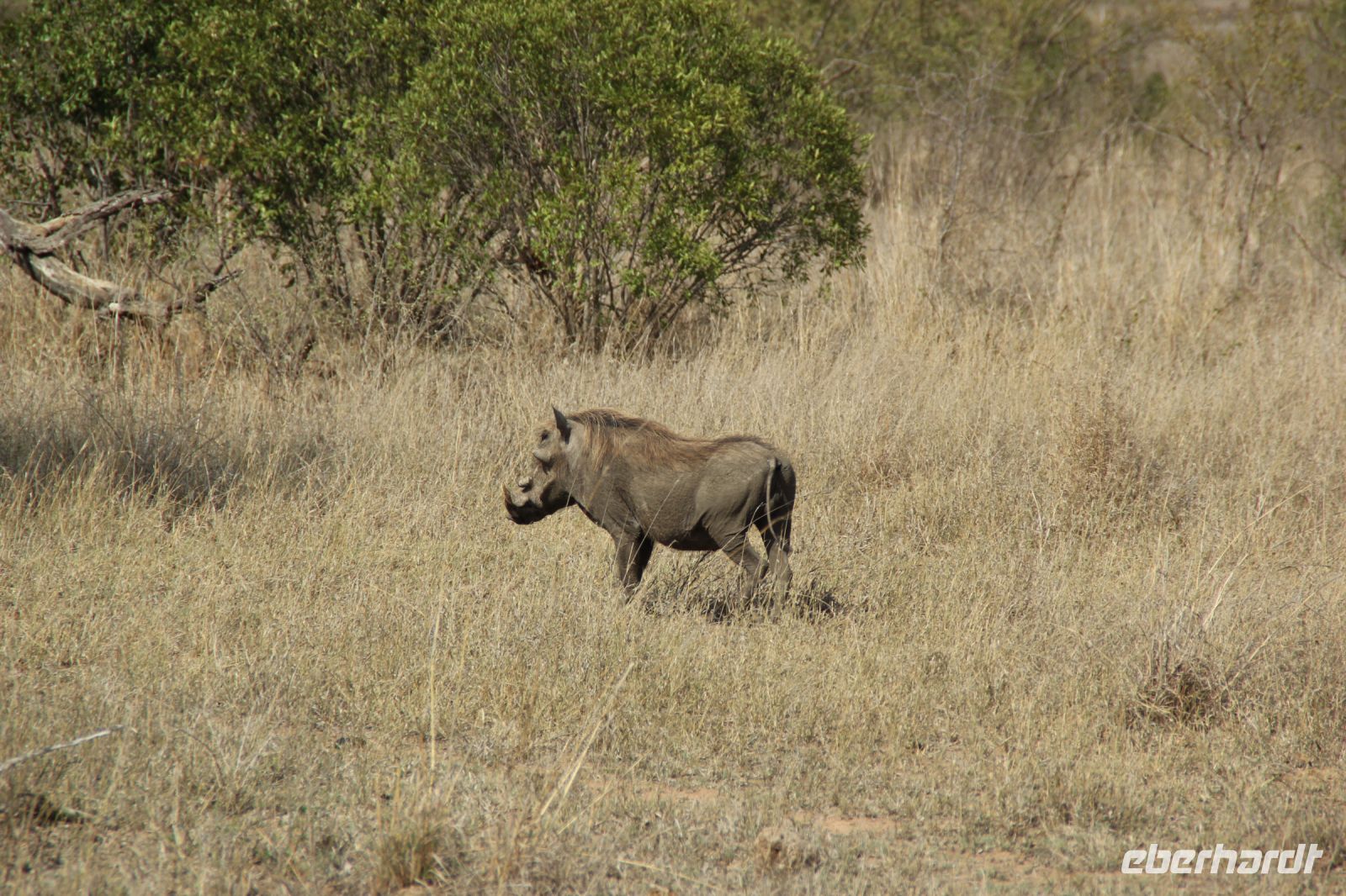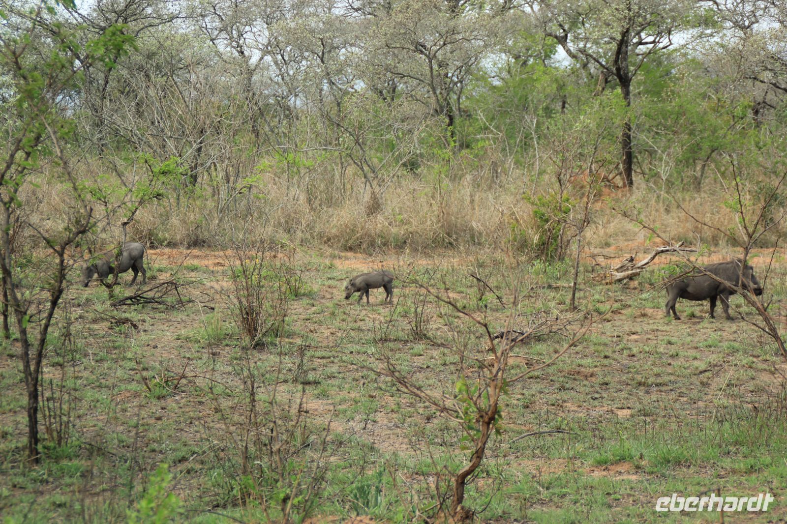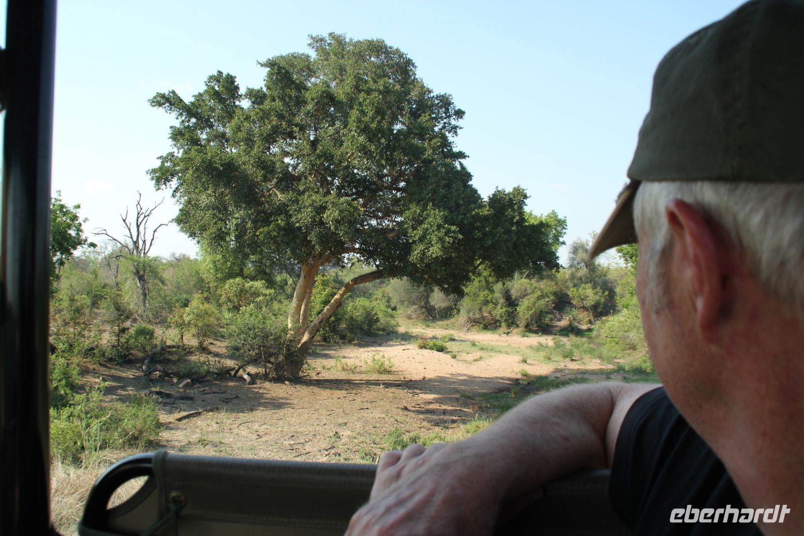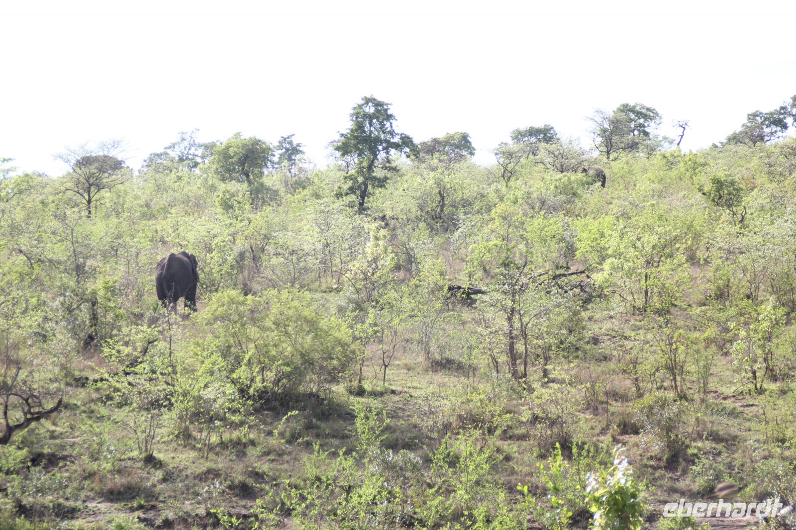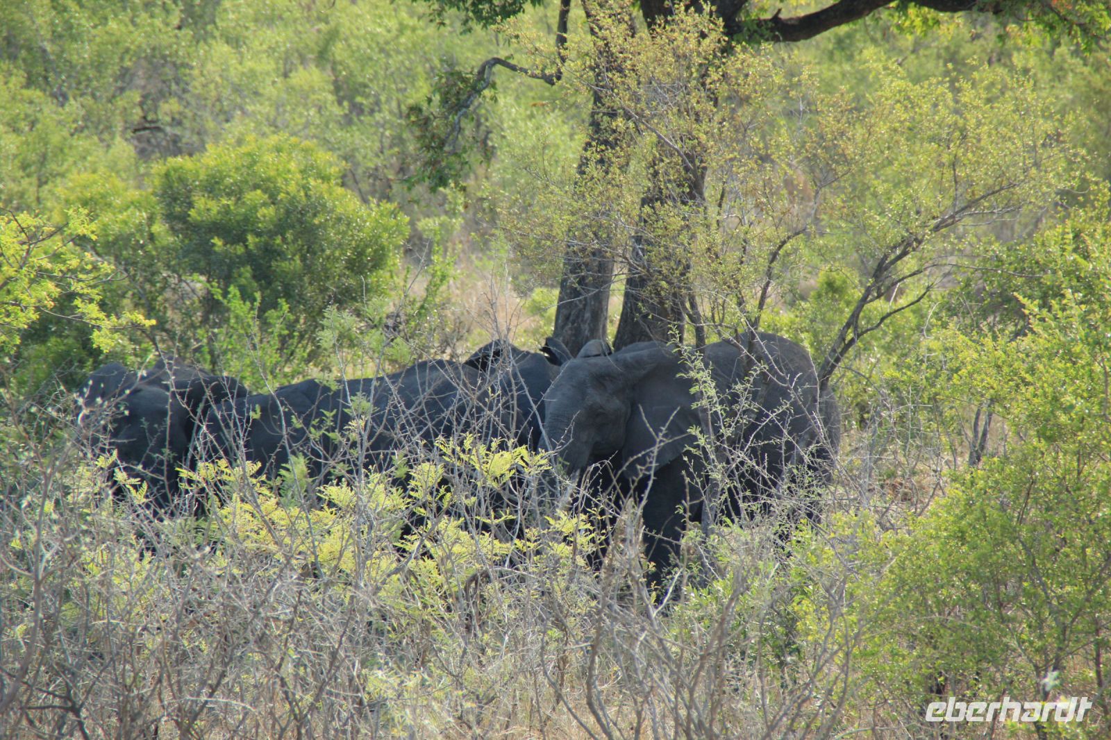 Guten Morgen Krüger-Nationalpark! Mit Sonnenaufgang trafen wir uns zu einem kurzen Frühstück und dann sollte unsere Safari auch schon losgehen. Kurz nachdem wir unsere Lodge verlassen hatten, begegneten wir auch schon zwei der Big Five. Wir sahen einen Büffel und einen frühstückenden Elefanten. Begeistert fuhren wir zum Tor Nnumbi Gate, meldeten unsere kleine illustre Gruppe an und schon machten wir uns auf, die wilden Tiere des Krüger zu entdecken. Schon bald sahen wir Zebras, Impalas, welche sich als Fast Food für die großen Raubtiere herausstellten, und auch ein paar Giraffen. Wir fuhren Wasserlöcher mit Flusspferden an, retteten kleine Schildkröten, kamen einer Büffelherde ganz nah, konnten uns von der Schönheit der Warzenschweine persönlich ein Bild von machen und befanden die majestätischen Kudus für zu schön, um gefressen zu werden. Plötzlich erspähte unser Fahrer etwas in der Ferne. Andere Autos standen bereits vor Ort. Da muss was sein! Und tatsächlich hatte es sich ein Rudel Wildhunde unter einem Baum gemütlich gemacht. Er erzählte uns, dass man sie nur sehr selten zu Gesicht bekommt. Nach einer Erfrischungspause in einem der nahe gelegenen Camps ging unsere Erkundungstour weiter. Nun endlich entdeckten wir auch eine Elefantenherde in der Ferne. Ein weiteres Highlight folgte direkt im Anschluss. Ganz in der Ferne konnte man an einem Wasserloch drei Löwen erkennen. Gut, dass ein Gast ein Fernglas dabei hatte. Während wir weiterfuhren, wären wir doch fast an einem kleinen Rudel junger Löwen vorbeigefahren. Auch diese entspannten sich in der Mittagssonne im Schatten. Die Mähne des Löwen bildet sich erst im frühen Erwachsenenalter vollständig aus, wenn die Löwen vier bis sechs Jahre alt sind. Bis zum Nachmittag sahen wir noch weitere Tiere, wie Dik Diks, Paviane, Gnus, Giraffen und nochmal Elefanten. Somit hatten wir über den Tag verteilt drei der Big Five entdecken können. Nur das Nashorn und den Leopard ließ sich nicht blicken. Da wir noch Zeit bis zum Abendessen hatten, genossen wir ein Bad im Pool. Das Wetter schwang gerade um von sehr heiß und sonnig über den Tag in Gewitter mit kräftigen Regenschauern für den Abend. Schade, hatten wir uns doch auf traditionelles Braai-Abendessen unter freiem Himmel gefreut. Trotzdem glücklich über das Gesehene, verschwanden wir nach dem Abendessen in unseren Bungalows.