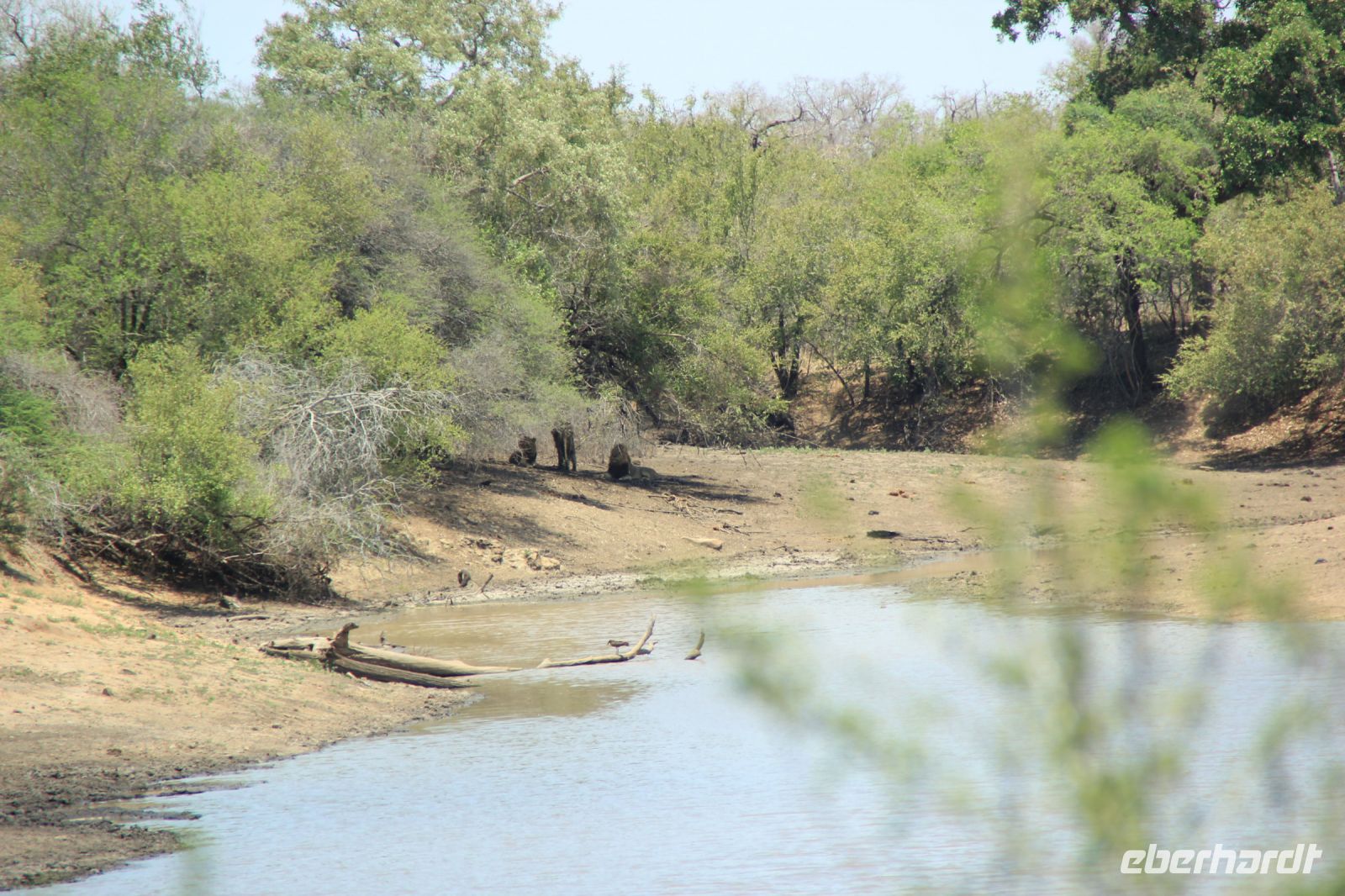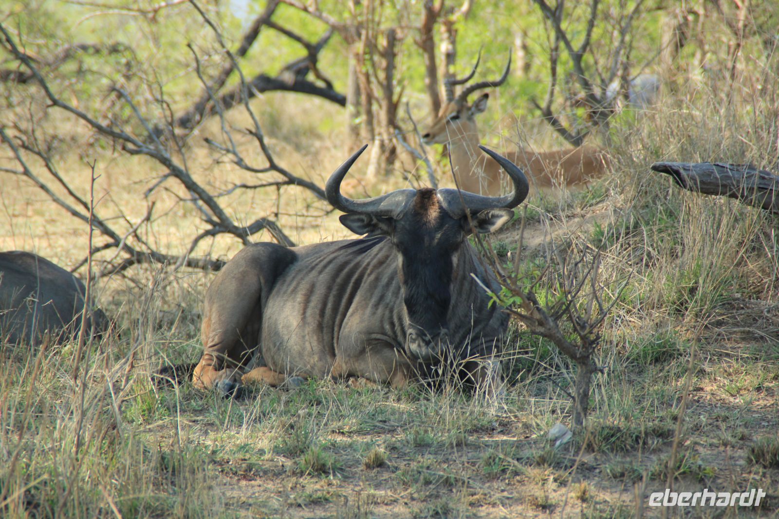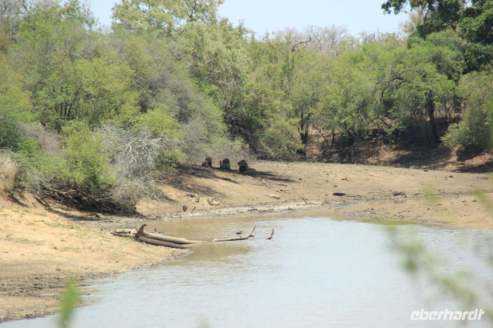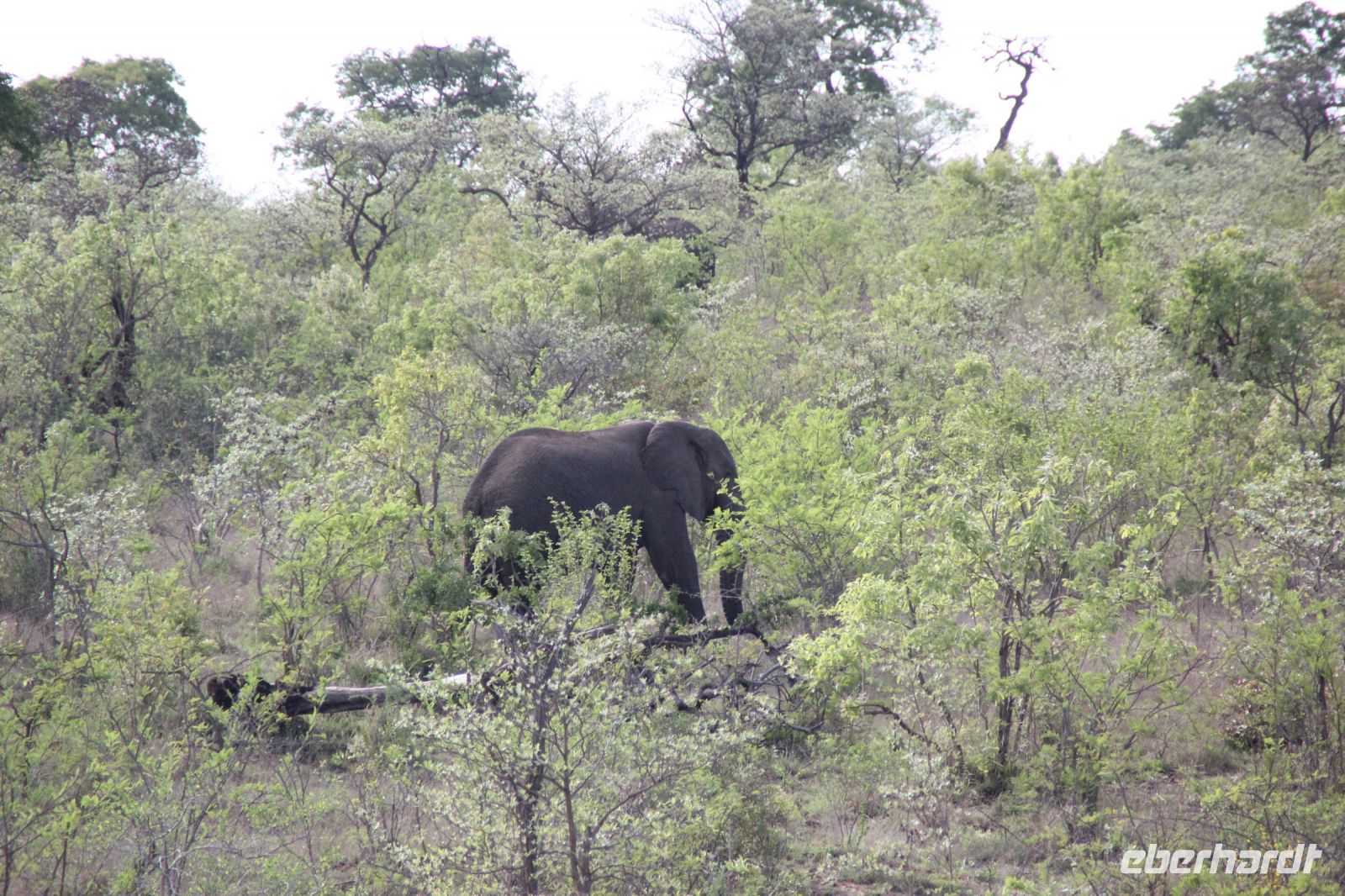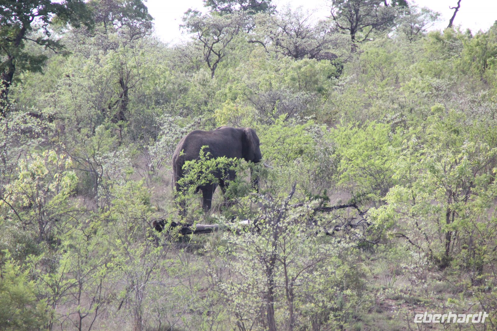 Guten Morgen Krüger-Nationalpark! Mit Sonnenaufgang trafen wir uns zu einem kurzen Frühstück und dann sollte unsere Safari auch schon losgehen. Kurz nachdem wir unsere Lodge verlassen hatten, begegneten wir auch schon zwei der Big Five. Wir sahen einen Büffel und einen frühstückenden Elefanten. Begeistert fuhren wir zum Tor Nnumbi Gate, meldeten unsere kleine illustre Gruppe an und schon machten wir uns auf, die wilden Tiere des Krüger zu entdecken. Schon bald sahen wir Zebras, Impalas, welche sich als Fast Food für die großen Raubtiere herausstellten, und auch ein paar Giraffen. Wir fuhren Wasserlöcher mit Flusspferden an, retteten kleine Schildkröten, kamen einer Büffelherde ganz nah, konnten uns von der Schönheit der Warzenschweine persönlich ein Bild von machen und befanden die majestätischen Kudus für zu schön, um gefressen zu werden. Plötzlich erspähte unser Fahrer etwas in der Ferne. Andere Autos standen bereits vor Ort. Da muss was sein! Und tatsächlich hatte es sich ein Rudel Wildhunde unter einem Baum gemütlich gemacht. Er erzählte uns, dass man sie nur sehr selten zu Gesicht bekommt. Nach einer Erfrischungspause in einem der nahe gelegenen Camps ging unsere Erkundungstour weiter. Nun endlich entdeckten wir auch eine Elefantenherde in der Ferne. Ein weiteres Highlight folgte direkt im Anschluss. Ganz in der Ferne konnte man an einem Wasserloch drei Löwen erkennen. Gut, dass ein Gast ein Fernglas dabei hatte. Während wir weiterfuhren, wären wir doch fast an einem kleinen Rudel junger Löwen vorbeigefahren. Auch diese entspannten sich in der Mittagssonne im Schatten. Die Mähne des Löwen bildet sich erst im frühen Erwachsenenalter vollständig aus, wenn die Löwen vier bis sechs Jahre alt sind. Bis zum Nachmittag sahen wir noch weitere Tiere, wie Dik Diks, Paviane, Gnus, Giraffen und nochmal Elefanten. Somit hatten wir über den Tag verteilt drei der Big Five entdecken können. Nur das Nashorn und den Leopard ließ sich nicht blicken. Da wir noch Zeit bis zum Abendessen hatten, genossen wir ein Bad im Pool. Das Wetter schwang gerade um von sehr heiß und sonnig über den Tag in Gewitter mit kräftigen Regenschauern für den Abend. Schade, hatten wir uns doch auf traditionelles Braai-Abendessen unter freiem Himmel gefreut. Trotzdem glücklich über das Gesehene, verschwanden wir nach dem Abendessen in unseren Bungalows.