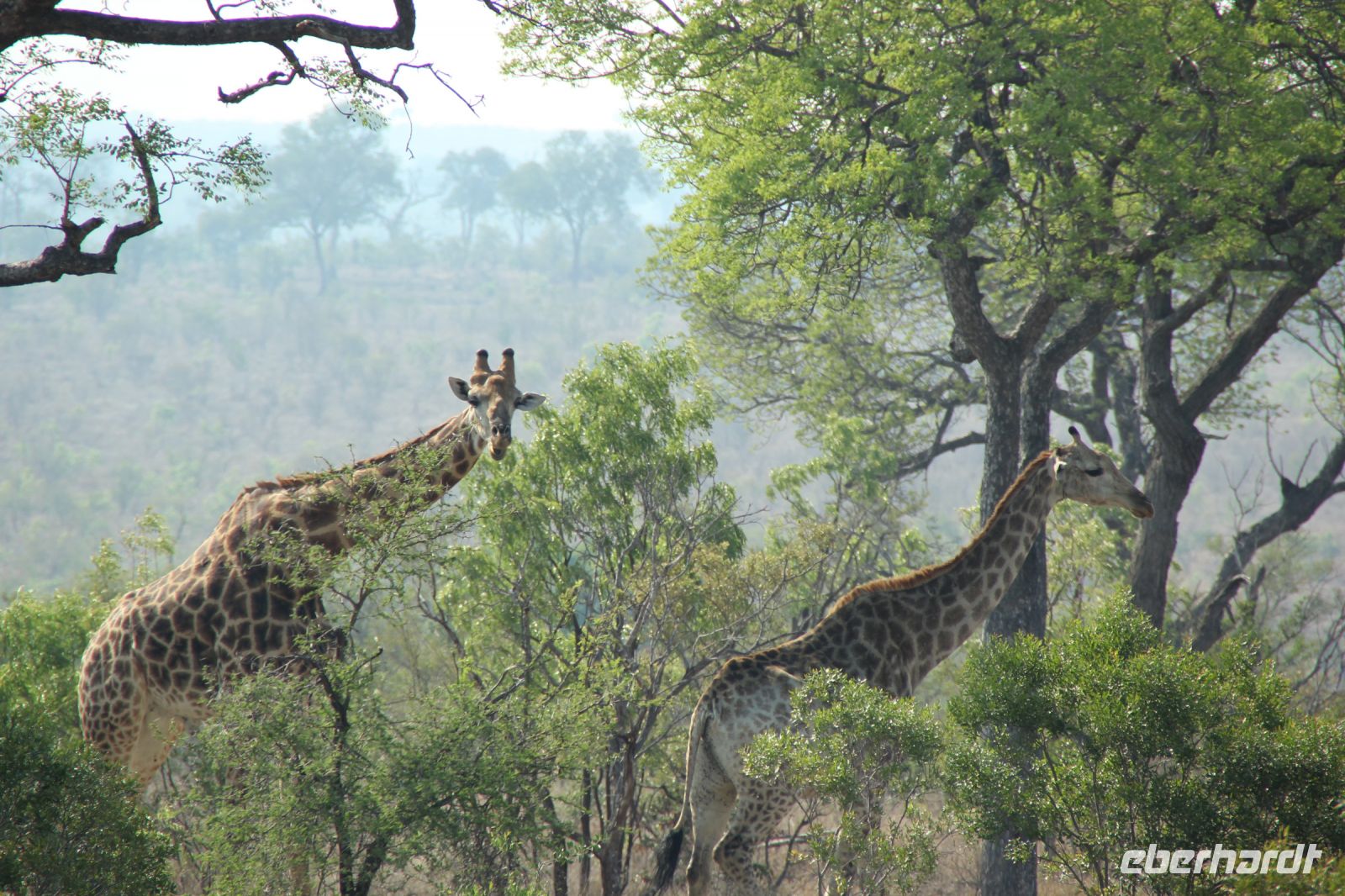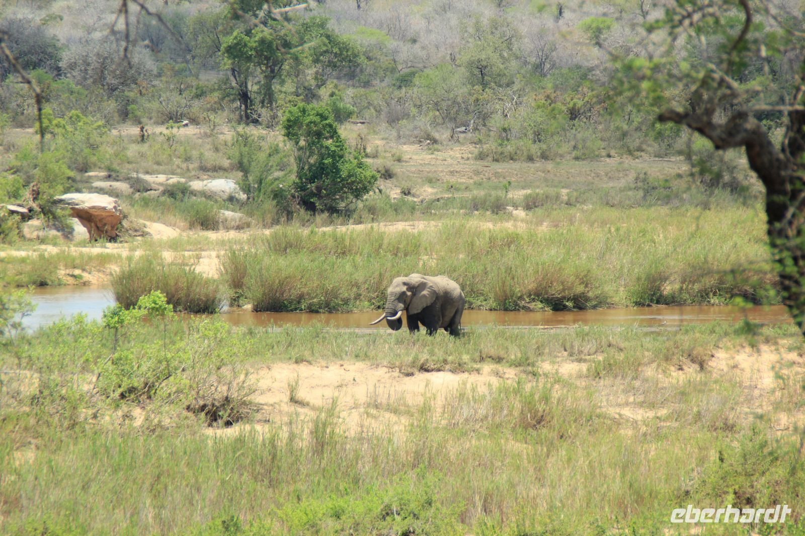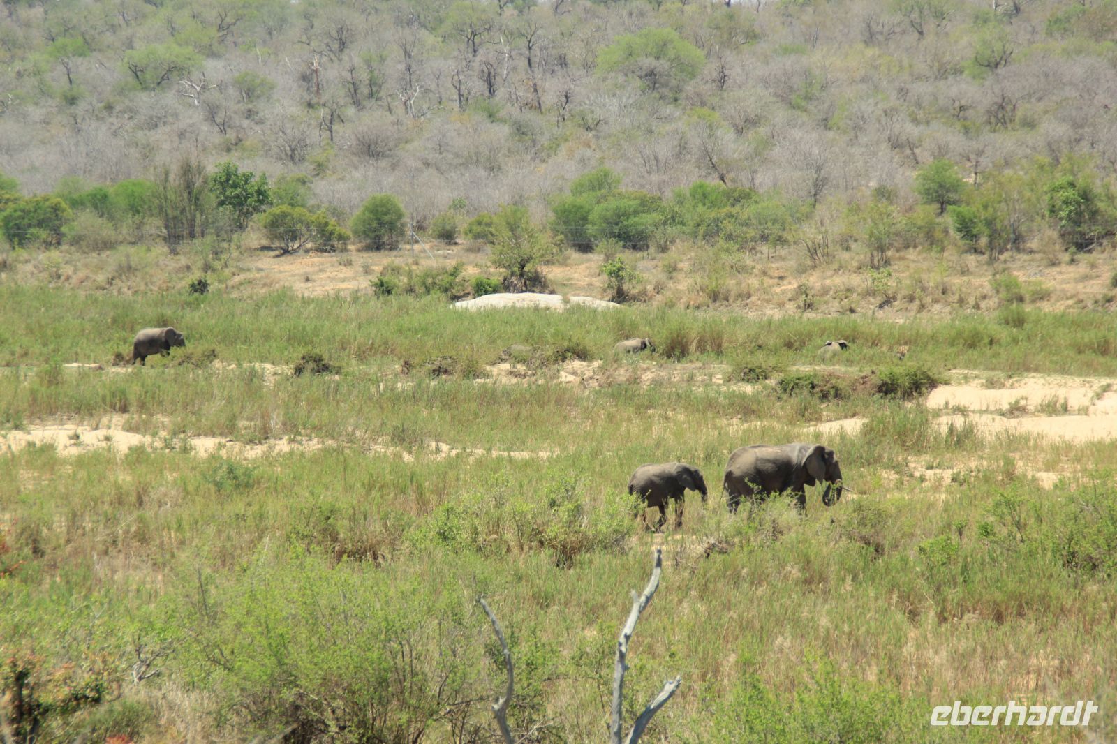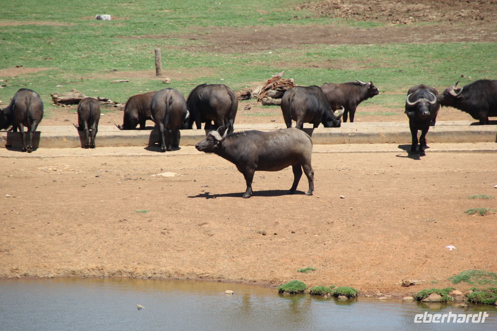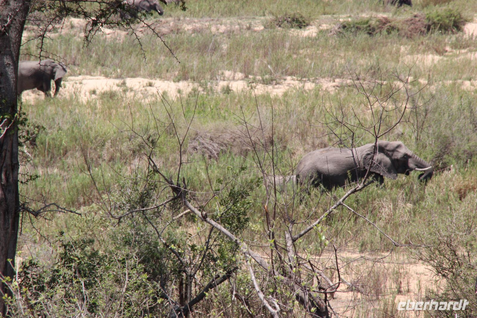 Guten Morgen Krüger-Nationalpark! Mit Sonnenaufgang trafen wir uns zu einem kurzen Frühstück und dann sollte unsere Safari auch schon losgehen. Kurz nachdem wir unsere Lodge verlassen hatten, begegneten wir auch schon zwei der Big Five. Wir sahen einen Büffel und einen frühstückenden Elefanten. Begeistert fuhren wir zum Tor Nnumbi Gate, meldeten unsere kleine illustre Gruppe an und schon machten wir uns auf, die wilden Tiere des Krüger zu entdecken. Schon bald sahen wir Zebras, Impalas, welche sich als Fast Food für die großen Raubtiere herausstellten, und auch ein paar Giraffen. Wir fuhren Wasserlöcher mit Flusspferden an, retteten kleine Schildkröten, kamen einer Büffelherde ganz nah, konnten uns von der Schönheit der Warzenschweine persönlich ein Bild von machen und befanden die majestätischen Kudus für zu schön, um gefressen zu werden. Plötzlich erspähte unser Fahrer etwas in der Ferne. Andere Autos standen bereits vor Ort. Da muss was sein! Und tatsächlich hatte es sich ein Rudel Wildhunde unter einem Baum gemütlich gemacht. Er erzählte uns, dass man sie nur sehr selten zu Gesicht bekommt. Nach einer Erfrischungspause in einem der nahe gelegenen Camps ging unsere Erkundungstour weiter. Nun endlich entdeckten wir auch eine Elefantenherde in der Ferne. Ein weiteres Highlight folgte direkt im Anschluss. Ganz in der Ferne konnte man an einem Wasserloch drei Löwen erkennen. Gut, dass ein Gast ein Fernglas dabei hatte. Während wir weiterfuhren, wären wir doch fast an einem kleinen Rudel junger Löwen vorbeigefahren. Auch diese entspannten sich in der Mittagssonne im Schatten. Die Mähne des Löwen bildet sich erst im frühen Erwachsenenalter vollständig aus, wenn die Löwen vier bis sechs Jahre alt sind. Bis zum Nachmittag sahen wir noch weitere Tiere, wie Dik Diks, Paviane, Gnus, Giraffen und nochmal Elefanten. Somit hatten wir über den Tag verteilt drei der Big Five entdecken können. Nur das Nashorn und den Leopard ließ sich nicht blicken. Da wir noch Zeit bis zum Abendessen hatten, genossen wir ein Bad im Pool. Das Wetter schwang gerade um von sehr heiß und sonnig über den Tag in Gewitter mit kräftigen Regenschauern für den Abend. Schade, hatten wir uns doch auf traditionelles Braai-Abendessen unter freiem Himmel gefreut. Trotzdem glücklich über das Gesehene, verschwanden wir nach dem Abendessen in unseren Bungalows.