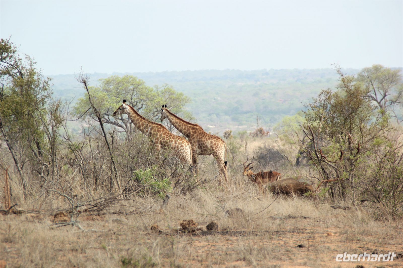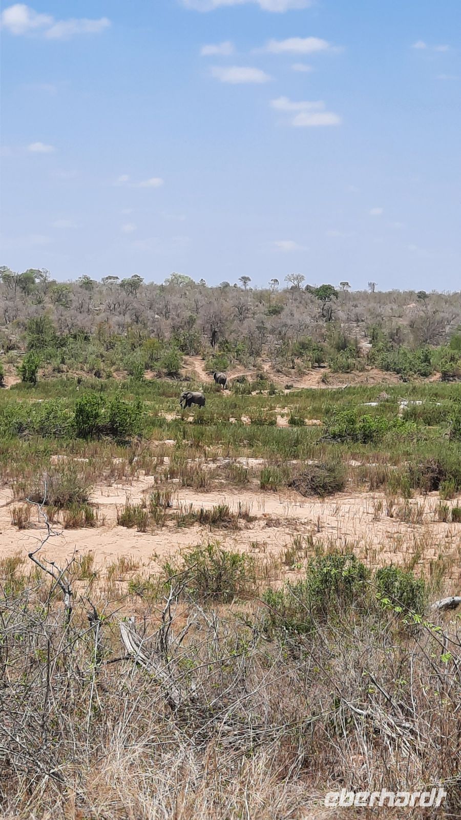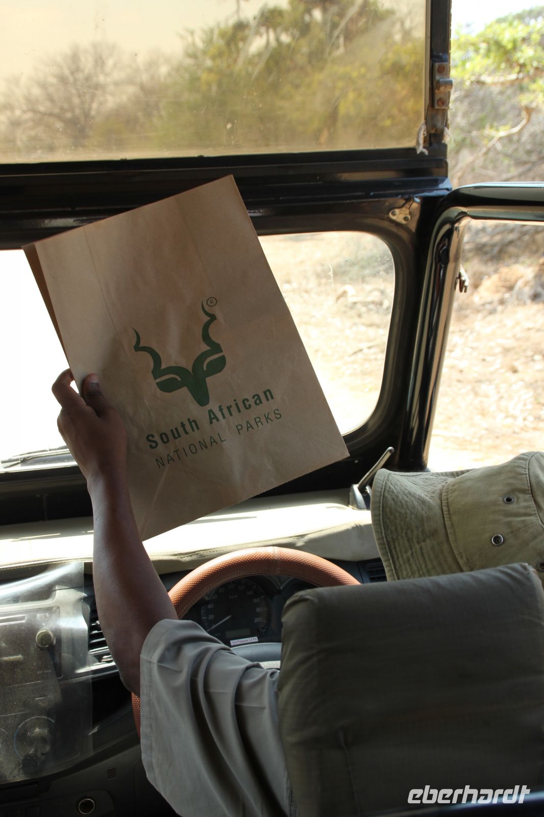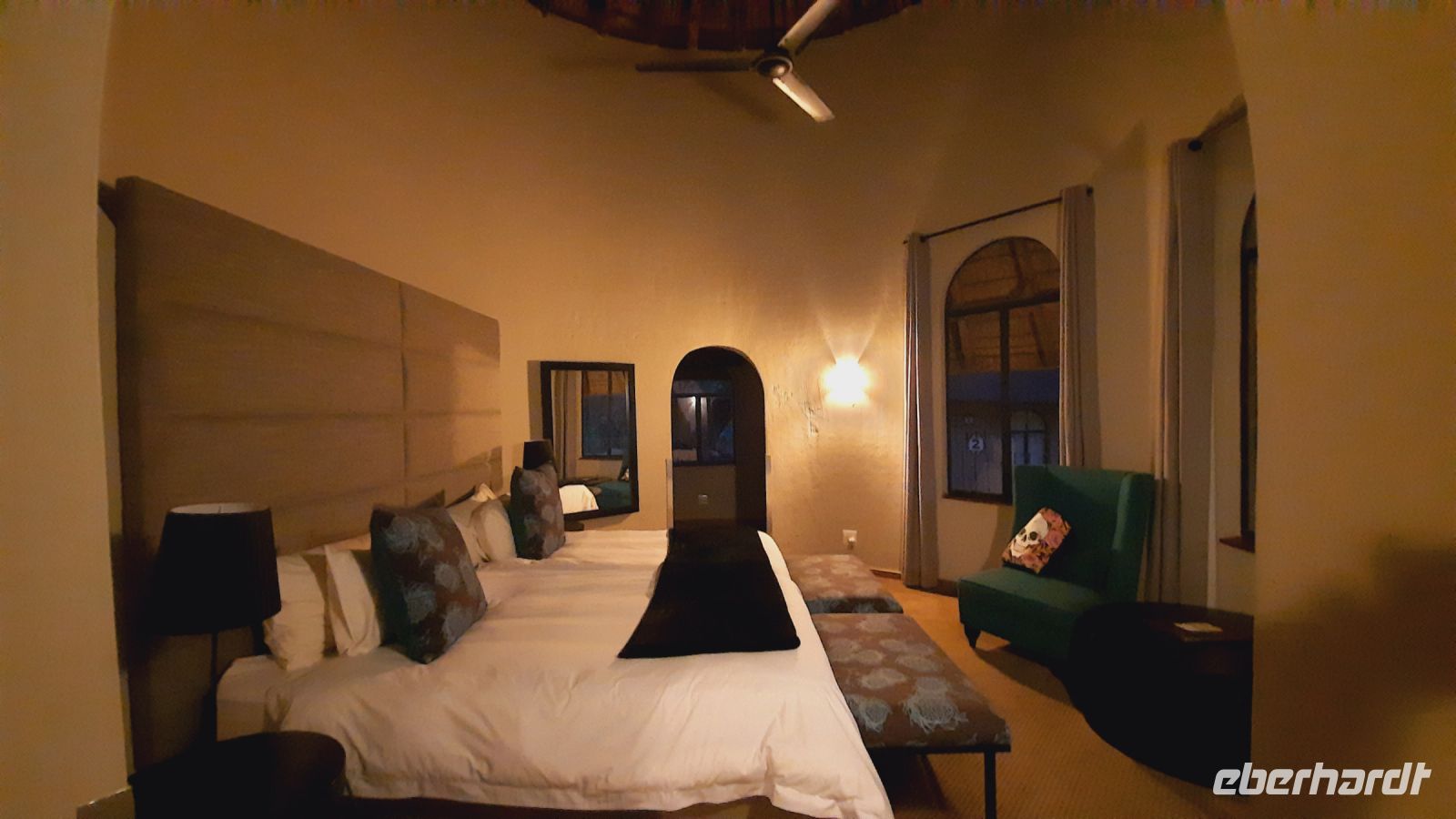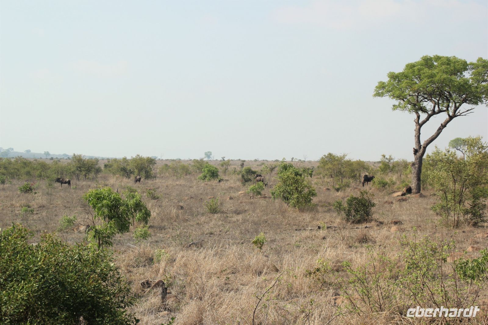 Guten Morgen Krüger-Nationalpark! Mit Sonnenaufgang trafen wir uns zu einem kurzen Frühstück und dann sollte unsere Safari auch schon losgehen. Kurz nachdem wir unsere Lodge verlassen hatten, begegneten wir auch schon zwei der Big Five. Wir sahen einen Büffel und einen frühstückenden Elefanten. Begeistert fuhren wir zum Tor Nnumbi Gate, meldeten unsere kleine illustre Gruppe an und schon machten wir uns auf, die wilden Tiere des Krüger zu entdecken. Schon bald sahen wir Zebras, Impalas, welche sich als Fast Food für die großen Raubtiere herausstellten, und auch ein paar Giraffen. Wir fuhren Wasserlöcher mit Flusspferden an, retteten kleine Schildkröten, kamen einer Büffelherde ganz nah, konnten uns von der Schönheit der Warzenschweine persönlich ein Bild von machen und befanden die majestätischen Kudus für zu schön, um gefressen zu werden. Plötzlich erspähte unser Fahrer etwas in der Ferne. Andere Autos standen bereits vor Ort. Da muss was sein! Und tatsächlich hatte es sich ein Rudel Wildhunde unter einem Baum gemütlich gemacht. Er erzählte uns, dass man sie nur sehr selten zu Gesicht bekommt. Nach einer Erfrischungspause in einem der nahe gelegenen Camps ging unsere Erkundungstour weiter. Nun endlich entdeckten wir auch eine Elefantenherde in der Ferne. Ein weiteres Highlight folgte direkt im Anschluss. Ganz in der Ferne konnte man an einem Wasserloch drei Löwen erkennen. Gut, dass ein Gast ein Fernglas dabei hatte. Während wir weiterfuhren, wären wir doch fast an einem kleinen Rudel junger Löwen vorbeigefahren. Auch diese entspannten sich in der Mittagssonne im Schatten. Die Mähne des Löwen bildet sich erst im frühen Erwachsenenalter vollständig aus, wenn die Löwen vier bis sechs Jahre alt sind. Bis zum Nachmittag sahen wir noch weitere Tiere, wie Dik Diks, Paviane, Gnus, Giraffen und nochmal Elefanten. Somit hatten wir über den Tag verteilt drei der Big Five entdecken können. Nur das Nashorn und den Leopard ließ sich nicht blicken. Da wir noch Zeit bis zum Abendessen hatten, genossen wir ein Bad im Pool. Das Wetter schwang gerade um von sehr heiß und sonnig über den Tag in Gewitter mit kräftigen Regenschauern für den Abend. Schade, hatten wir uns doch auf traditionelles Braai-Abendessen unter freiem Himmel gefreut. Trotzdem glücklich über das Gesehene, verschwanden wir nach dem Abendessen in unseren Bungalows.