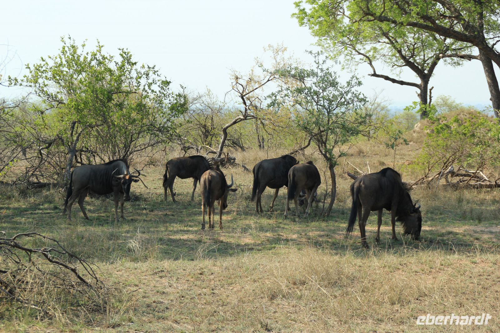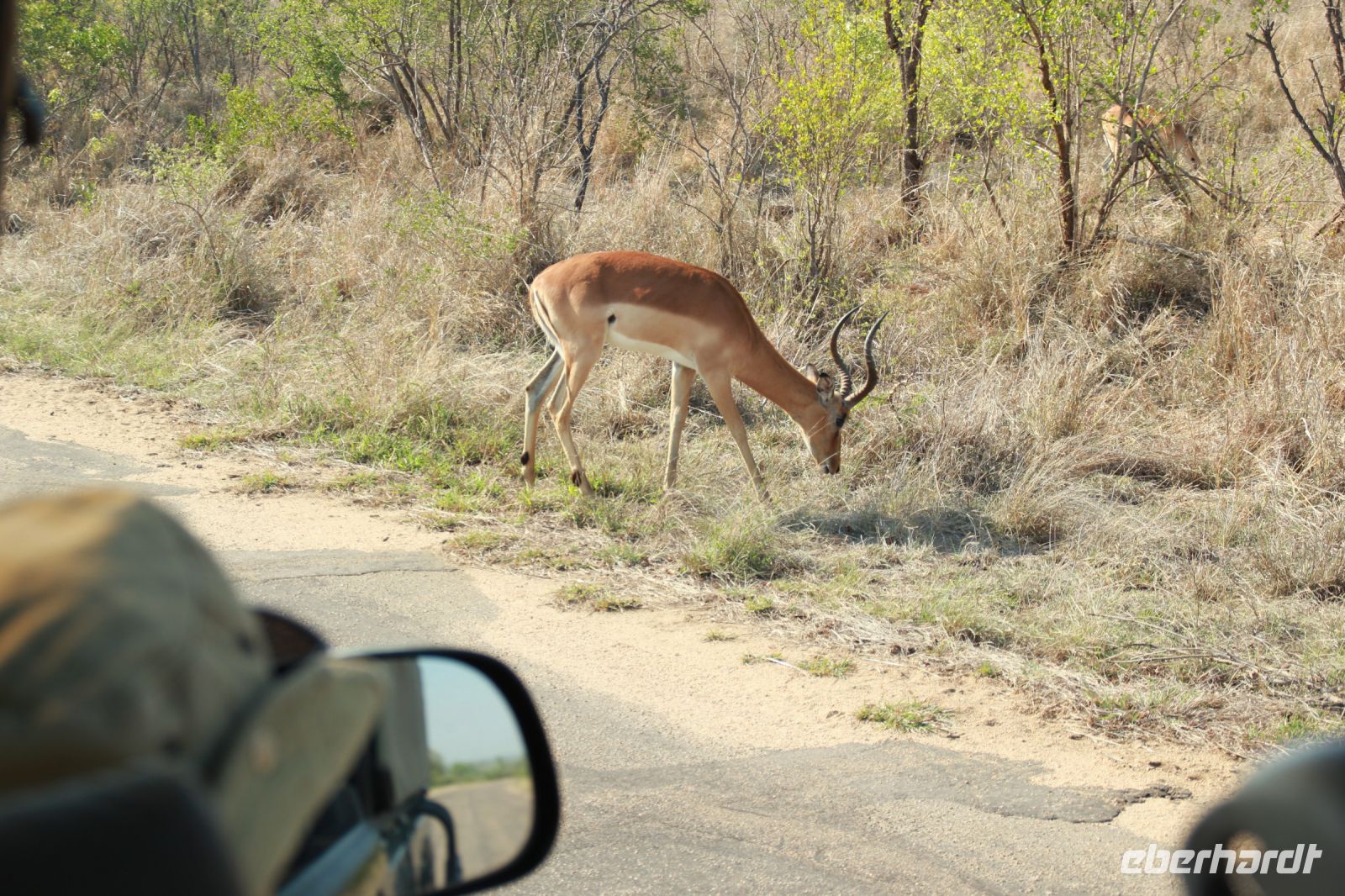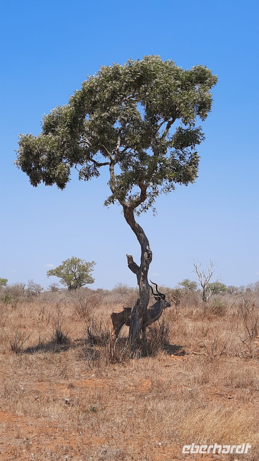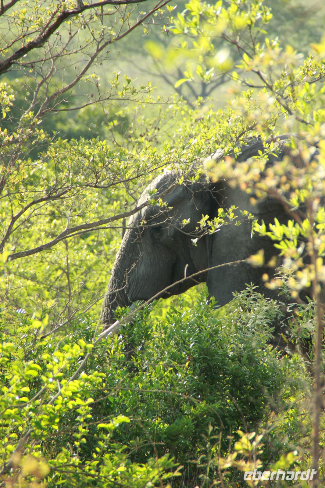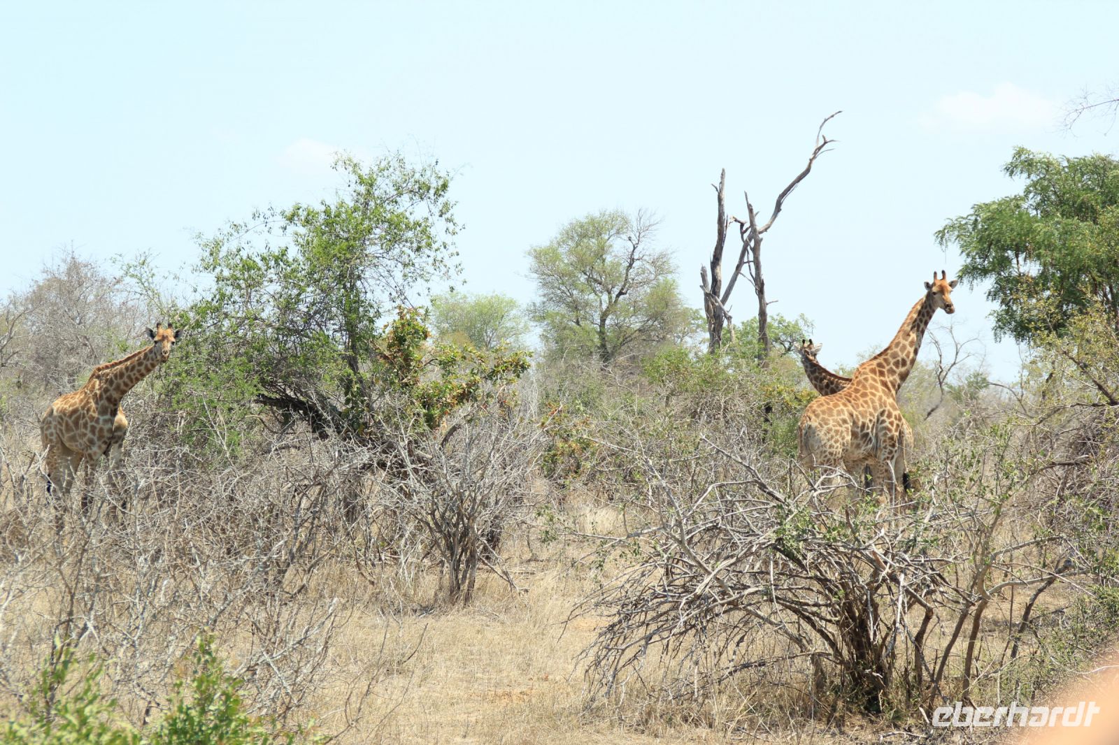 Guten Morgen Krüger-Nationalpark! Mit Sonnenaufgang trafen wir uns zu einem kurzen Frühstück und dann sollte unsere Safari auch schon losgehen. Kurz nachdem wir unsere Lodge verlassen hatten, begegneten wir auch schon zwei der Big Five. Wir sahen einen Büffel und einen frühstückenden Elefanten. Begeistert fuhren wir zum Tor Nnumbi Gate, meldeten unsere kleine illustre Gruppe an und schon machten wir uns auf, die wilden Tiere des Krüger zu entdecken. Schon bald sahen wir Zebras, Impalas, welche sich als Fast Food für die großen Raubtiere herausstellten, und auch ein paar Giraffen. Wir fuhren Wasserlöcher mit Flusspferden an, retteten kleine Schildkröten, kamen einer Büffelherde ganz nah, konnten uns von der Schönheit der Warzenschweine persönlich ein Bild von machen und befanden die majestätischen Kudus für zu schön, um gefressen zu werden. Plötzlich erspähte unser Fahrer etwas in der Ferne. Andere Autos standen bereits vor Ort. Da muss was sein! Und tatsächlich hatte es sich ein Rudel Wildhunde unter einem Baum gemütlich gemacht. Er erzählte uns, dass man sie nur sehr selten zu Gesicht bekommt. Nach einer Erfrischungspause in einem der nahe gelegenen Camps ging unsere Erkundungstour weiter. Nun endlich entdeckten wir auch eine Elefantenherde in der Ferne. Ein weiteres Highlight folgte direkt im Anschluss. Ganz in der Ferne konnte man an einem Wasserloch drei Löwen erkennen. Gut, dass ein Gast ein Fernglas dabei hatte. Während wir weiterfuhren, wären wir doch fast an einem kleinen Rudel junger Löwen vorbeigefahren. Auch diese entspannten sich in der Mittagssonne im Schatten. Die Mähne des Löwen bildet sich erst im frühen Erwachsenenalter vollständig aus, wenn die Löwen vier bis sechs Jahre alt sind. Bis zum Nachmittag sahen wir noch weitere Tiere, wie Dik Diks, Paviane, Gnus, Giraffen und nochmal Elefanten. Somit hatten wir über den Tag verteilt drei der Big Five entdecken können. Nur das Nashorn und den Leopard ließ sich nicht blicken. Da wir noch Zeit bis zum Abendessen hatten, genossen wir ein Bad im Pool. Das Wetter schwang gerade um von sehr heiß und sonnig über den Tag in Gewitter mit kräftigen Regenschauern für den Abend. Schade, hatten wir uns doch auf traditionelles Braai-Abendessen unter freiem Himmel gefreut. Trotzdem glücklich über das Gesehene, verschwanden wir nach dem Abendessen in unseren Bungalows.
