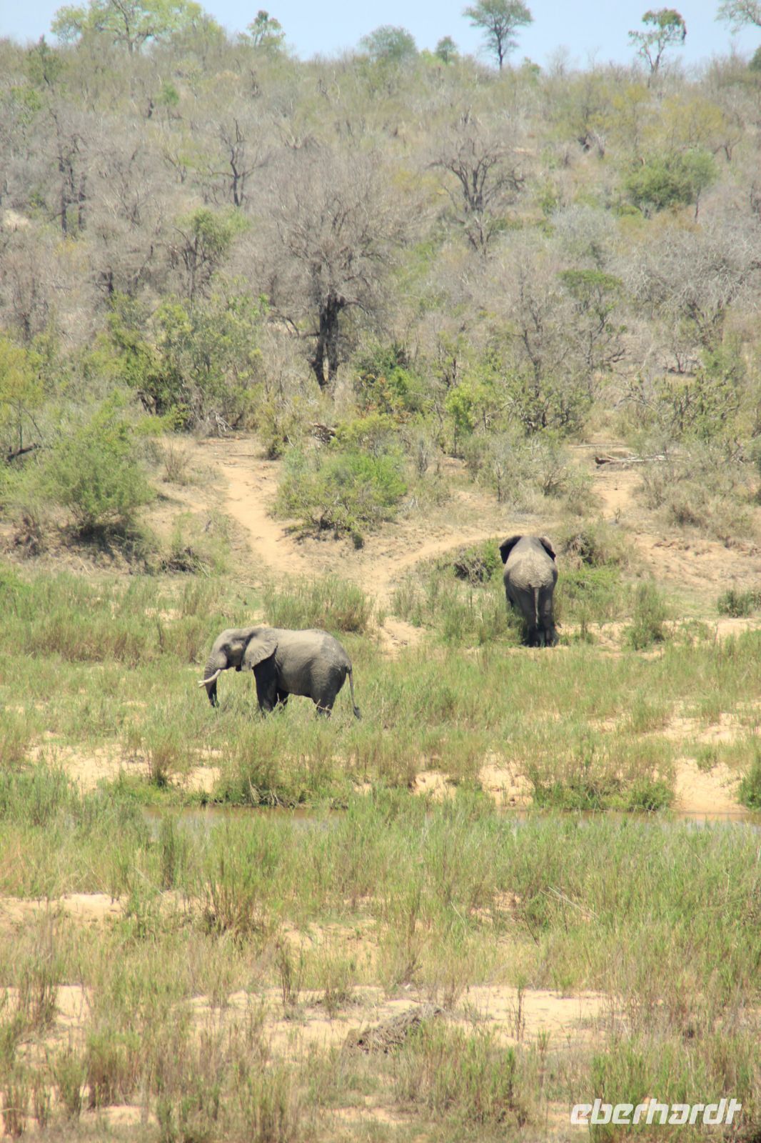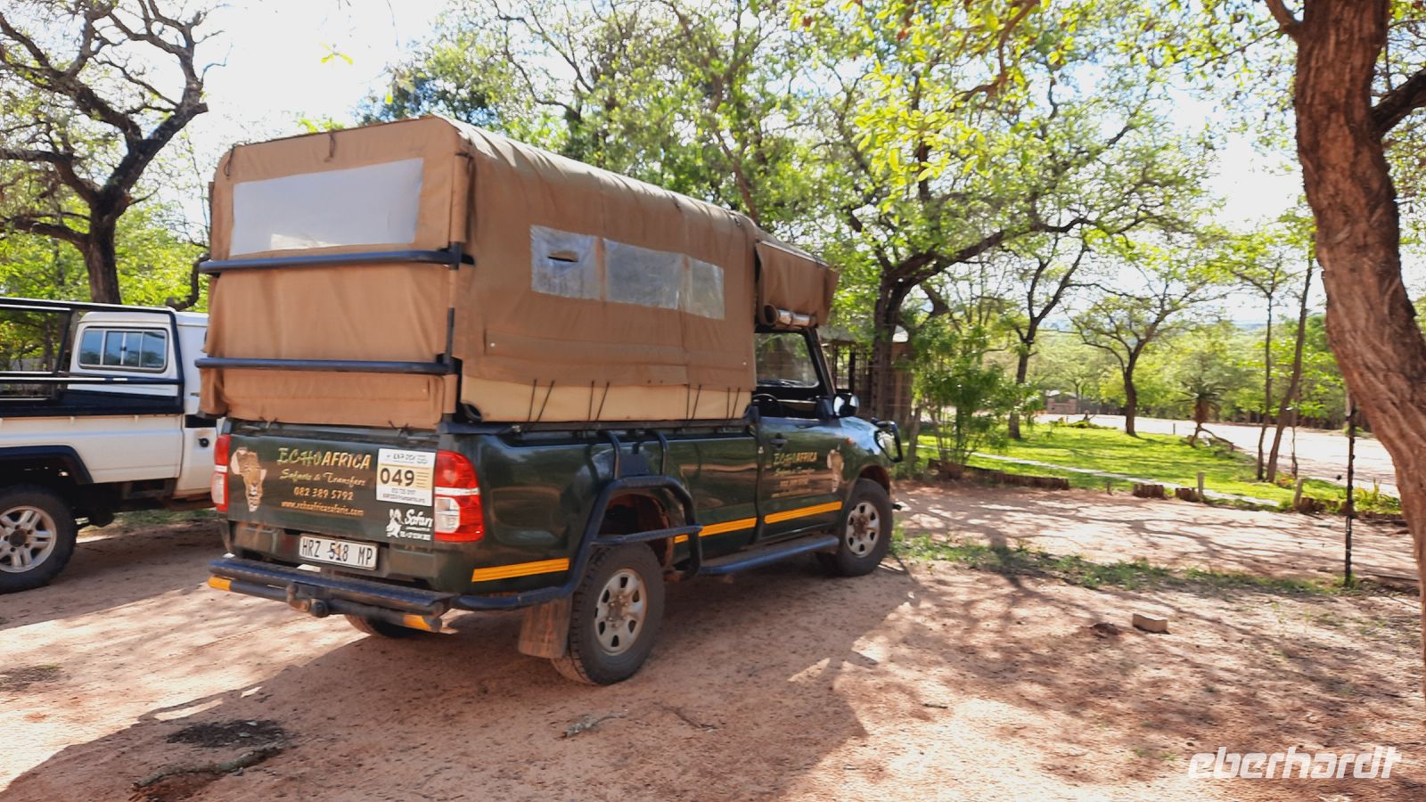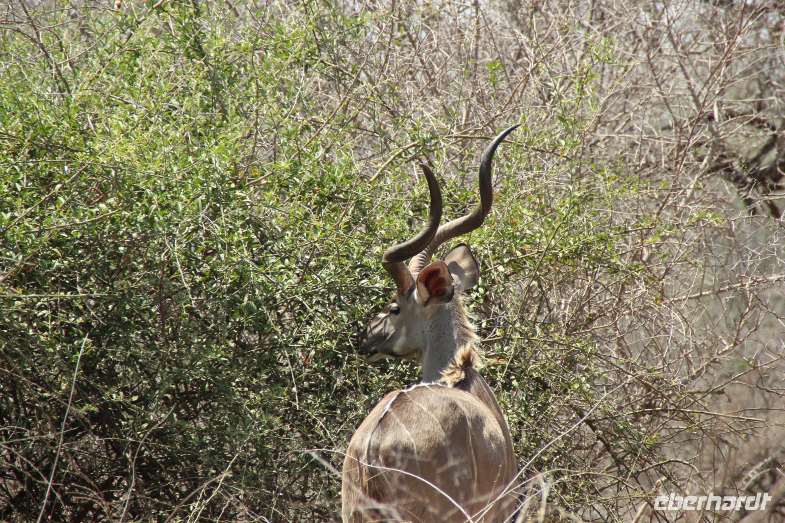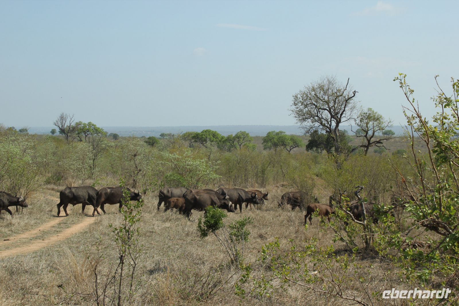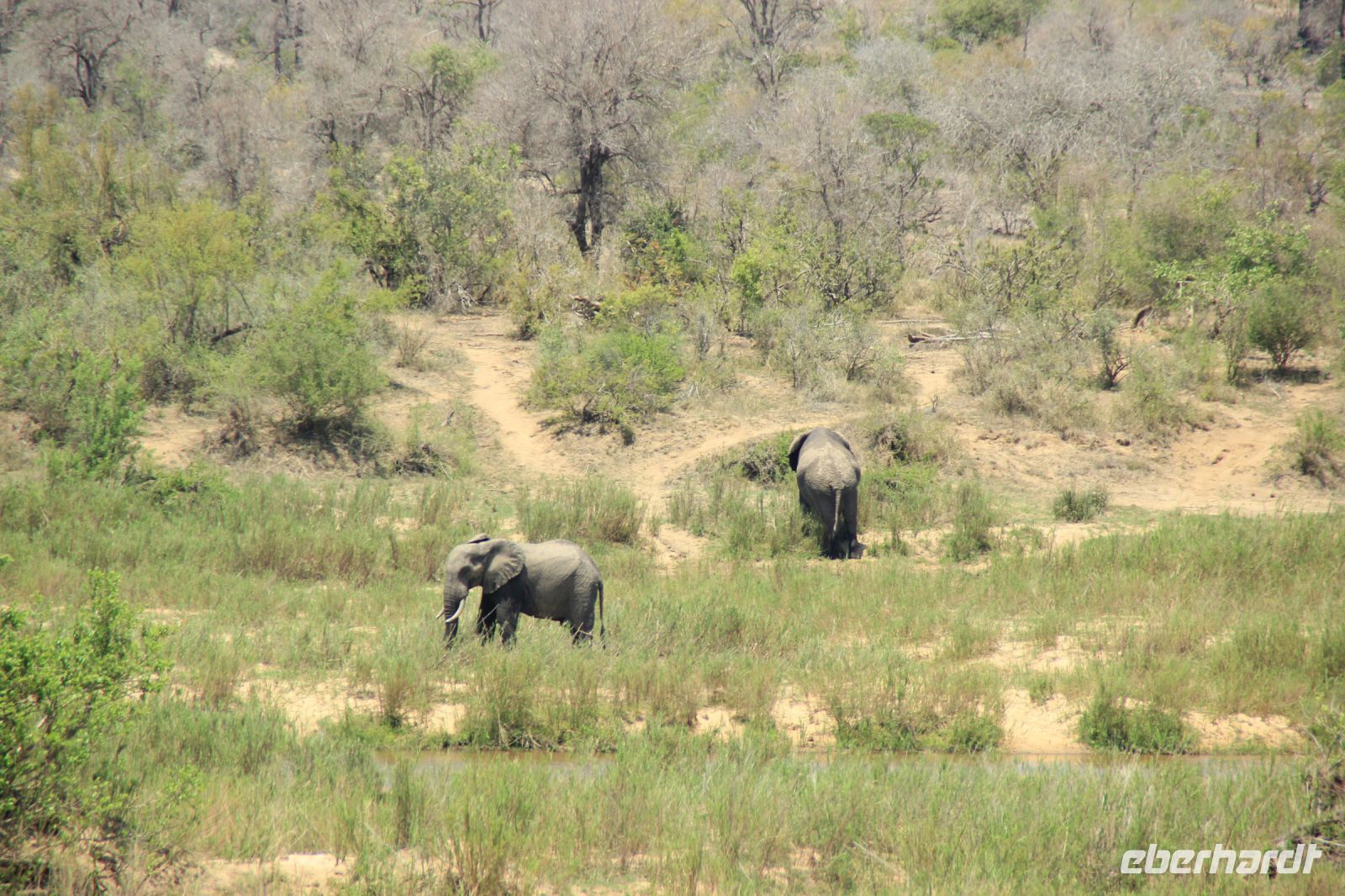 Guten Morgen Krüger-Nationalpark! Mit Sonnenaufgang trafen wir uns zu einem kurzen Frühstück und dann sollte unsere Safari auch schon losgehen. Kurz nachdem wir unsere Lodge verlassen hatten, begegneten wir auch schon zwei der Big Five. Wir sahen einen Büffel und einen frühstückenden Elefanten. Begeistert fuhren wir zum Tor Nnumbi Gate, meldeten unsere kleine illustre Gruppe an und schon machten wir uns auf, die wilden Tiere des Krüger zu entdecken. Schon bald sahen wir Zebras, Impalas, welche sich als Fast Food für die großen Raubtiere herausstellten, und auch ein paar Giraffen. Wir fuhren Wasserlöcher mit Flusspferden an, retteten kleine Schildkröten, kamen einer Büffelherde ganz nah, konnten uns von der Schönheit der Warzenschweine persönlich ein Bild von machen und befanden die majestätischen Kudus für zu schön, um gefressen zu werden. Plötzlich erspähte unser Fahrer etwas in der Ferne. Andere Autos standen bereits vor Ort. Da muss was sein! Und tatsächlich hatte es sich ein Rudel Wildhunde unter einem Baum gemütlich gemacht. Er erzählte uns, dass man sie nur sehr selten zu Gesicht bekommt. Nach einer Erfrischungspause in einem der nahe gelegenen Camps ging unsere Erkundungstour weiter. Nun endlich entdeckten wir auch eine Elefantenherde in der Ferne. Ein weiteres Highlight folgte direkt im Anschluss. Ganz in der Ferne konnte man an einem Wasserloch drei Löwen erkennen. Gut, dass ein Gast ein Fernglas dabei hatte. Während wir weiterfuhren, wären wir doch fast an einem kleinen Rudel junger Löwen vorbeigefahren. Auch diese entspannten sich in der Mittagssonne im Schatten. Die Mähne des Löwen bildet sich erst im frühen Erwachsenenalter vollständig aus, wenn die Löwen vier bis sechs Jahre alt sind. Bis zum Nachmittag sahen wir noch weitere Tiere, wie Dik Diks, Paviane, Gnus, Giraffen und nochmal Elefanten. Somit hatten wir über den Tag verteilt drei der Big Five entdecken können. Nur das Nashorn und den Leopard ließ sich nicht blicken. Da wir noch Zeit bis zum Abendessen hatten, genossen wir ein Bad im Pool. Das Wetter schwang gerade um von sehr heiß und sonnig über den Tag in Gewitter mit kräftigen Regenschauern für den Abend. Schade, hatten wir uns doch auf traditionelles Braai-Abendessen unter freiem Himmel gefreut. Trotzdem glücklich über das Gesehene, verschwanden wir nach dem Abendessen in unseren Bungalows.