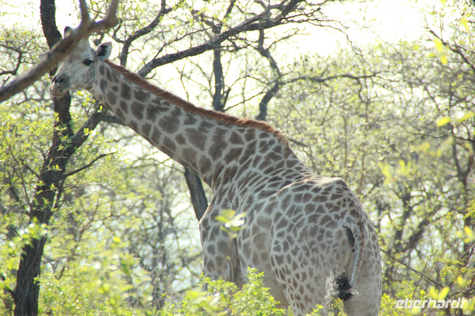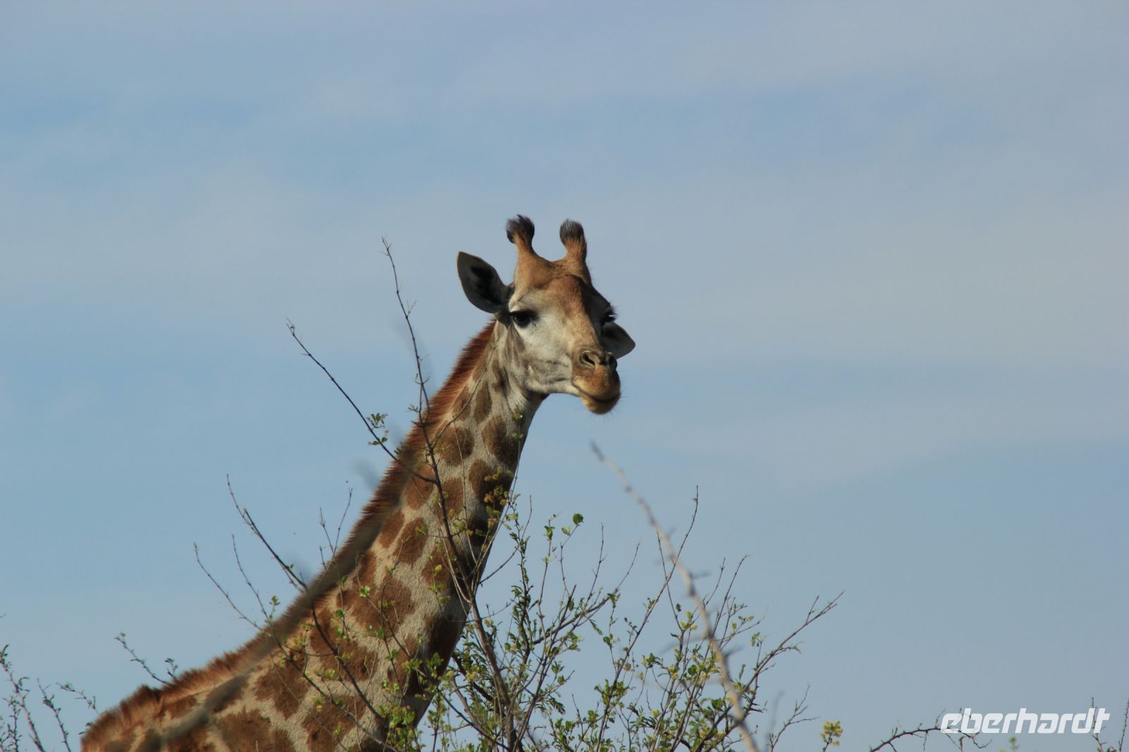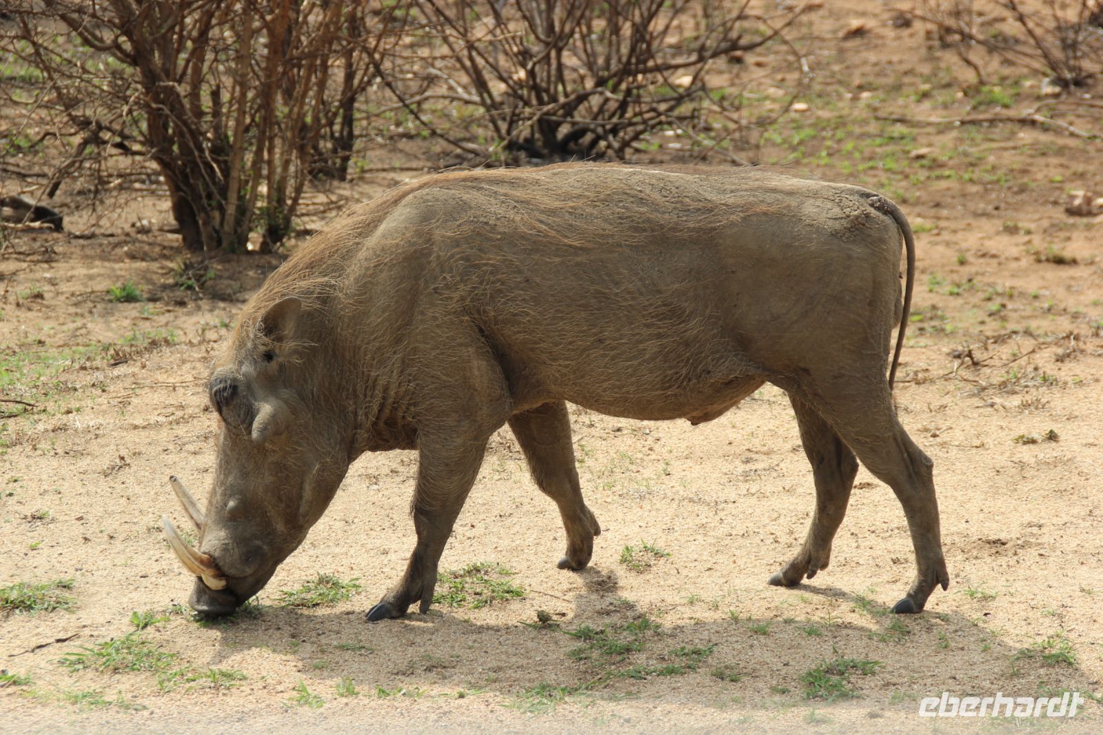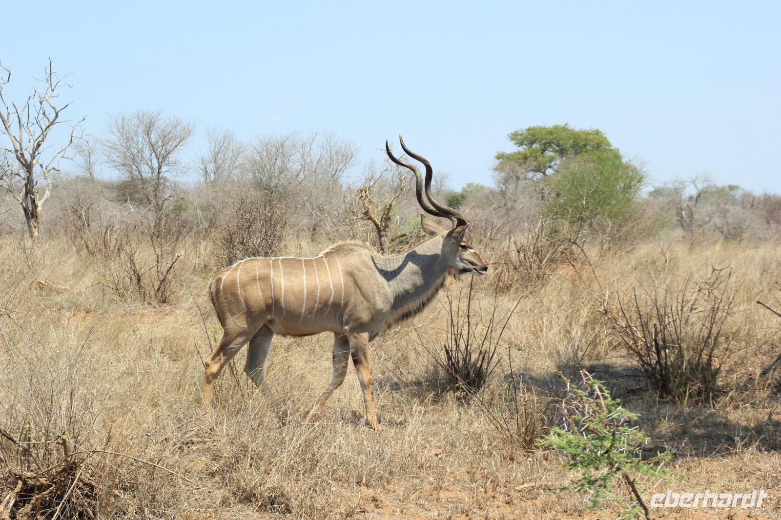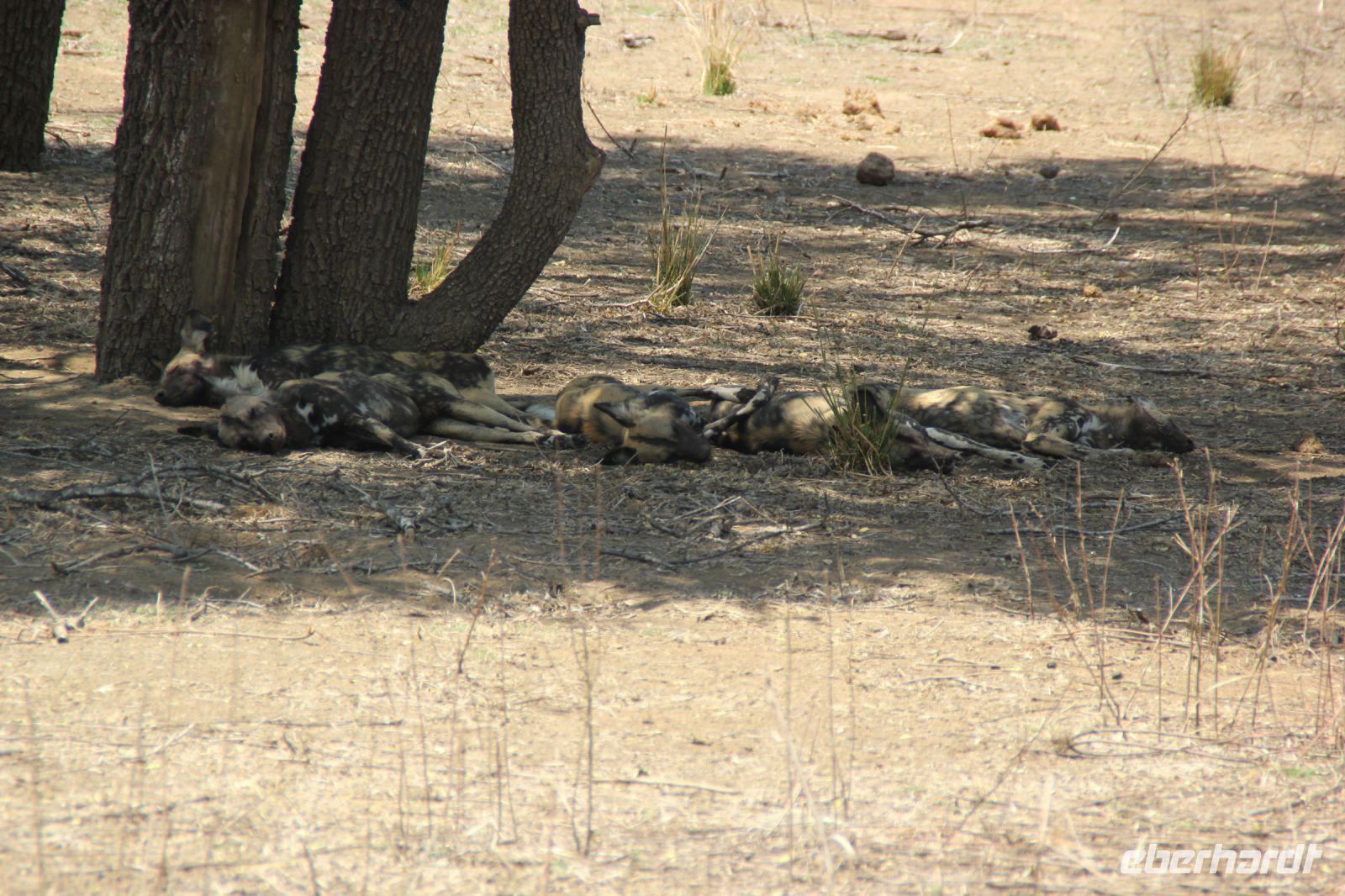 Guten Morgen Krüger-Nationalpark! Mit Sonnenaufgang trafen wir uns zu einem kurzen Frühstück und dann sollte unsere Safari auch schon losgehen. Kurz nachdem wir unsere Lodge verlassen hatten, begegneten wir auch schon zwei der Big Five. Wir sahen einen Büffel und einen frühstückenden Elefanten. Begeistert fuhren wir zum Tor Nnumbi Gate, meldeten unsere kleine illustre Gruppe an und schon machten wir uns auf, die wilden Tiere des Krüger zu entdecken. Schon bald sahen wir Zebras, Impalas, welche sich als Fast Food für die großen Raubtiere herausstellten, und auch ein paar Giraffen. Wir fuhren Wasserlöcher mit Flusspferden an, retteten kleine Schildkröten, kamen einer Büffelherde ganz nah, konnten uns von der Schönheit der Warzenschweine persönlich ein Bild von machen und befanden die majestätischen Kudus für zu schön, um gefressen zu werden. Plötzlich erspähte unser Fahrer etwas in der Ferne. Andere Autos standen bereits vor Ort. Da muss was sein! Und tatsächlich hatte es sich ein Rudel Wildhunde unter einem Baum gemütlich gemacht. Er erzählte uns, dass man sie nur sehr selten zu Gesicht bekommt. Nach einer Erfrischungspause in einem der nahe gelegenen Camps ging unsere Erkundungstour weiter. Nun endlich entdeckten wir auch eine Elefantenherde in der Ferne. Ein weiteres Highlight folgte direkt im Anschluss. Ganz in der Ferne konnte man an einem Wasserloch drei Löwen erkennen. Gut, dass ein Gast ein Fernglas dabei hatte. Während wir weiterfuhren, wären wir doch fast an einem kleinen Rudel junger Löwen vorbeigefahren. Auch diese entspannten sich in der Mittagssonne im Schatten. Die Mähne des Löwen bildet sich erst im frühen Erwachsenenalter vollständig aus, wenn die Löwen vier bis sechs Jahre alt sind. Bis zum Nachmittag sahen wir noch weitere Tiere, wie Dik Diks, Paviane, Gnus, Giraffen und nochmal Elefanten. Somit hatten wir über den Tag verteilt drei der Big Five entdecken können. Nur das Nashorn und den Leopard ließ sich nicht blicken. Da wir noch Zeit bis zum Abendessen hatten, genossen wir ein Bad im Pool. Das Wetter schwang gerade um von sehr heiß und sonnig über den Tag in Gewitter mit kräftigen Regenschauern für den Abend. Schade, hatten wir uns doch auf traditionelles Braai-Abendessen unter freiem Himmel gefreut. Trotzdem glücklich über das Gesehene, verschwanden wir nach dem Abendessen in unseren Bungalows.