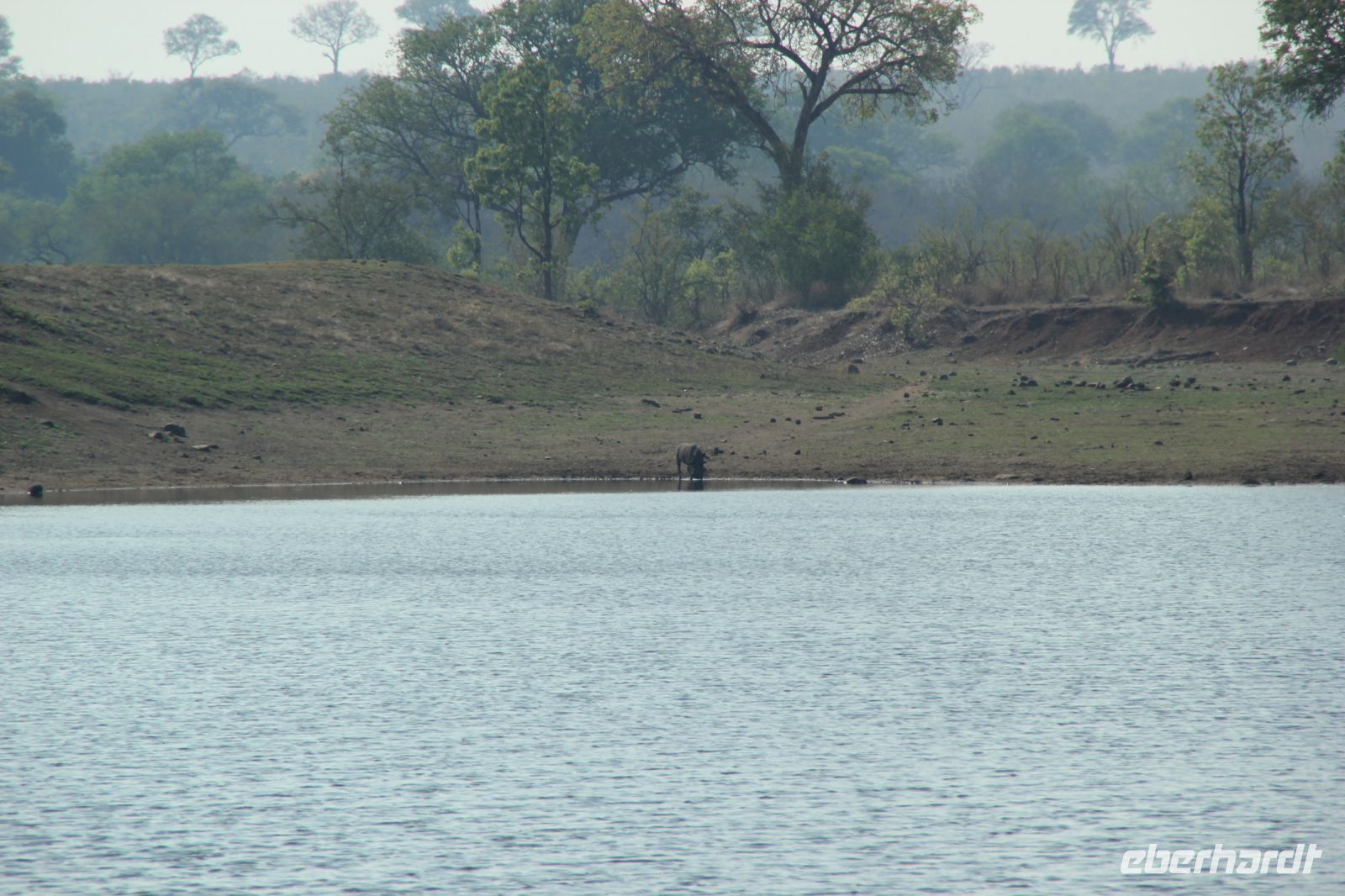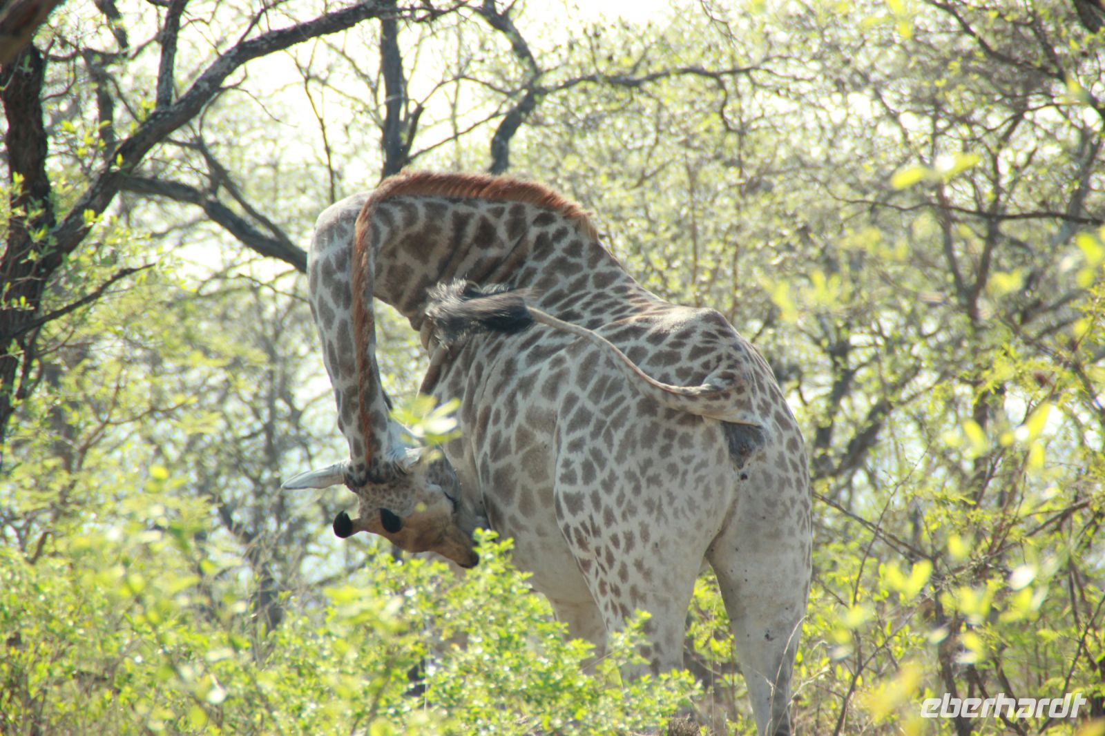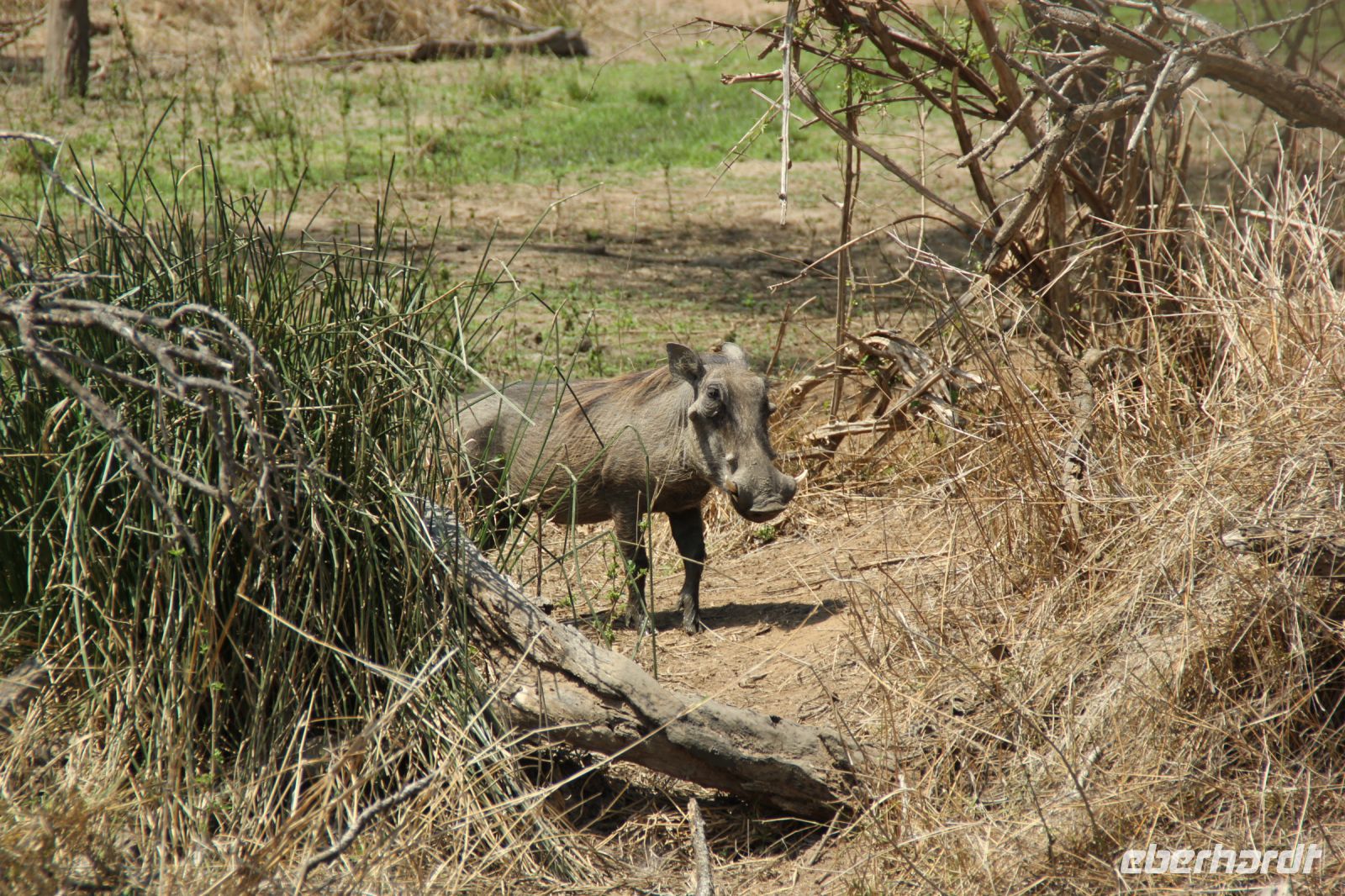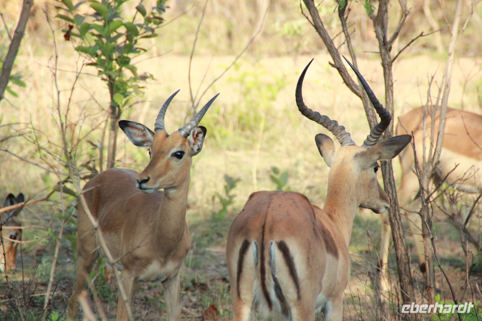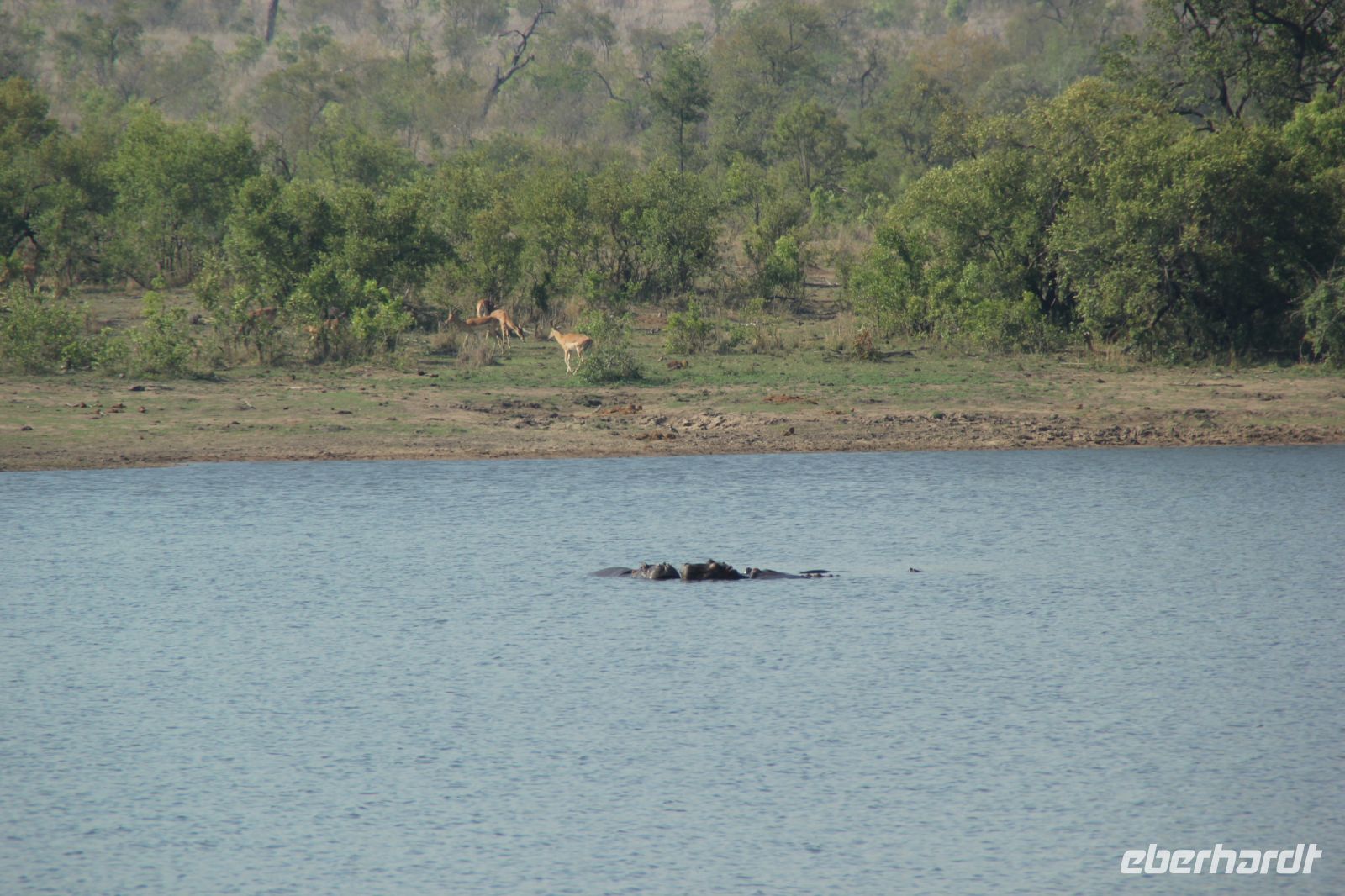 Guten Morgen Krüger-Nationalpark! Mit Sonnenaufgang trafen wir uns zu einem kurzen Frühstück und dann sollte unsere Safari auch schon losgehen. Kurz nachdem wir unsere Lodge verlassen hatten, begegneten wir auch schon zwei der Big Five. Wir sahen einen Büffel und einen frühstückenden Elefanten. Begeistert fuhren wir zum Tor Nnumbi Gate, meldeten unsere kleine illustre Gruppe an und schon machten wir uns auf, die wilden Tiere des Krüger zu entdecken. Schon bald sahen wir Zebras, Impalas, welche sich als Fast Food für die großen Raubtiere herausstellten, und auch ein paar Giraffen. Wir fuhren Wasserlöcher mit Flusspferden an, retteten kleine Schildkröten, kamen einer Büffelherde ganz nah, konnten uns von der Schönheit der Warzenschweine persönlich ein Bild von machen und befanden die majestätischen Kudus für zu schön, um gefressen zu werden. Plötzlich erspähte unser Fahrer etwas in der Ferne. Andere Autos standen bereits vor Ort. Da muss was sein! Und tatsächlich hatte es sich ein Rudel Wildhunde unter einem Baum gemütlich gemacht. Er erzählte uns, dass man sie nur sehr selten zu Gesicht bekommt. Nach einer Erfrischungspause in einem der nahe gelegenen Camps ging unsere Erkundungstour weiter. Nun endlich entdeckten wir auch eine Elefantenherde in der Ferne. Ein weiteres Highlight folgte direkt im Anschluss. Ganz in der Ferne konnte man an einem Wasserloch drei Löwen erkennen. Gut, dass ein Gast ein Fernglas dabei hatte. Während wir weiterfuhren, wären wir doch fast an einem kleinen Rudel junger Löwen vorbeigefahren. Auch diese entspannten sich in der Mittagssonne im Schatten. Die Mähne des Löwen bildet sich erst im frühen Erwachsenenalter vollständig aus, wenn die Löwen vier bis sechs Jahre alt sind. Bis zum Nachmittag sahen wir noch weitere Tiere, wie Dik Diks, Paviane, Gnus, Giraffen und nochmal Elefanten. Somit hatten wir über den Tag verteilt drei der Big Five entdecken können. Nur das Nashorn und den Leopard ließ sich nicht blicken. Da wir noch Zeit bis zum Abendessen hatten, genossen wir ein Bad im Pool. Das Wetter schwang gerade um von sehr heiß und sonnig über den Tag in Gewitter mit kräftigen Regenschauern für den Abend. Schade, hatten wir uns doch auf traditionelles Braai-Abendessen unter freiem Himmel gefreut. Trotzdem glücklich über das Gesehene, verschwanden wir nach dem Abendessen in unseren Bungalows.