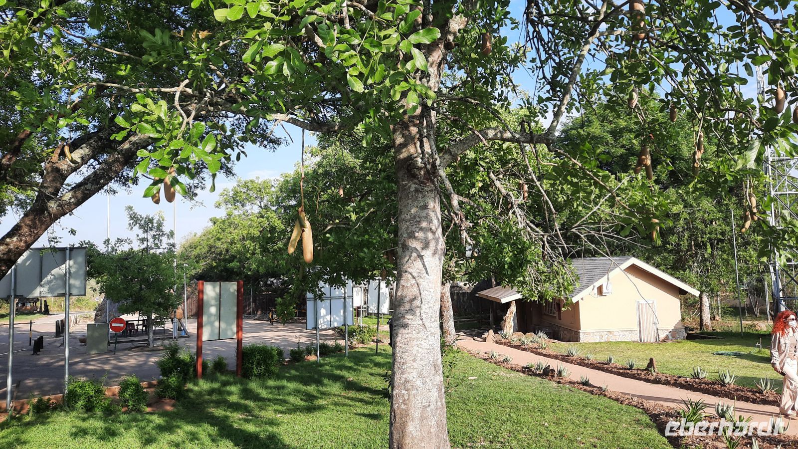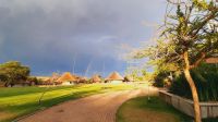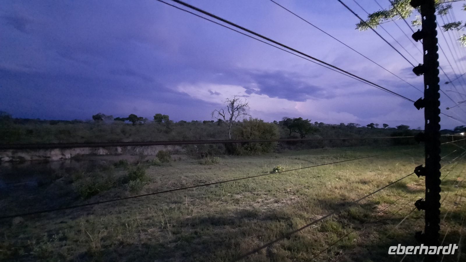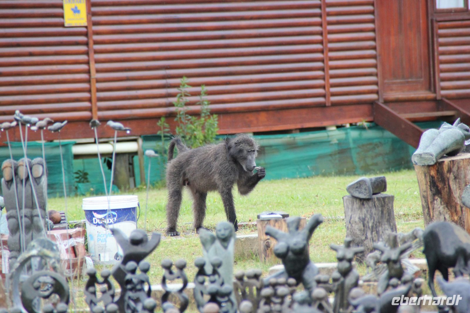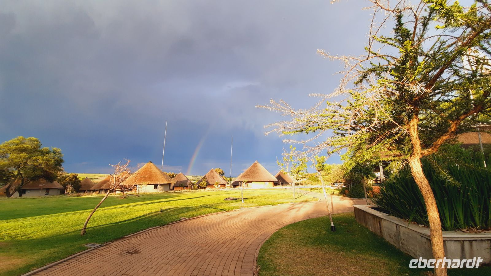 Wir saßen beim Frühstück und staunten nicht schlecht, als wir zwei Elefanten in den Bäumen ganz nah unserer Lodge entdecken konnten. Wir schnappten uns die Kameras und eilten zum Zaun. Da waren sie! Zwei große Dickhäuter gemütlich beim Frühstück. Sie schienen uns Good Bye zu sagen. ?? Wir verabschiedeten uns vom Krüger-Nationalpark und fuhren wieder über Hazyview auf die Panoramaroute. Wir statteten dem God´s Window einen Besuch ab und waren von der Weitsicht bis zum Rand des Krüger begeistert. Gottes Fenster) liegt an der Abrißkante des Escarpment und beeindruckt jeden Besucher durch einen weiten und beeindruckenden Blick auf das tiefer liegende Lowveld in der Umgebung vom Krugerpark. Die Klippen am bekannten Aussichtspunkt am Rande der Drakensberge stürzen über 700 Meter ins Tal hinab. Unser nächster kurzer Stopp war am Lissabon-Wasserfall. Unsere Tour führte uns heute durch Sabi und Frans erzählte über die Goldsuche des vergangenen Jahrhunderts. Während wir über den Longthom-Pass fahren, kreuzte uns eine Pavian-Familie. Wir stoppten. Die kleine Familie scheint geräuschvoll empört darüber zu sein, dass wir anhalten und sie fotografieren wollten. Gut, dann nicht. Bei einer Mittagspause an der bekannten Raststätte Millys Trout konnten wir uns die Beine vertreten und schon ging die Fahrt weiter. Wir erreichten wieder der Region um Pretoria und kamen am frühen Abend in der Lodge bei Johannesburg an. Leider war auch hier der Wettergott über etwas verärgert, aber der dramatische Himmel mit Regenbogen ließ auch hier das Fotografenherz höherschlagen. Die Lodge hatte die Besonderheit, dass hier Tiere frei herumlaufen konnten. Und so gingen wir gleich auf Fotopirsch, um noch ein paar Zebras vor die Kamera zu bekommen. Am Abend genossen wir ein tolles Abendessen und verabschiedeten uns mit einem Springbokkie von unserem Reiseleiter Frans.
