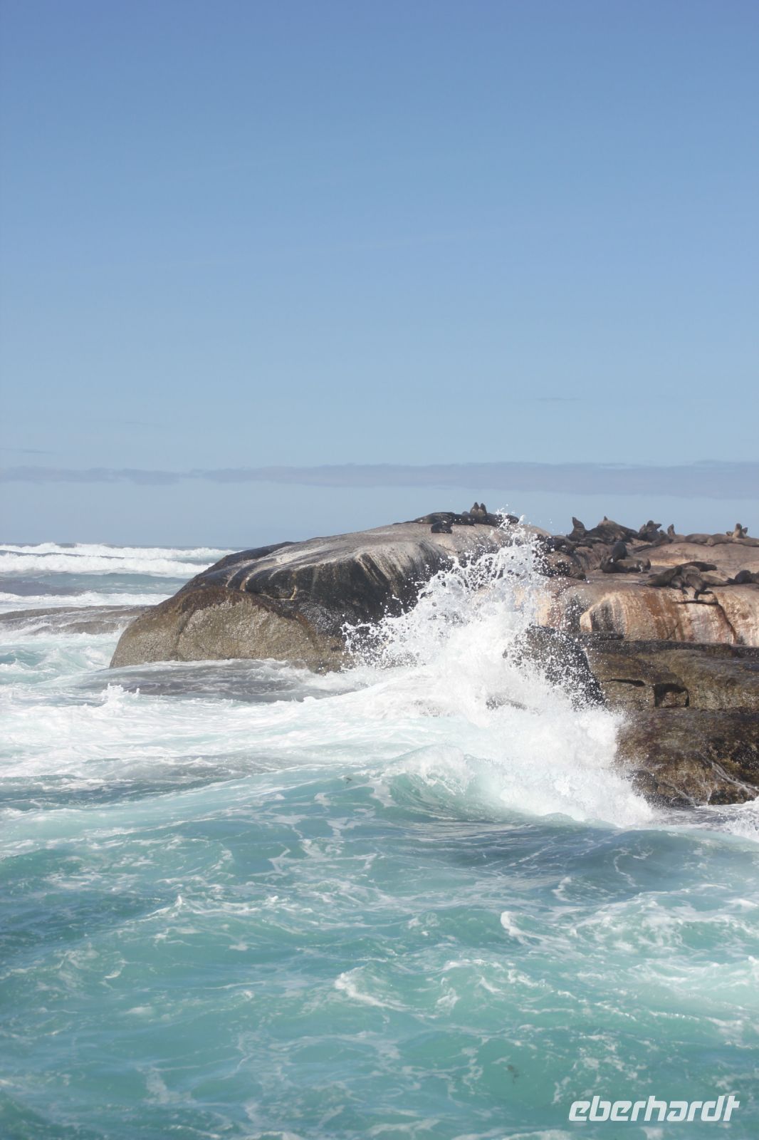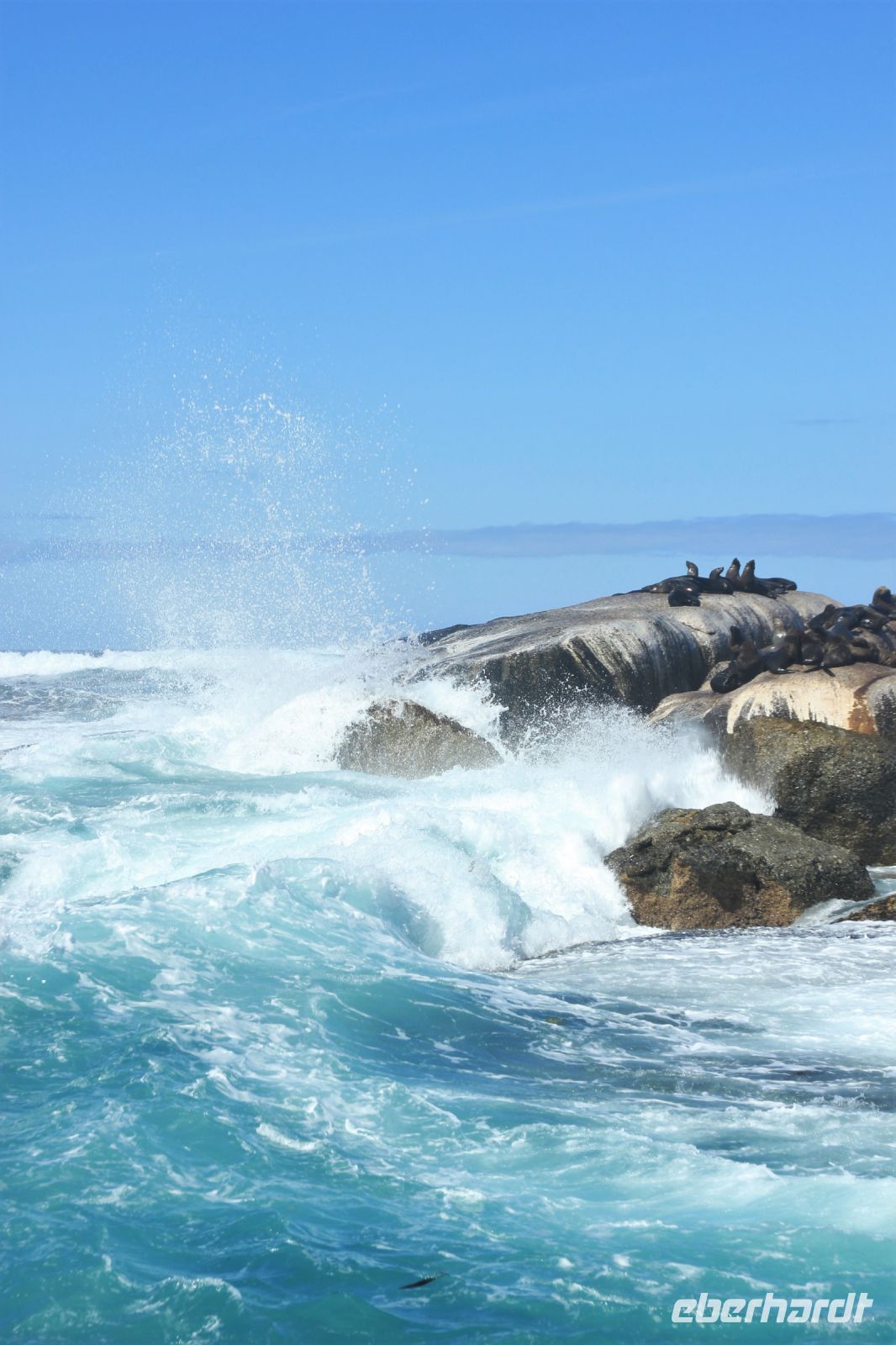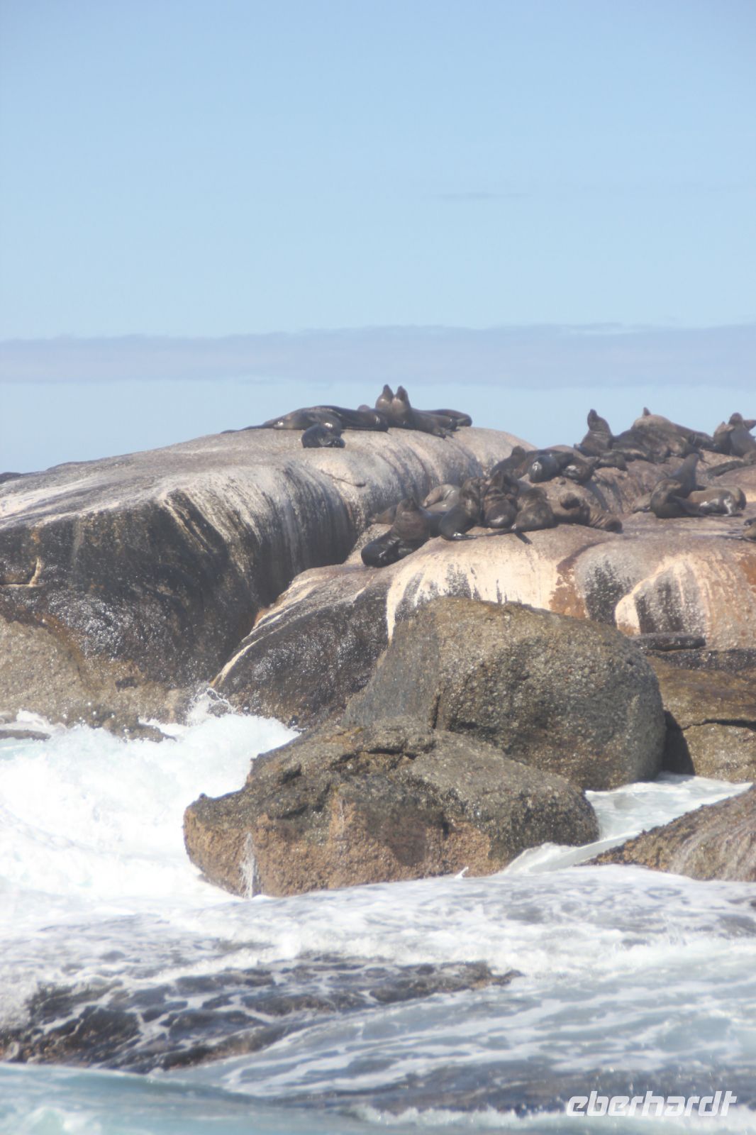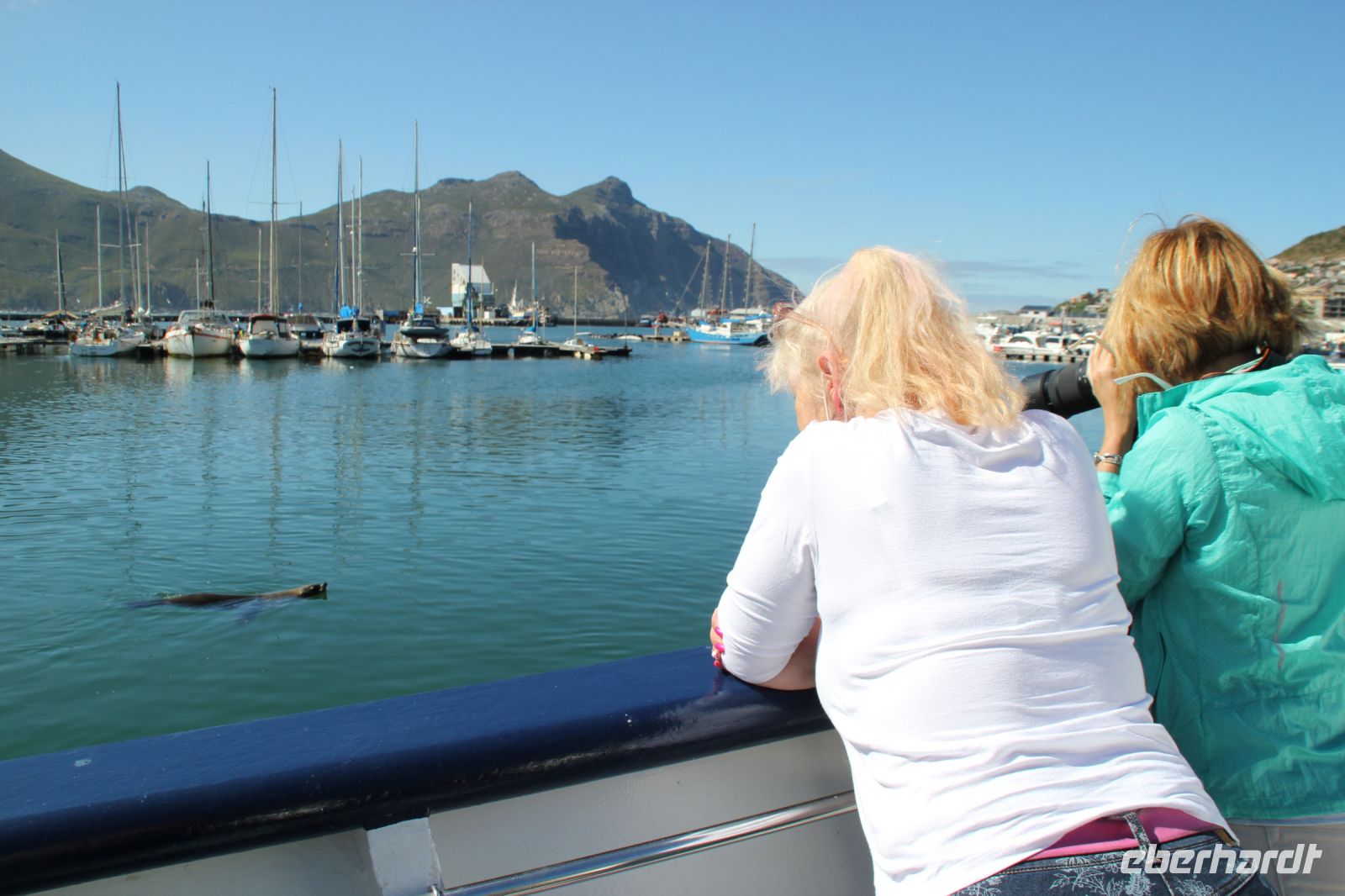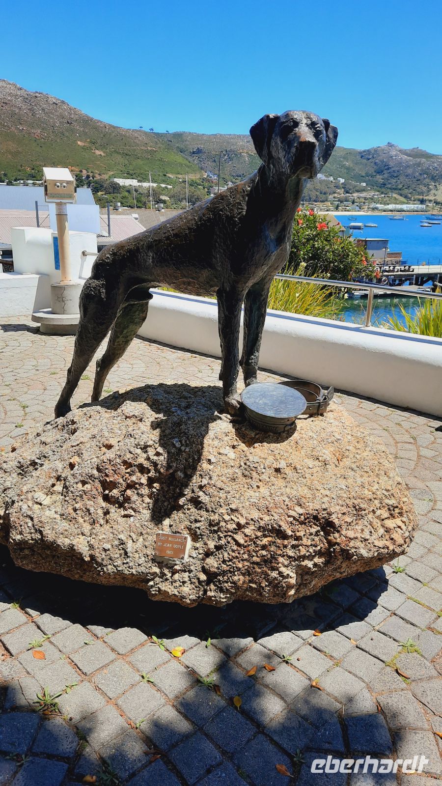 Nach einem guten Frühstück starteten wir vergnügt in den Tag. Das Wetter war perfekt, die Sonne schien und der Himmel war blau. Über Green Point mit seinem kaum genutzten WM-Stadium bis zum gehobenen Stadtteil Clifton fuhren wir immer an der Küste Kapstadts entlang. Im Vorort Camps Bay hielten wir für einen Fotostopp und bewunderten abermals die weißen Sandstrände und natürlichen Felsenpools. Der Ausblick auf die Bergkette „Zwölf Apostel“ war beeindruckend. In Hout Bay angekommen, stiegen wir im Hafen auf ein Boot und schipperten auf das Meer. Wir genossen den im Bauch kribbelnden Wellengang und steuerten dabei auf die Seal-Island zu, welche tausende Robben beherbergte. Gespannt sahen wir auf das quirlige Treiben im Wasser und auf den Felsen. Egal, wo man hinschaute, eine Flosse, eine Nase oder schwarze Kulleraugen konnte man immer entdecken. Wieder zurück im Hafen bummelten wir entlang der bunten Stände und fuhren anschließend Richtung Kap-Nationalpark. Da der Chapmans Peak geschlossen war, nahmen wir einen kurzen Umweg und sahen bereits jetzt schon die bunten Holzhäuser von Muizenberg. Diese werden als Umkleidekabinen genutzt und „Edwardian Beach Houses“ genannt. Auch eine kleine Pavianfamilie kreuzte unseren Weg. Während eines kleinen Stopps in Simons Town konnten wir die Beine vertreten und der Statue von der Dogge Just Nuisance einen Besuch abstatten. Die Dogge wurde in den 40er Jahren bei der Royal Navy als Vollmatrose geführt und war er der einzige Hund, der jemals eine solche Position einnahm. Er spendete während des Zweiten Weltkrieges mit seiner zutraulichen Art vielen Soldaten Trost, trennte sich streitende Seeleute aber fuhr niemals selbst zur See. 1985 wurde dann ihm zu Ehren dieses Denkmal am Jubilee Square aufgestellt.