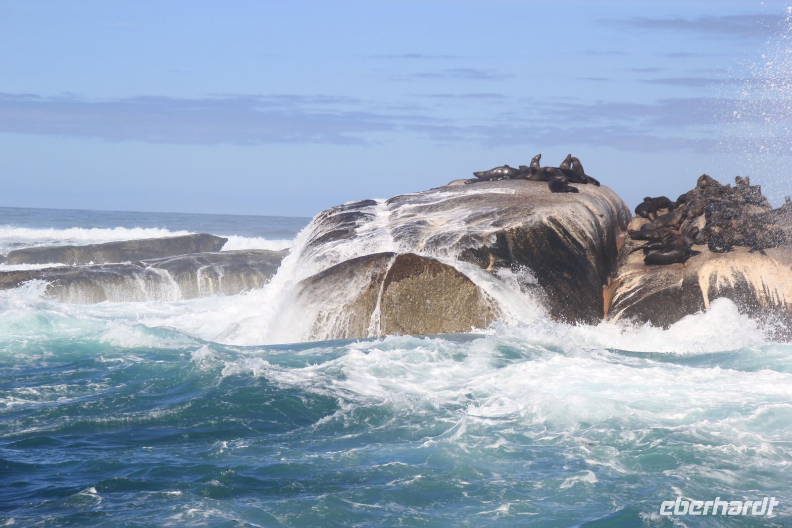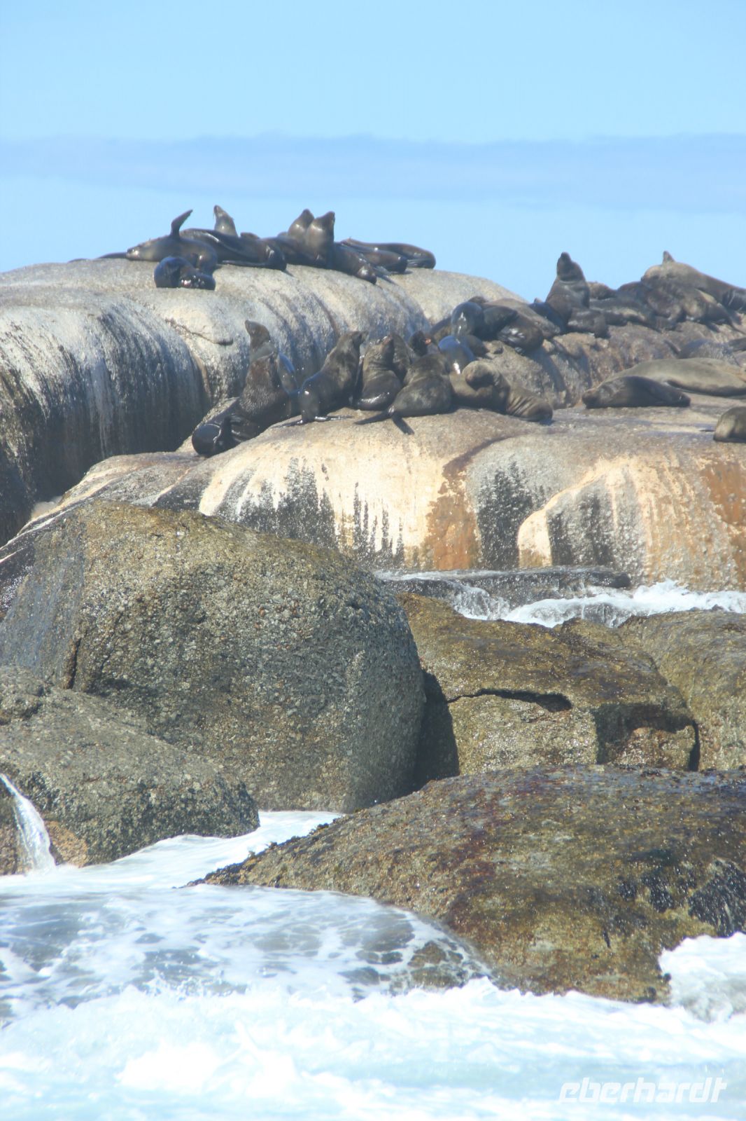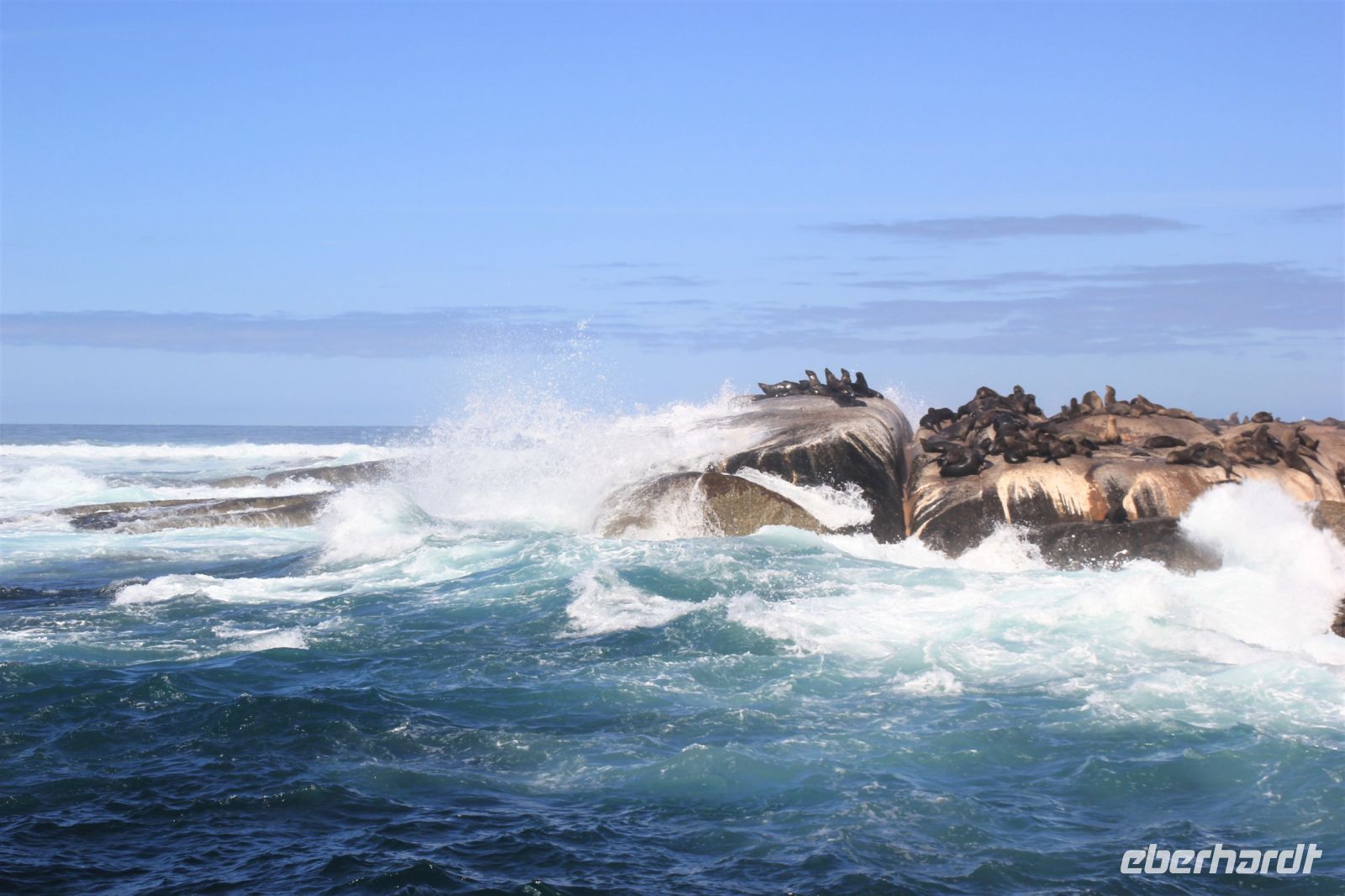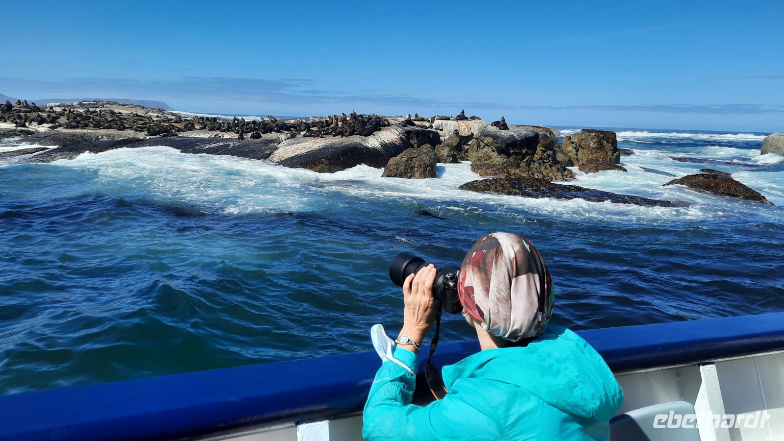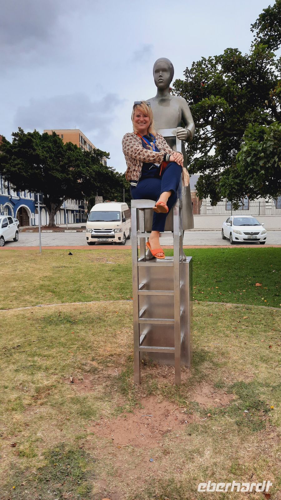 Nach einem guten Frühstück starteten wir vergnügt in den Tag. Das Wetter war perfekt, die Sonne schien und der Himmel war blau. Über Green Point mit seinem kaum genutzten WM-Stadium bis zum gehobenen Stadtteil Clifton fuhren wir immer an der Küste Kapstadts entlang. Im Vorort Camps Bay hielten wir für einen Fotostopp und bewunderten abermals die weißen Sandstrände und natürlichen Felsenpools. Der Ausblick auf die Bergkette „Zwölf Apostel“ war beeindruckend. In Hout Bay angekommen, stiegen wir im Hafen auf ein Boot und schipperten auf das Meer. Wir genossen den im Bauch kribbelnden Wellengang und steuerten dabei auf die Seal-Island zu, welche tausende Robben beherbergte. Gespannt sahen wir auf das quirlige Treiben im Wasser und auf den Felsen. Egal, wo man hinschaute, eine Flosse, eine Nase oder schwarze Kulleraugen konnte man immer entdecken. Wieder zurück im Hafen bummelten wir entlang der bunten Stände und fuhren anschließend Richtung Kap-Nationalpark. Da der Chapmans Peak geschlossen war, nahmen wir einen kurzen Umweg und sahen bereits jetzt schon die bunten Holzhäuser von Muizenberg. Diese werden als Umkleidekabinen genutzt und „Edwardian Beach Houses“ genannt. Auch eine kleine Pavianfamilie kreuzte unseren Weg. Während eines kleinen Stopps in Simons Town konnten wir die Beine vertreten und der Statue von der Dogge Just Nuisance einen Besuch abstatten. Die Dogge wurde in den 40er Jahren bei der Royal Navy als Vollmatrose geführt und war er der einzige Hund, der jemals eine solche Position einnahm. Er spendete während des Zweiten Weltkrieges mit seiner zutraulichen Art vielen Soldaten Trost, trennte sich streitende Seeleute aber fuhr niemals selbst zur See. 1985 wurde dann ihm zu Ehren dieses Denkmal am Jubilee Square aufgestellt.