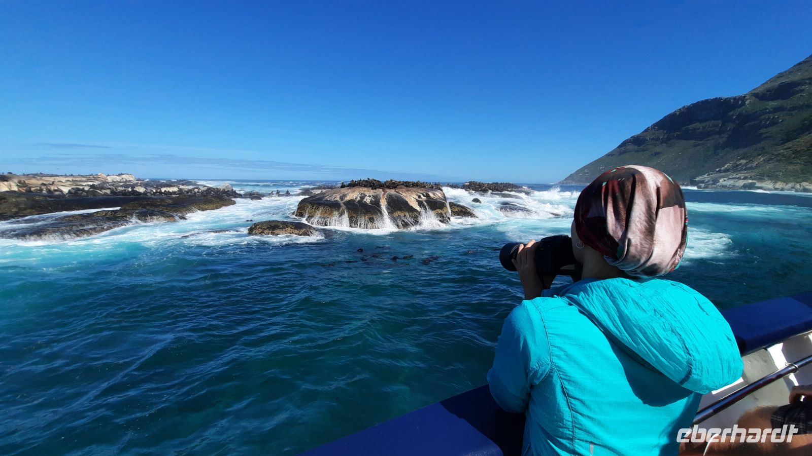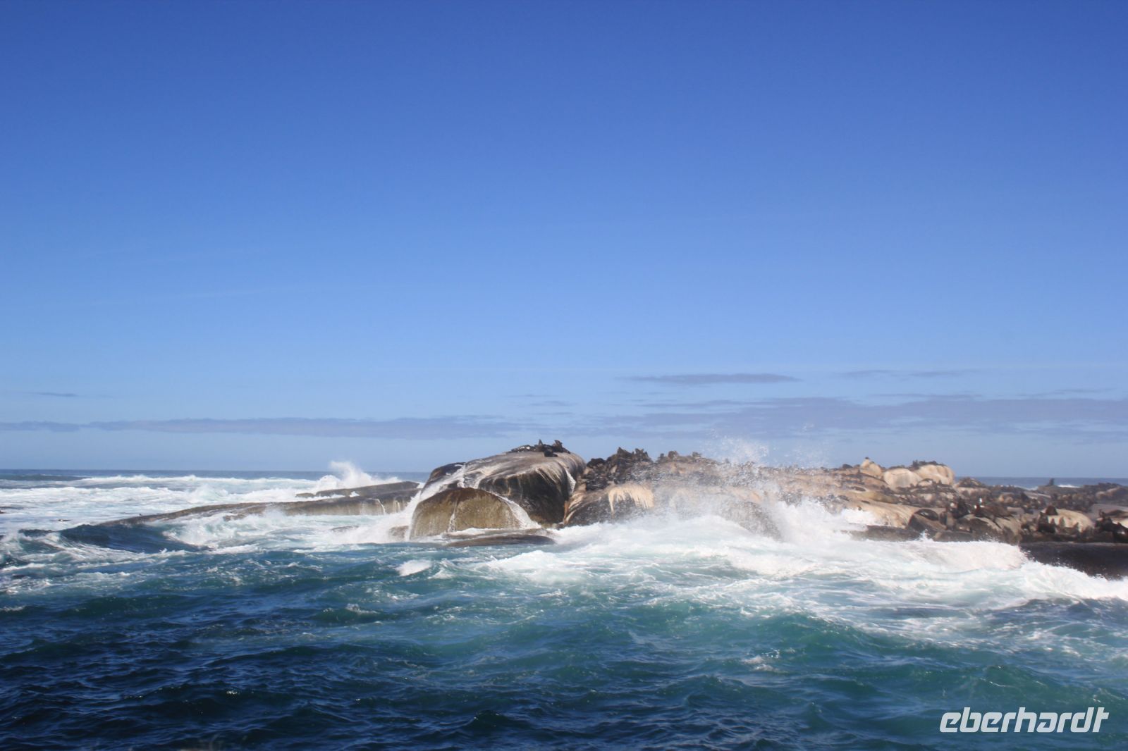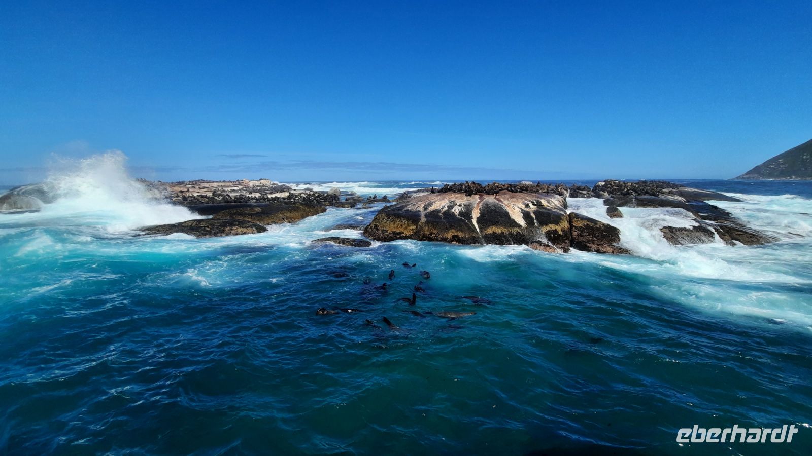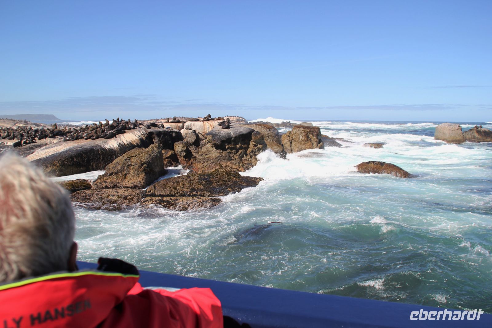 Nach einem guten Frühstück starteten wir vergnügt in den Tag. Das Wetter war perfekt, die Sonne schien und der Himmel war blau. Über Green Point mit seinem kaum genutzten WM-Stadium bis zum gehobenen Stadtteil Clifton fuhren wir immer an der Küste Kapstadts entlang. Im Vorort Camps Bay hielten wir für einen Fotostopp und bewunderten abermals die weißen Sandstrände und natürlichen Felsenpools. Der Ausblick auf die Bergkette „Zwölf Apostel“ war beeindruckend. In Hout Bay angekommen, stiegen wir im Hafen auf ein Boot und schipperten auf das Meer. Wir genossen den im Bauch kribbelnden Wellengang und steuerten dabei auf die Seal-Island zu, welche tausende Robben beherbergte. Gespannt sahen wir auf das quirlige Treiben im Wasser und auf den Felsen. Egal, wo man hinschaute, eine Flosse, eine Nase oder schwarze Kulleraugen konnte man immer entdecken. Wieder zurück im Hafen bummelten wir entlang der bunten Stände und fuhren anschließend Richtung Kap-Nationalpark. Da der Chapmans Peak geschlossen war, nahmen wir einen kurzen Umweg und sahen bereits jetzt schon die bunten Holzhäuser von Muizenberg. Diese werden als Umkleidekabinen genutzt und „Edwardian Beach Houses“ genannt. Auch eine kleine Pavianfamilie kreuzte unseren Weg. Während eines kleinen Stopps in Simons Town konnten wir die Beine vertreten und der Statue von der Dogge Just Nuisance einen Besuch abstatten. Die Dogge wurde in den 40er Jahren bei der Royal Navy als Vollmatrose geführt und war er der einzige Hund, der jemals eine solche Position einnahm. Er spendete während des Zweiten Weltkrieges mit seiner zutraulichen Art vielen Soldaten Trost, trennte sich streitende Seeleute aber fuhr niemals selbst zur See. 1985 wurde dann ihm zu Ehren dieses Denkmal am Jubilee Square aufgestellt.