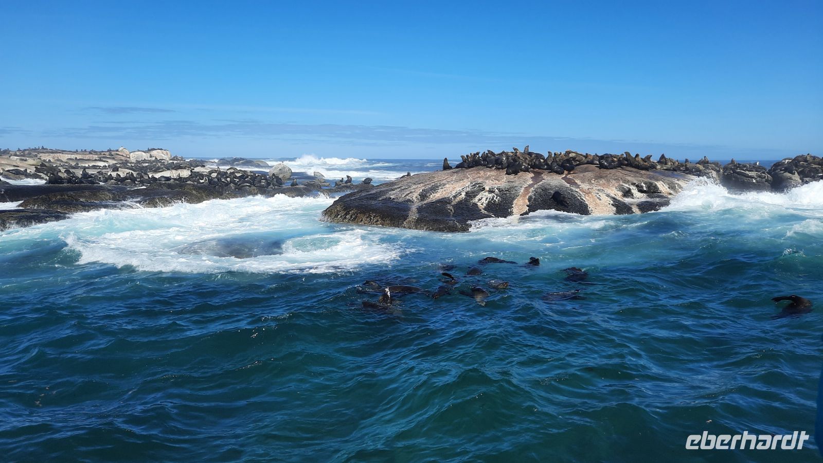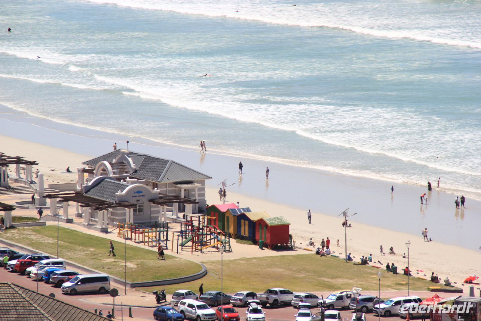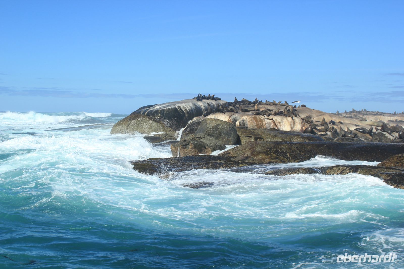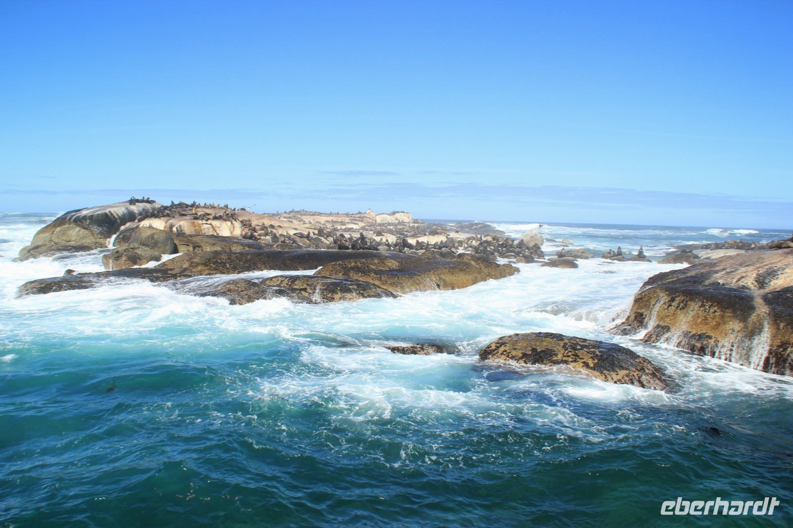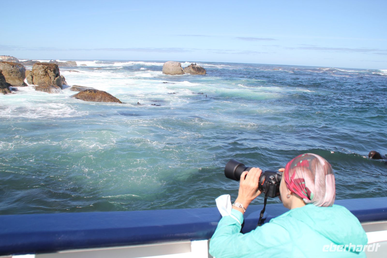 Nach einem guten Frühstück starteten wir vergnügt in den Tag. Das Wetter war perfekt, die Sonne schien und der Himmel war blau. Über Green Point mit seinem kaum genutzten WM-Stadium bis zum gehobenen Stadtteil Clifton fuhren wir immer an der Küste Kapstadts entlang. Im Vorort Camps Bay hielten wir für einen Fotostopp und bewunderten abermals die weißen Sandstrände und natürlichen Felsenpools. Der Ausblick auf die Bergkette „Zwölf Apostel“ war beeindruckend. In Hout Bay angekommen, stiegen wir im Hafen auf ein Boot und schipperten auf das Meer. Wir genossen den im Bauch kribbelnden Wellengang und steuerten dabei auf die Seal-Island zu, welche tausende Robben beherbergte. Gespannt sahen wir auf das quirlige Treiben im Wasser und auf den Felsen. Egal, wo man hinschaute, eine Flosse, eine Nase oder schwarze Kulleraugen konnte man immer entdecken. Wieder zurück im Hafen bummelten wir entlang der bunten Stände und fuhren anschließend Richtung Kap-Nationalpark. Da der Chapmans Peak geschlossen war, nahmen wir einen kurzen Umweg und sahen bereits jetzt schon die bunten Holzhäuser von Muizenberg. Diese werden als Umkleidekabinen genutzt und „Edwardian Beach Houses“ genannt. Auch eine kleine Pavianfamilie kreuzte unseren Weg. Während eines kleinen Stopps in Simons Town konnten wir die Beine vertreten und der Statue von der Dogge Just Nuisance einen Besuch abstatten. Die Dogge wurde in den 40er Jahren bei der Royal Navy als Vollmatrose geführt und war er der einzige Hund, der jemals eine solche Position einnahm. Er spendete während des Zweiten Weltkrieges mit seiner zutraulichen Art vielen Soldaten Trost, trennte sich streitende Seeleute aber fuhr niemals selbst zur See. 1985 wurde dann ihm zu Ehren dieses Denkmal am Jubilee Square aufgestellt.
