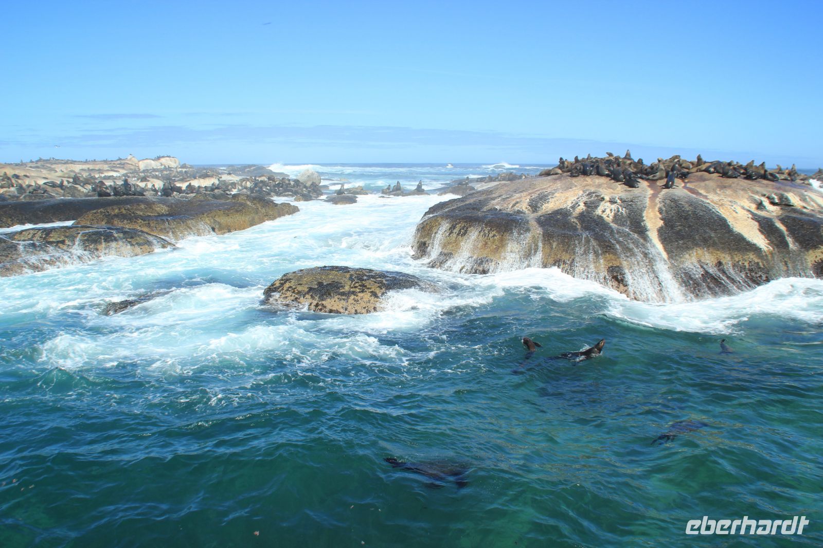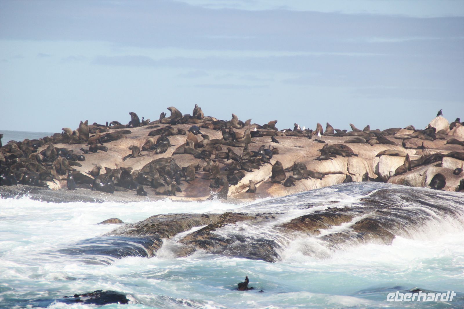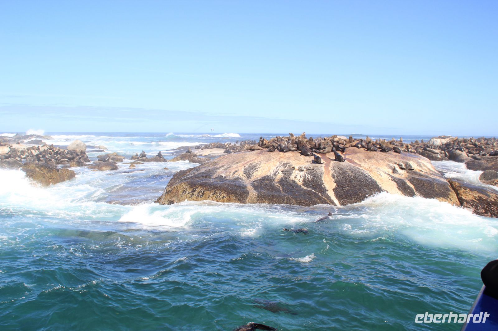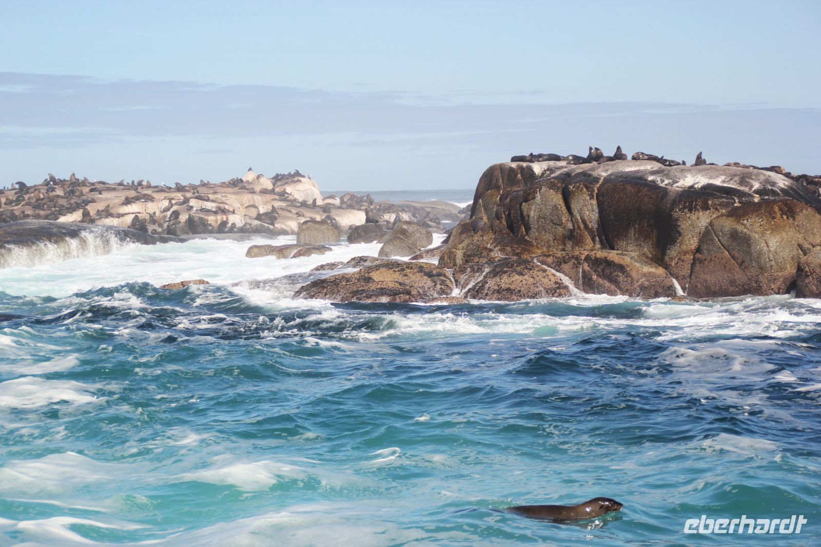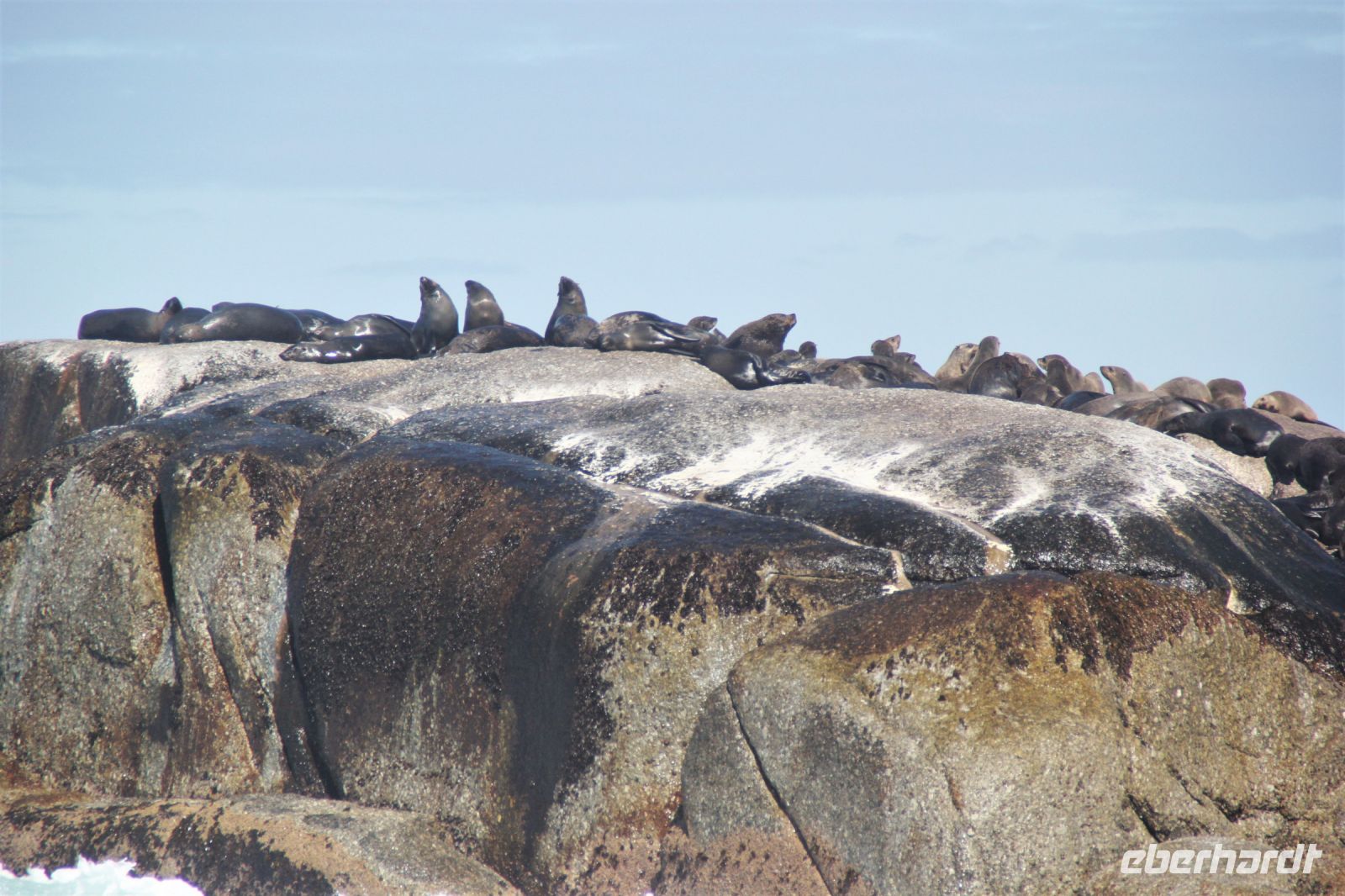 Nach einem guten Frühstück starteten wir vergnügt in den Tag. Das Wetter war perfekt, die Sonne schien und der Himmel war blau. Über Green Point mit seinem kaum genutzten WM-Stadium bis zum gehobenen Stadtteil Clifton fuhren wir immer an der Küste Kapstadts entlang. Im Vorort Camps Bay hielten wir für einen Fotostopp und bewunderten abermals die weißen Sandstrände und natürlichen Felsenpools. Der Ausblick auf die Bergkette „Zwölf Apostel“ war beeindruckend. In Hout Bay angekommen, stiegen wir im Hafen auf ein Boot und schipperten auf das Meer. Wir genossen den im Bauch kribbelnden Wellengang und steuerten dabei auf die Seal-Island zu, welche tausende Robben beherbergte. Gespannt sahen wir auf das quirlige Treiben im Wasser und auf den Felsen. Egal, wo man hinschaute, eine Flosse, eine Nase oder schwarze Kulleraugen konnte man immer entdecken. Wieder zurück im Hafen bummelten wir entlang der bunten Stände und fuhren anschließend Richtung Kap-Nationalpark. Da der Chapmans Peak geschlossen war, nahmen wir einen kurzen Umweg und sahen bereits jetzt schon die bunten Holzhäuser von Muizenberg. Diese werden als Umkleidekabinen genutzt und „Edwardian Beach Houses“ genannt. Auch eine kleine Pavianfamilie kreuzte unseren Weg. Während eines kleinen Stopps in Simons Town konnten wir die Beine vertreten und der Statue von der Dogge Just Nuisance einen Besuch abstatten. Die Dogge wurde in den 40er Jahren bei der Royal Navy als Vollmatrose geführt und war er der einzige Hund, der jemals eine solche Position einnahm. Er spendete während des Zweiten Weltkrieges mit seiner zutraulichen Art vielen Soldaten Trost, trennte sich streitende Seeleute aber fuhr niemals selbst zur See. 1985 wurde dann ihm zu Ehren dieses Denkmal am Jubilee Square aufgestellt.