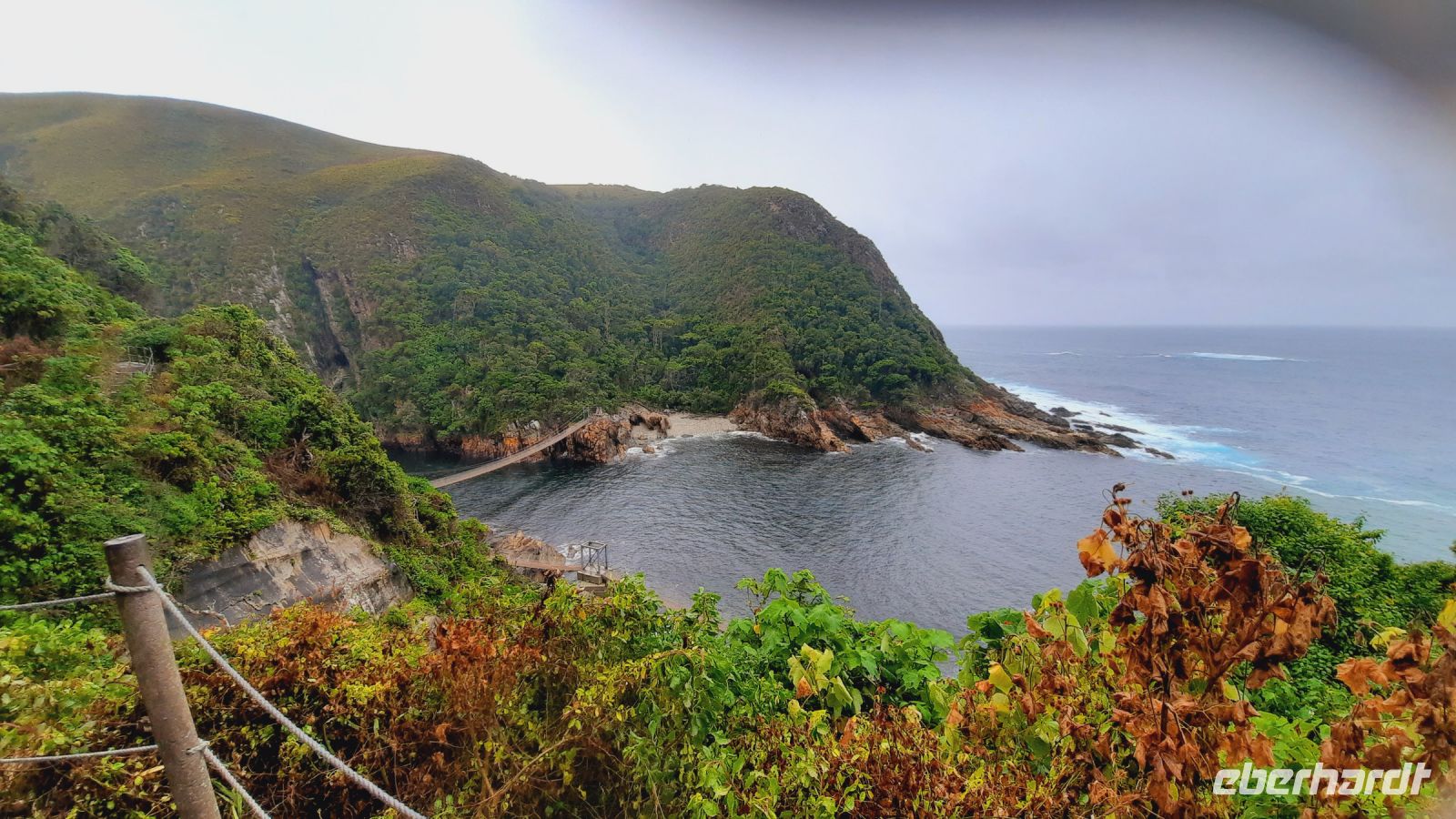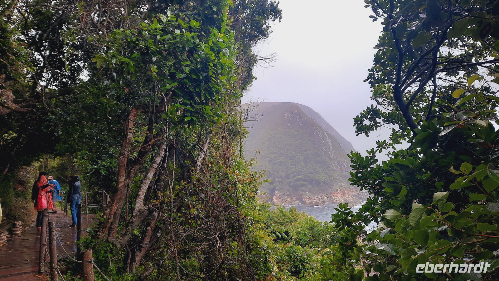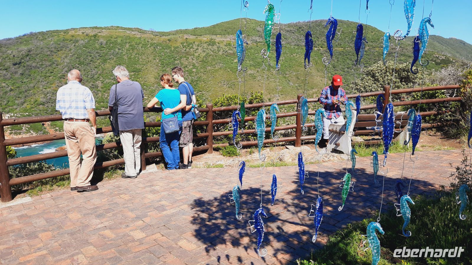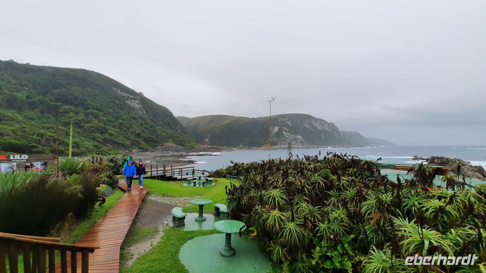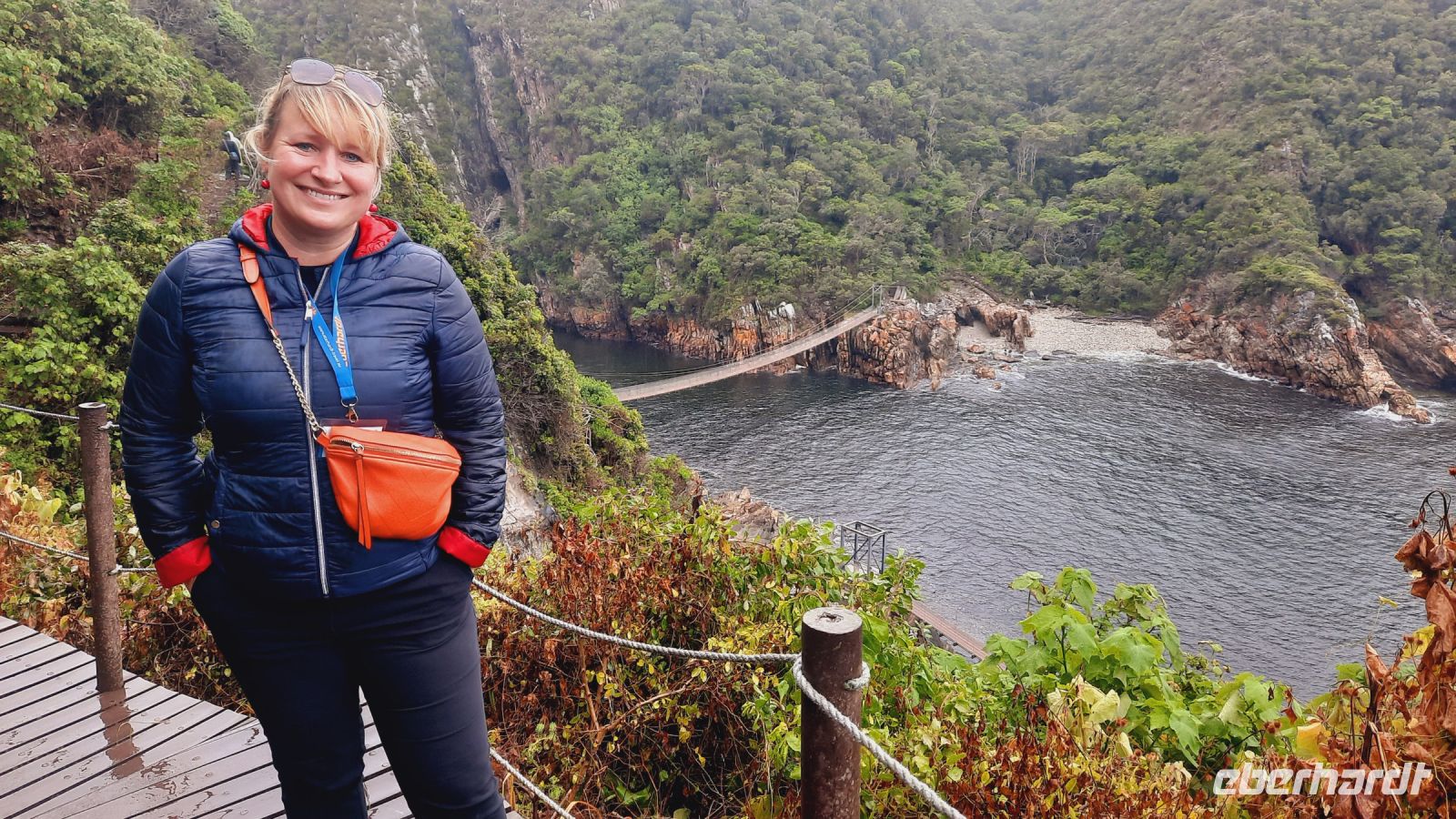 Wir starteten in einen grauen verregneten Tag. Auf dem Weg in den Tsitsikamma-Nationalpark hielten wir in Jeffreys Bay, dem berühmtesten Surf-Spot Südafrikas. Ein kleiner Muschelladen erhellte unsere Stimmung und wir konnten das ein oder andere Souvenir für zu Hause erwerben. Unsere Fahrt führte uns durch weite üppige Landschaften entlang der beginnenden berühmten Gartenroute. Diese führt kurz nach Port Elisabeth bis nach Mosselbay und zählt zu den landschaftlich reizvollsten und schönsten Panoramarouten in Südafrika. Zum Tsitsikamma-Nationalpark selbst gehört eine 80 Kilometer lange felsige Küstenlinie mit einzigartigen Landschaften am Meer. Und einen kleinen Teil davon wollten wir heute besuchen. Das Wort Tsitsikamma bedeutet „Ort des Wassers“, was wir für den heutigen Tag bestätigen konnten. Nach einer Kaffeepause deckten wir uns mit bunten „Regenmänteln“ ein und machten uns auf den Weg, einen Teil der letzten Urwälder Südafrikas bis zur Hängebrücke am Storms River zu durchwandern. Bei Sonne kann ja jeder, dachten wir uns. Vergnügt liefen wir zur Hängebrücke und waren stolz, dass auch alle Gäste die drei Brücken überquert hatten. Nachdem wir den Rundweg geschafft hatten, stärkten wir uns mit typisch südafrikanischen Gerichten wie z.B. Springbock-Carpaccio und staunten nicht schlecht, als wir einige kleine Wale entlang der Küste sahen.