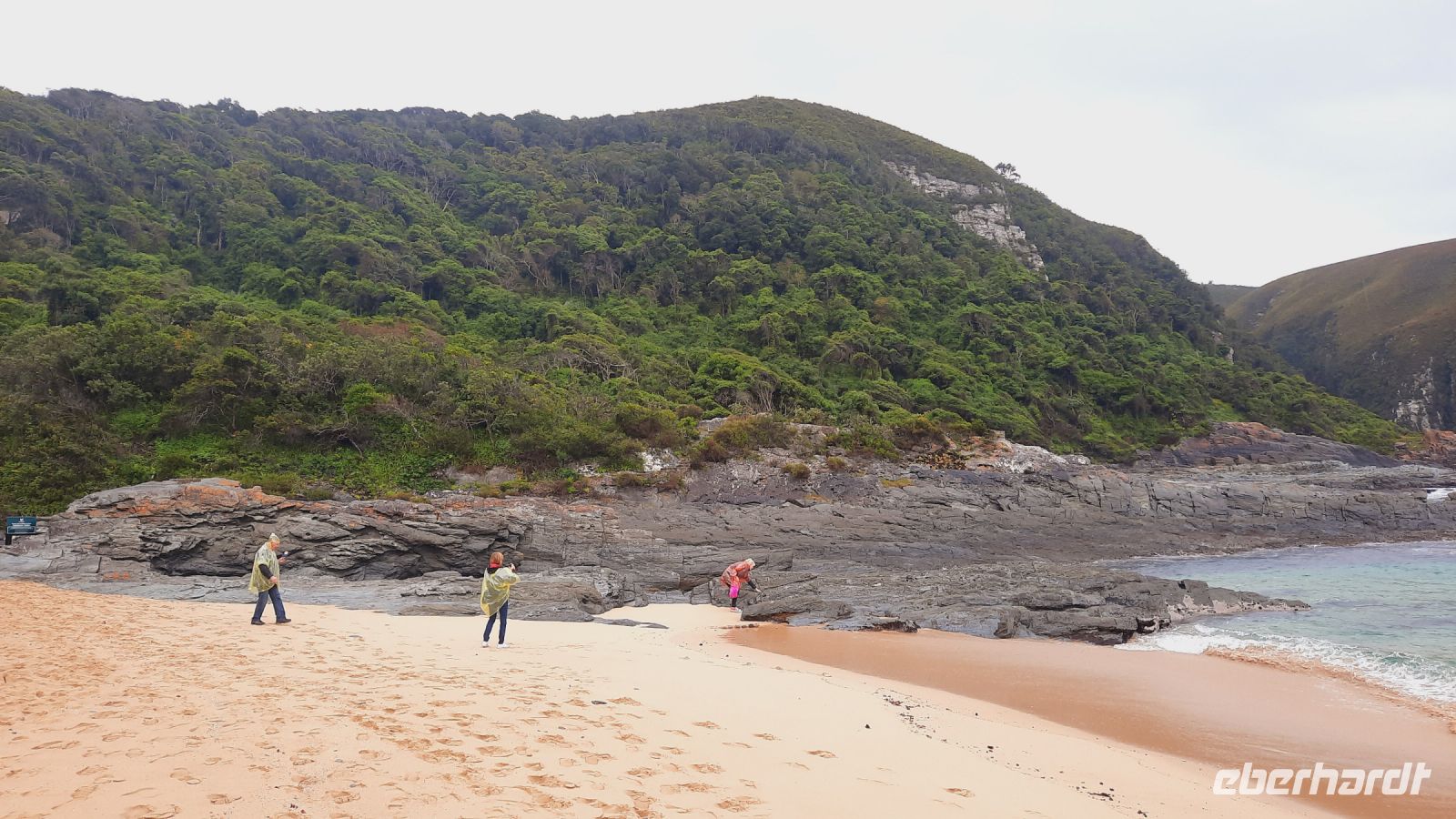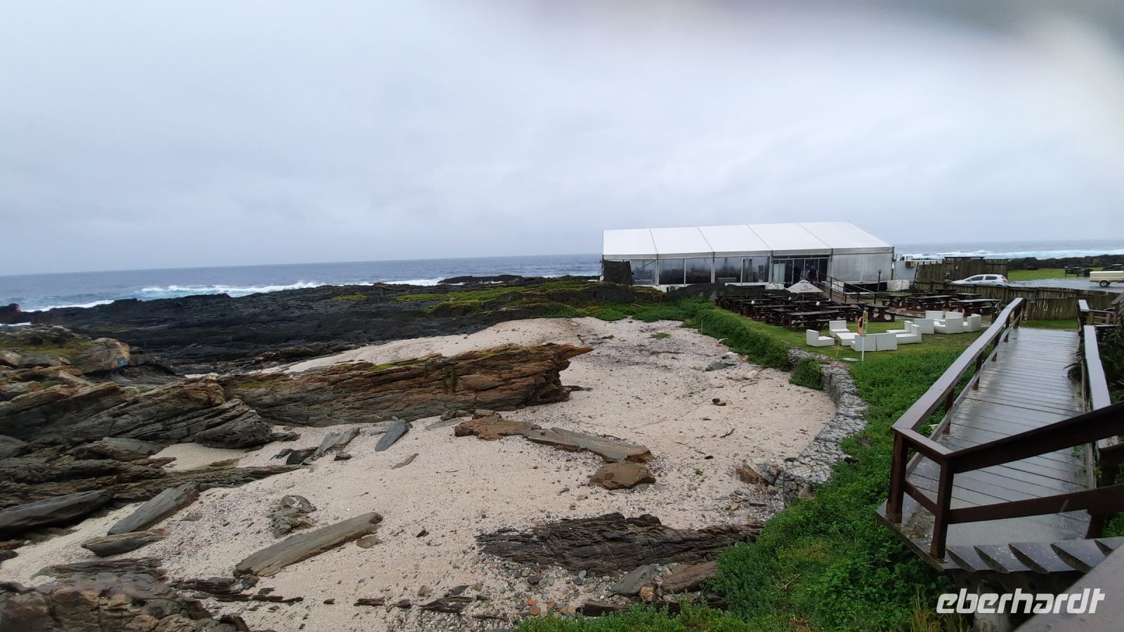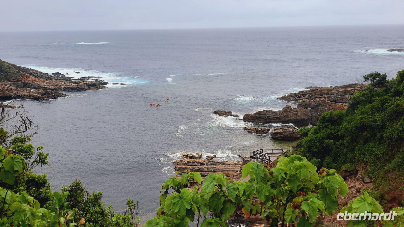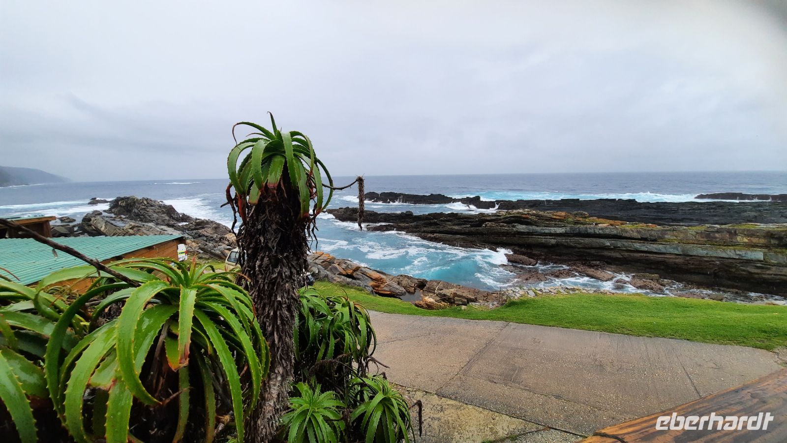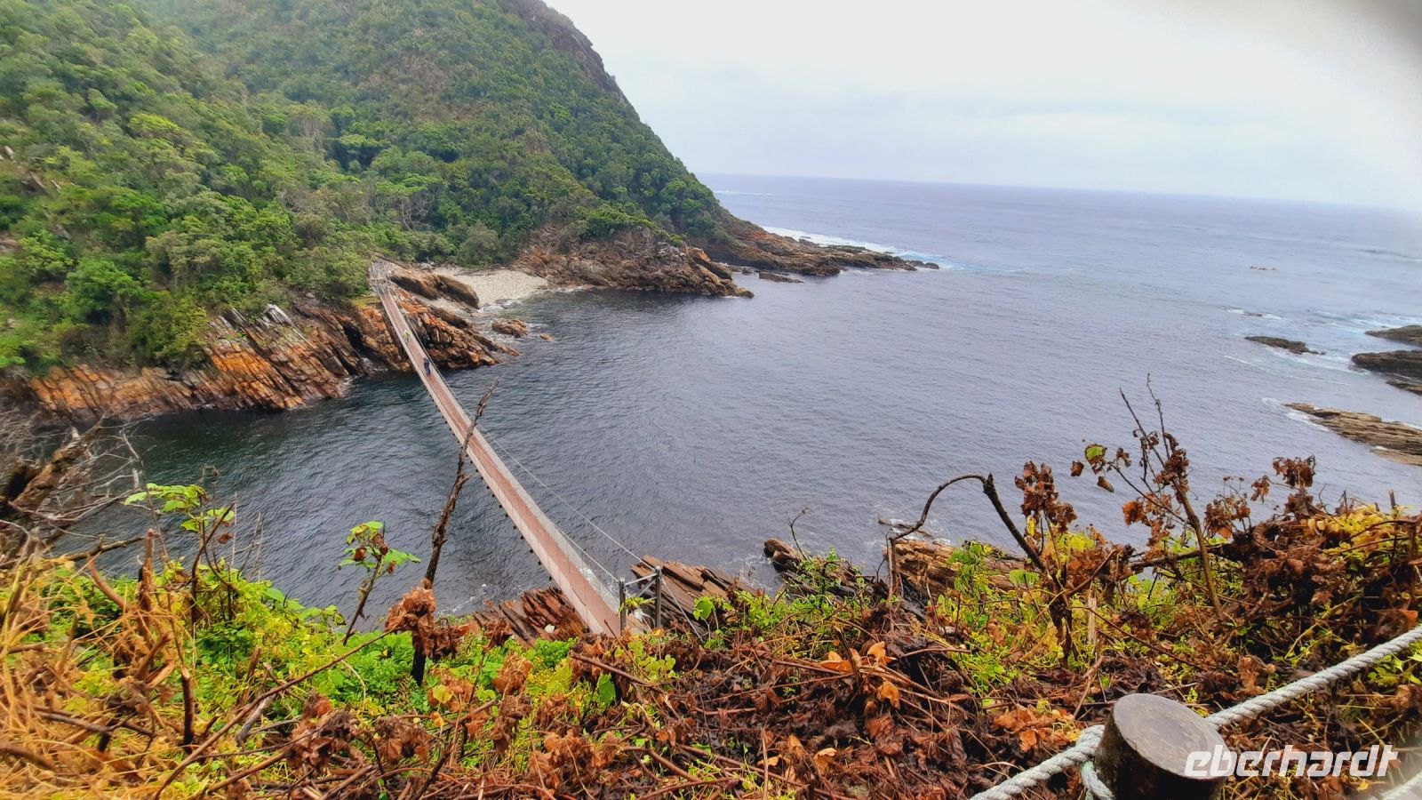Wir starteten in einen grauen verregneten Tag. Auf dem Weg in den Tsitsikamma-Nationalpark hielten wir in Jeffreys Bay, dem berühmtesten Surf-Spot Südafrikas. Ein kleiner Muschelladen erhellte unsere Stimmung und wir konnten das ein oder andere Souvenir für zu Hause erwerben. Unsere Fahrt führte uns durch weite üppige Landschaften entlang der beginnenden berühmten Gartenroute. Diese führt kurz nach Port Elisabeth bis nach Mosselbay und zählt zu den landschaftlich reizvollsten und schönsten Panoramarouten in Südafrika. Zum Tsitsikamma-Nationalpark selbst gehört eine 80 Kilometer lange felsige Küstenlinie mit einzigartigen Landschaften am Meer. Und einen kleinen Teil davon wollten wir heute besuchen. Das Wort Tsitsikamma bedeutet „Ort des Wassers“, was wir für den heutigen Tag bestätigen konnten. Nach einer Kaffeepause deckten wir uns mit bunten „Regenmänteln“ ein und machten uns auf den Weg, einen Teil der letzten Urwälder Südafrikas bis zur Hängebrücke am Storms River zu durchwandern. Bei Sonne kann ja jeder, dachten wir uns. Vergnügt liefen wir zur Hängebrücke und waren stolz, dass auch alle Gäste die drei Brücken überquert hatten. Nachdem wir den Rundweg geschafft hatten, stärkten wir uns mit typisch südafrikanischen Gerichten wie z.B. Springbock-Carpaccio und staunten nicht schlecht, als wir einige kleine Wale entlang der Küste sahen.