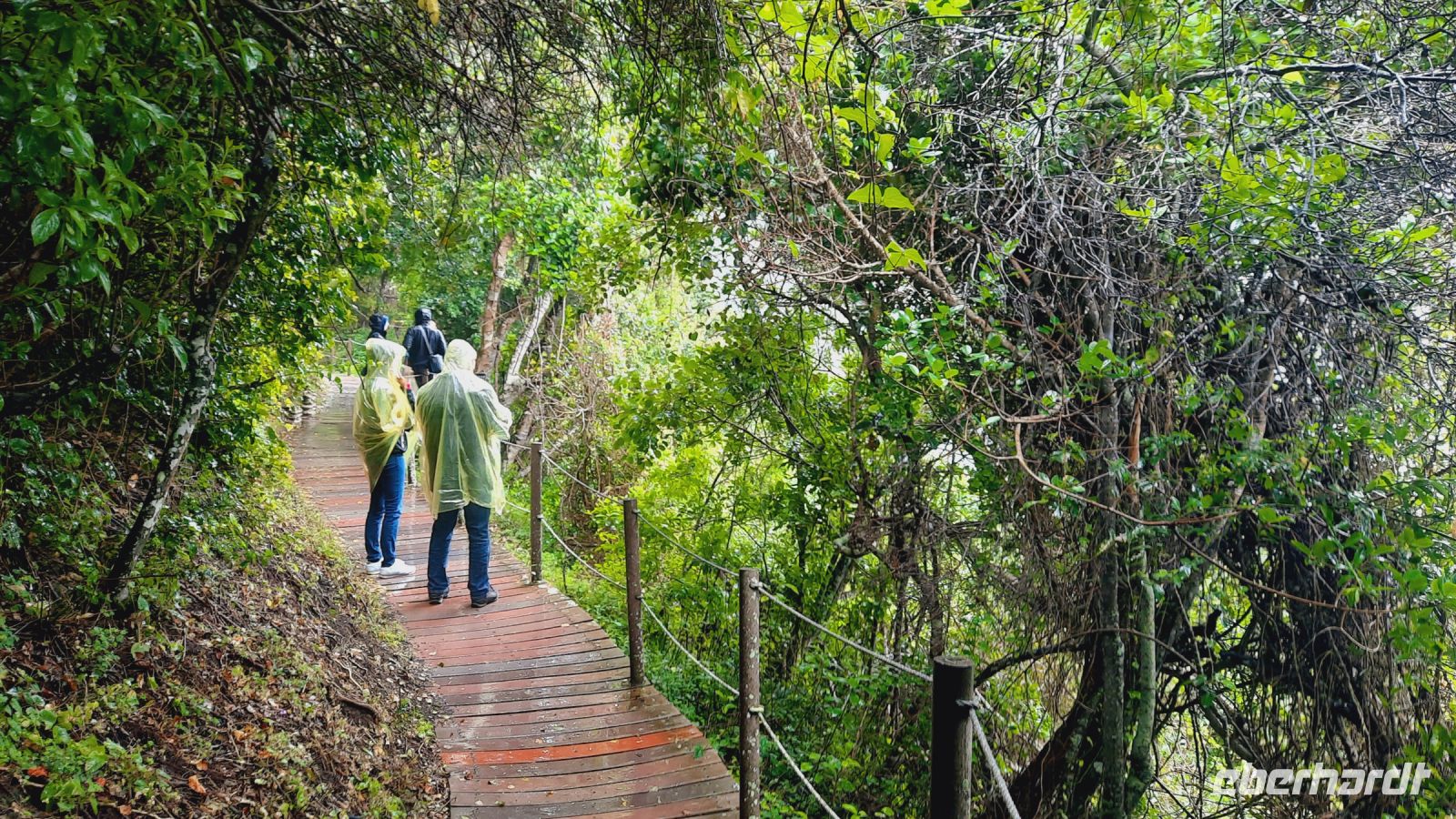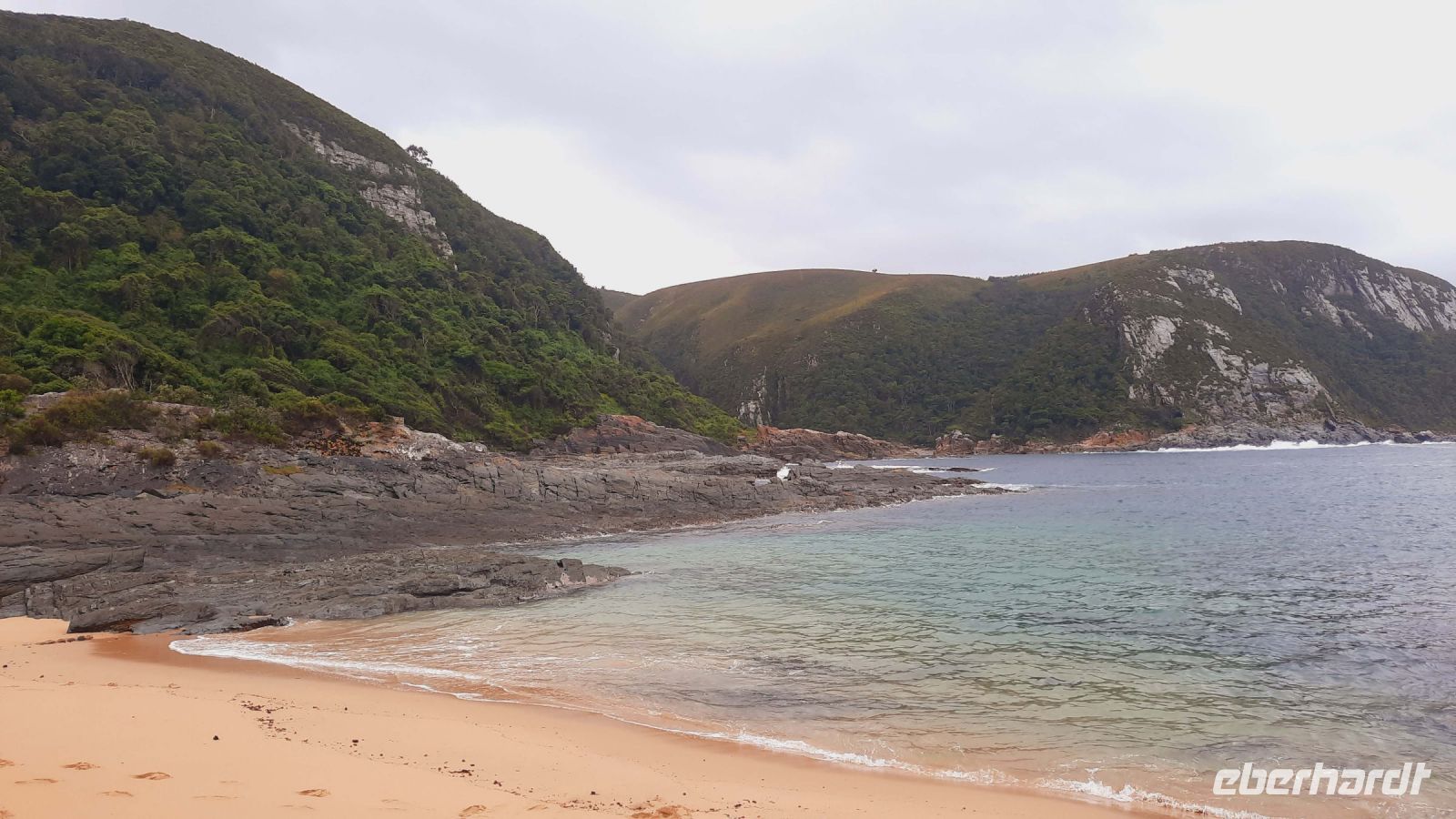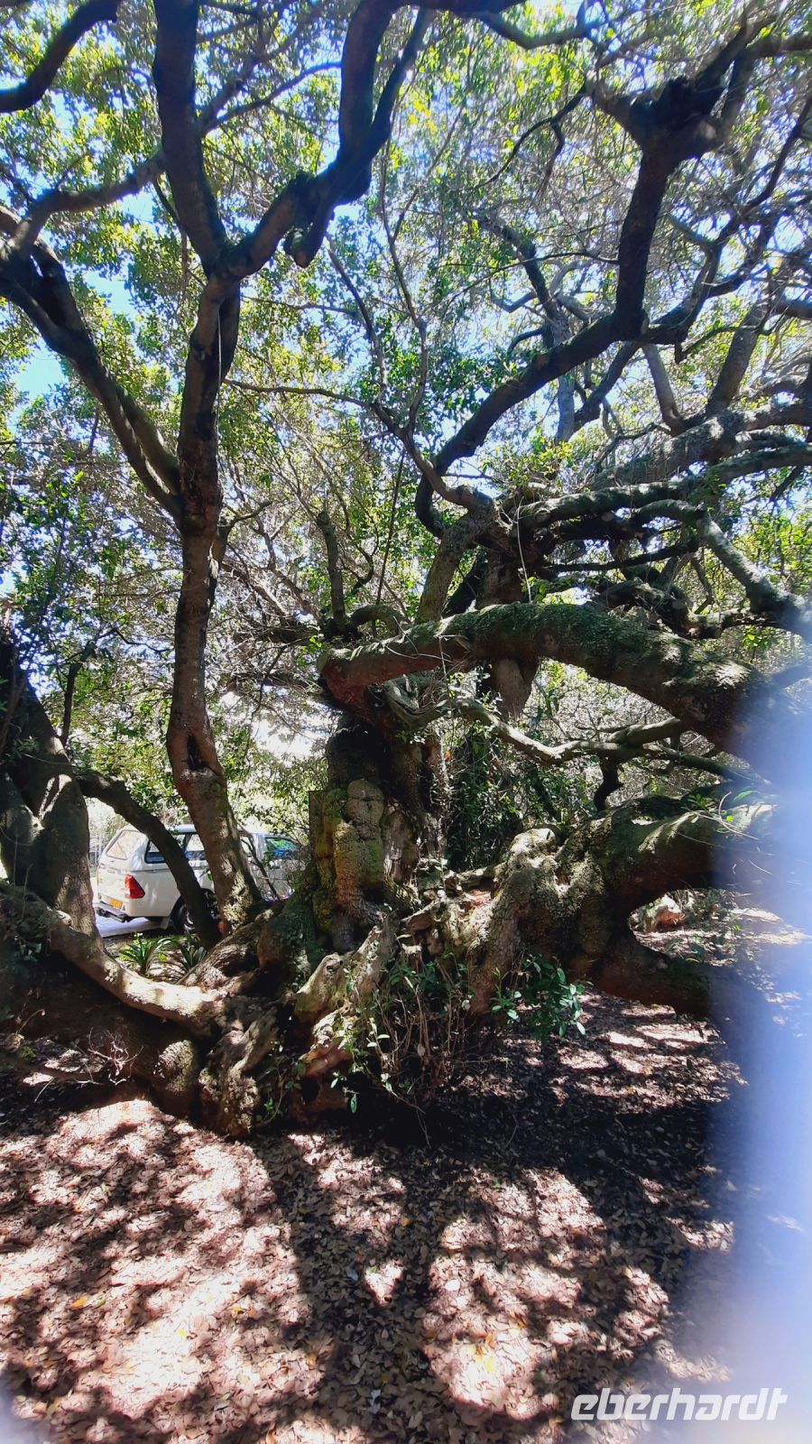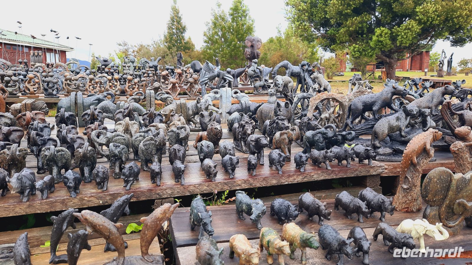 Wir starteten in einen grauen verregneten Tag. Auf dem Weg in den Tsitsikamma-Nationalpark hielten wir in Jeffreys Bay, dem berühmtesten Surf-Spot Südafrikas. Ein kleiner Muschelladen erhellte unsere Stimmung und wir konnten das ein oder andere Souvenir für zu Hause erwerben. Unsere Fahrt führte uns durch weite üppige Landschaften entlang der beginnenden berühmten Gartenroute. Diese führt kurz nach Port Elisabeth bis nach Mosselbay und zählt zu den landschaftlich reizvollsten und schönsten Panoramarouten in Südafrika. Zum Tsitsikamma-Nationalpark selbst gehört eine 80 Kilometer lange felsige Küstenlinie mit einzigartigen Landschaften am Meer. Und einen kleinen Teil davon wollten wir heute besuchen. Das Wort Tsitsikamma bedeutet „Ort des Wassers“, was wir für den heutigen Tag bestätigen konnten. Nach einer Kaffeepause deckten wir uns mit bunten „Regenmänteln“ ein und machten uns auf den Weg, einen Teil der letzten Urwälder Südafrikas bis zur Hängebrücke am Storms River zu durchwandern. Bei Sonne kann ja jeder, dachten wir uns. Vergnügt liefen wir zur Hängebrücke und waren stolz, dass auch alle Gäste die drei Brücken überquert hatten. Nachdem wir den Rundweg geschafft hatten, stärkten wir uns mit typisch südafrikanischen Gerichten wie z.B. Springbock-Carpaccio und staunten nicht schlecht, als wir einige kleine Wale entlang der Küste sahen.