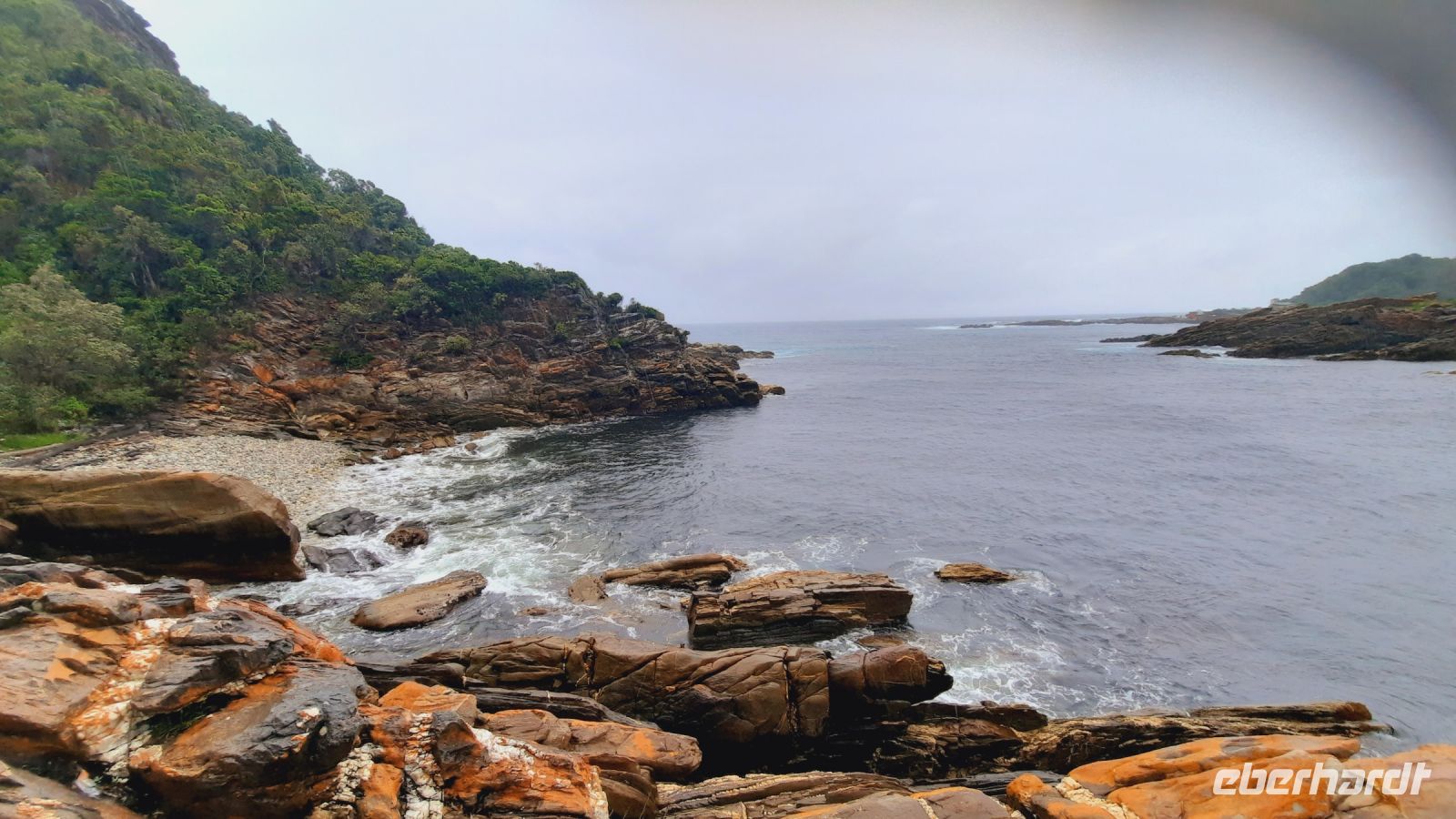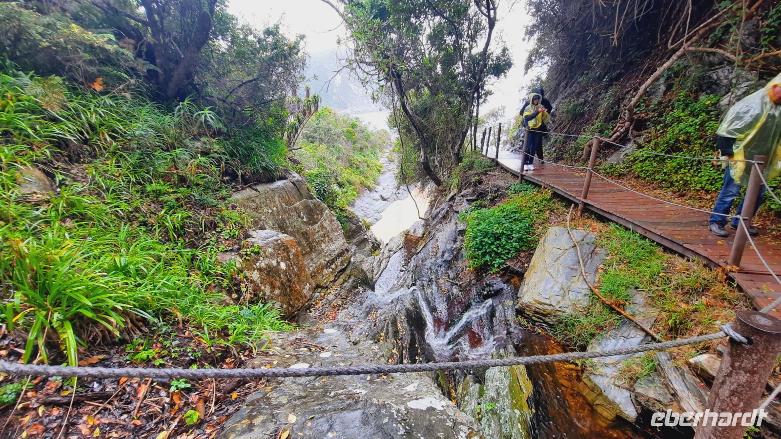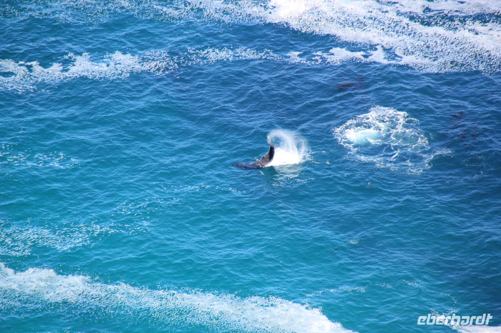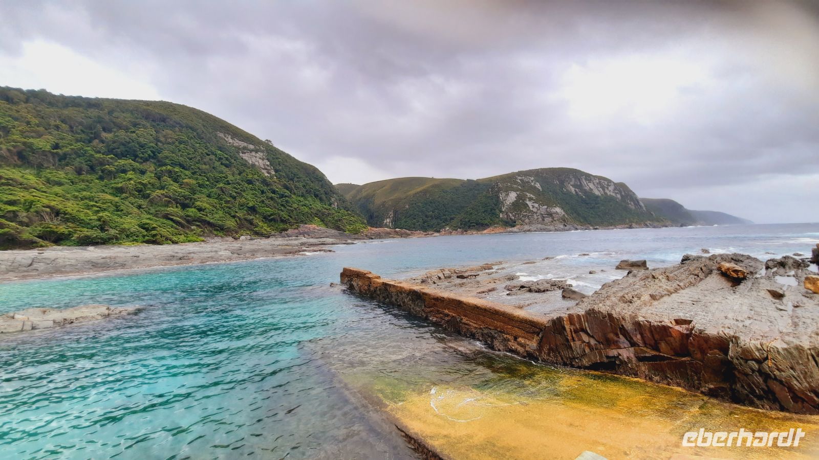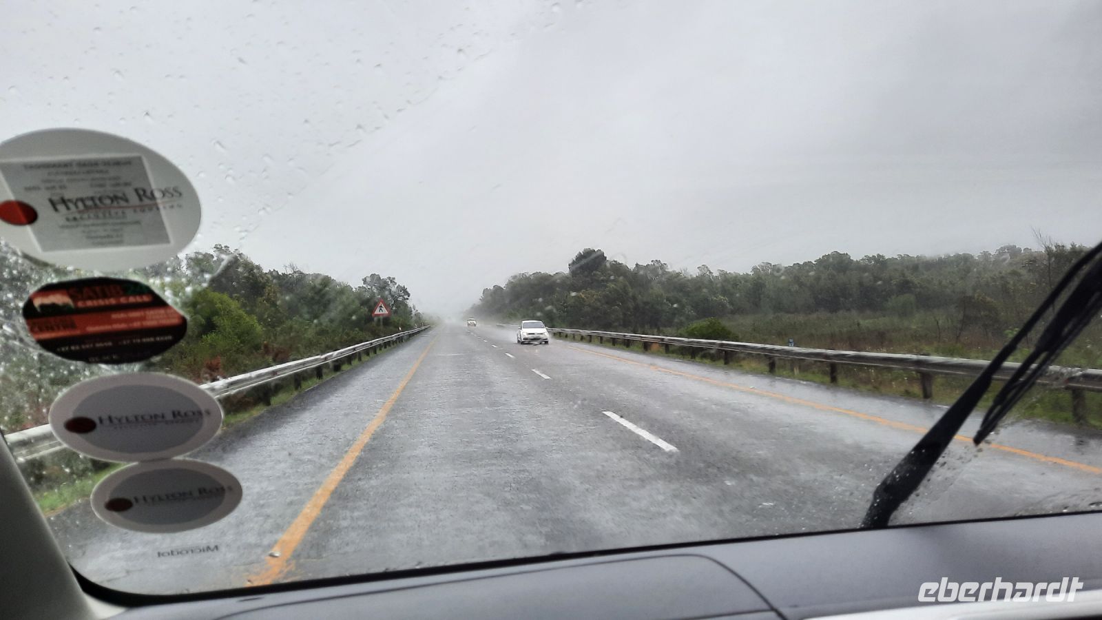 Wir starteten in einen grauen verregneten Tag. Auf dem Weg in den Tsitsikamma-Nationalpark hielten wir in Jeffreys Bay, dem berühmtesten Surf-Spot Südafrikas. Ein kleiner Muschelladen erhellte unsere Stimmung und wir konnten das ein oder andere Souvenir für zu Hause erwerben. Unsere Fahrt führte uns durch weite üppige Landschaften entlang der beginnenden berühmten Gartenroute. Diese führt kurz nach Port Elisabeth bis nach Mosselbay und zählt zu den landschaftlich reizvollsten und schönsten Panoramarouten in Südafrika. Zum Tsitsikamma-Nationalpark selbst gehört eine 80 Kilometer lange felsige Küstenlinie mit einzigartigen Landschaften am Meer. Und einen kleinen Teil davon wollten wir heute besuchen. Das Wort Tsitsikamma bedeutet „Ort des Wassers“, was wir für den heutigen Tag bestätigen konnten. Nach einer Kaffeepause deckten wir uns mit bunten „Regenmänteln“ ein und machten uns auf den Weg, einen Teil der letzten Urwälder Südafrikas bis zur Hängebrücke am Storms River zu durchwandern. Bei Sonne kann ja jeder, dachten wir uns. Vergnügt liefen wir zur Hängebrücke und waren stolz, dass auch alle Gäste die drei Brücken überquert hatten. Nachdem wir den Rundweg geschafft hatten, stärkten wir uns mit typisch südafrikanischen Gerichten wie z.B. Springbock-Carpaccio und staunten nicht schlecht, als wir einige kleine Wale entlang der Küste sahen.