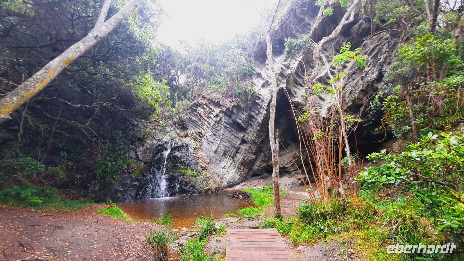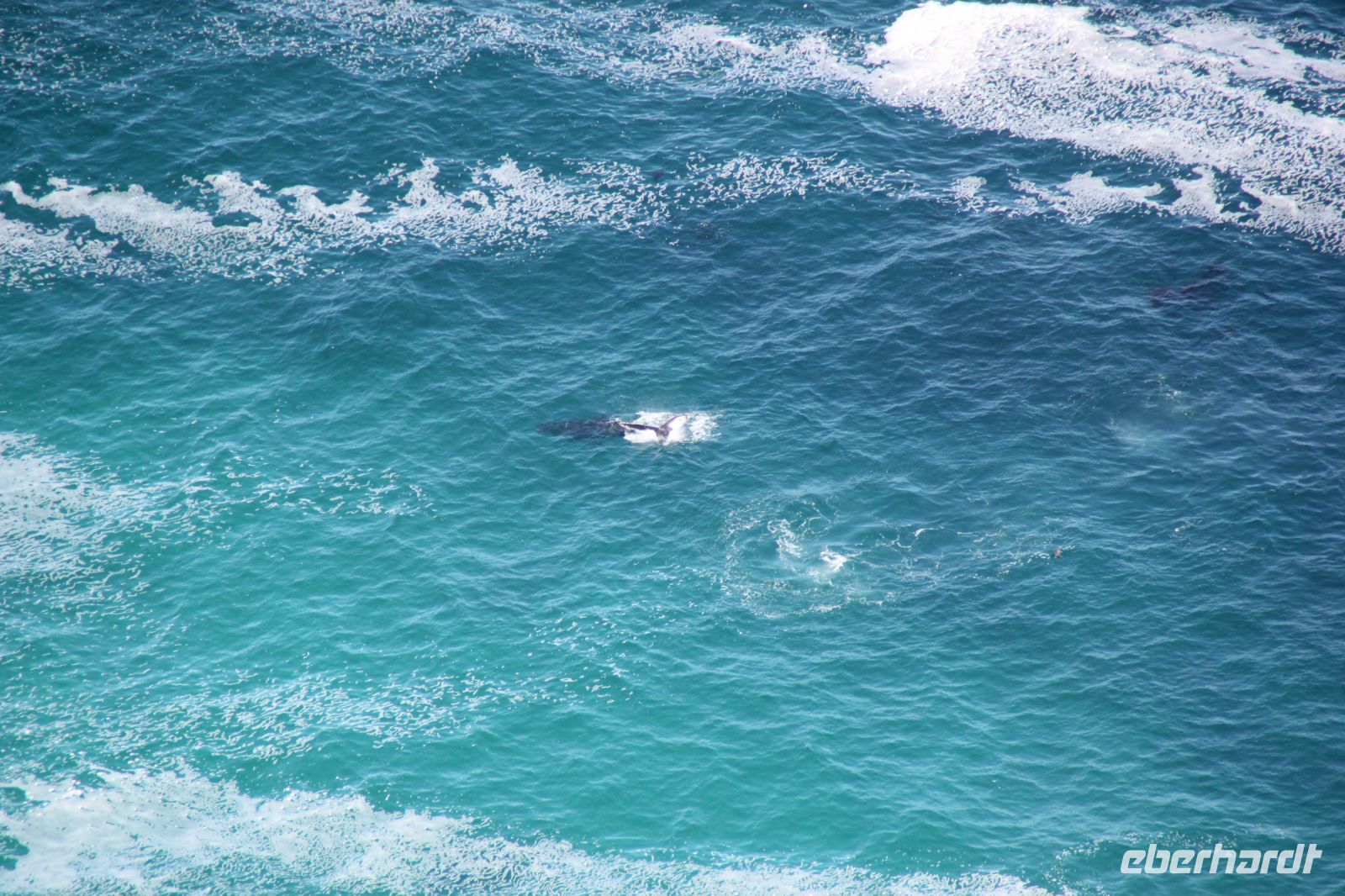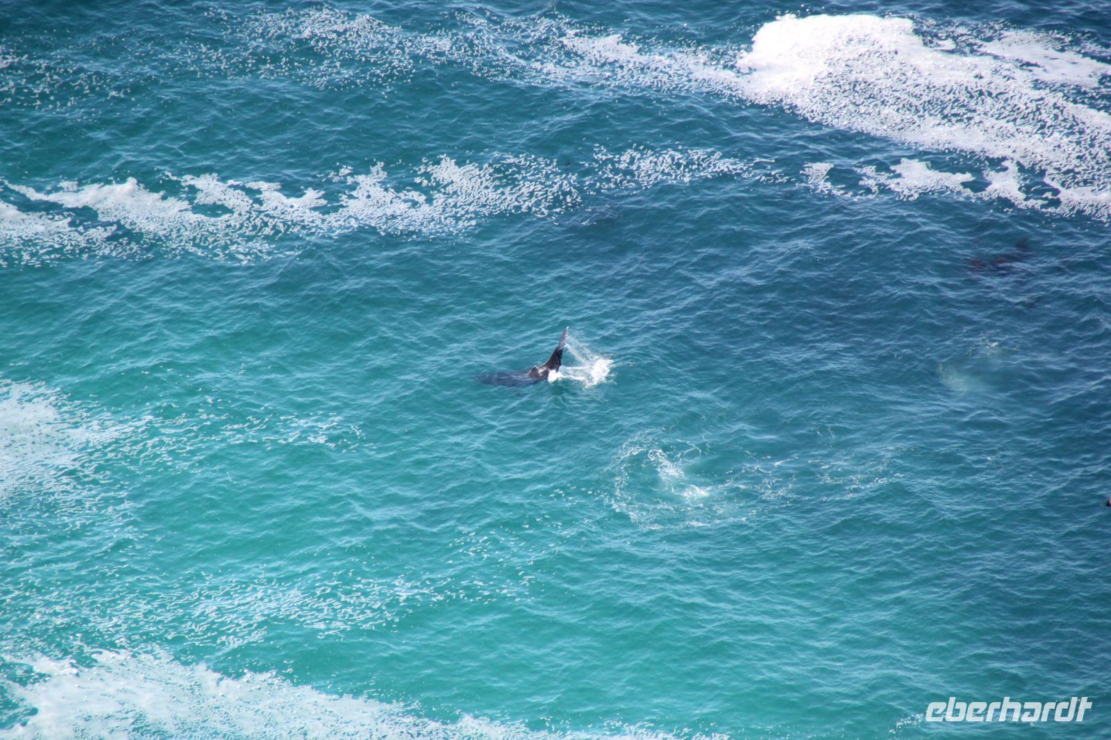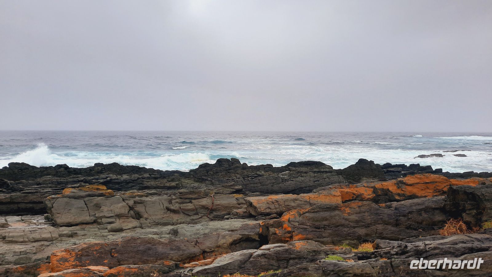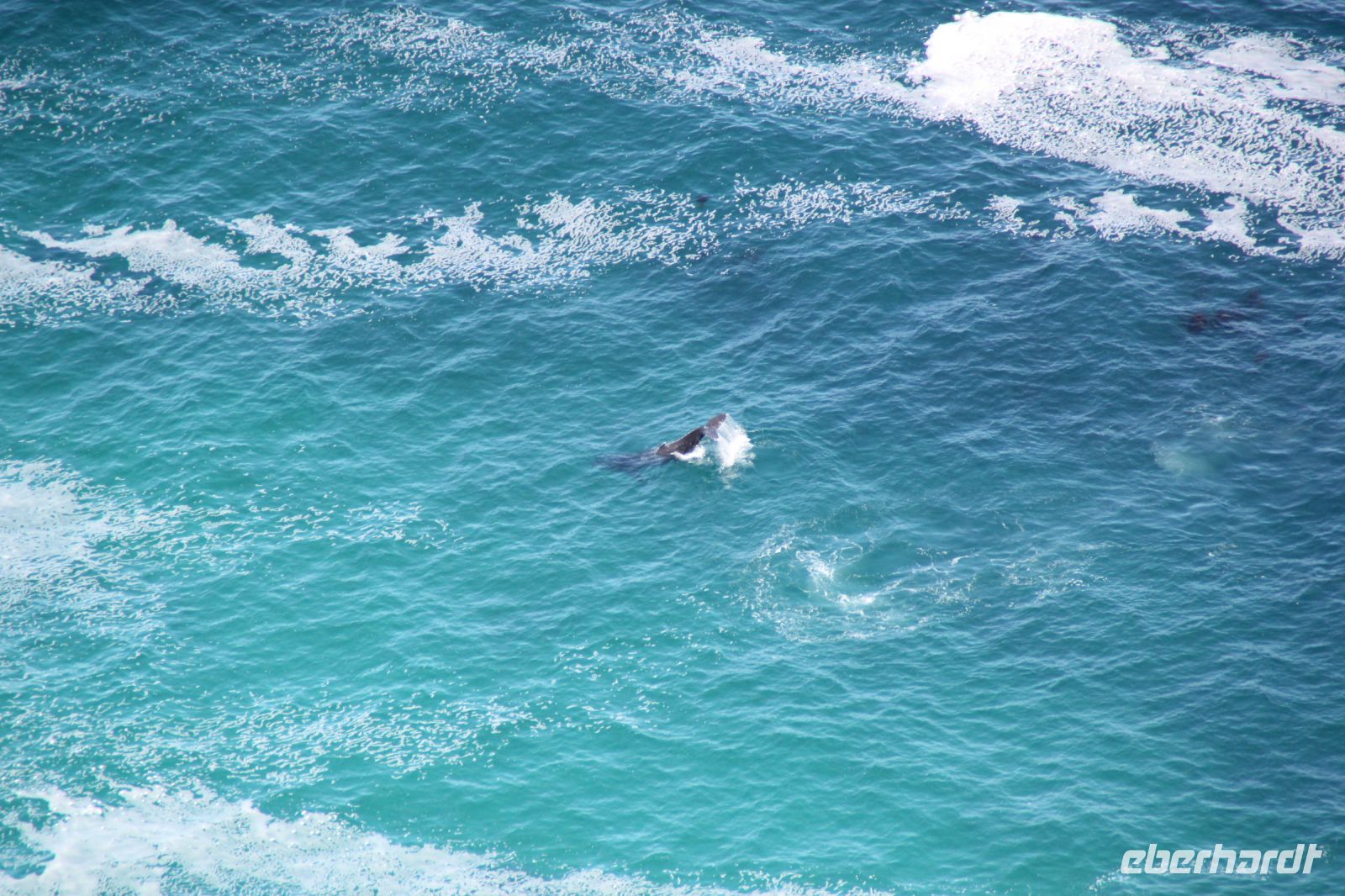 Wir starteten in einen grauen verregneten Tag. Auf dem Weg in den Tsitsikamma-Nationalpark hielten wir in Jeffreys Bay, dem berühmtesten Surf-Spot Südafrikas. Ein kleiner Muschelladen erhellte unsere Stimmung und wir konnten das ein oder andere Souvenir für zu Hause erwerben. Unsere Fahrt führte uns durch weite üppige Landschaften entlang der beginnenden berühmten Gartenroute. Diese führt kurz nach Port Elisabeth bis nach Mosselbay und zählt zu den landschaftlich reizvollsten und schönsten Panoramarouten in Südafrika. Zum Tsitsikamma-Nationalpark selbst gehört eine 80 Kilometer lange felsige Küstenlinie mit einzigartigen Landschaften am Meer. Und einen kleinen Teil davon wollten wir heute besuchen. Das Wort Tsitsikamma bedeutet „Ort des Wassers“, was wir für den heutigen Tag bestätigen konnten. Nach einer Kaffeepause deckten wir uns mit bunten „Regenmänteln“ ein und machten uns auf den Weg, einen Teil der letzten Urwälder Südafrikas bis zur Hängebrücke am Storms River zu durchwandern. Bei Sonne kann ja jeder, dachten wir uns. Vergnügt liefen wir zur Hängebrücke und waren stolz, dass auch alle Gäste die drei Brücken überquert hatten. Nachdem wir den Rundweg geschafft hatten, stärkten wir uns mit typisch südafrikanischen Gerichten wie z.B. Springbock-Carpaccio und staunten nicht schlecht, als wir einige kleine Wale entlang der Küste sahen.