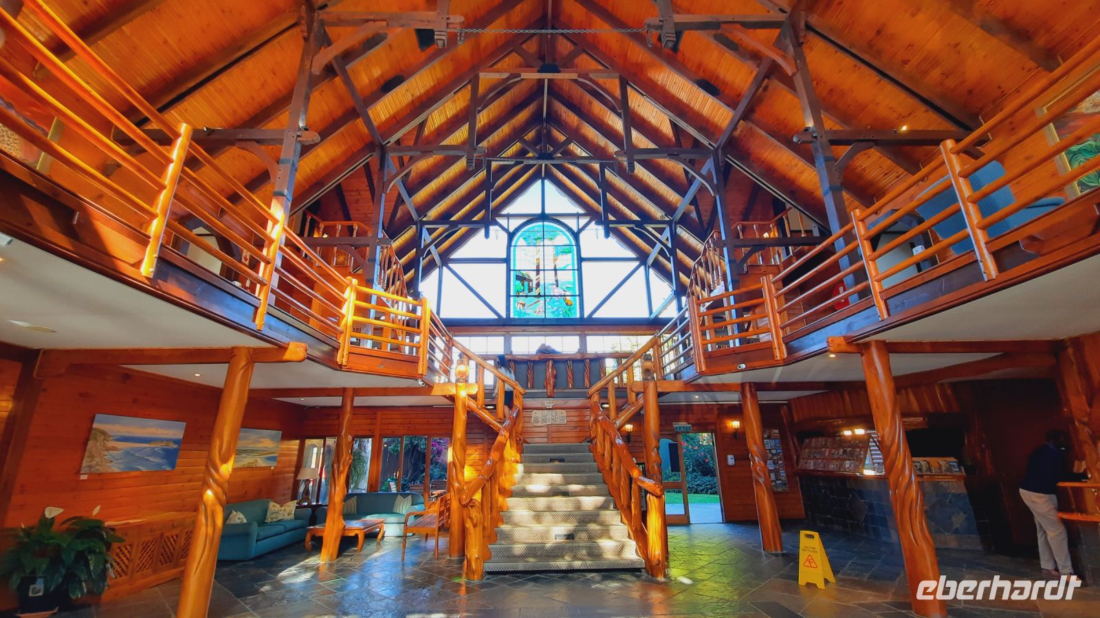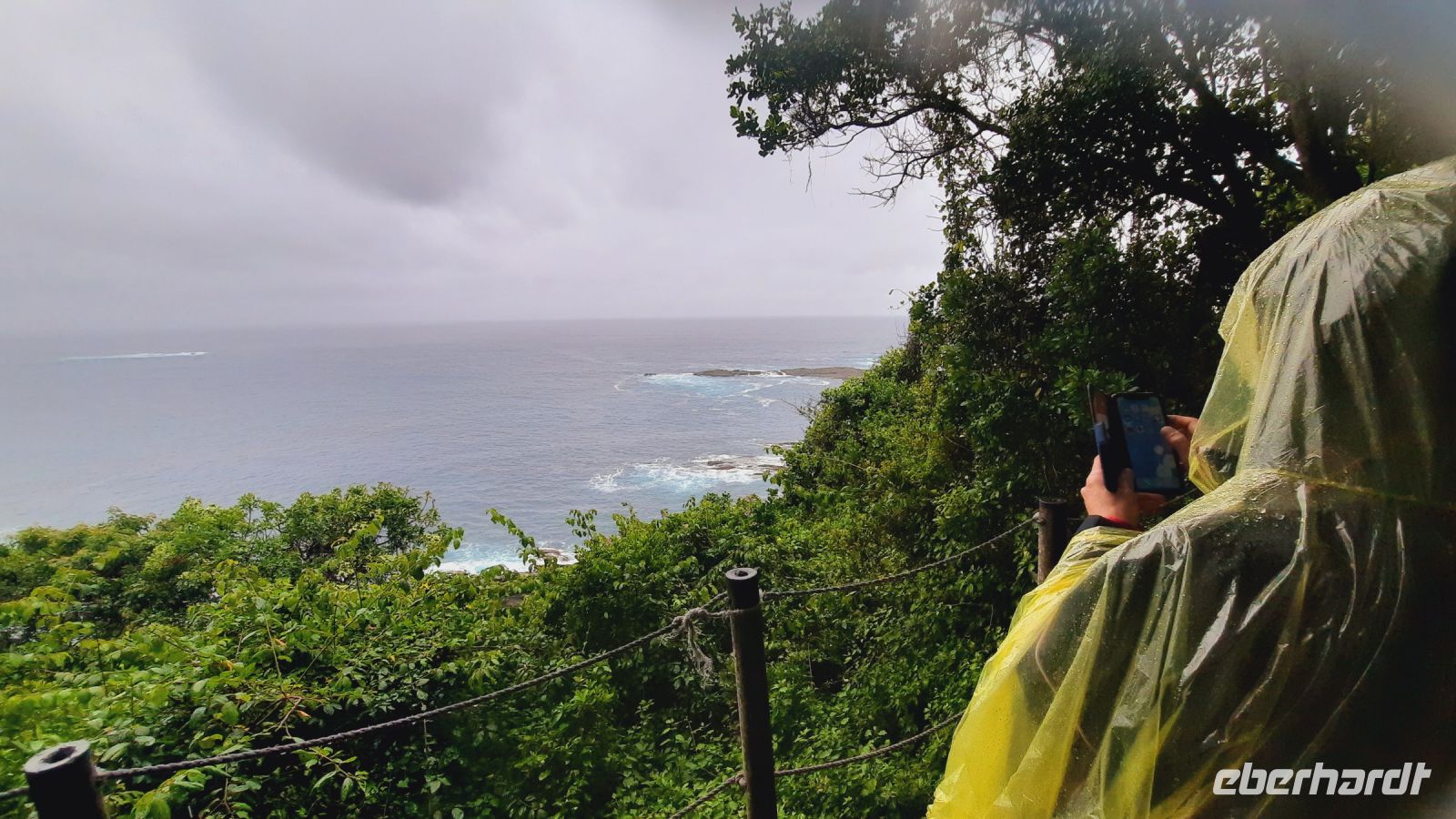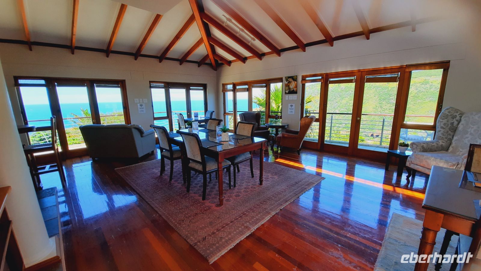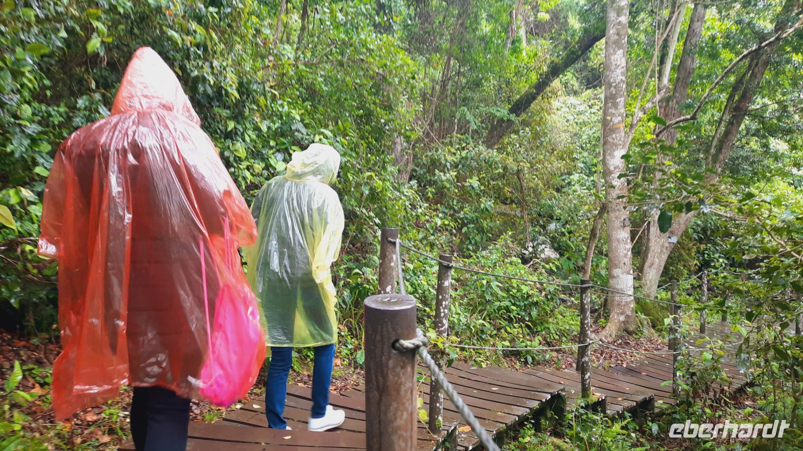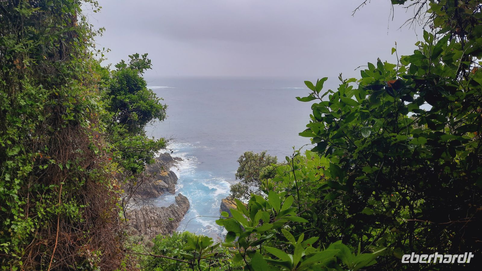 Wir starteten in einen grauen verregneten Tag. Auf dem Weg in den Tsitsikamma-Nationalpark hielten wir in Jeffreys Bay, dem berühmtesten Surf-Spot Südafrikas. Ein kleiner Muschelladen erhellte unsere Stimmung und wir konnten das ein oder andere Souvenir für zu Hause erwerben. Unsere Fahrt führte uns durch weite üppige Landschaften entlang der beginnenden berühmten Gartenroute. Diese führt kurz nach Port Elisabeth bis nach Mosselbay und zählt zu den landschaftlich reizvollsten und schönsten Panoramarouten in Südafrika. Zum Tsitsikamma-Nationalpark selbst gehört eine 80 Kilometer lange felsige Küstenlinie mit einzigartigen Landschaften am Meer. Und einen kleinen Teil davon wollten wir heute besuchen. Das Wort Tsitsikamma bedeutet „Ort des Wassers“, was wir für den heutigen Tag bestätigen konnten. Nach einer Kaffeepause deckten wir uns mit bunten „Regenmänteln“ ein und machten uns auf den Weg, einen Teil der letzten Urwälder Südafrikas bis zur Hängebrücke am Storms River zu durchwandern. Bei Sonne kann ja jeder, dachten wir uns. Vergnügt liefen wir zur Hängebrücke und waren stolz, dass auch alle Gäste die drei Brücken überquert hatten. Nachdem wir den Rundweg geschafft hatten, stärkten wir uns mit typisch südafrikanischen Gerichten wie z.B. Springbock-Carpaccio und staunten nicht schlecht, als wir einige kleine Wale entlang der Küste sahen.