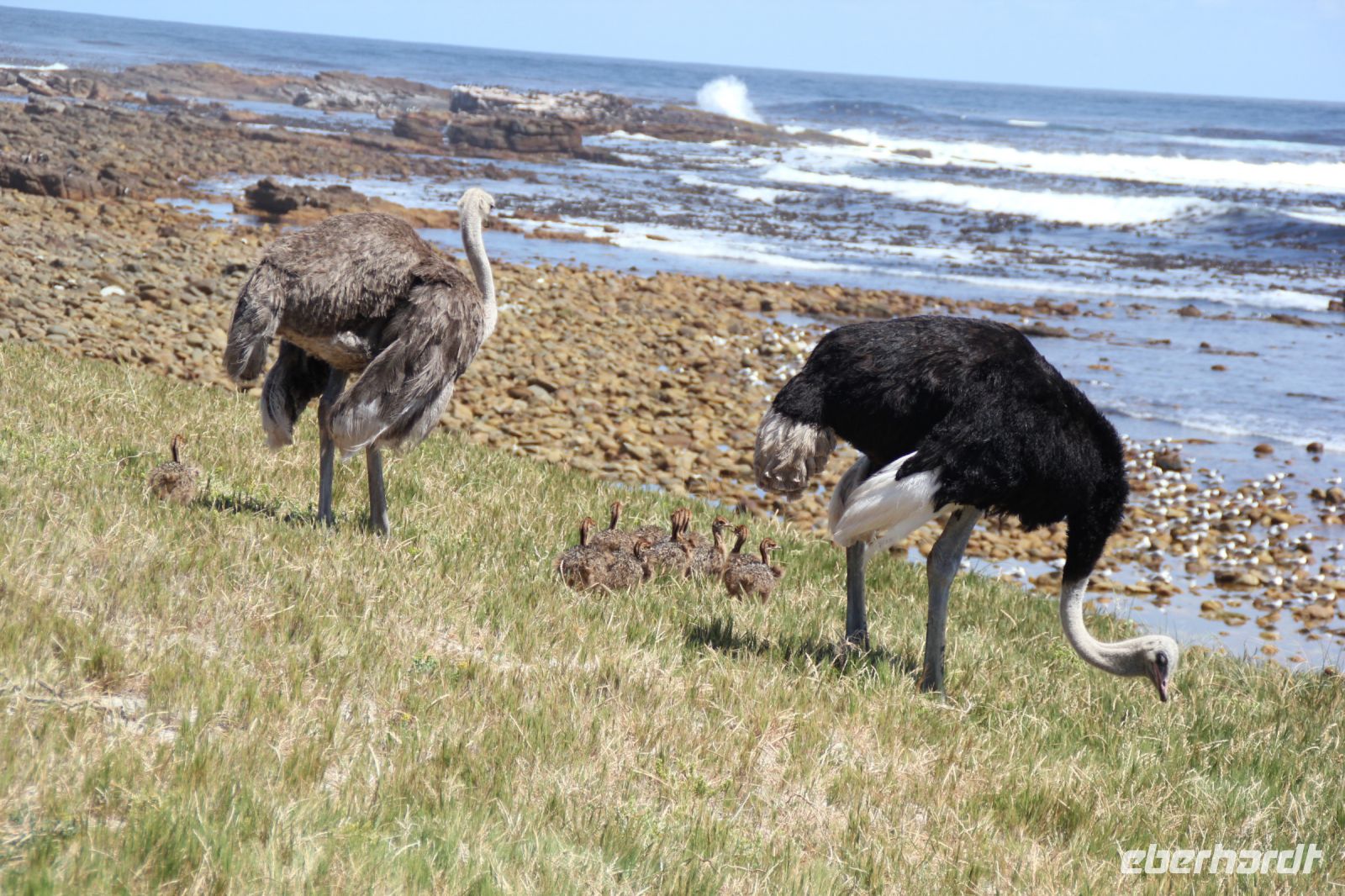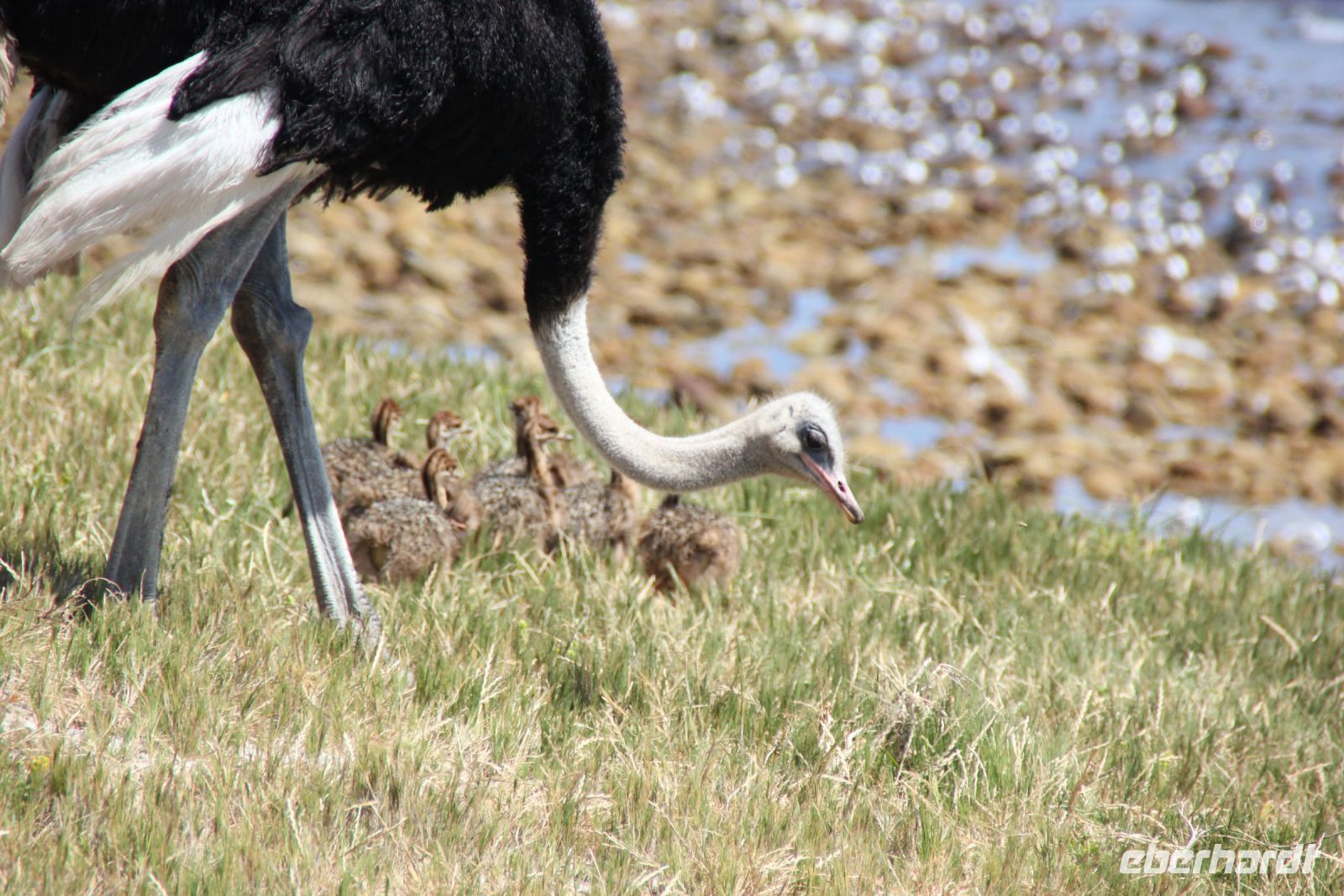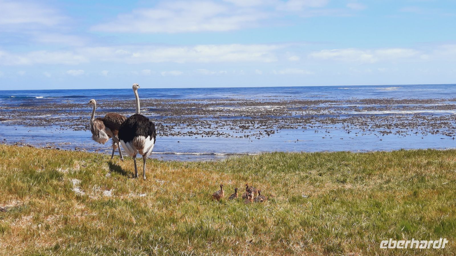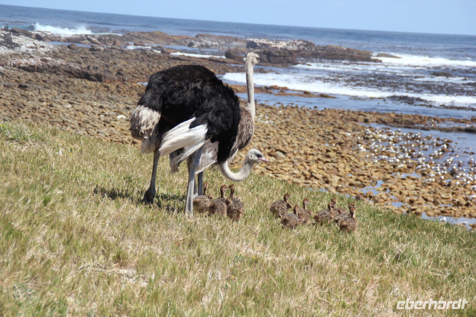 Mit der Bahn Flying Dutchman fuhren auf den Cape Point und hielten inne. Die Aussicht war grandios! Wir sahen einen spielenden Wal weit unten im Wasser und gingen bis zum alten Leuchtturm, welcher heute als zentrale Überwachungsstelle für alle Leuchttürme Südafrika dient. Nachfolgend fuhren wir zum bekanntesten Schild Afrikas. Wir fotografierten uns nacheinander, miteinander und gemeinsam und stießen mit afrikanischem Sekt darauf an, am südlichsten Punkt zu stehen.Auf dem Rückweg trafen wir noch eine kleine Straußenfamilie mit ganzen neuen Küken. Da hatten die Eltern eine Menge zu tun ??