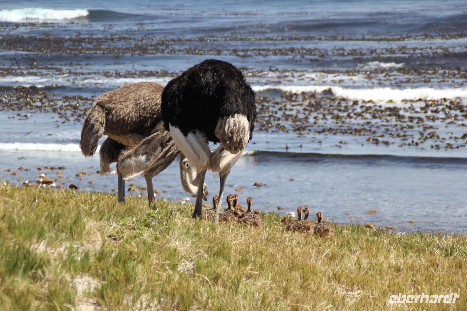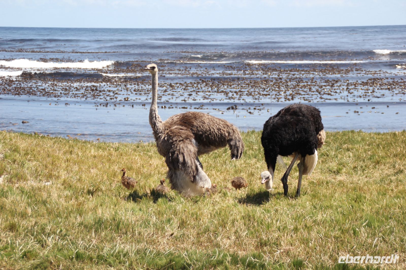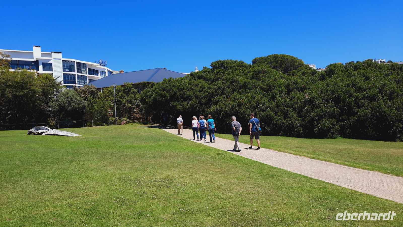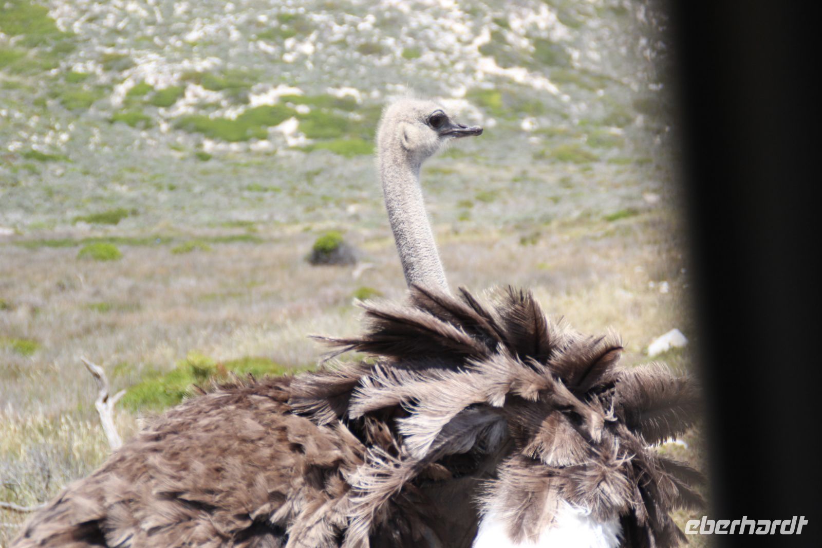 Mit der Bahn Flying Dutchman fuhren auf den Cape Point und hielten inne. Die Aussicht war grandios! Wir sahen einen spielenden Wal weit unten im Wasser und gingen bis zum alten Leuchtturm, welcher heute als zentrale Überwachungsstelle für alle Leuchttürme Südafrika dient. Nachfolgend fuhren wir zum bekanntesten Schild Afrikas. Wir fotografierten uns nacheinander, miteinander und gemeinsam und stießen mit afrikanischem Sekt darauf an, am südlichsten Punkt zu stehen.Auf dem Rückweg trafen wir noch eine kleine Straußenfamilie mit ganzen neuen Küken. Da hatten die Eltern eine Menge zu tun ??