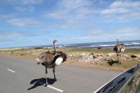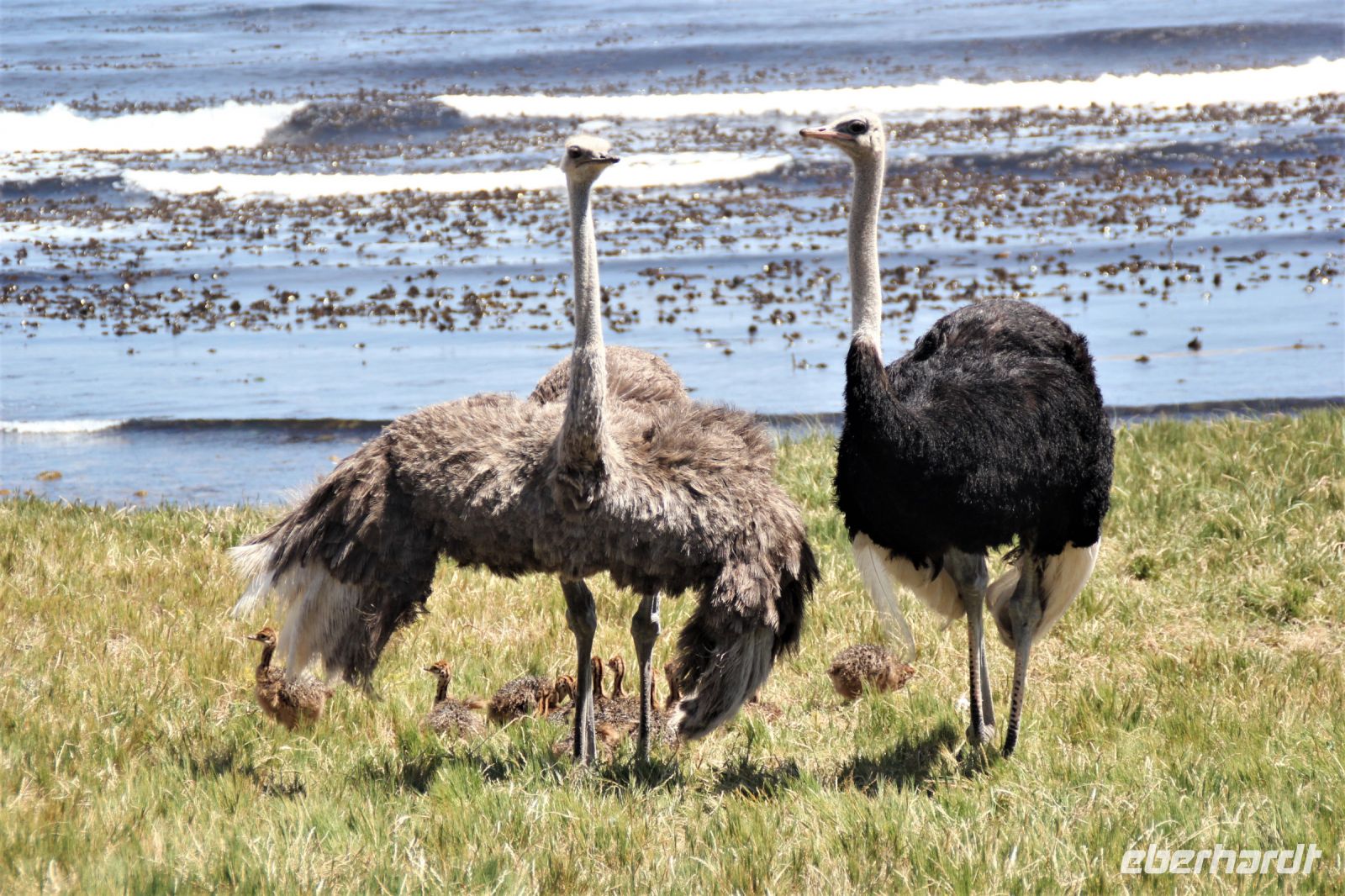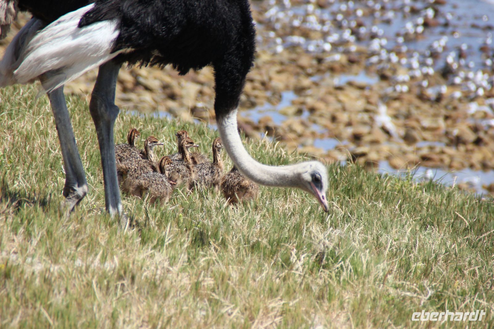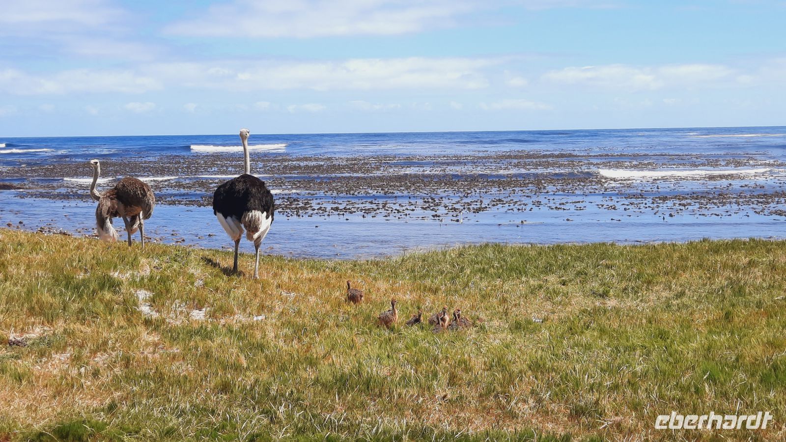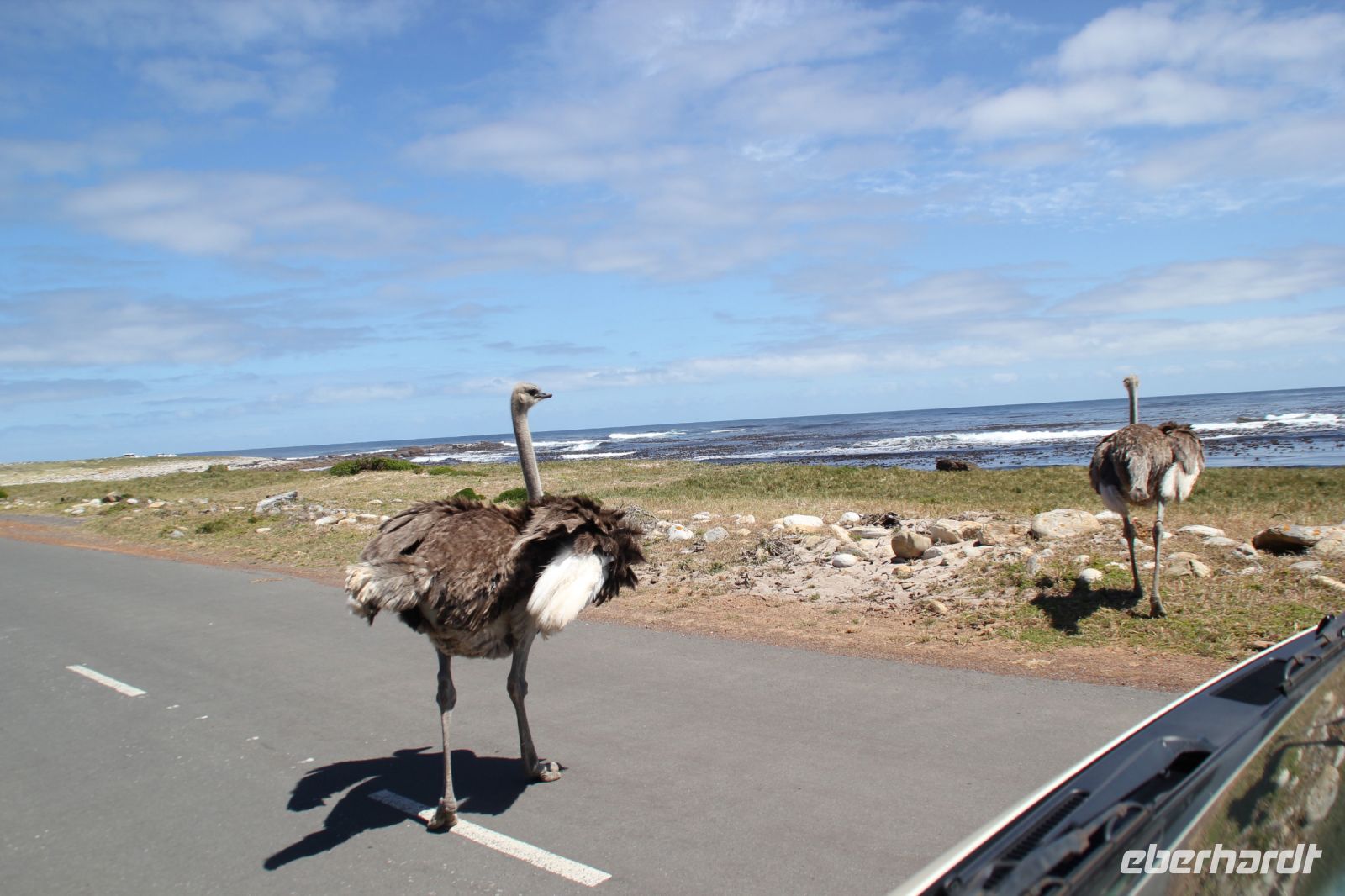 Mit der Bahn Flying Dutchman fuhren auf den Cape Point und hielten inne. Die Aussicht war grandios! Wir sahen einen spielenden Wal weit unten im Wasser und gingen bis zum alten Leuchtturm, welcher heute als zentrale Überwachungsstelle für alle Leuchttürme Südafrika dient. Nachfolgend fuhren wir zum bekanntesten Schild Afrikas. Wir fotografierten uns nacheinander, miteinander und gemeinsam und stießen mit afrikanischem Sekt darauf an, am südlichsten Punkt zu stehen.Auf dem Rückweg trafen wir noch eine kleine Straußenfamilie mit ganzen neuen Küken. Da hatten die Eltern eine Menge zu tun ??
