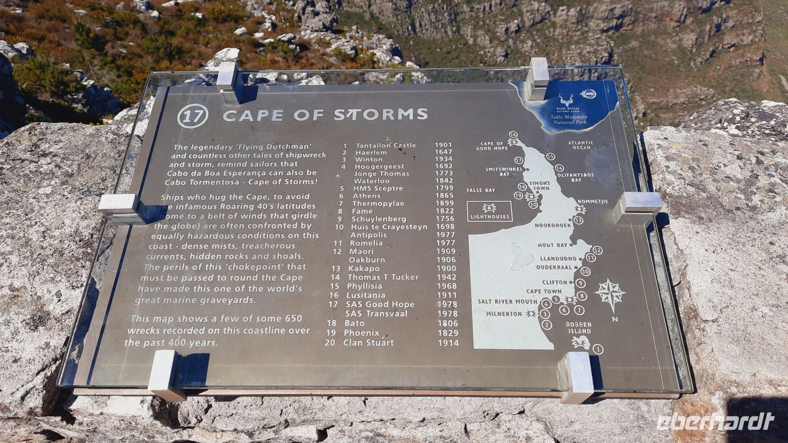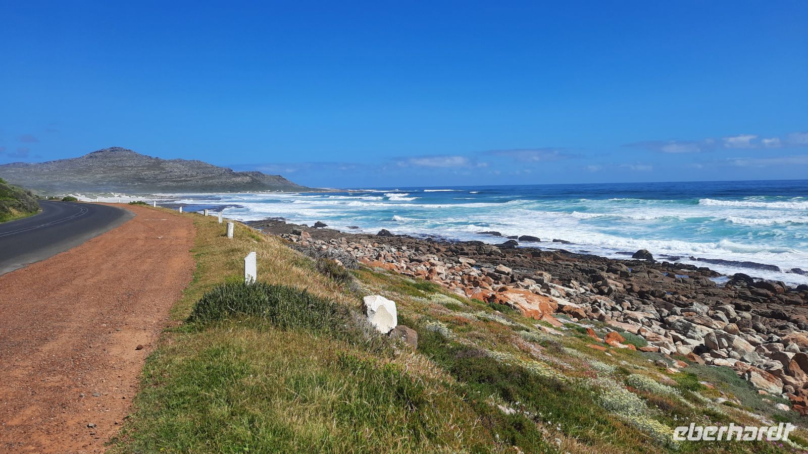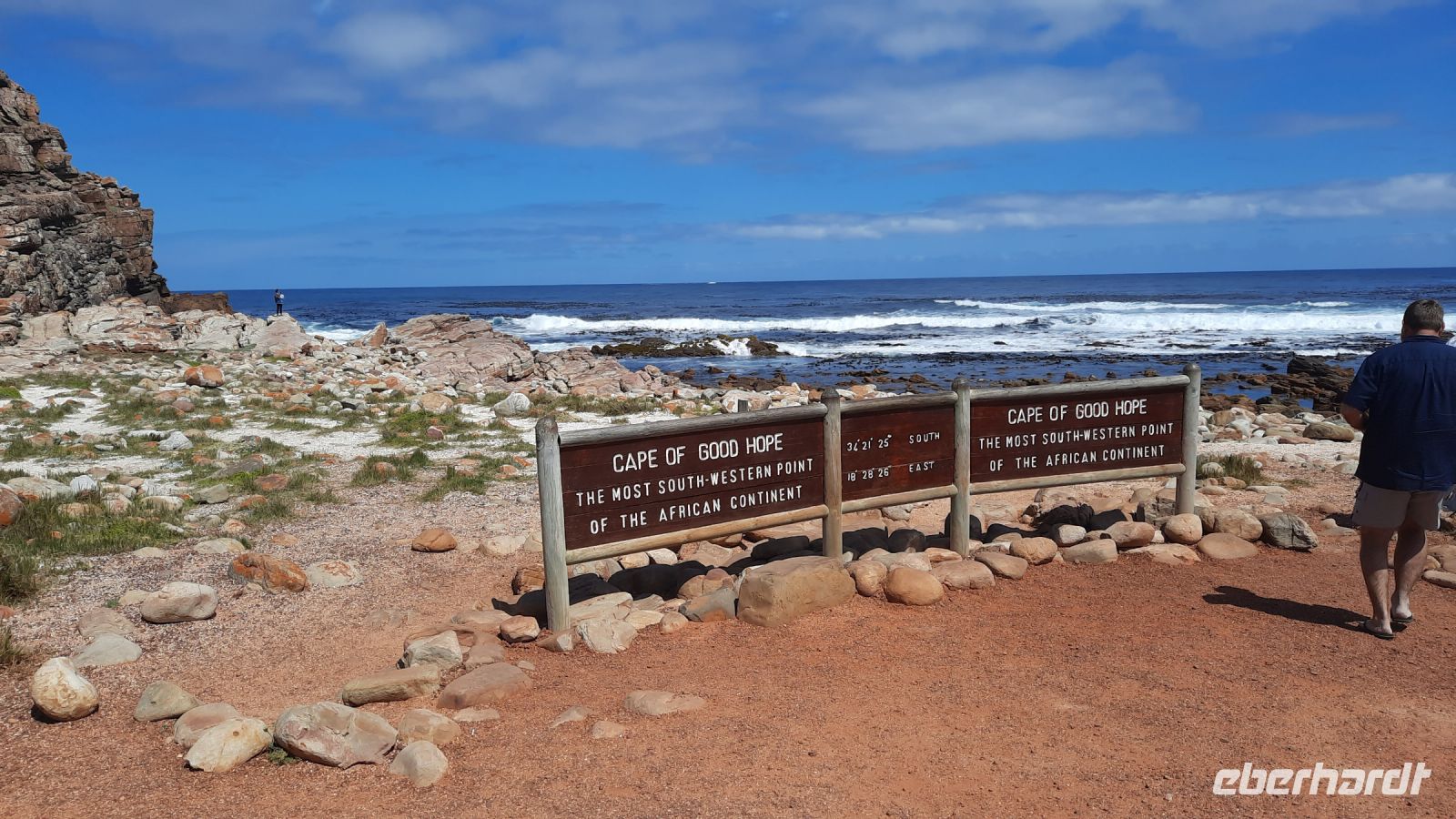 Nun endlich kamen wir am Nationalpark Kap-Halbinsel an. Nun noch schnell mit der Standseilbahn bis zum Leuchtturm gefahren und da waren wir: am Cape Point oder Kap der guten Hoffnung. Das Kap selbst hat eine lange bewegte Vergangenheit. Bartholomäus Diaz, dessen Karavelle wir einen Tag zuvor bin Mosselbay besichtigten, umrundete das Kap 1488. Er war im Auftrag von Prinz Heinrich dem Seefahrer unterwegs und benannte es „Kap der Stürme“. Zehn Jahre später fuhr Vasco da Gama die gleiche Route lang und segelte bis nach Indien. Der portugiesische König Johann II. oder ein Forscher aus Portugal, da sind sich die Quellen uneinig, ernannte das Kap jetzt Gute Hoffnung, da er durch den Erfolg neuer erschlossener Handelswege inspiriert war.