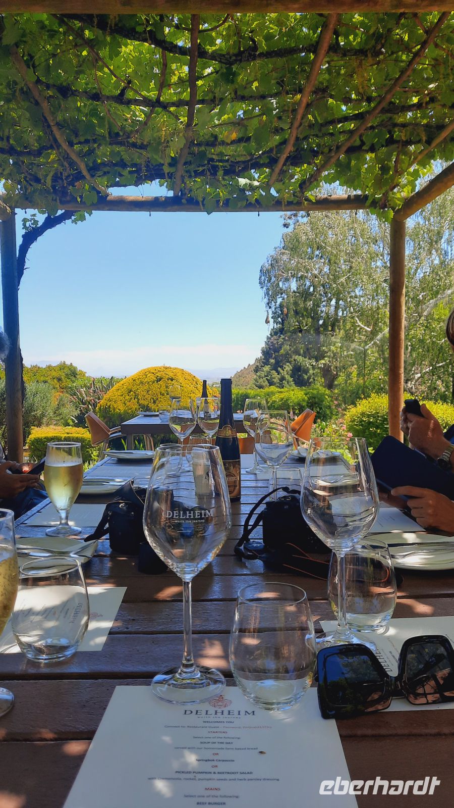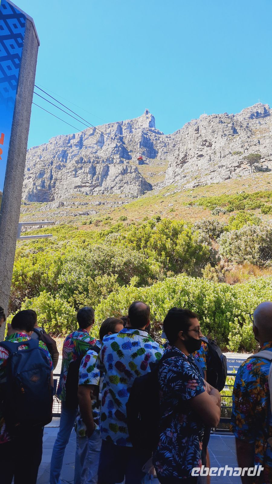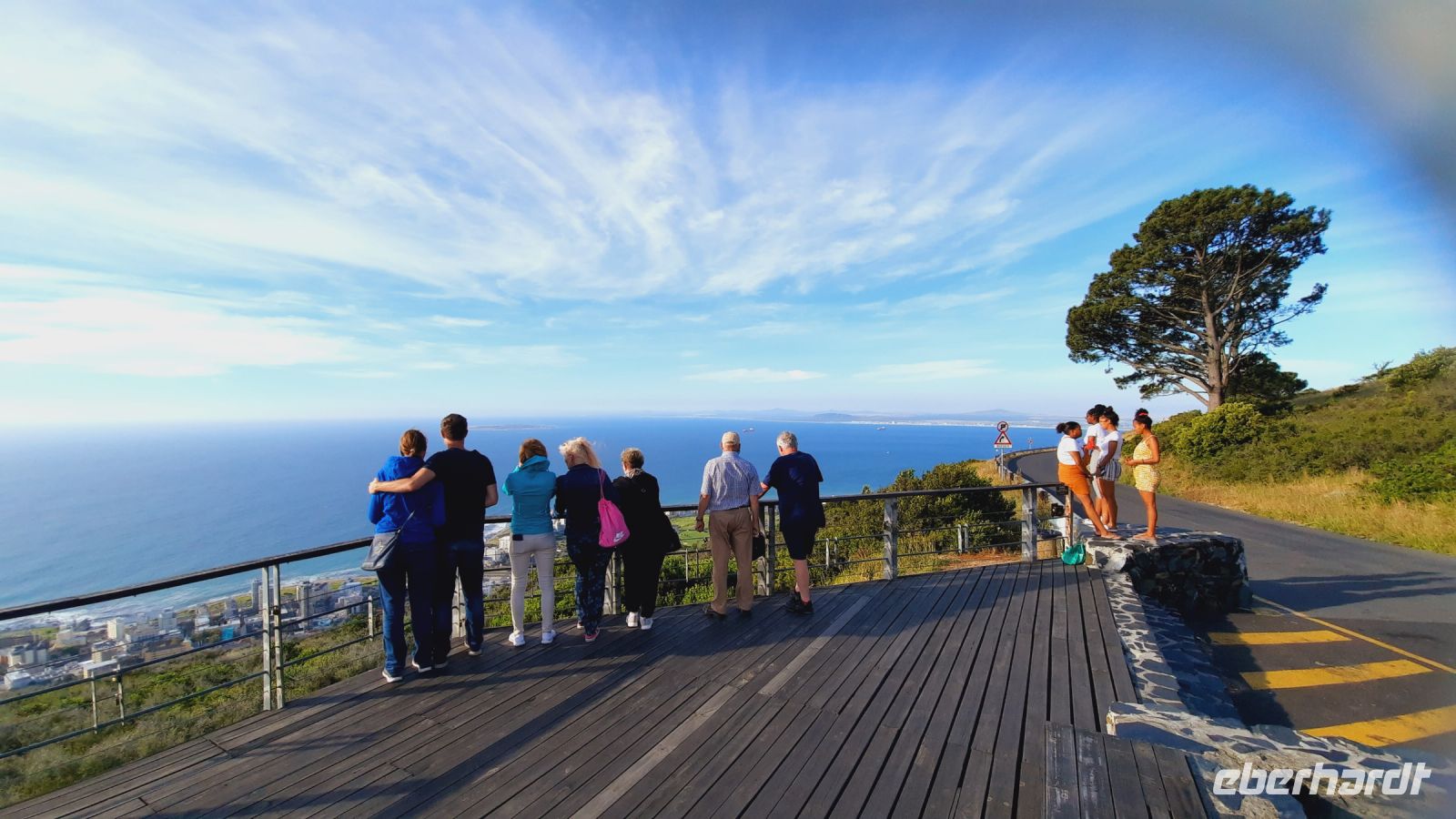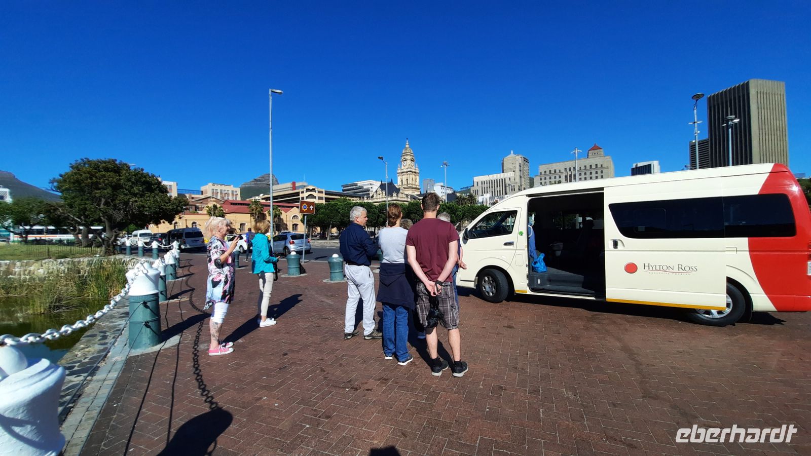 Heute begrüßten wir Thomas als neuen Reiseleiter. Gespannt auf den Tag stiegen wir in unseren Minibus und erkundeten Kapstadt selbst. Thomas zeigte uns die alte Wasserkante, erklärte uns, wie Kapstadt 1652 vom Holländer Jan van Reebeck als Versorgungsstützpunkt gegründet wurde und aufgrund von Gold und Diamanten wohlhabend wurde. Und nun war es endlich soweit: Wir fuhren gemeinsam auf den imposanten Tafelberg hinauf. Das Wetter war perfekt für einen Rundgang, den Thomas mit uns in 1.086 Metern Höhe unternahm. Wir waren so glücklich, dass keine drohende Wolken(Tisch)decke zu sehen war. Wir sahen eine üppige Vegetation und waren erstaunt, dass bis zu 1.400 Pflanzenarten auf dem Tafelberg beheimatet sei sollen. Auch zahlreiche Tierarten, wie Bergziegen, Paviane und Klippschliefer sind hier beheimatet. Wieder konnten wir uns nicht satt sehen und schossen viel zu viele Fotos. Nach unserem Rundgang fuhren wir wieder mit der sich drehenden Gondel nach unten und Richtung Weinregion um Kapstadt, in die Region Stellenbosch. Nun wollten wir aber auch den ansässigen Wein probieren. Dies wurde uns im Weingut Delheim während der Verkostung von fünf Weinen ermöglicht. Thomas führte uns hervorragend durch die Verkostung, denn schließlich kannte er sich als ehemaliger Koch gut aus. Wer wollte, konnte sich für zu Hause auch eine Flasche oder einen besonderen Korkenzieher mitnehmen.