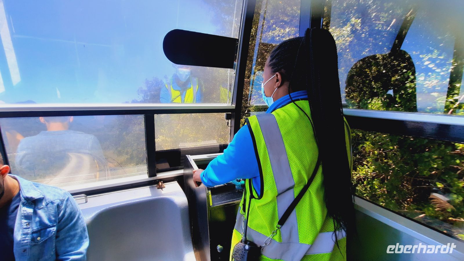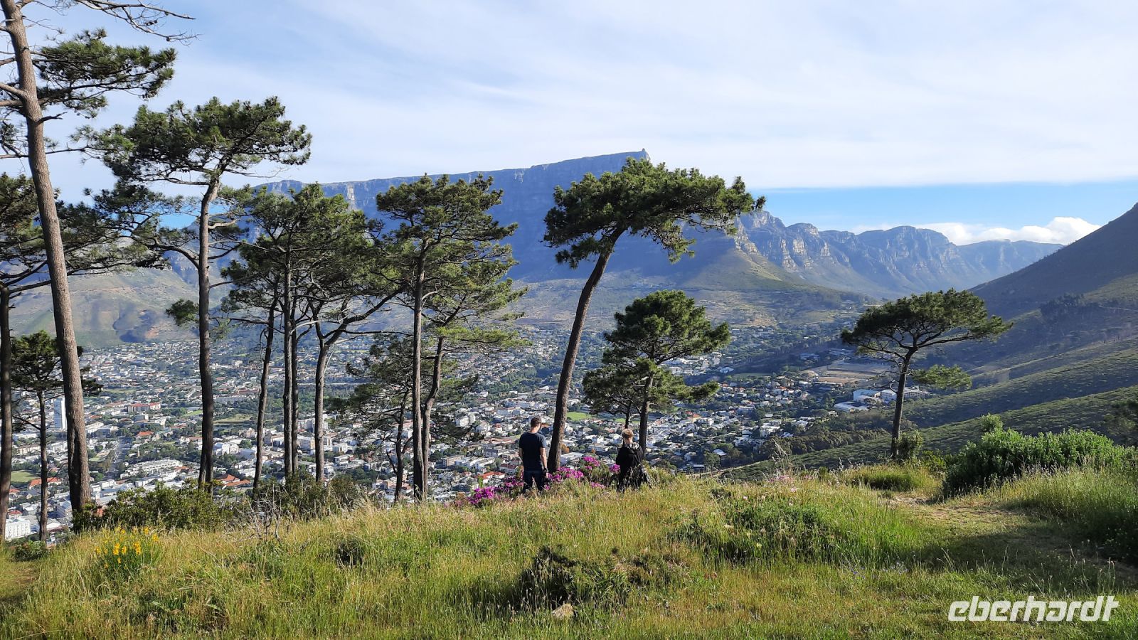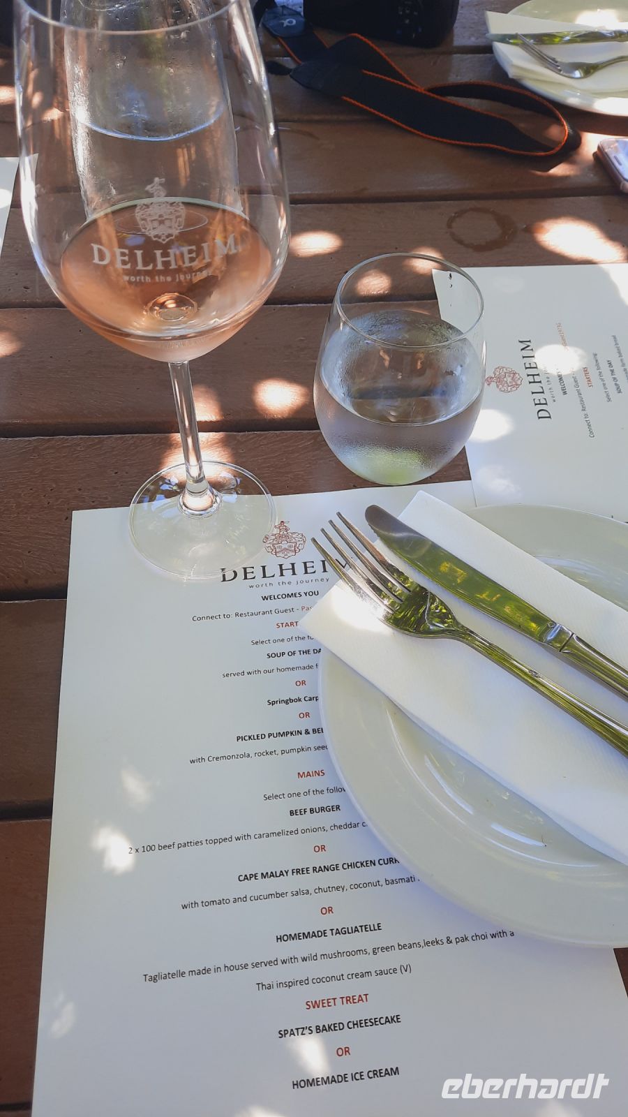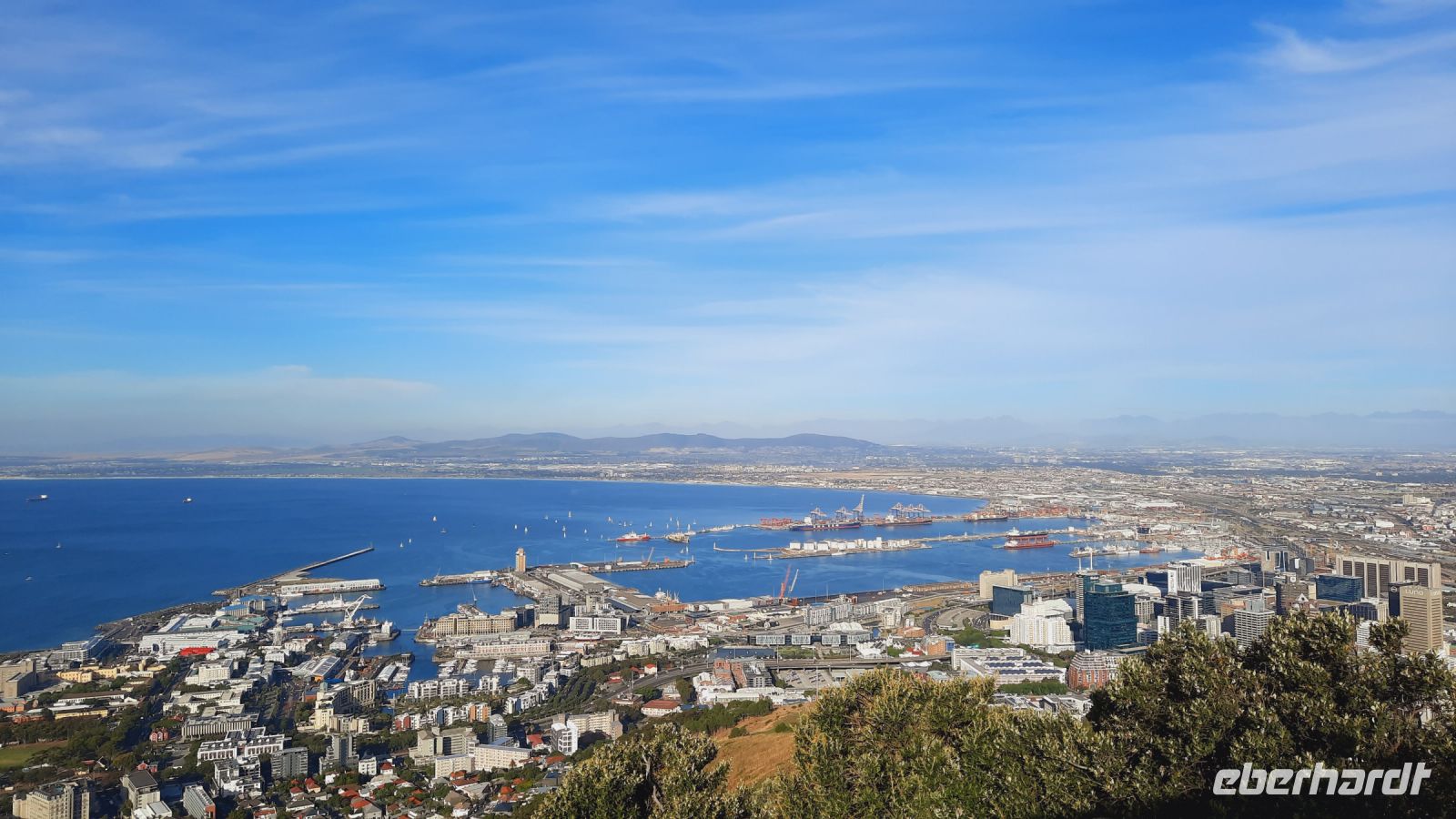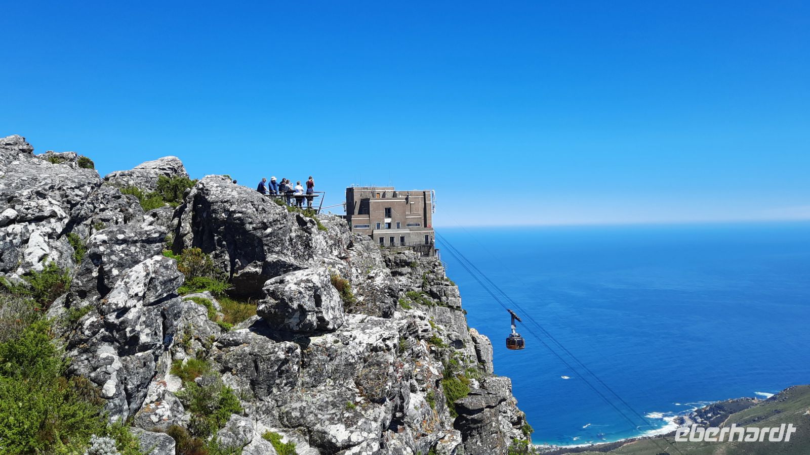 Heute begrüßten wir Thomas als neuen Reiseleiter. Gespannt auf den Tag stiegen wir in unseren Minibus und erkundeten Kapstadt selbst. Thomas zeigte uns die alte Wasserkante, erklärte uns, wie Kapstadt 1652 vom Holländer Jan van Reebeck als Versorgungsstützpunkt gegründet wurde und aufgrund von Gold und Diamanten wohlhabend wurde. Und nun war es endlich soweit: Wir fuhren gemeinsam auf den imposanten Tafelberg hinauf. Das Wetter war perfekt für einen Rundgang, den Thomas mit uns in 1.086 Metern Höhe unternahm. Wir waren so glücklich, dass keine drohende Wolken(Tisch)decke zu sehen war. Wir sahen eine üppige Vegetation und waren erstaunt, dass bis zu 1.400 Pflanzenarten auf dem Tafelberg beheimatet sei sollen. Auch zahlreiche Tierarten, wie Bergziegen, Paviane und Klippschliefer sind hier beheimatet. Wieder konnten wir uns nicht satt sehen und schossen viel zu viele Fotos. Nach unserem Rundgang fuhren wir wieder mit der sich drehenden Gondel nach unten und Richtung Weinregion um Kapstadt, in die Region Stellenbosch. Nun wollten wir aber auch den ansässigen Wein probieren. Dies wurde uns im Weingut Delheim während der Verkostung von fünf Weinen ermöglicht. Thomas führte uns hervorragend durch die Verkostung, denn schließlich kannte er sich als ehemaliger Koch gut aus. Wer wollte, konnte sich für zu Hause auch eine Flasche oder einen besonderen Korkenzieher mitnehmen.