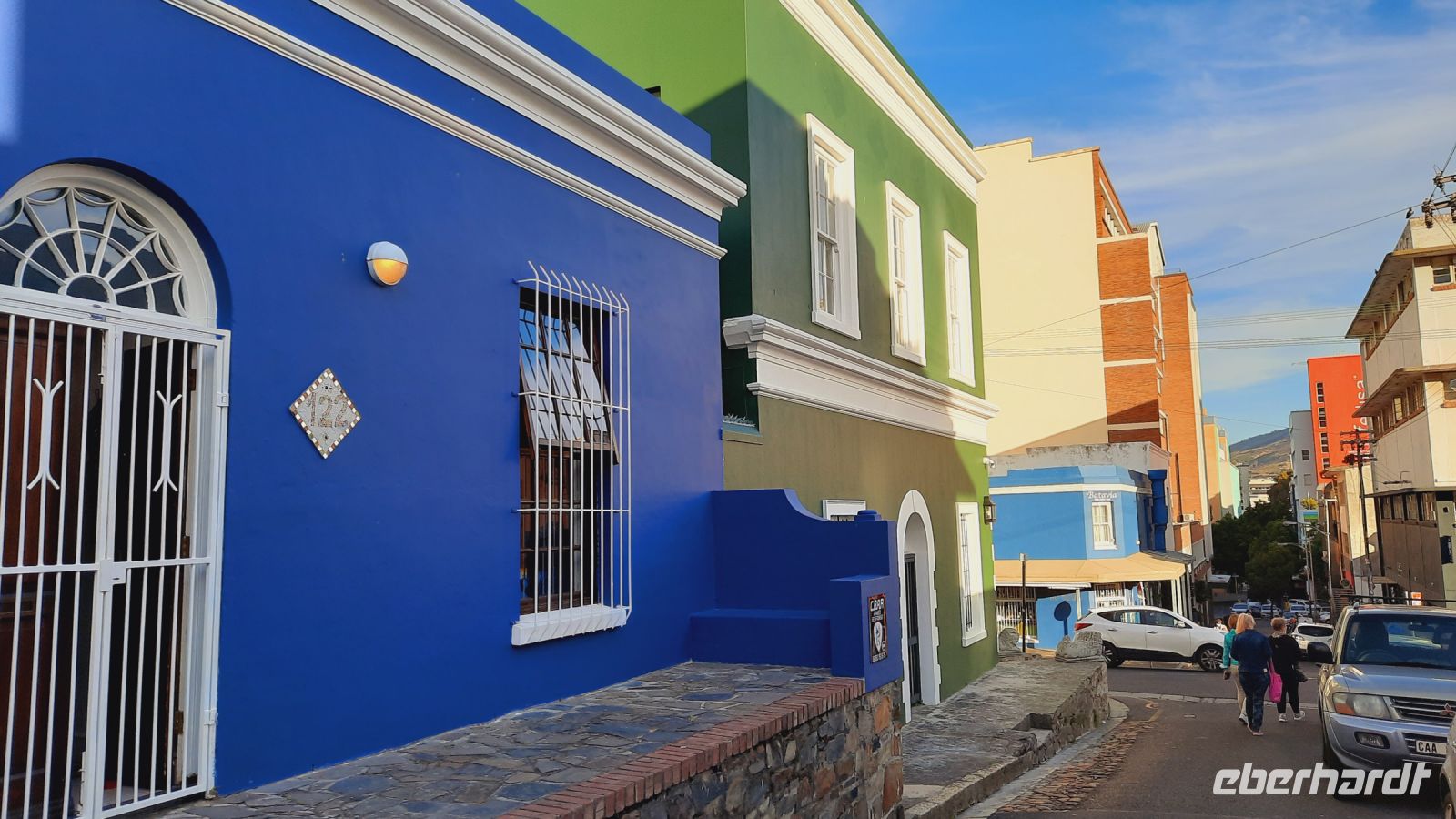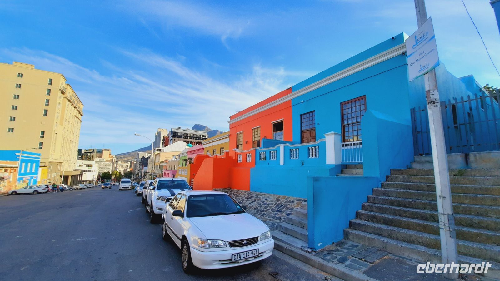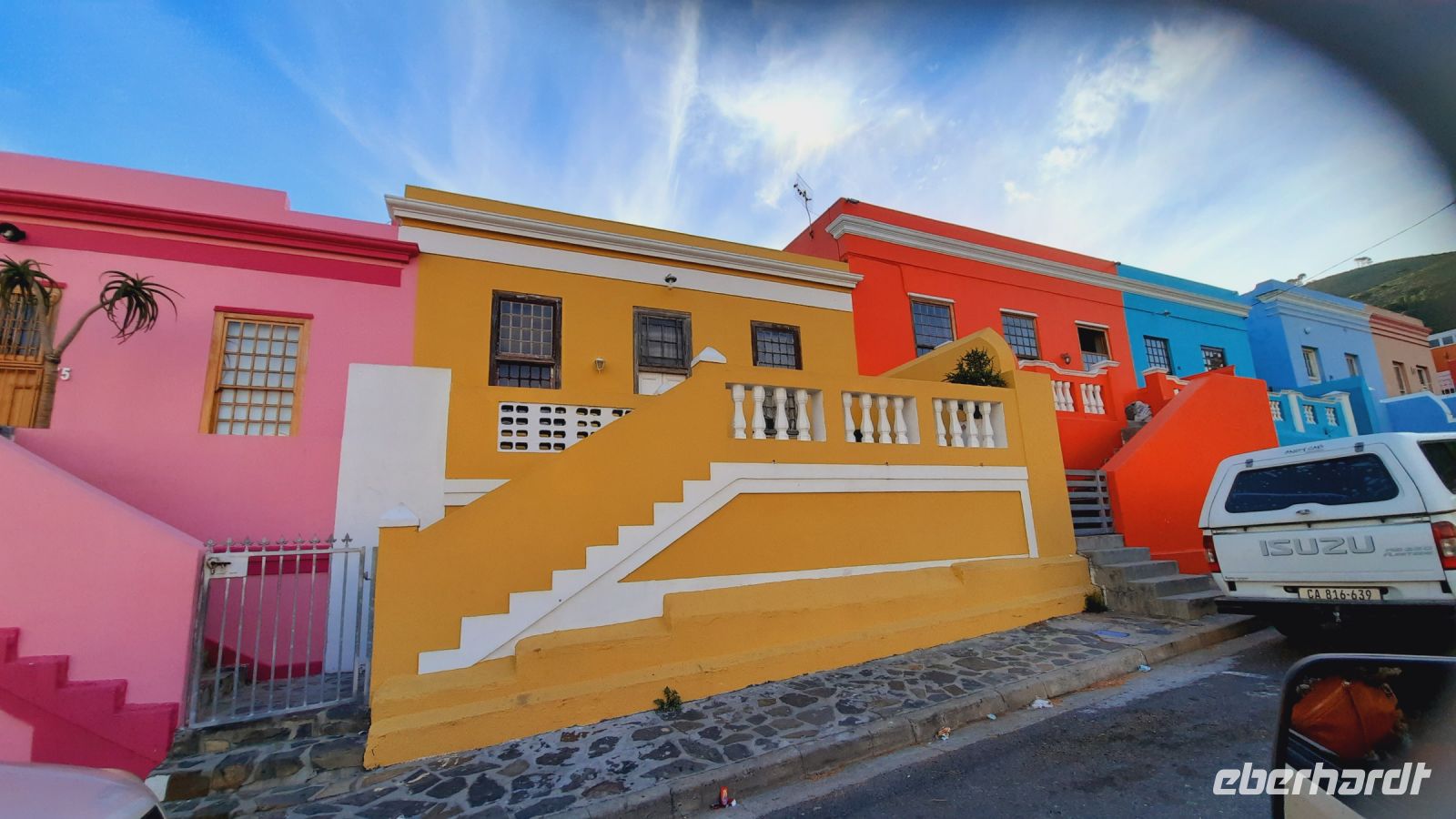 Wieder zurück in Kapstadt wollten wir den berühmten Tafelberg besuchen, doch die Corona-Öffnungszeiten machten uns einen Strich durch die Rechnung. Somit besuchten wir den benachbarten Signal Hill, von welchem man einen unvergleichlichen Blick auf den Hausberg Kapstadts bewundern konnte. Wir beobachteten frei umherlaufende Perlhühner und blickten bis zur Gefängnisinsel von Nelson Mandela. Ein Rundgang im buntesten Stadtteil Kapstadts, im Bo-Kaap Viertel, rundete den Tag ab. Im von Muslimen geprägten Viertel sind fast alle kapholländischen und georgianischen Doppelhäuser im Originalzustand und zählen somit zu den ältesten in ganz Kapstadt. Einer Legende nach, sollen die Häuser ursprünglich weiß gewesen sein, während diese an die Malaien vermietet wurden. Als diese Regel aufgehoben wurde und die Häuser nebst Grundstück gekauft werden durften, malten Sklaven ihre Häuser zum Ausdruck der erlangten Freiheit bunt an.