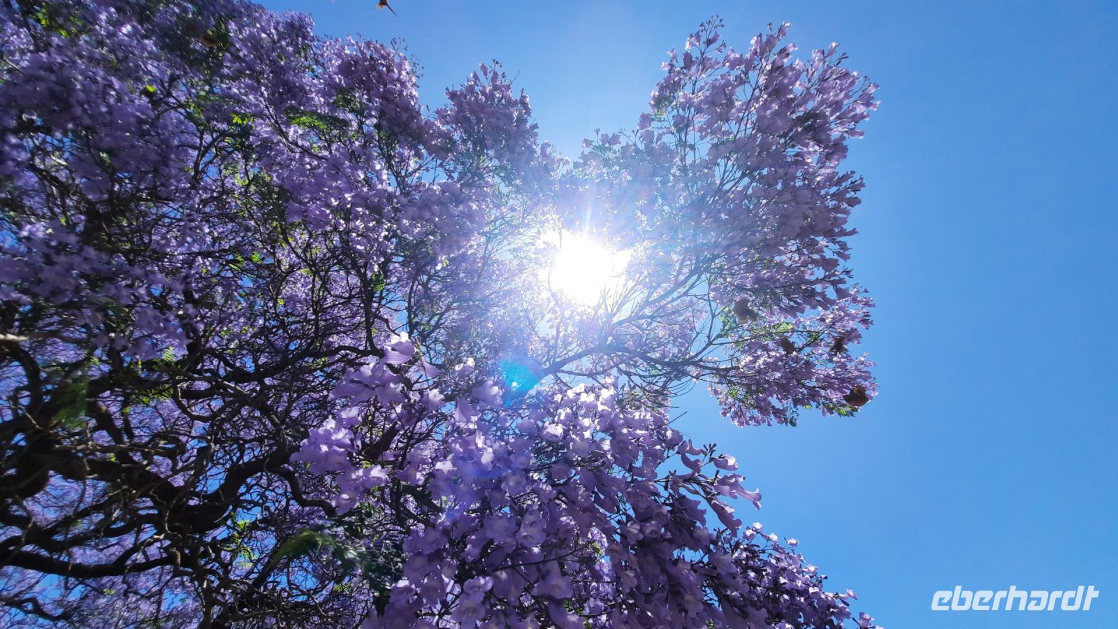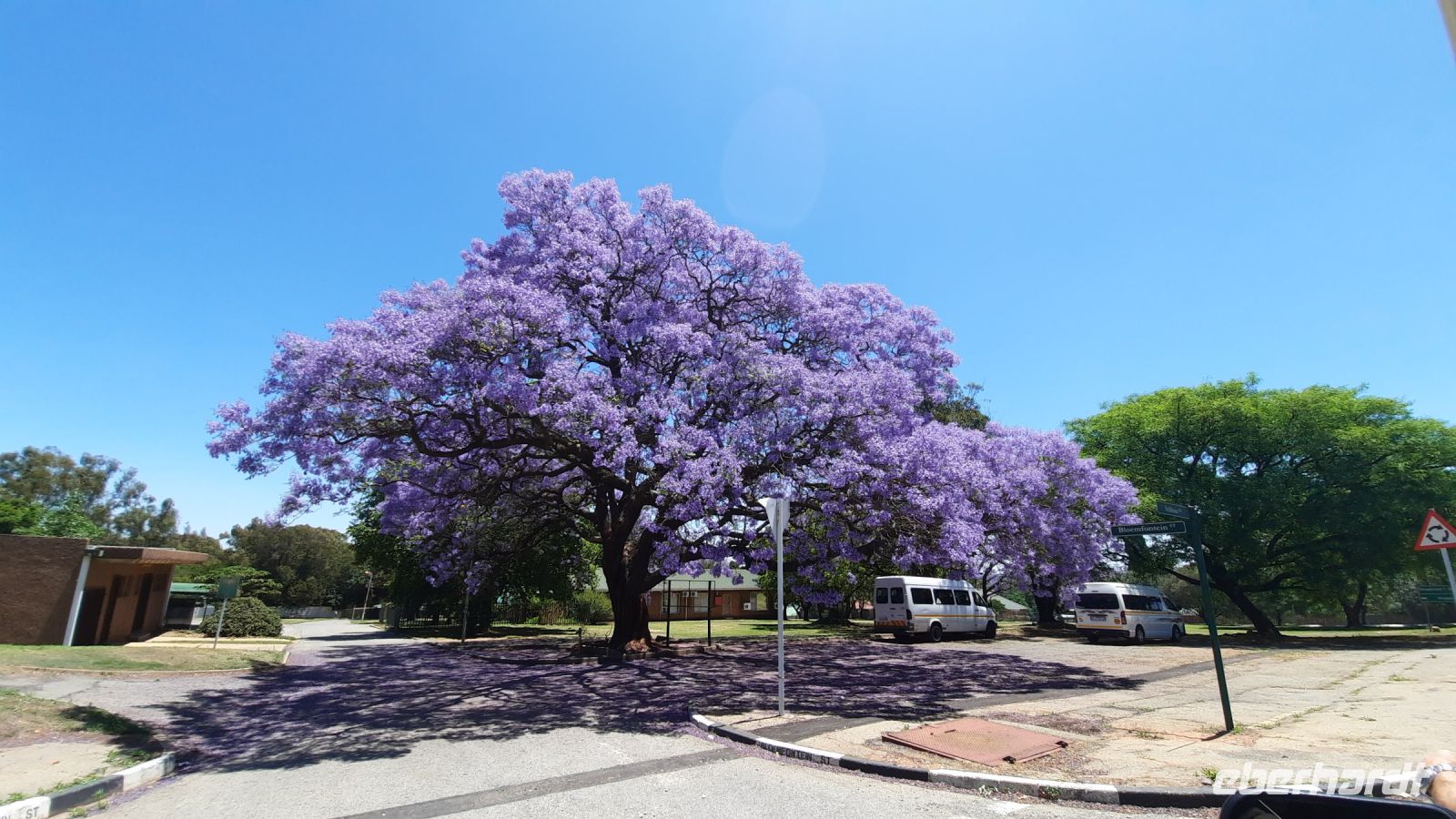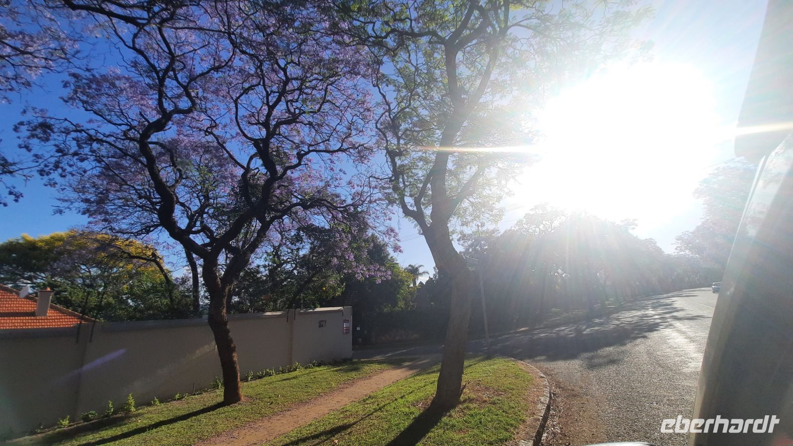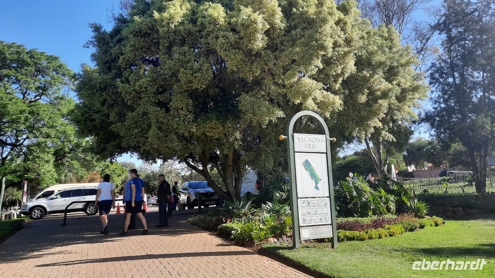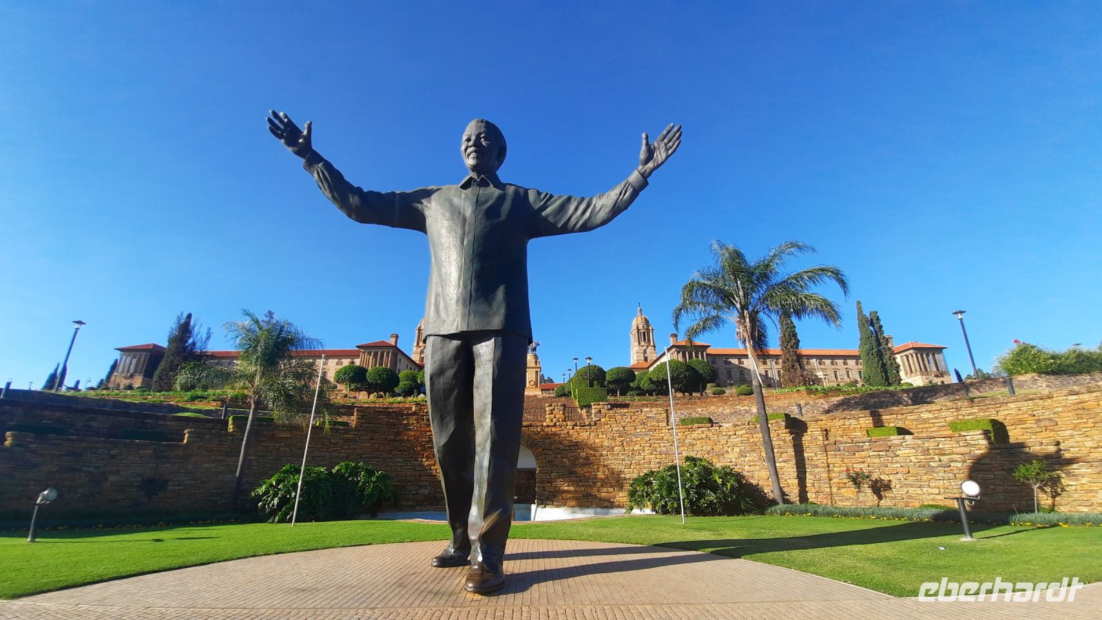 In Johannesburg angekommen, wurden wir herzlich von unserem Reiseleiter Frans empfangen. Franz ist gebürtiger Holländer und lebt bereits seit über 50 Jahren in Südafrika. Wir verließen Johannesburg und fuhren Richtung Hauptstadt Pretoria. Unterwegs passierten wir ein massives Denkmal aus Granit, welches 1949 zum Gedenken an den Grossen Treck und die Schlacht am Bloodriver errichtet wurde. Als wir Pretoria erreichten, staunten wir über die zahlreich violett blühenden Jacaranda-Bäume. Ursprünglich sind diese Bäume nicht in Südafrika beheimatet. Die ersten beiden in Pretoria, welche aus Brasilien importiert wurden, wurden durch JD Celliers 1888 in der Stadt gepflanzt und sind seither Teil der Kultur der Stadt geworden. Pretoria wird auch liebevoll die Jacaranda City genannt. Wir durchfuhren weitere Straßen die voller violetter Blütenpracht gezeichnet waren. Bei einer Erfischungspause im Magnolia Dell Park konnten wir uns das erste Mal mit der einheimischen Währung Rand bekannt machen und fuhren anschließend gestärkt weiter. Wir hielten an den Union Buildings, welche Sitz der südafrikanischen Regierung sind und in denen sich außerdem die Amtsräume des Präsidenten der Republik Südafrika befinden. Der neoklassizistische Bau befindet sich seit 1910 auf einem Hügel über der Stadt und ist nicht öffentlich zugänglich. Man kann aber einen grandiosen Blick über die Stadt, bei guter Sicht sogar bis weithin zum Vortekker-Denkmal, genießen. Wir spazierten durch die Parkanlage der Garden of Remembrance und stoppten an einer riesigen Mandela-Statue. Nelson Mandela selbst wurde hier im Mai 1994 zum ersten schwarzen Präsident der Republik Südafrika vereidigt. Nach unserem Rundgang fuhren wir zum Hotel, checkten ein und trafen uns nach Dämmerung auf der hübschen Dachterrasse, um das erste gemeinsame Abendessen in Südafrika zu genießen. Wir stießen mit Springbokkie (Minzlikör & Amarula) auf eine schöne Zeit an und fielen danach erschöpft in die Federn.