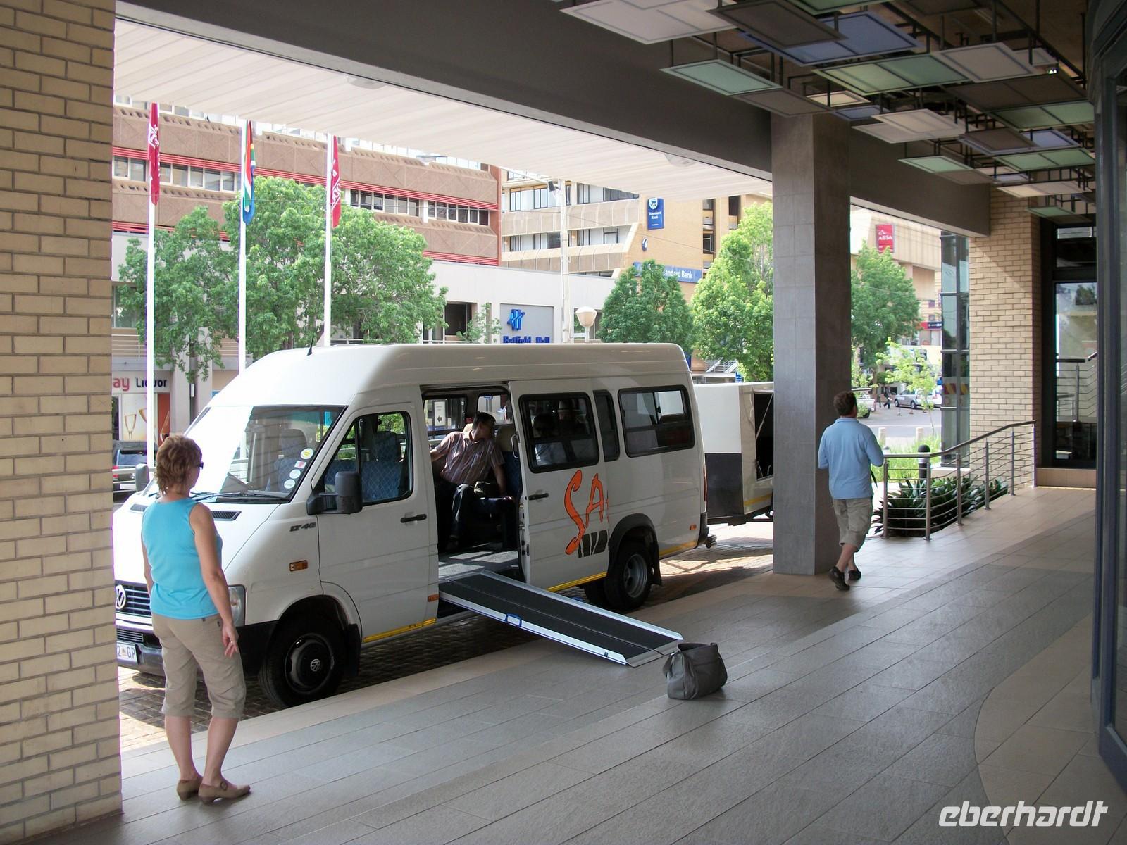 Leidlich ausgeruht verlassen wir am nächsten Morgen in Johannesburg das Flugzeug - unsere Rollstühle stehen schon bereit. Nun können wir den Flughafen mit unserem Gepäck verlassen. Vor dem Terminal erwartet uns schon Helmo, unser südafrikanischer Reiseleiter, die Rollstühle werden nebst dem Gepäck in einen Anhänger verstaut - los geht’s Richtung Pretoria.