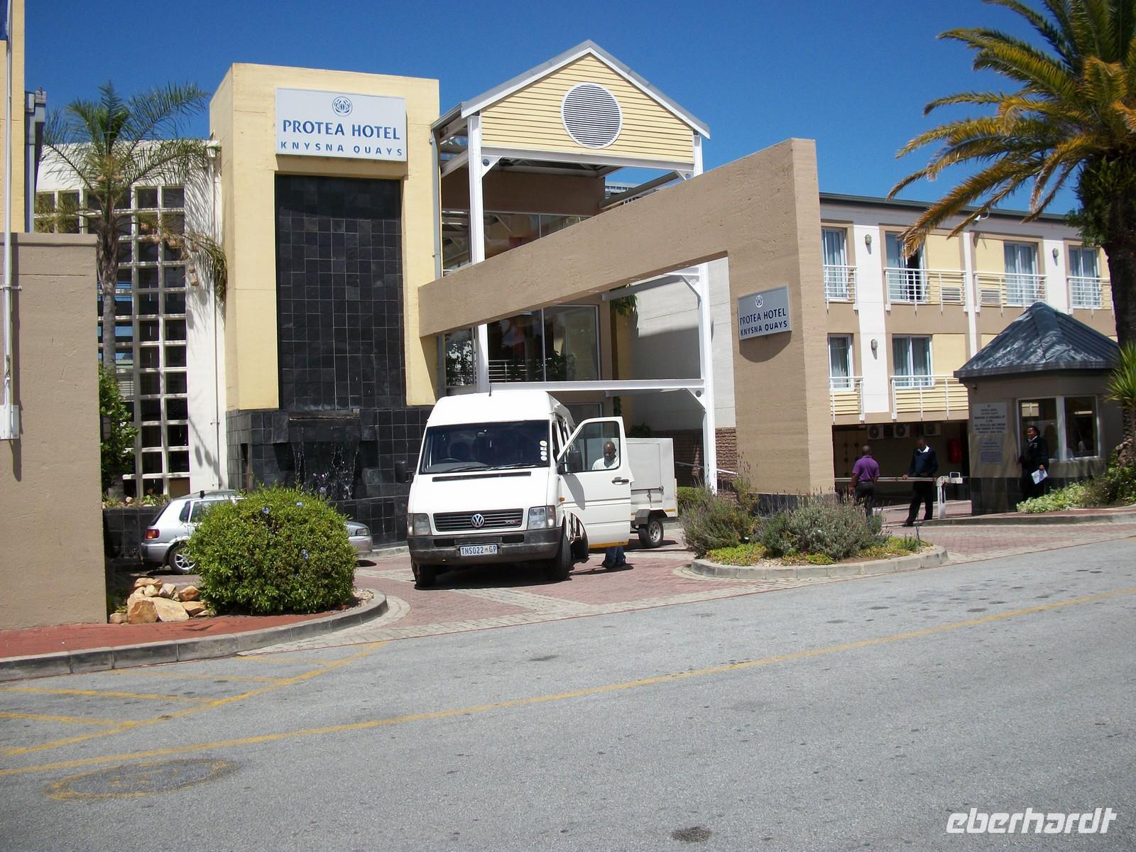 Die hübsche Hafenpromenade, die "Knysna Waterfront", bildet den Mittelpunkt der gleichnamigen Stadt; rund um den Hafen erbaut, befindet sich hier in idealer Lage das Knysna Quay Hotel in dem wir nun Quartier beziehen. Die Zimmer sind hübsch mit riesigen Betten, schönen Blick zum Hafen - nur die kleine Stufe am Zugang zu den „rollstuhlfreundlichen“ Zimmern erschwert den Zugang etwas.