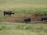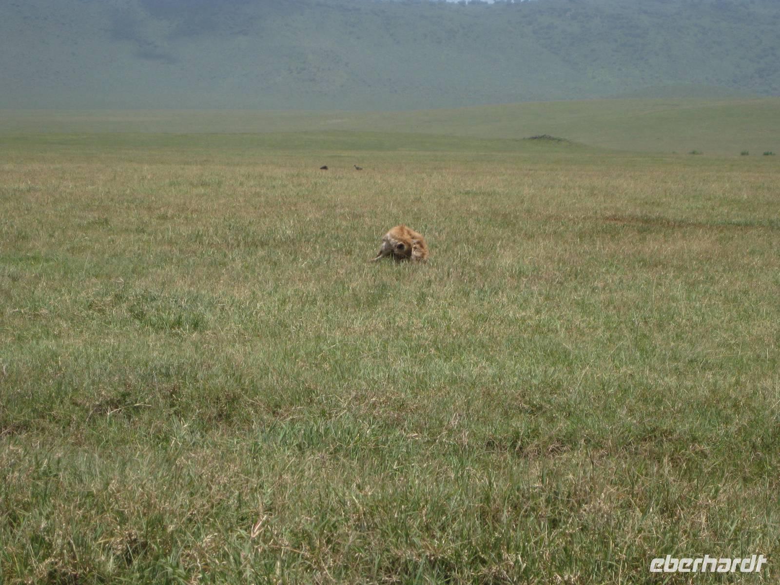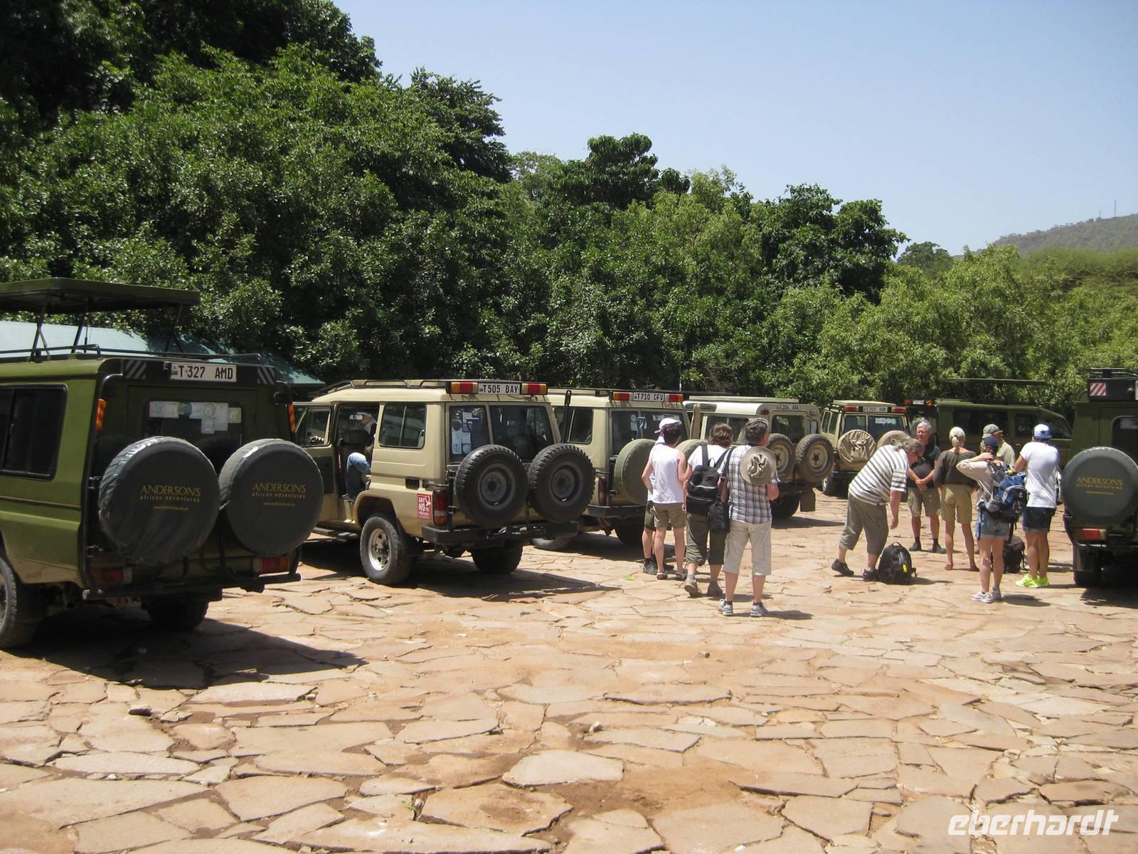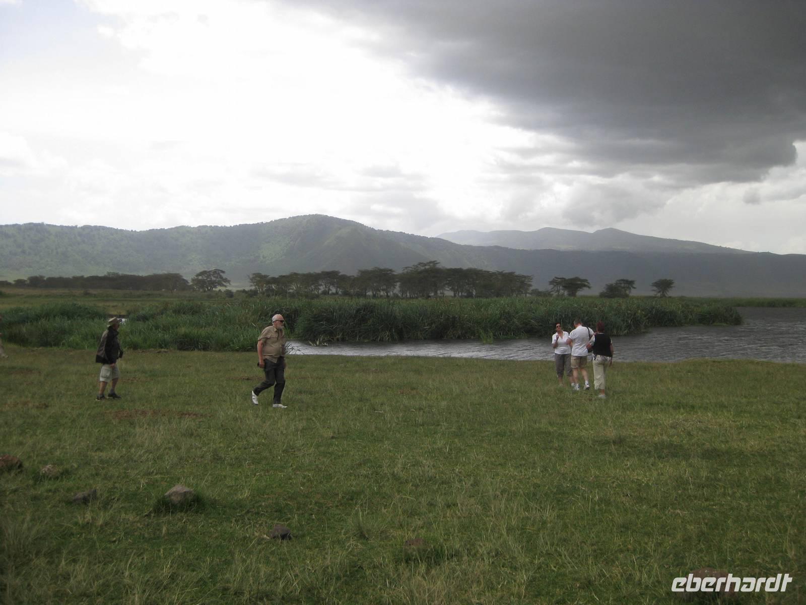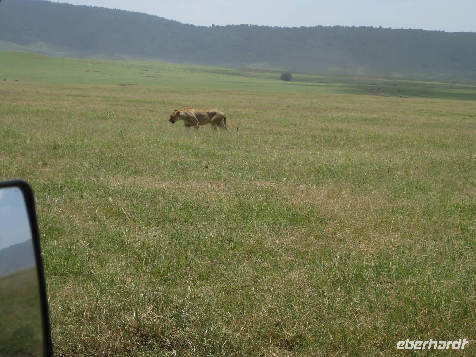 Aber beindruckend ist auch, dass zwischen den wilden Tieren die Maasai ganz normal ihre Rinder- und Ziegenherden hüten. Im Gegensatz dazu dürfen wir unsere Jeeps nicht verlassen. Wir sind in einem einmaligen natürlichen Weltwunder. Wir staunen und sehen: Schakale, Hyänen, 5 Löwen ganz nah auf dem Weg zum Fluss, Störche, 3 Nashörner, Gnus, Zebras, Kronenkraniche, Flusspferde, andere Storcharten, Trappen, verschiedene Antilopenarten, Grants Gazelle, Sekretär, Elefanten....Gegen 13.30 Uhr Picknick aus der Lunchboxen am Hippopool. Es ist ziemlich voll: Mehr als 60 Fahrzeuge parken am See. Da wir nicht wollen, dass die Greifvögel unser Essen entführen, essen wir in den Jeeps. Gegen 16.30 Ausfahrt aus dem Krater, nachdem wir noch zuvor Überreste eines alten deutschen Hauses im Krater gesehen hatten. Alle sind total begeistert von der Natur und überwältigt von den Tieren.