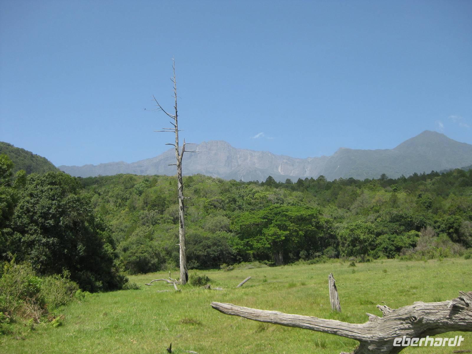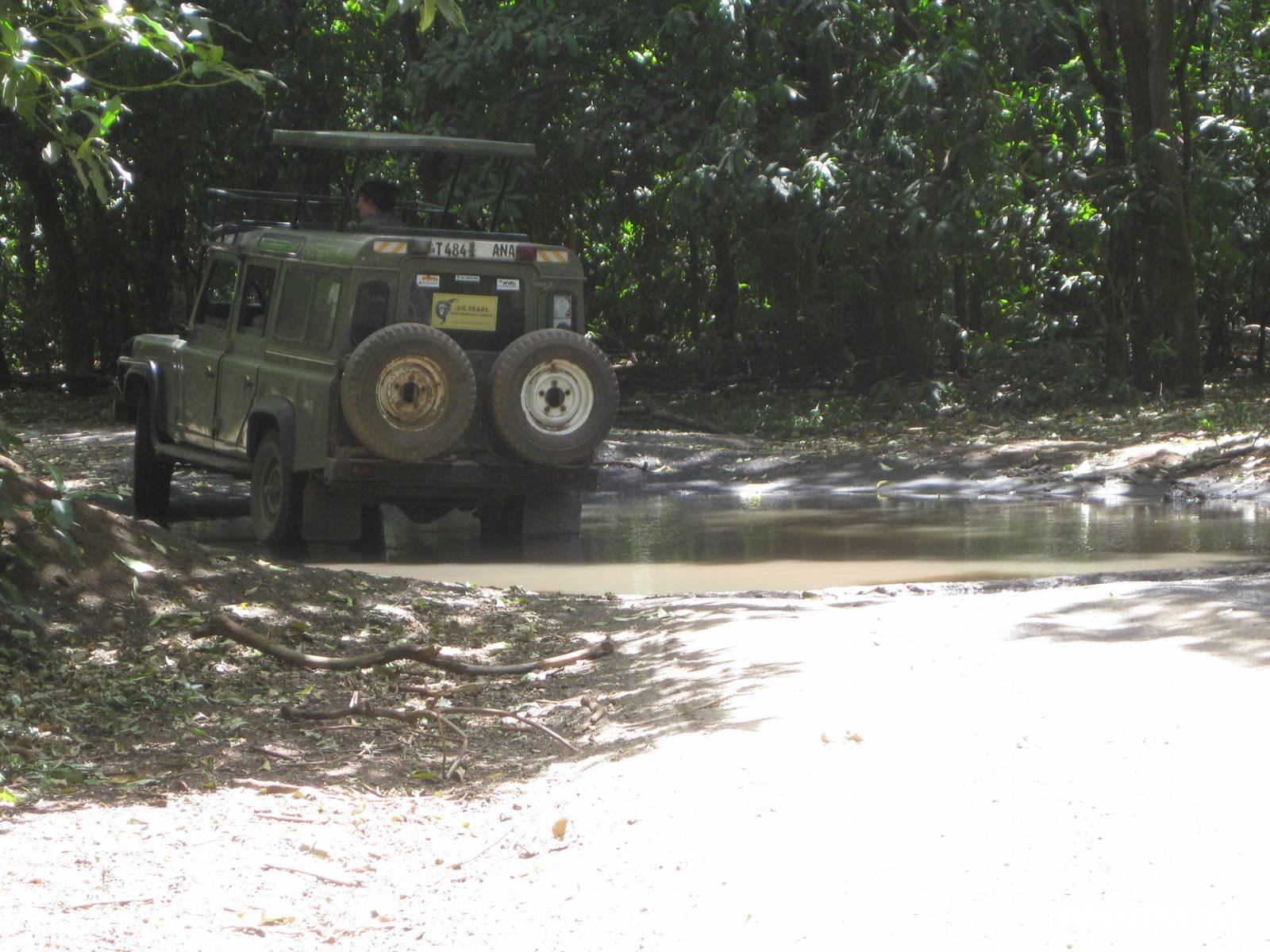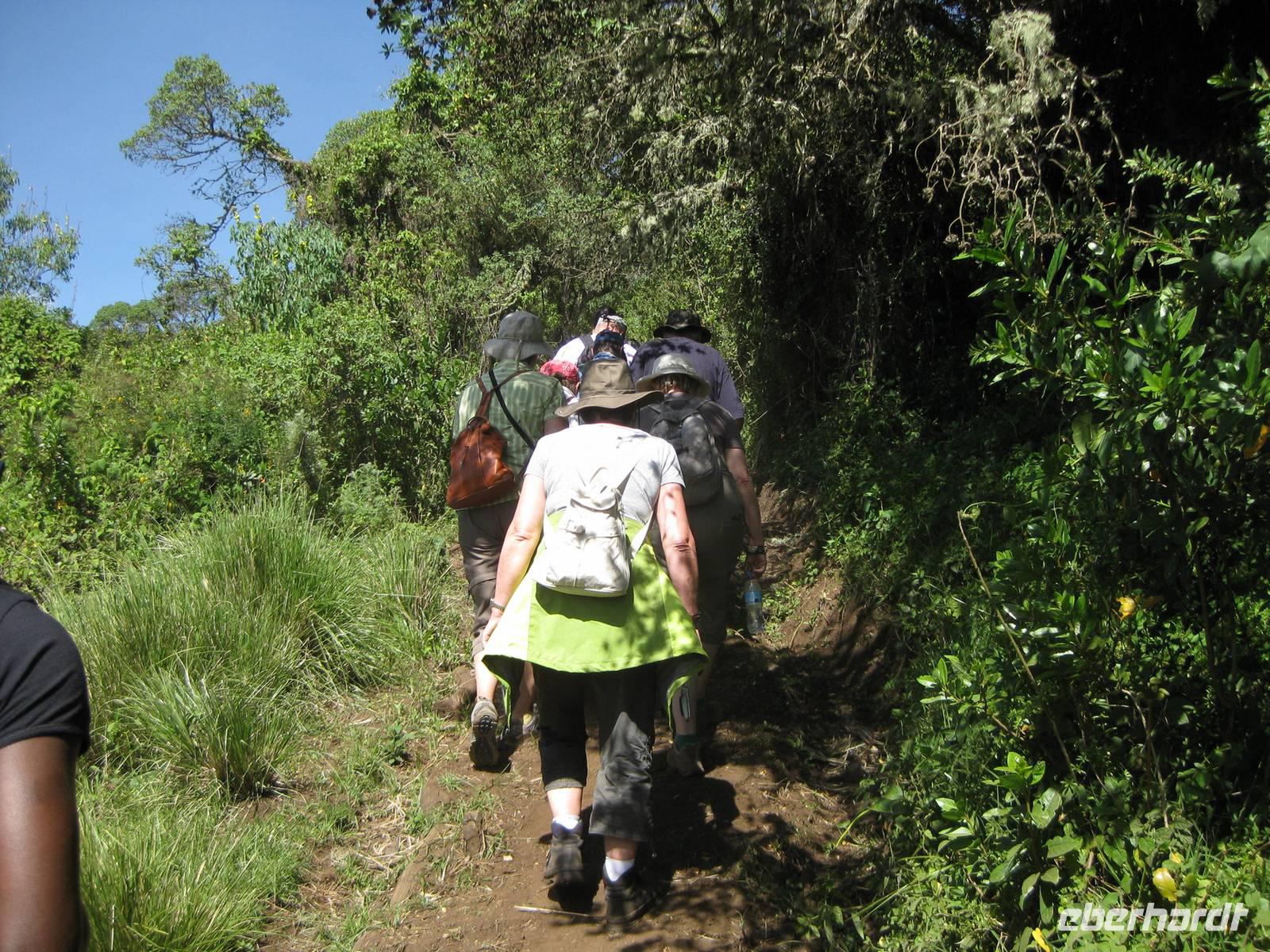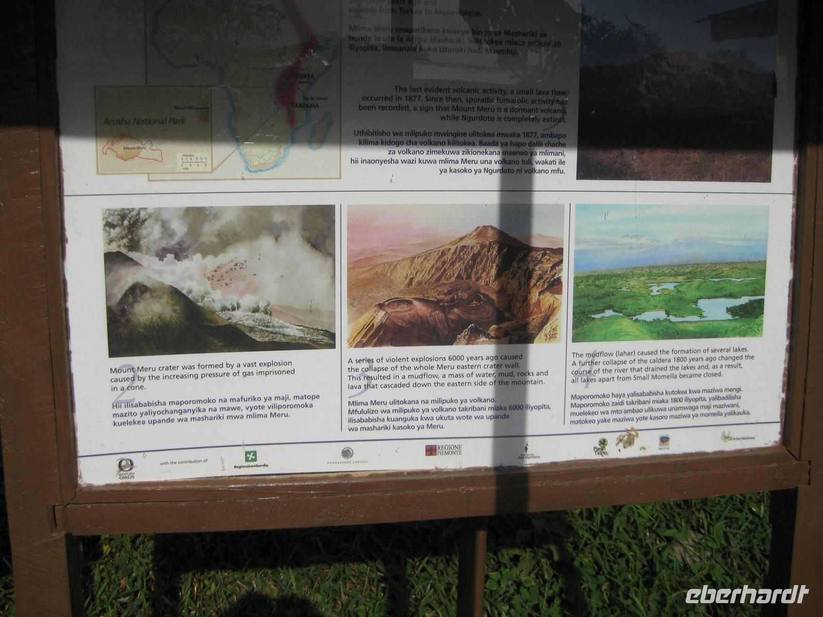 Nach sehr gutem Frühstück ist 8.30 Uhr Abfahrt mit Hans, unseren 2 Fahrern und den 2 Jeeps. Erst über asphaltierte Straßen, dann über Schotterpiste geht es in den Arusha Nationalpark am Fuße des gewaltigen Mount Meru, immerhin auch 4566 m hoch. Am Eingang des Nationalparks haben wir endlich den Kilimanjaro, auch Kibo genannt, im Blick. Wenn auch in den Wolken, so ist doch eindeutig der Schnee auf dem Kibo sichtbar. Die Entfernung per Luftlinie beträgt vielleicht 45 km. Alle sind sehr zufrieden.