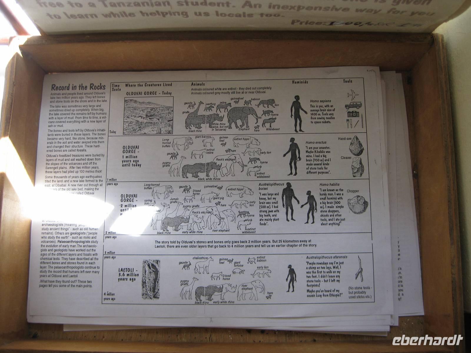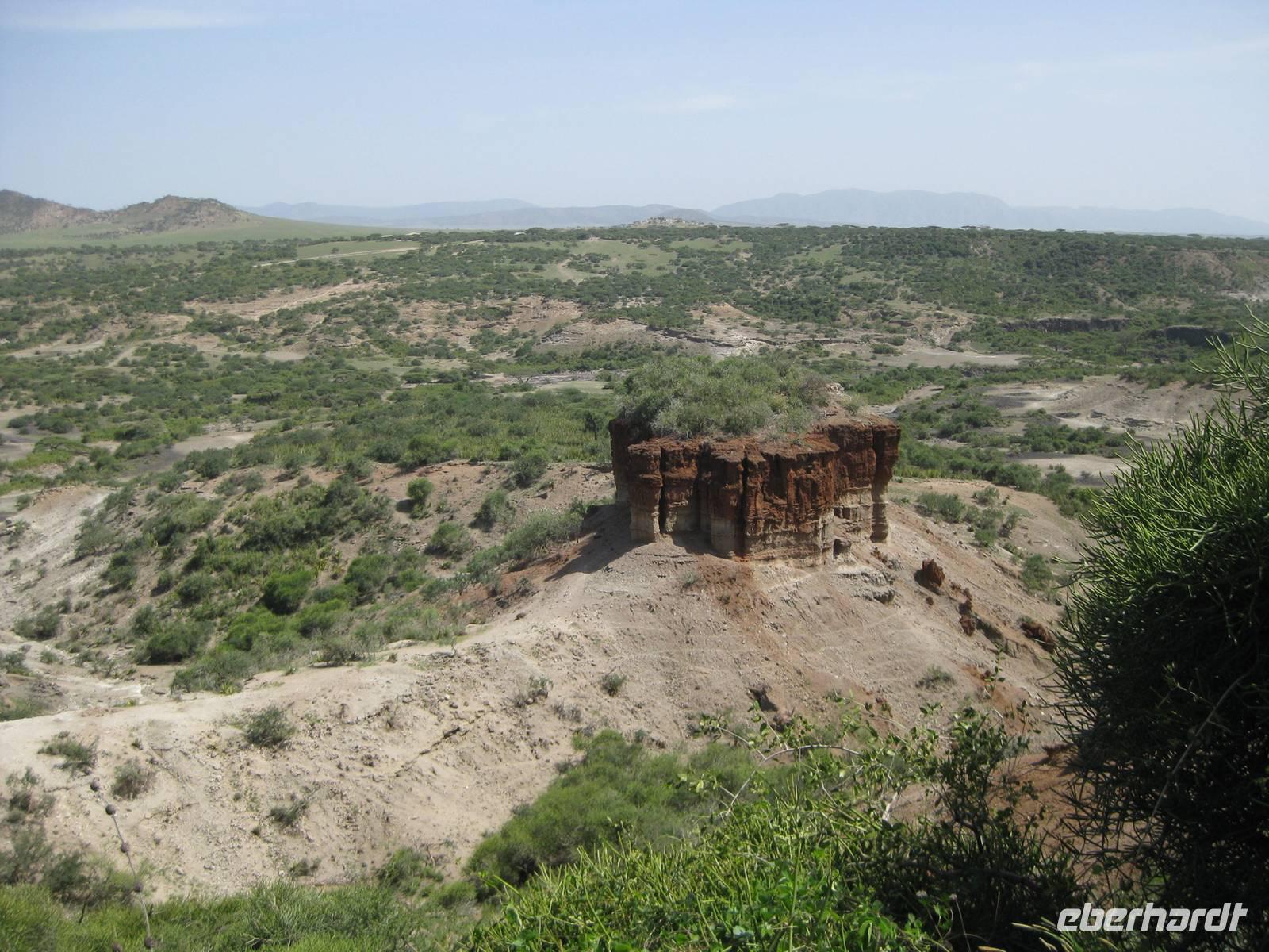 von der Kraterhochebene geht es dann hinunter in die Serengeti. Auf dem riesigen Flächen rechts und links sehen wir immer wieder Giraffen, Zebras, einzelne Gnus und Kamele. Nach gut einer Stunde Fahrt sind wir in der Oldupai Schlucht, stehen am Talrand und betrachten eine Stätte der Wiege der Menschheit. Die Schlucht bildet das südliche Ende einer prähistorischen Linie die bis nach Äthiopien reicht.