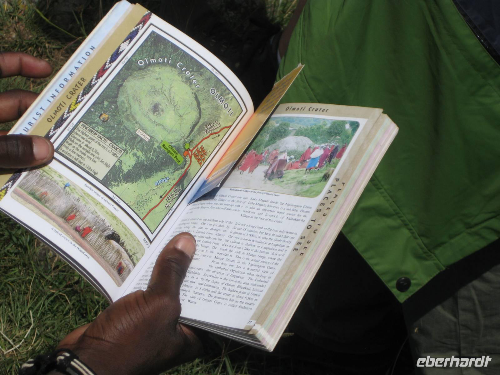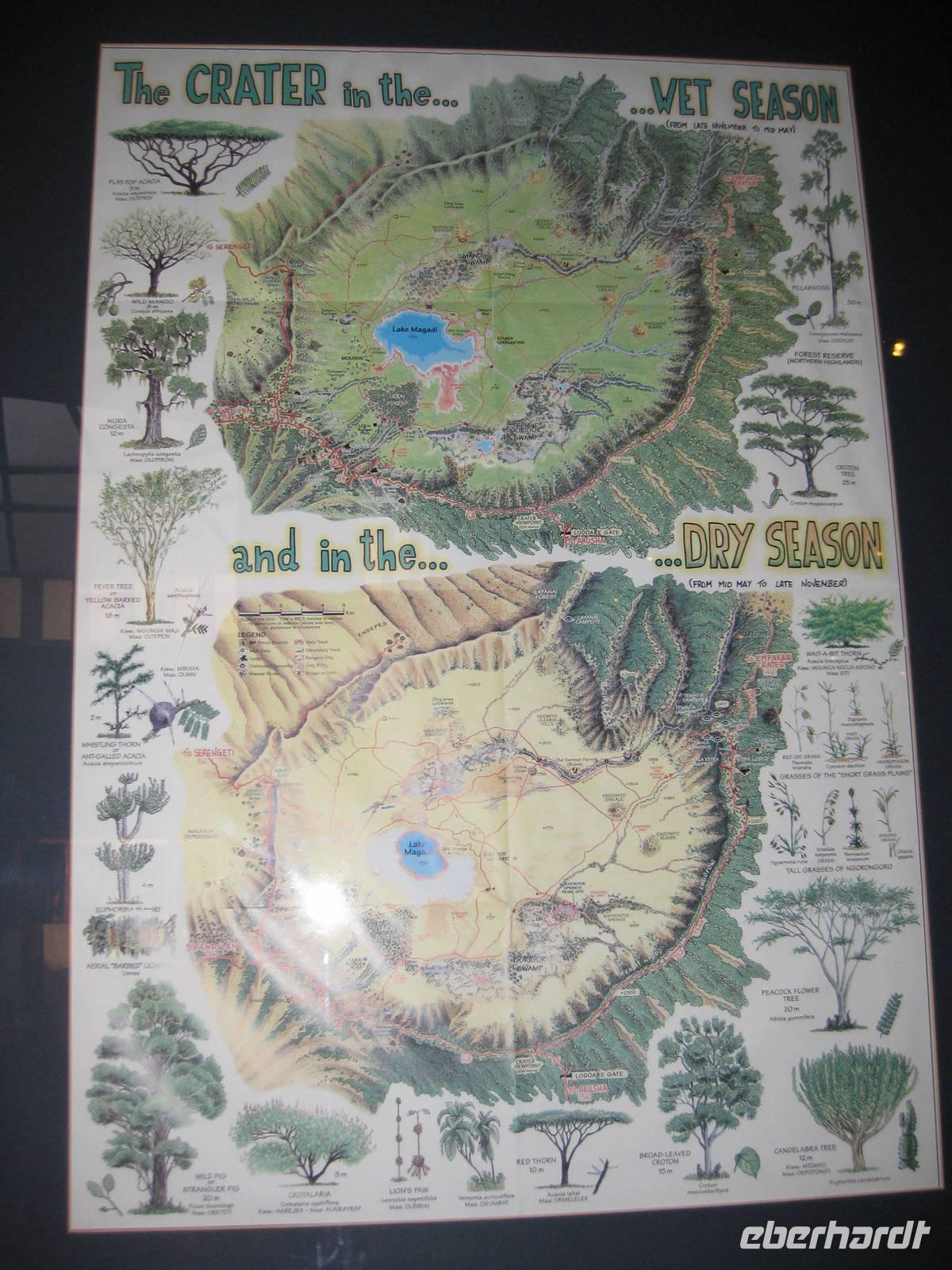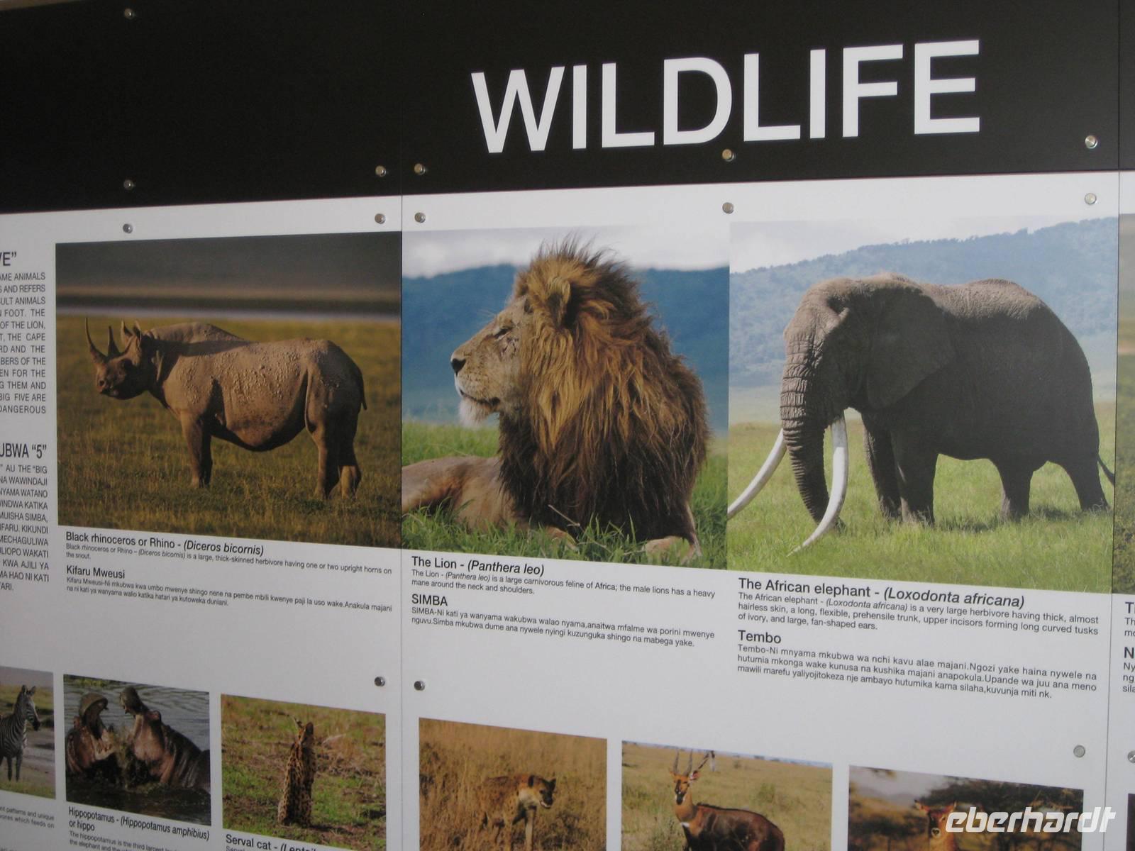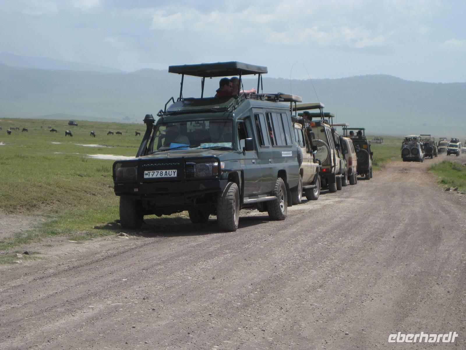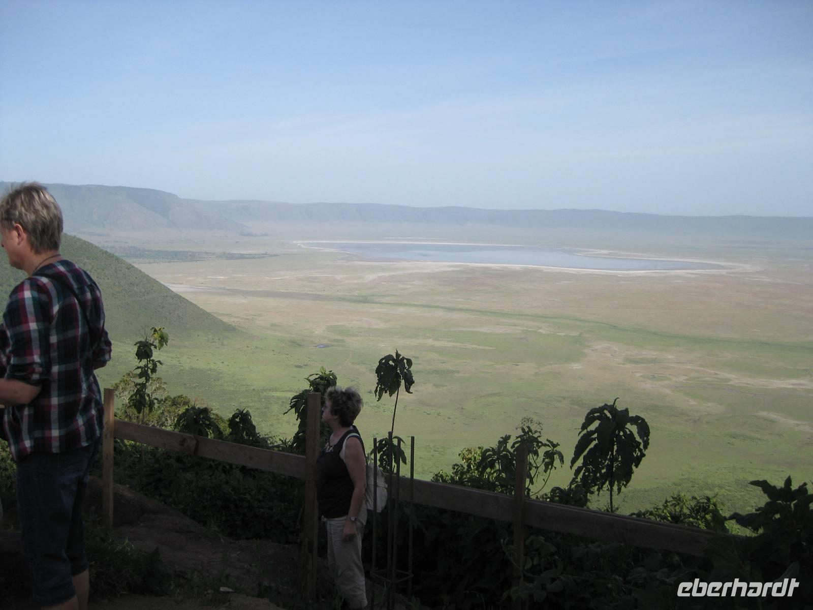 8.00 Uhr Abfahrt in Richtung Ngorongoro Krater Nationalpark. Die Lunch-Boxen werden durch jeden einzelnen selbst zusammengestellt, dies gefällt uns allen sehr gut, auch wenn es etwas Zeit kostet. Schon bald sind wir am Eingang zum Ngogrongoro Nationalpark. Unsere Fahrer bezahlen die recht stolzen Eintritte in US Dollar. Wir anderen nutzen die Zeit zum Umsehen im Info-Center. Im Besucherzentrum ist der Krater in seinem riesigen Ausmaß mit allen Nebenkratern, wie z.B. Olmoti, noch einmal übersichtlich als Modell dargestellt. 25.000 bis 30.000 Tiere leben auf dem Kratergrund, der vor 10-15 Millionen Jahren entstand und der größte nicht mit Wasser gefüllte Krater der Welt ist (Gebiet ungefähr halb so groß wie der Bodensee). Endlich steigen wir aus unseren Jeeps , stehen am Kraterrand und schauen fasziniert in den Krater und versuchen erste Tierherden zu erkennen.
