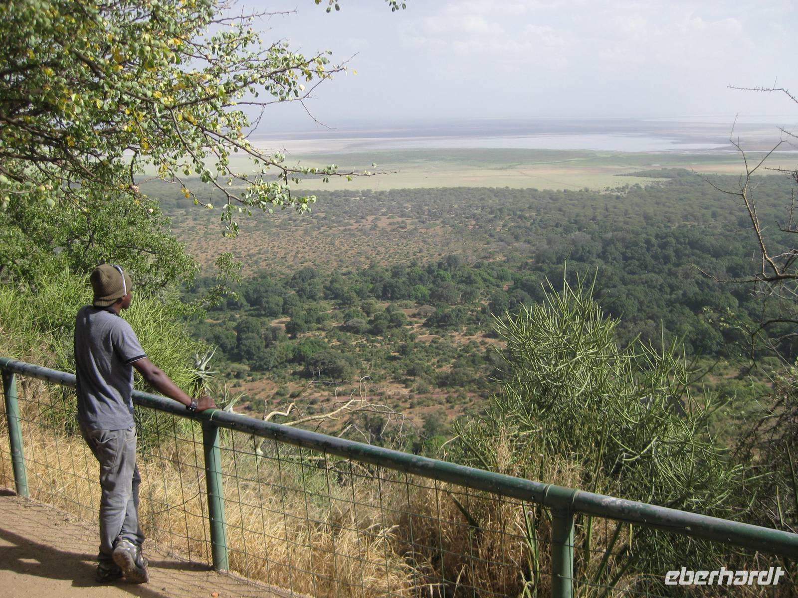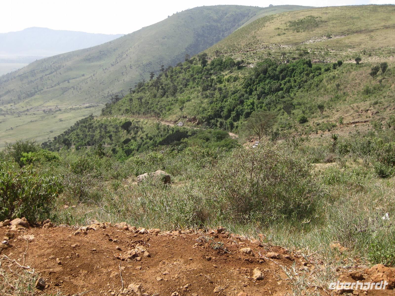 Gleich neben uns befindet sich ein Gedenkstein für verunglückte Erforscher des Kraters, u.a. für Michael Grzimek. Noch einmal machen wir kurzen Toilettenstopp, unsere Fahrer zeigen noch einmal ihre Eintrittskarten und dann fahren wir hinab in den weltberühmten und einmaligen Ngorongoro-Krater mit seiner riesigen Tiervielfalt.