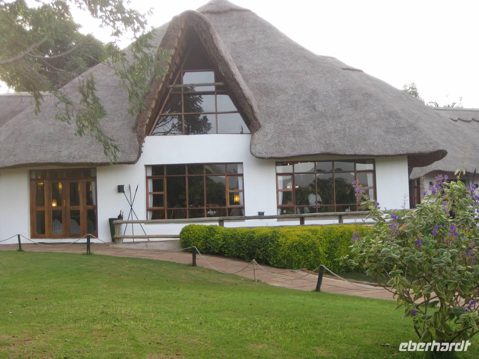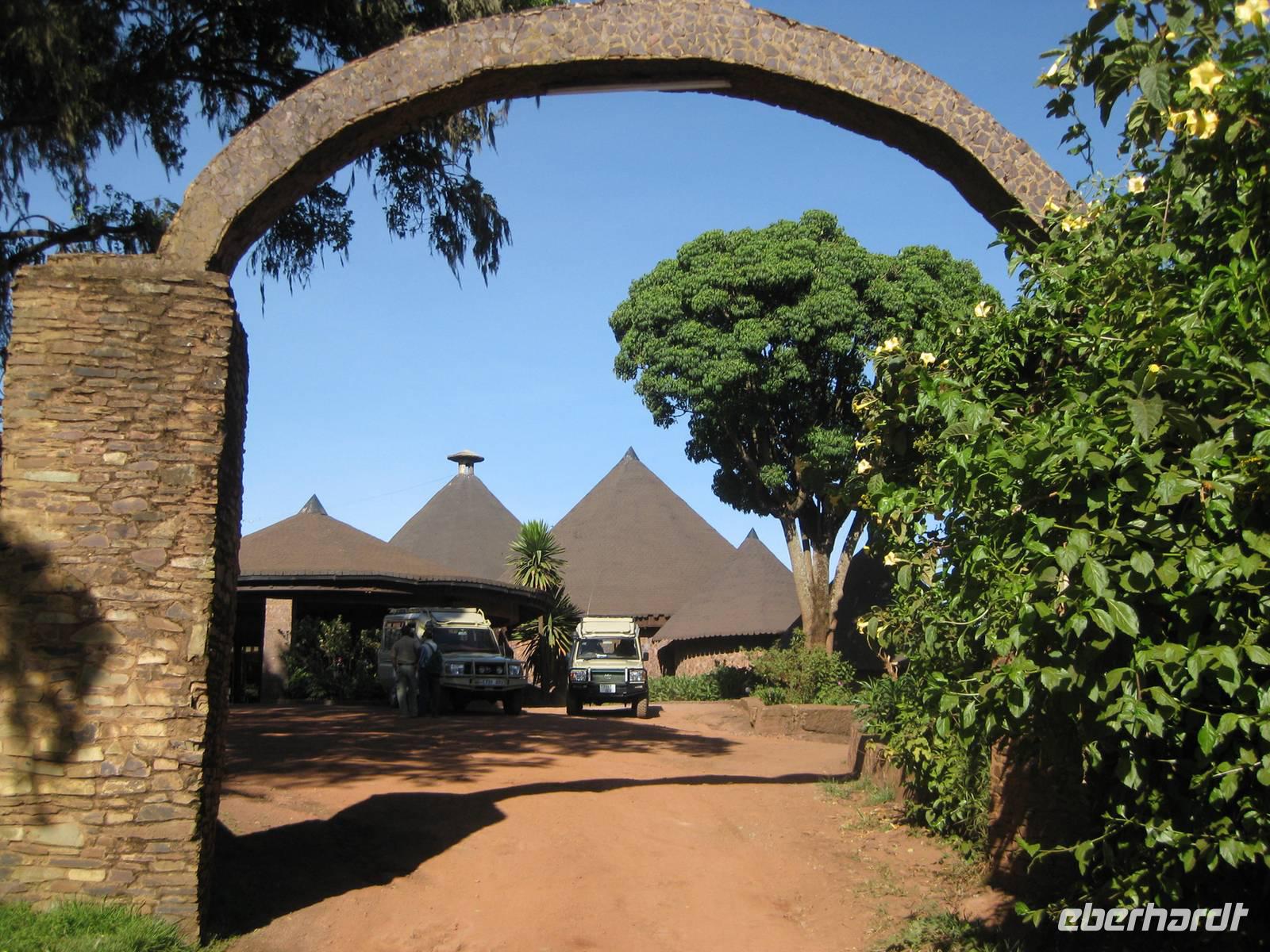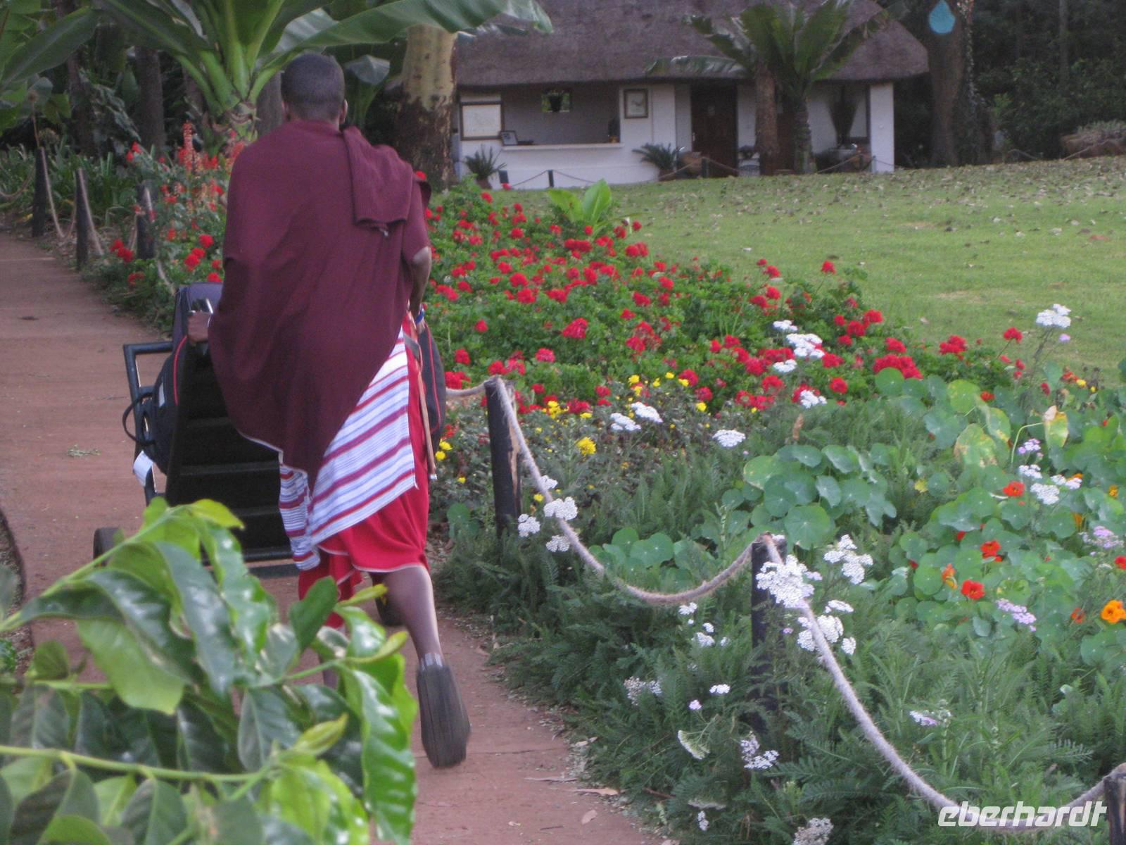 In der Eco-Lodge begrüßt uns der Manager vom Stamm der Chagga (um Moshi)