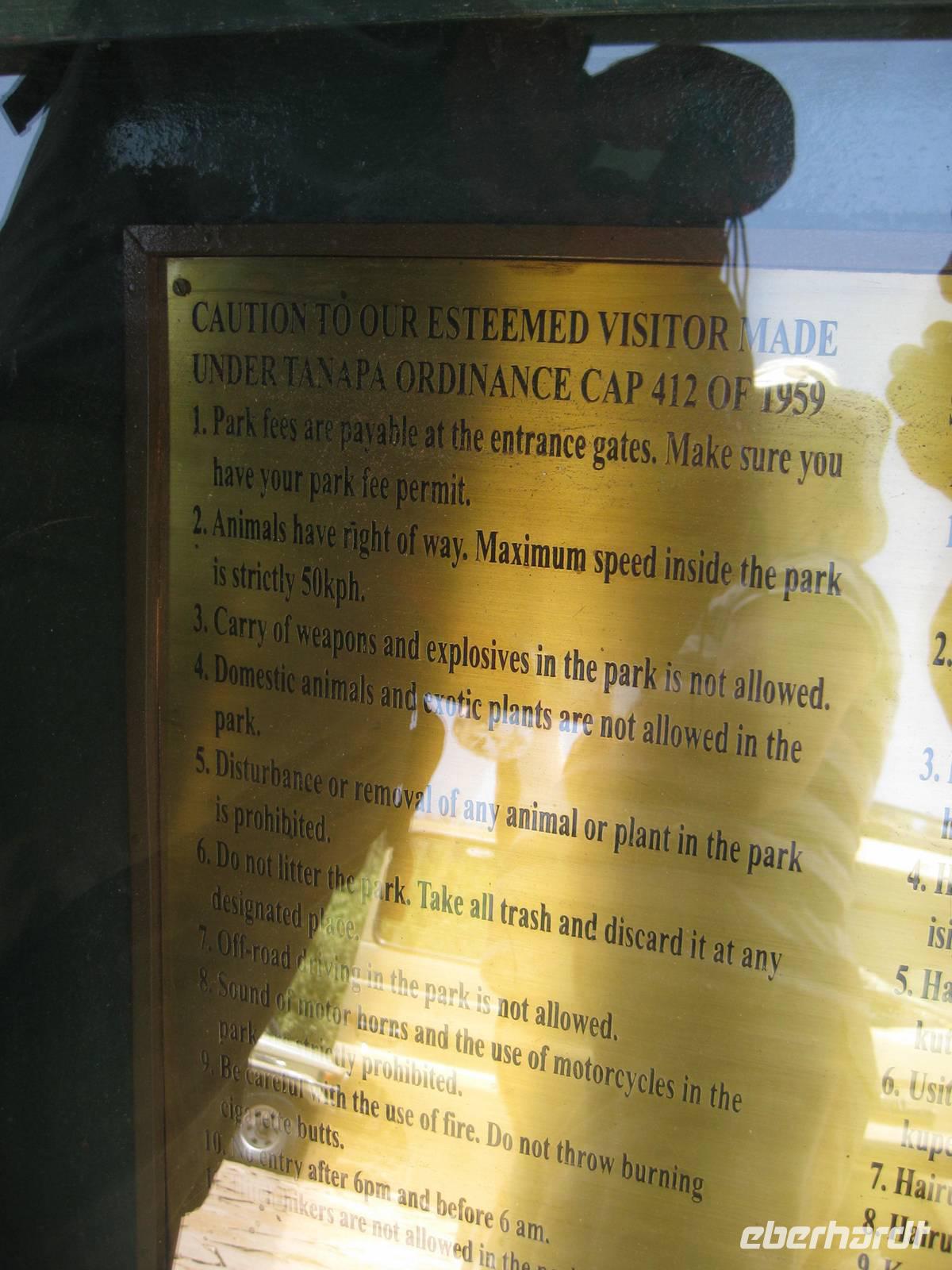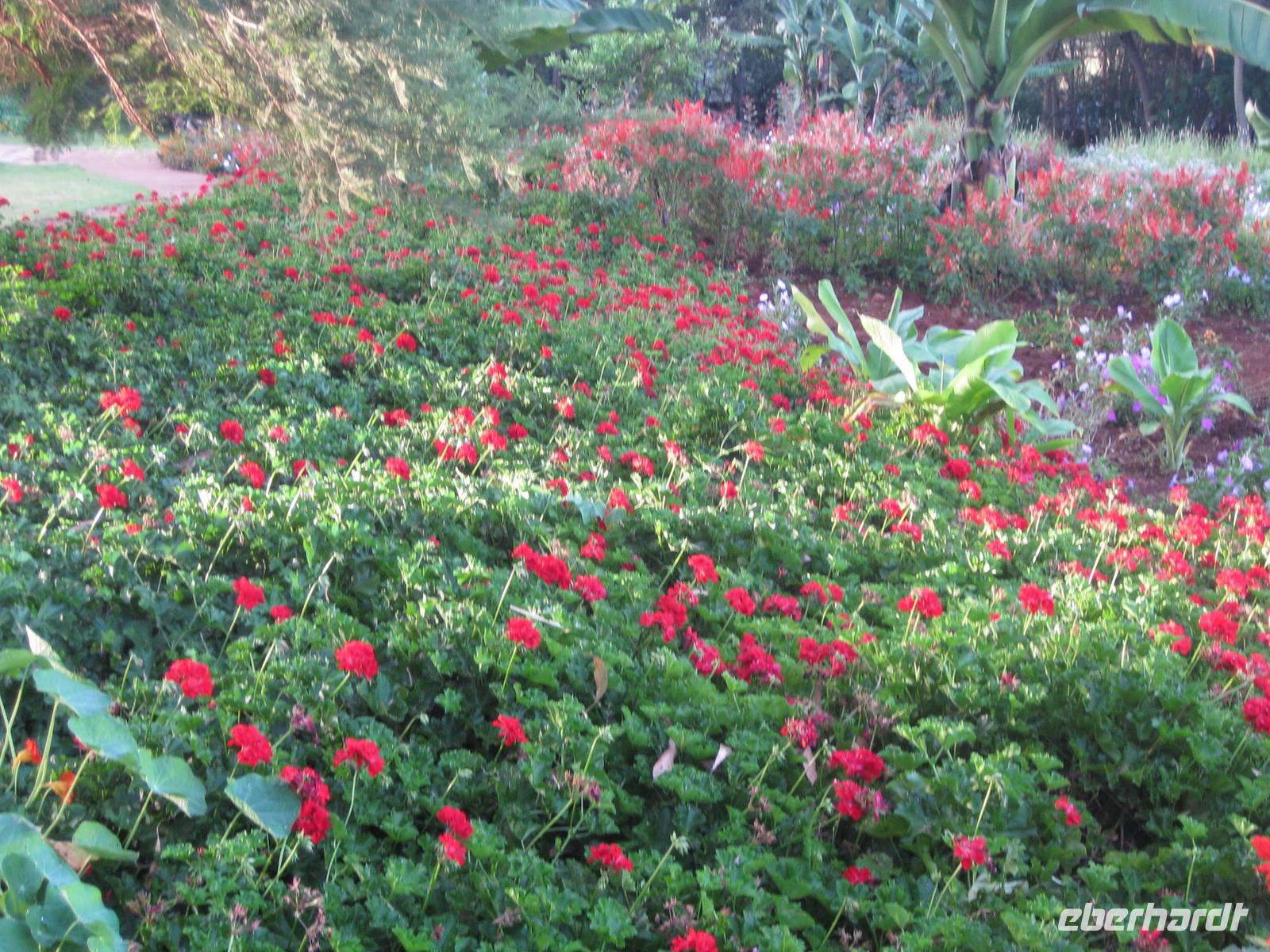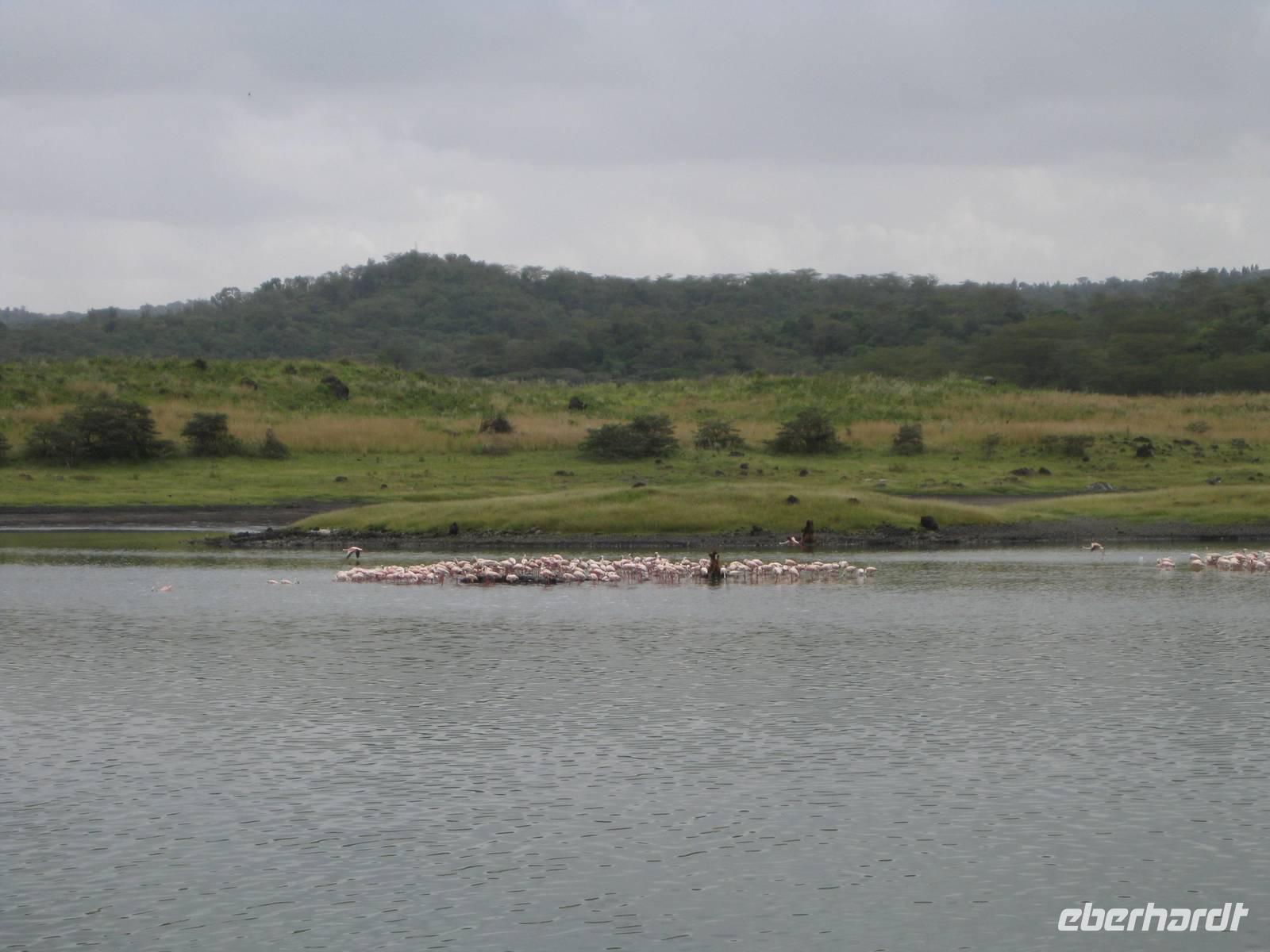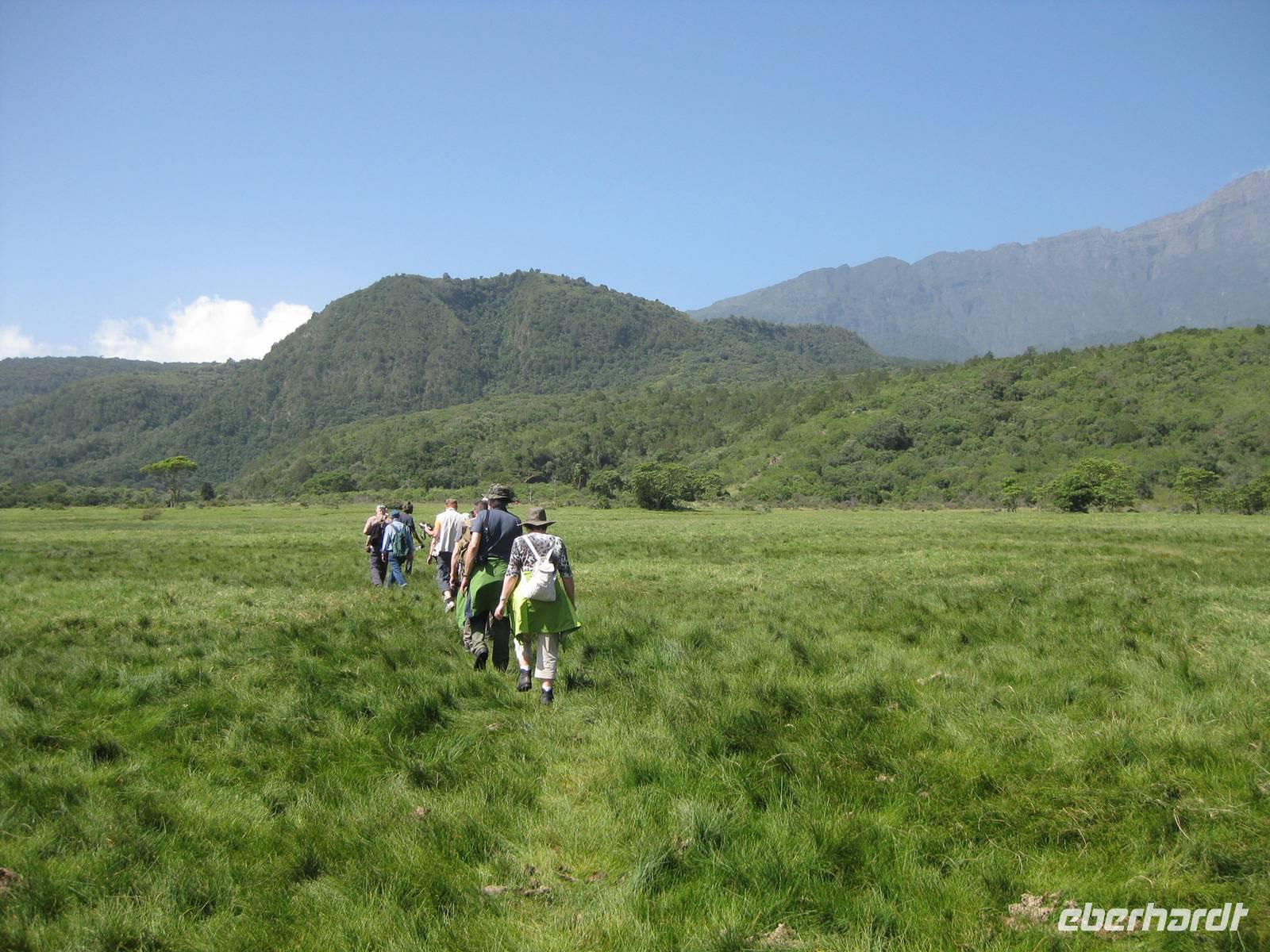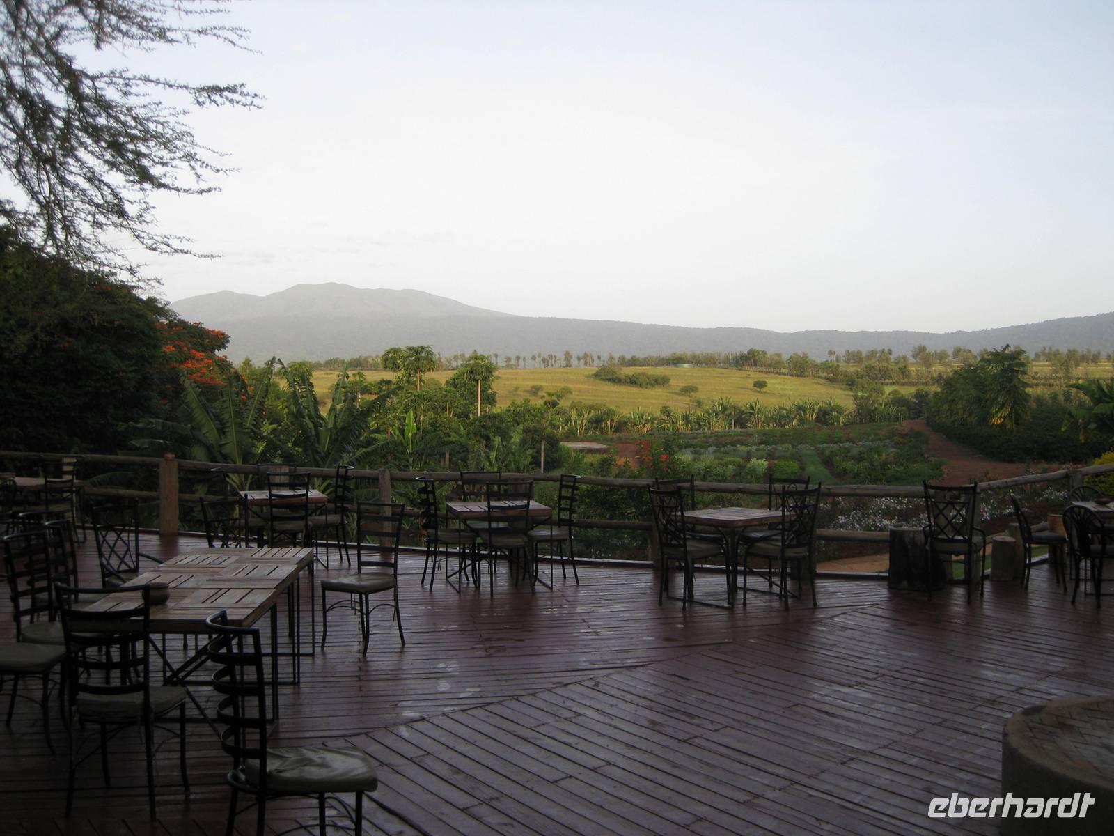 Im Park empfängt uns ein bewaffneter Ranger. Es folgt eine ausgedehnte Fußwanderung durch die saftige Gras- und Buschsavanne. Auf unseren manchmal recht feuchten Wegen treffen wir Büffel, Warzenschweine, Giraffen, Zebras.... Natürlich auch einige der rund 500 Vogelarten, die es im Park gibt. Anschließend Picknick am kleinen Wasserfall, unsere Lunchboxen enthält Banane, Joghurt, Ei, Kartoffelsalat, Sandwich, Mango Juice und stammt aus der Arumeru River Lodge. Weiterfahrt durch den Park zur Aussicht auf die Momella Seen und Kaffee-Stopp aus der Thermosflasche. Dann fahren wir hinunter zur Hatari Lodge. Hier hatte einst Hardy Krüger seine Farm in Afrika. Am Eingang sind die Giraffen zum Greifen nahe. Der Name der Lodge geht auf den US Filmklassiker „Hatari" (Kiswahili: Gefahr), zurück, der hier und im etwas entfernten Manyara Nationalpark Anfang der 60iger Jahre des 20. Jahrhunderts gedreht wurde. Im Restaurant der Lodge hängen die Bilder der Stars von damals: John Wayhe und Hardy Krüger Sen. aus Deutschland. Abschließend fahren wir mit unseren Jeeps zu den Momella Seen, wir genießen die herrliche Ruhe und den Blick auf tausende von Flamingos! Auf der Rückfahrt zur Lodge besorgt Hans im Ort Usa River noch einen neuen Adapter für einen von uns. Auf unserem Weg passieren wir riesige Folienzelte. Hier werden Rosen und andere Blumen für den Export nach Europa und Deutschland gezüchtet. Die Flieger gehen täglich nach Europa, auch diese Nacht. Beim Abendessen in der Lodge stellt sich Hans vor und gibt persönliche Einblicke in tansanische Denk- und Verhaltensweisen. Mit Wehmut erzählt Hans davon, dass die Menschen in Tansania nicht so alt wie in Europa werden (Durchschnittliche Lebenserwartung: Frauen49 Jahre, Männer 52 Jahre) und das man sehr auf seine Gesundheit aufpassen muss. Tansania ist ein von der Natur und Tierwelt sehr bevorzugtes Land, aber auch ein sehr armes Entwicklungsland.