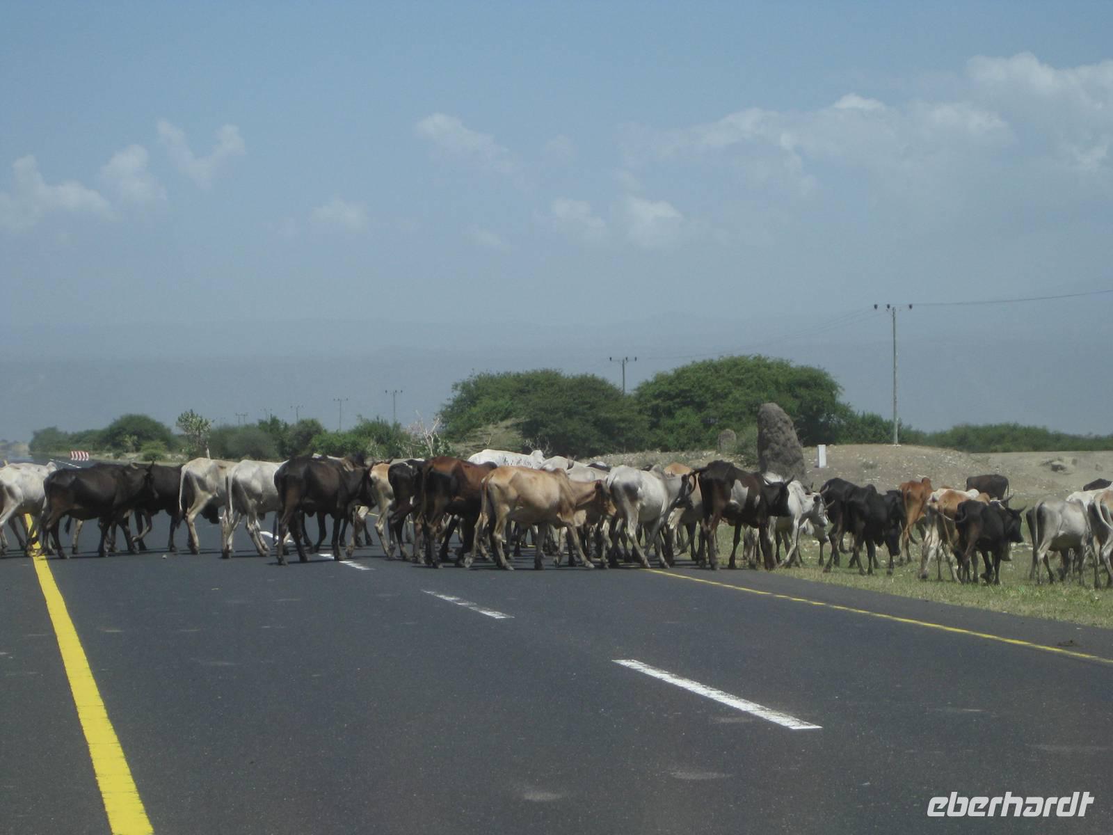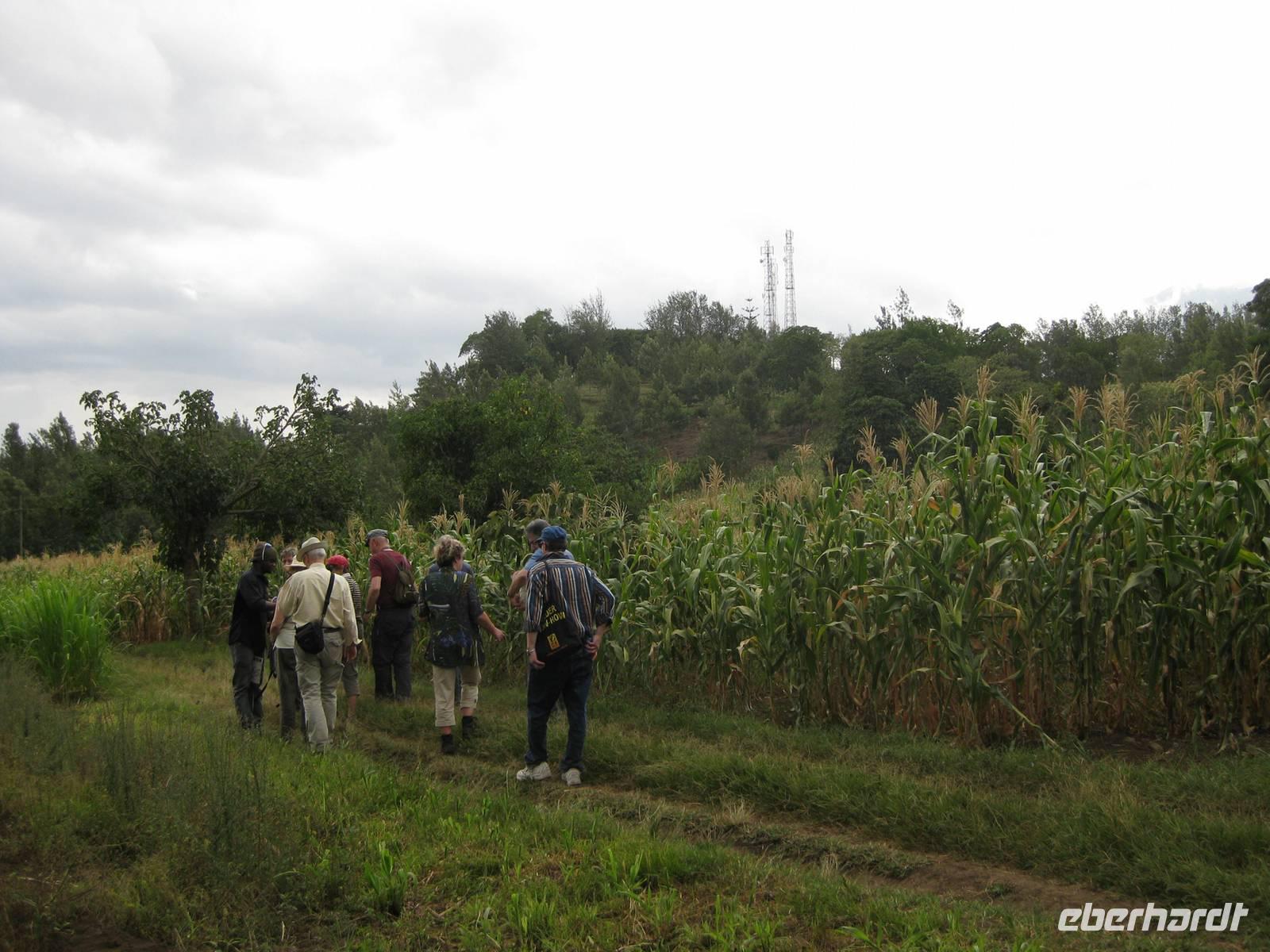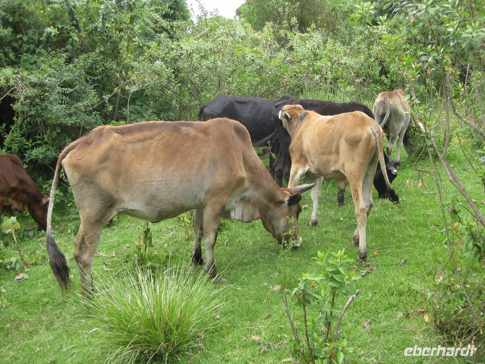 Mit den 2 Jeeps geht es dann in das Nachbargebiet des Hauptkraters. Aber wir sind immer noch im Ngorongoro-Nationalpark. Wieder sehen wir große Rinderherden , aber auch Ziegen der Massai. Sehr oft hüten Kinder die Tiere. Am Fuße eines weiteren Kraters verlassen wir die Jeeps und ersteigen den nächsten Kraterrand. Unser Begleiter ist ein bewaffneter Wildhüter. Am Ende werden wir eine Höhe von rund 3000 Metern über Normal erreichen. Einigen unserer Frauen ist leicht schwindlig. Langsam( in Kiswahili pole pole) erreichen wir den Kraterrand, grandioser Blick in die Hochebene des Krater, mindestens 3 große Kuhherden mit jeweils über 100 Kühen sehen wir unter uns. Die Kuhglocken klingen fast wie in Bayern. Beim Abstieg begegnen uns Massai, die geforderten Preise für die Fotoerlaubnis sind aber für uns diesmal zu hoch. Nach dem Abstieg treffen wir uns an einer Wildhüterstation zum Picknick, die Lunchboxen stammen aus der Lodge und sind gut bestückt. Als Fleisch gibt es Hühnchen, einige der Lebensmittel sind aus Südafrika und Kenia importiert. Auf der Rückfahrt zur Sopa Lodge sehen und treffen wir viele Maasai Kinder an die wir gern unsere aus Deutschland mitgebrachten Bonbons verteilen. Am frühen Nachmittag sind wir in der Lodge zurück, es ist Sonntag und Zeit zum Erholen. Beim Abendbrotbuffet werten wir unsere Tageserlebnisse aus. Das Kulturprogramm liefern die singenden und tanzenden Mitarbeiter der Lodge.