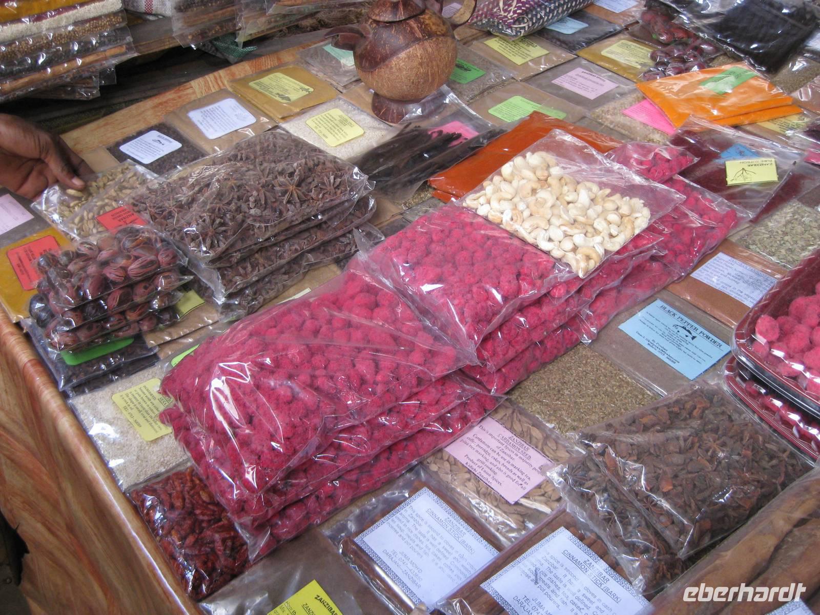 (Robusta), Zimt (Rinde), Indischer Mandelbaum, Pomelo, Brotfrucht, Maracuja, Litschi, Nelke, Muskatnuss, Ingwer, Pfeffer (grün), Vanille, Ananas, Mango, Reis...